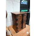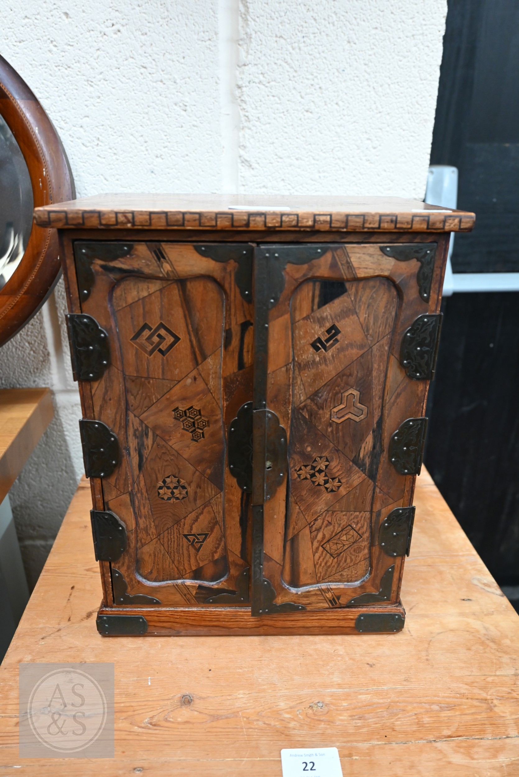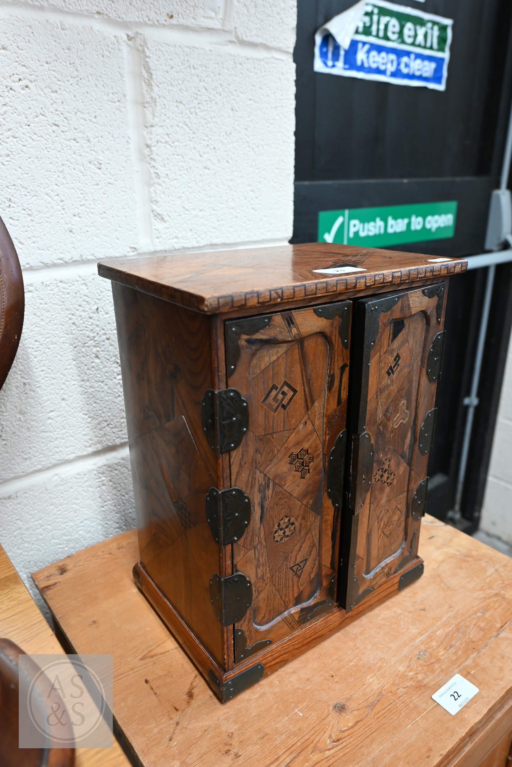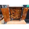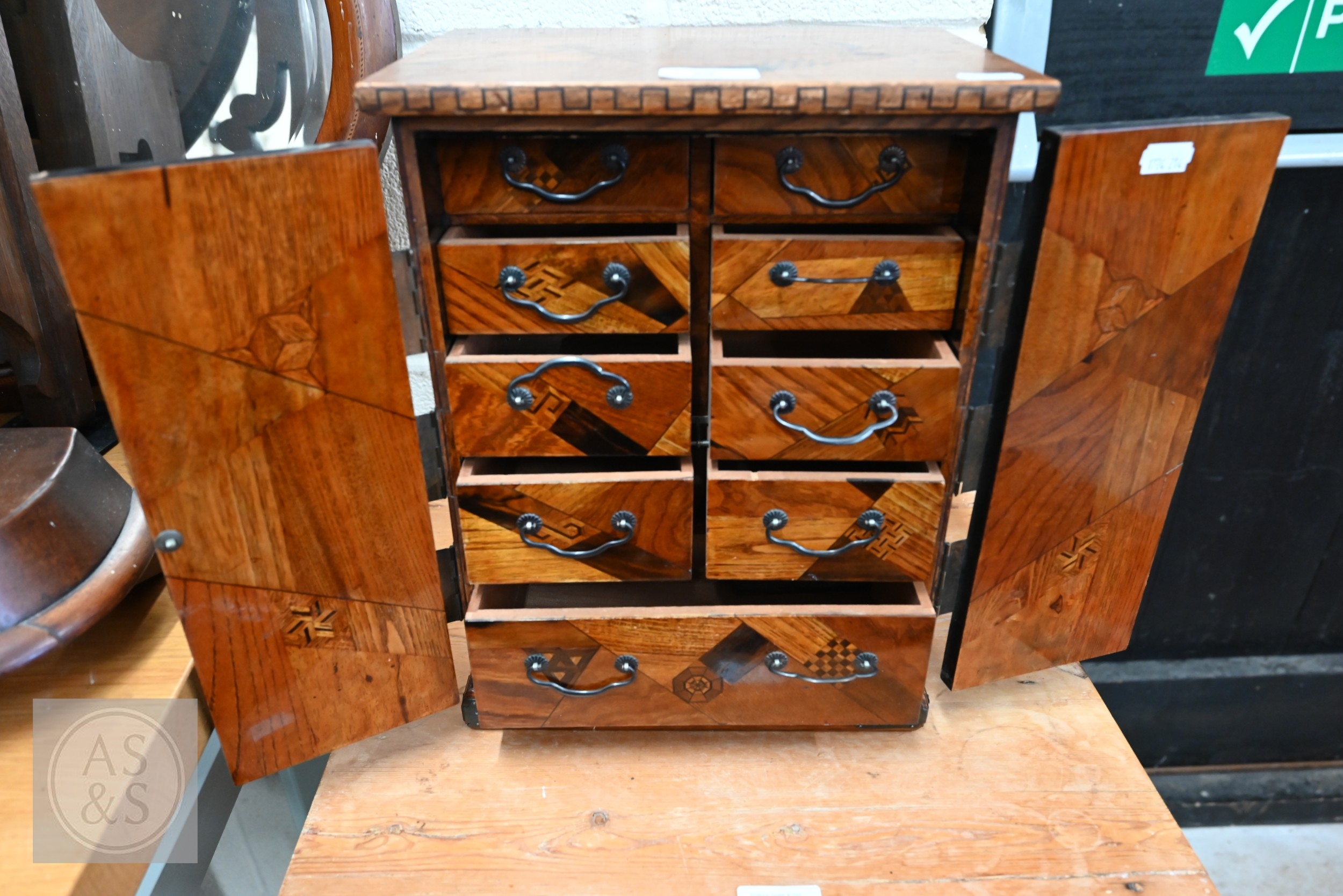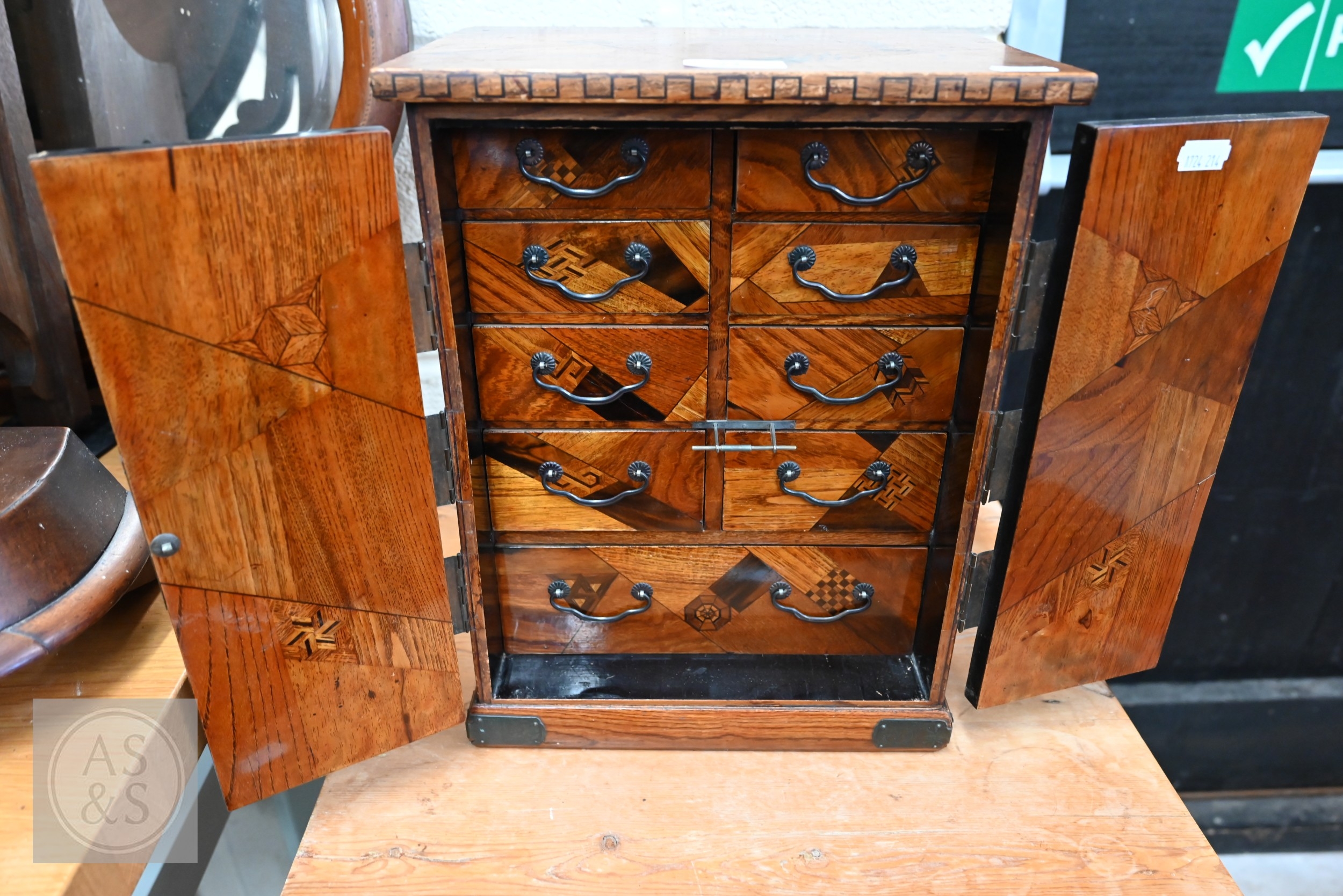 An early/mid 20th century Japanese 'Yosegi Zaiku' parquetry ko-dansu cabinet, the metal mounted small doors enclosing arrangement of nine drawers, Showa/Taisho period, 26 x 18 x 34 cm high