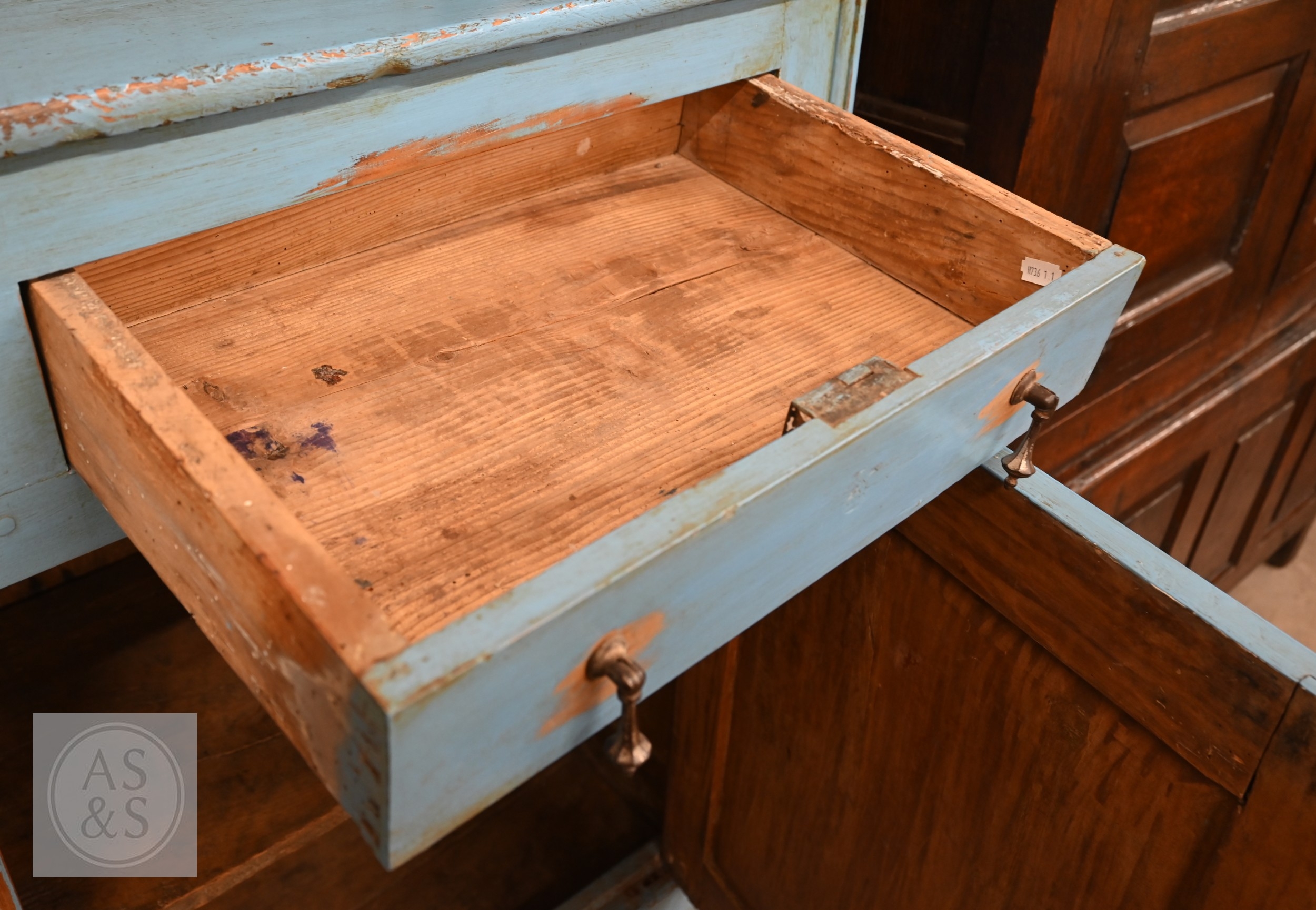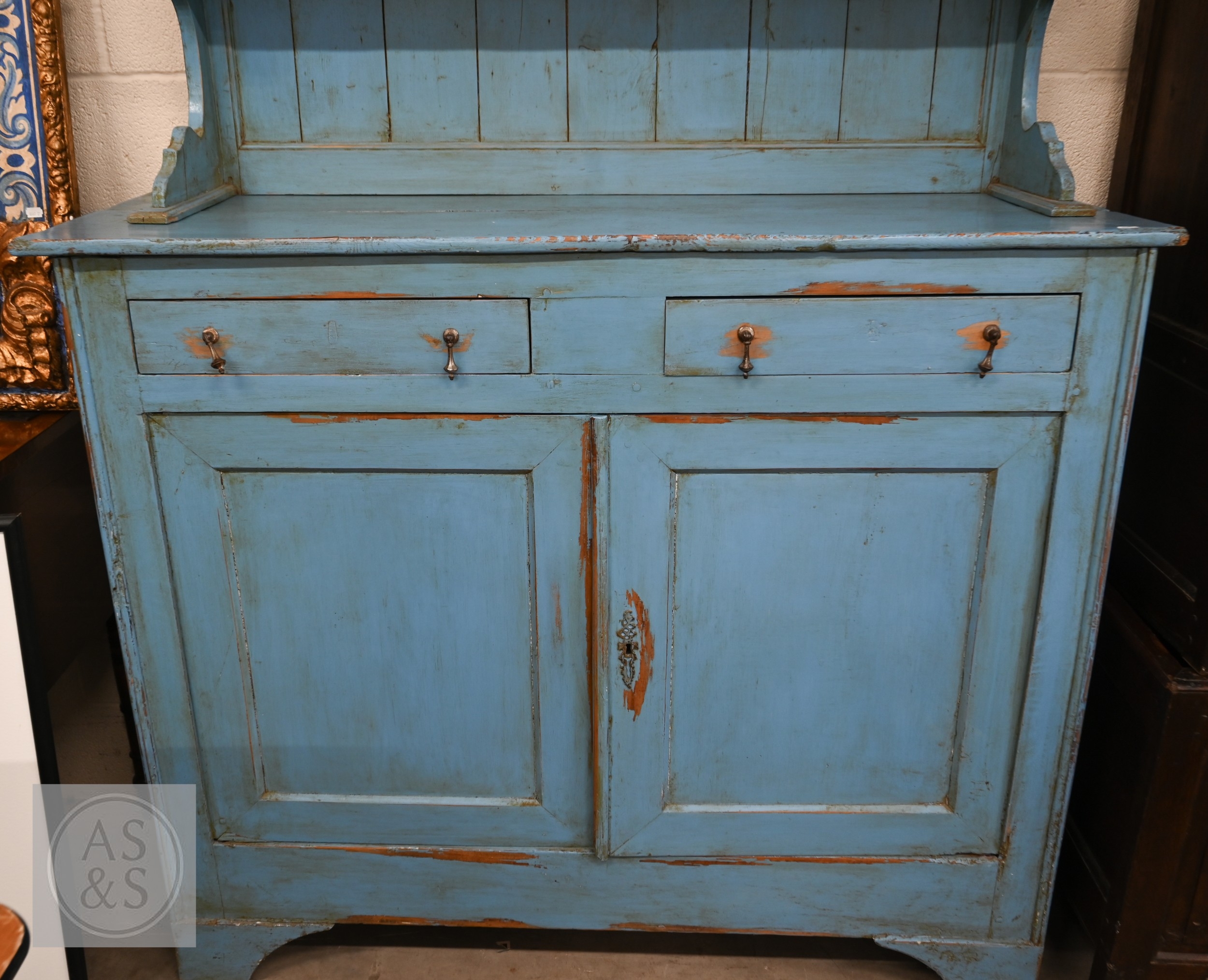 A vintage pine dresser in blue French style distressed painted finish, shaped back with two shelves on associated base with two drawers, panelled cupboards and bracket feet, 142 x 50 x 215 cm high