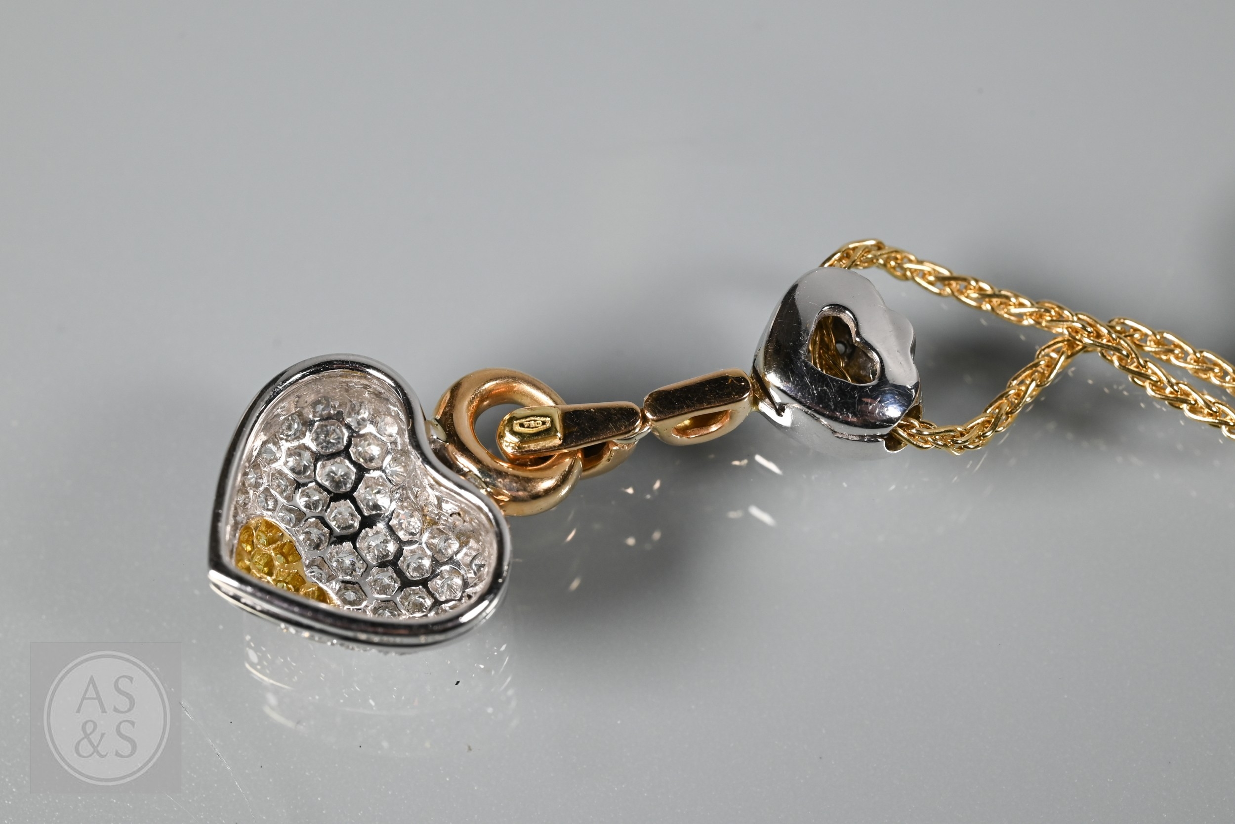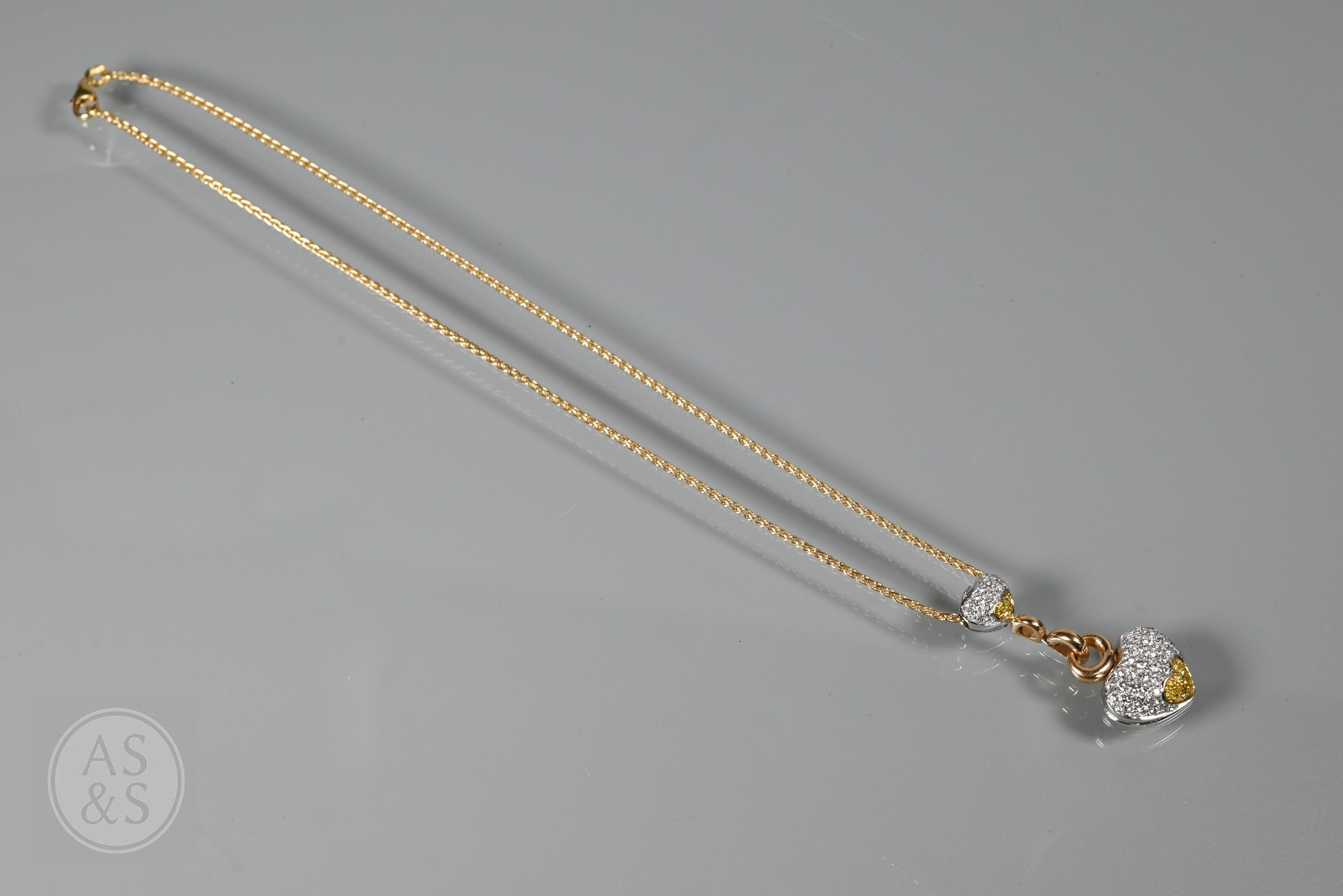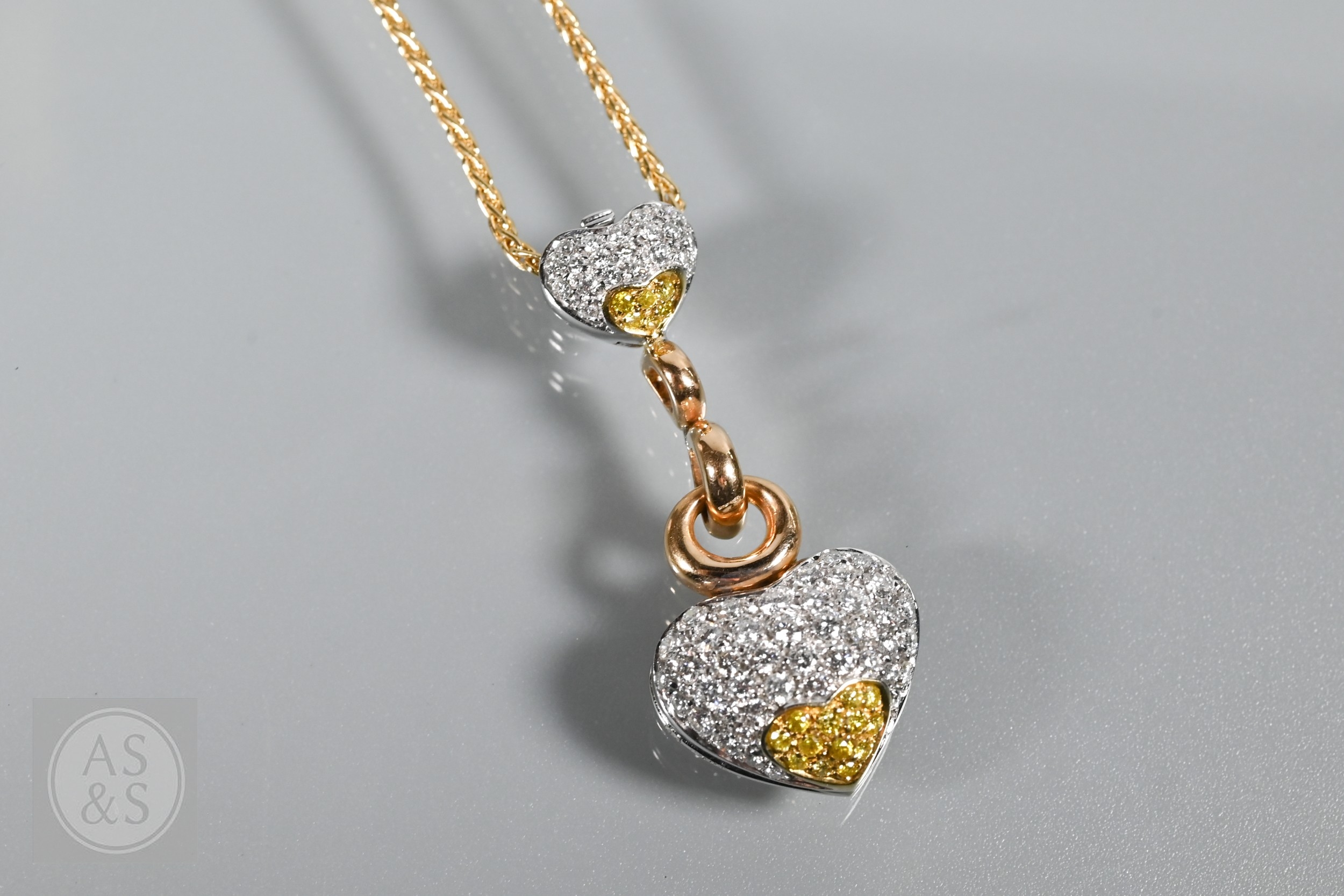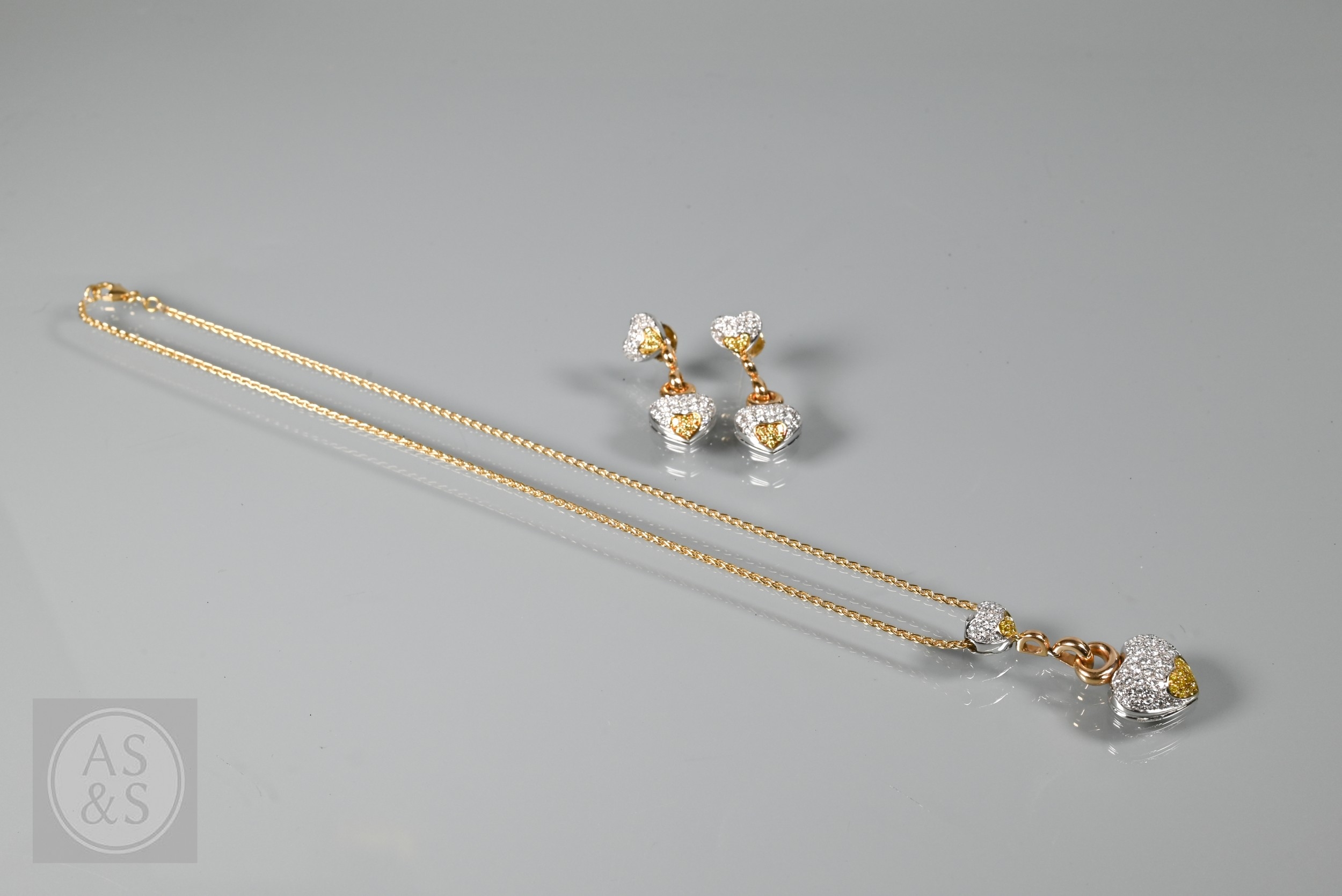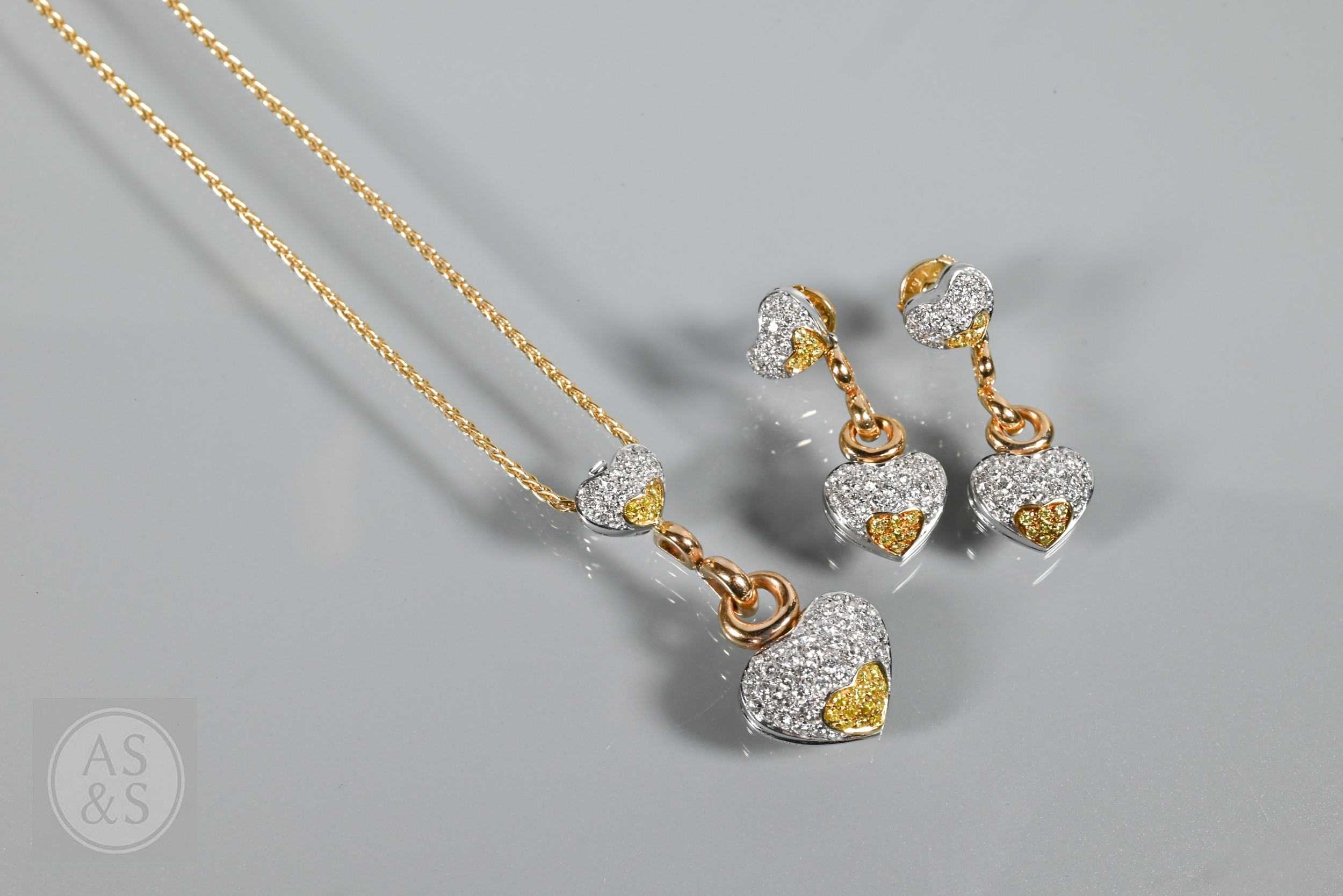 A diamond pendant on chain and earring suite, the double heart drop pendant pavé set with round brilliant-cut diamond melees and fancy yellow diamond melees, white and yellow metal mount, with snake link yellow metal chain, stamped 750, 4 cm drop, 11.6g all in to/w a pair of matching earrings for pierced ears, 3cm drop, 10.3g all in (3)