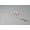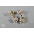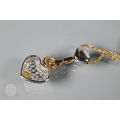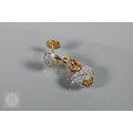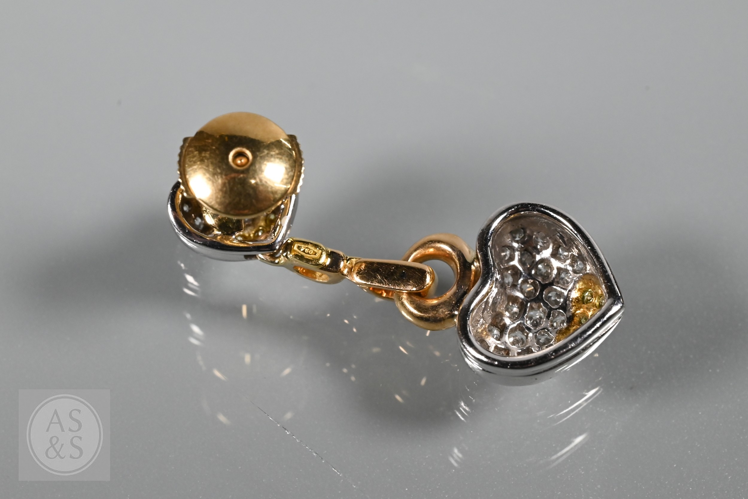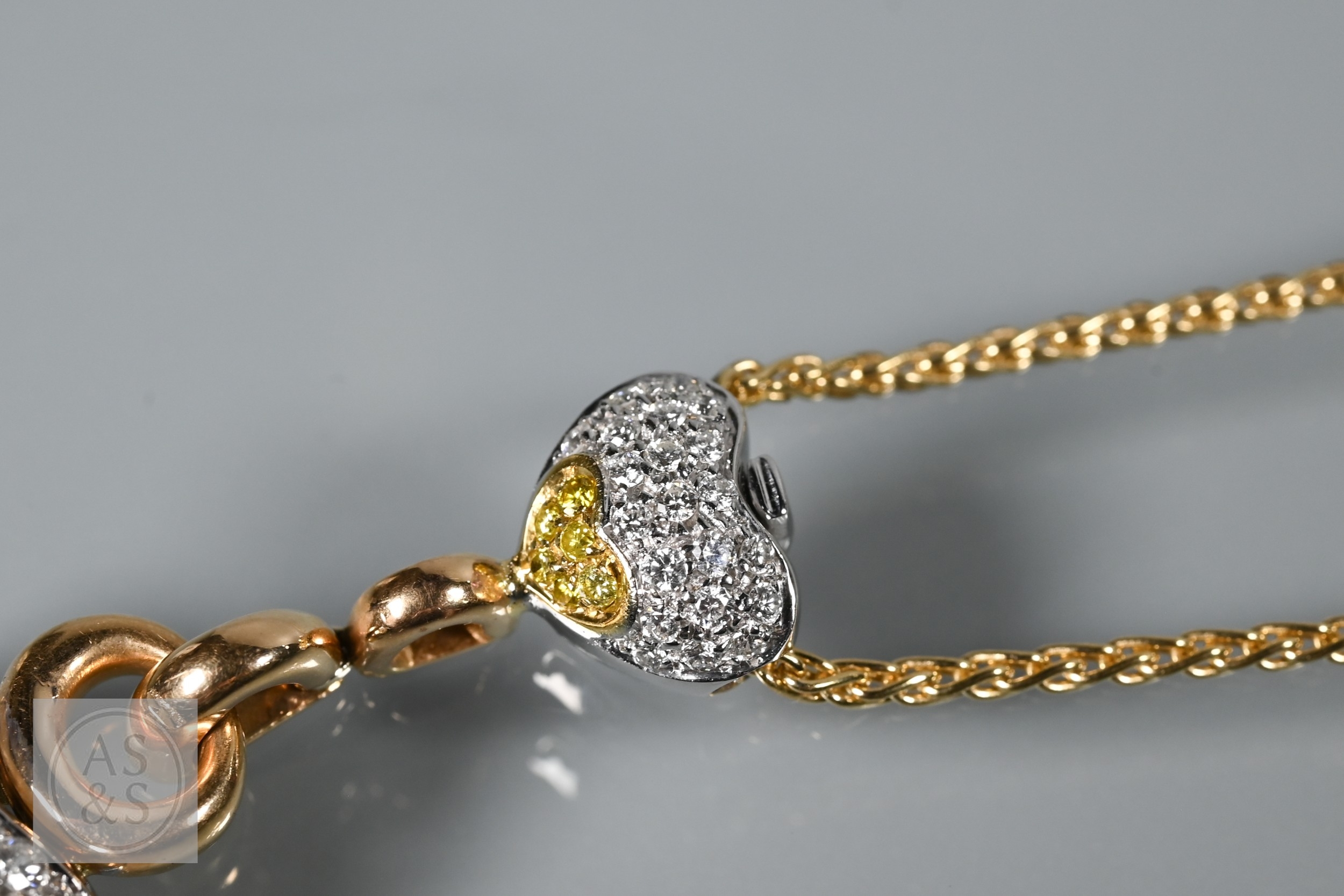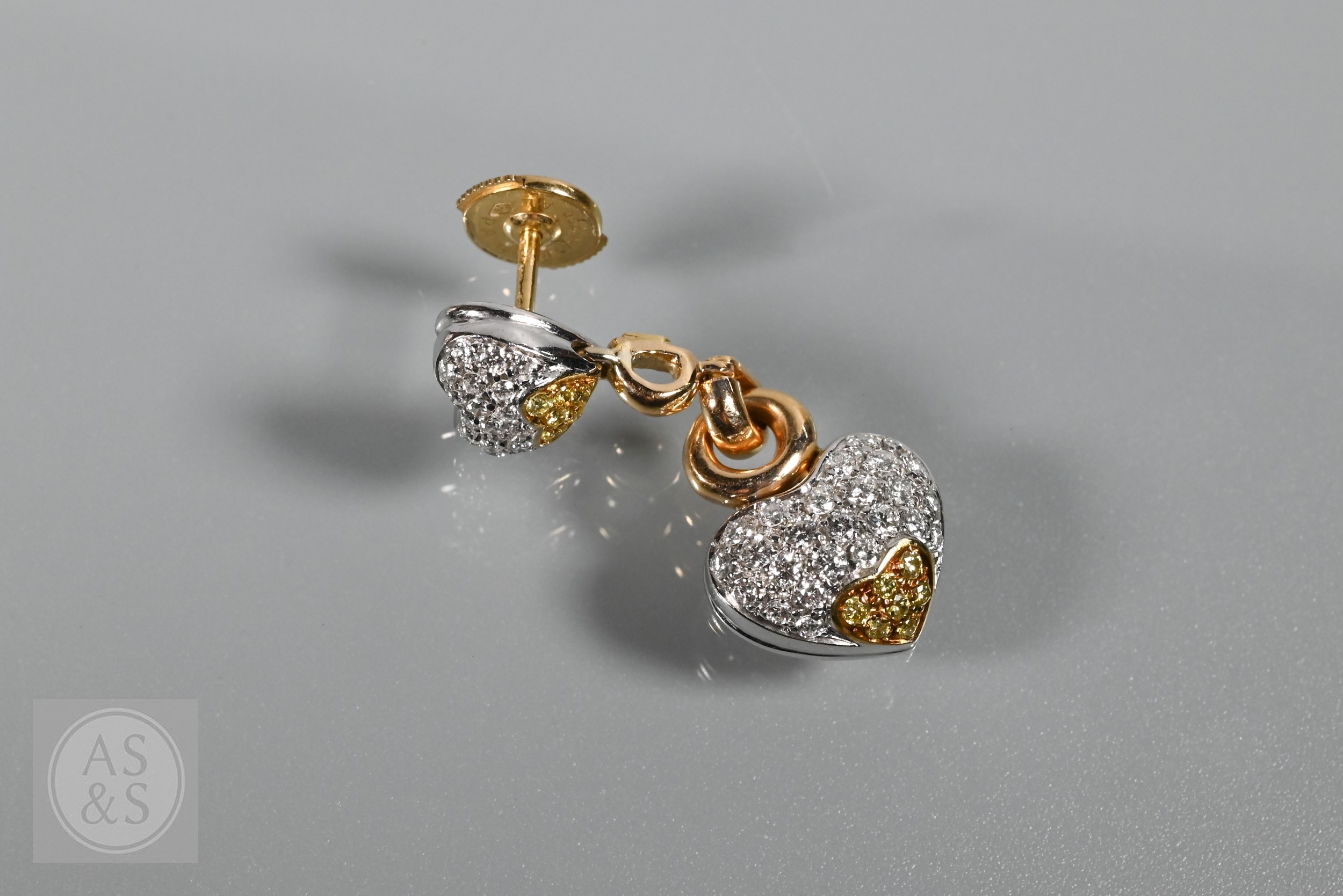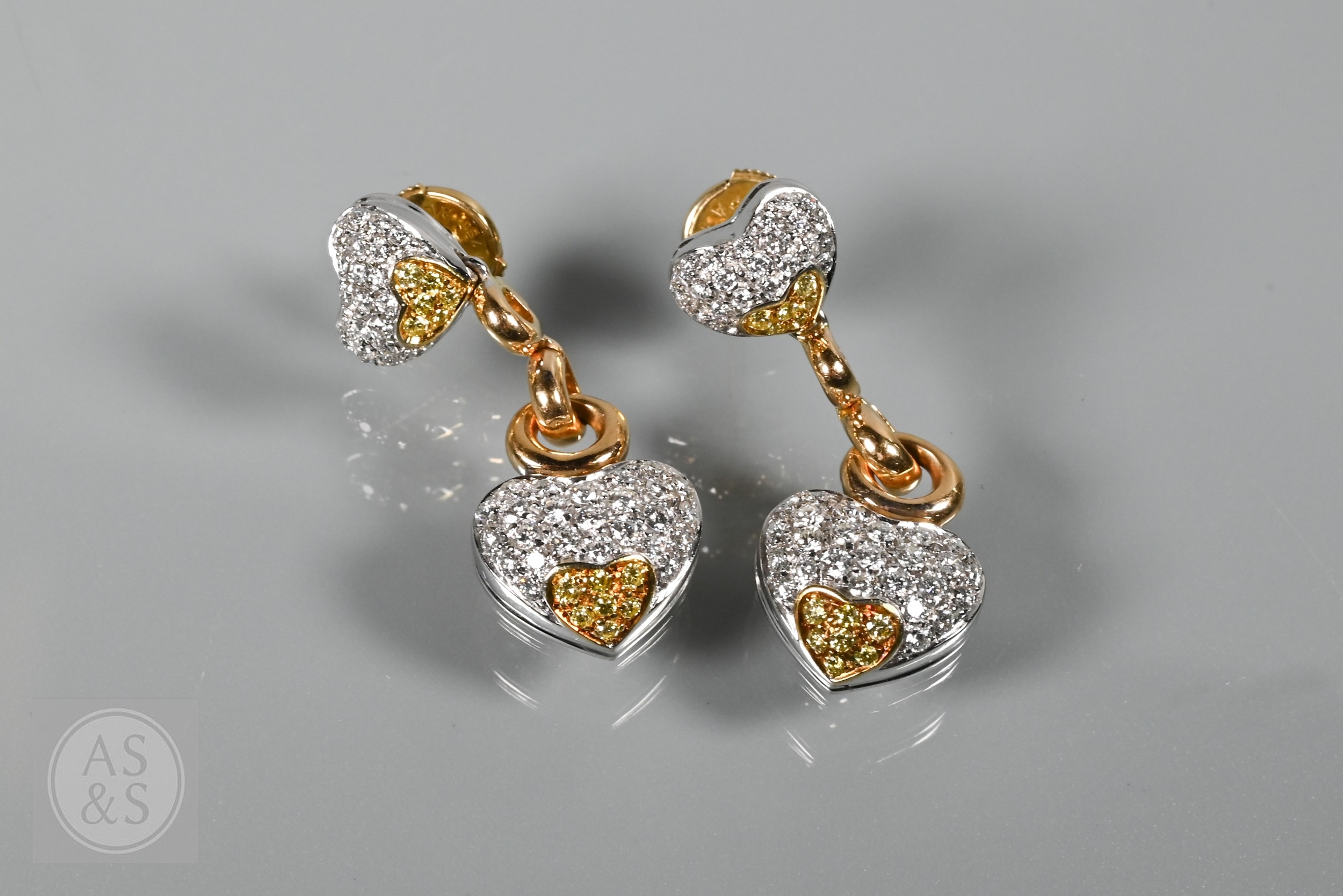 A diamond pendant on chain and earring suite, the double heart drop pendant pavé set with round brilliant-cut diamond melees and fancy yellow diamond melees, white and yellow metal mount, with snake link yellow metal chain, stamped 750, 4 cm drop, 11.6g all in to/w a pair of matching earrings for pierced ears, 3cm drop, 10.3g all in (3)