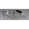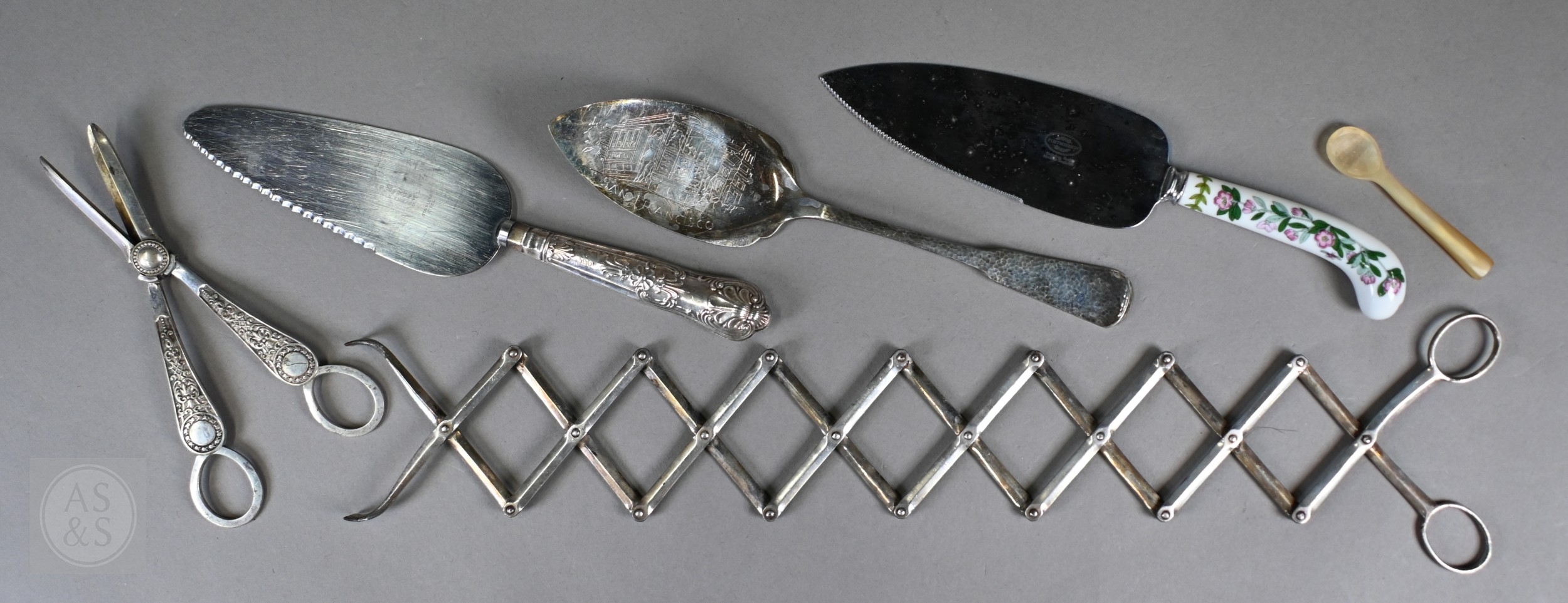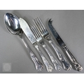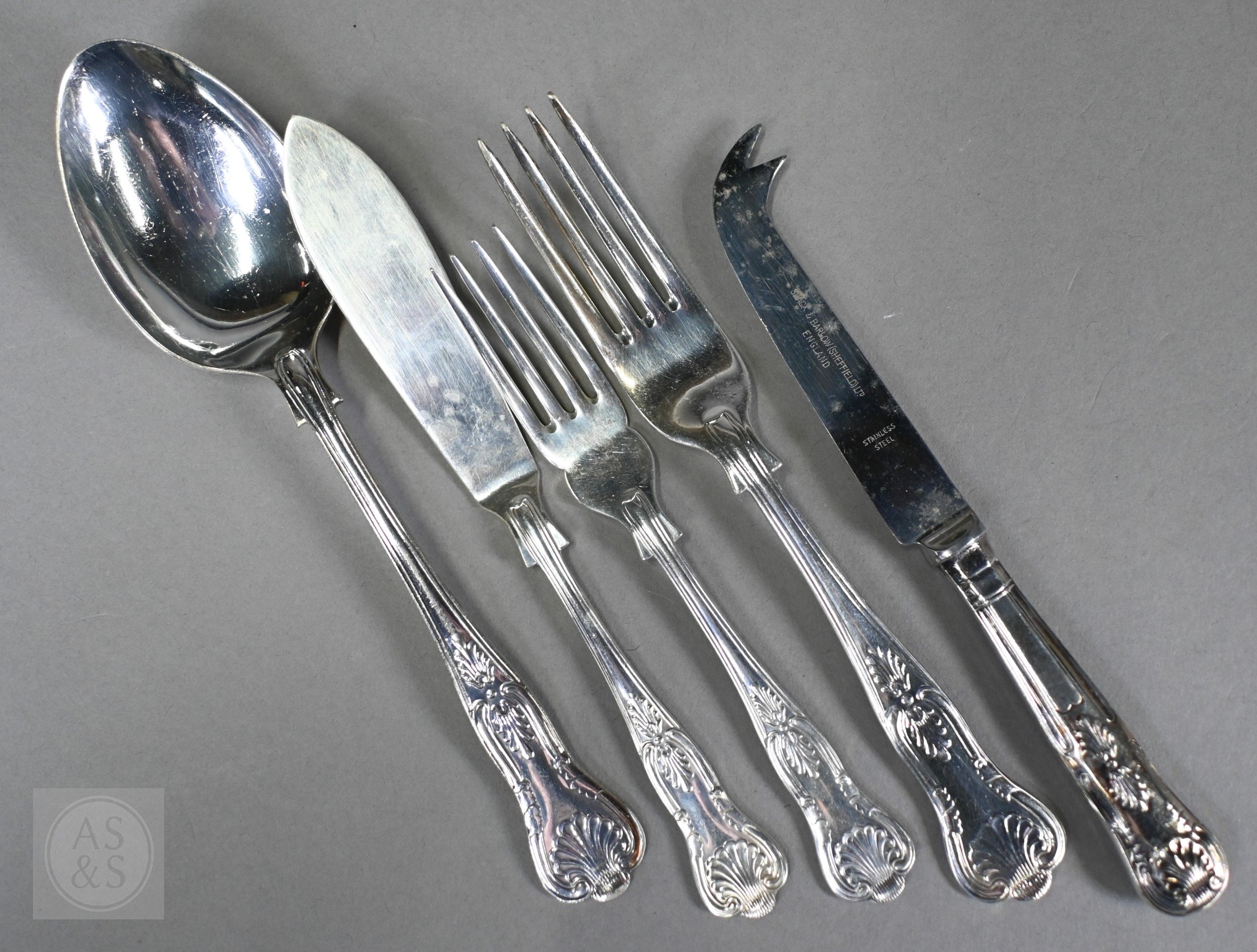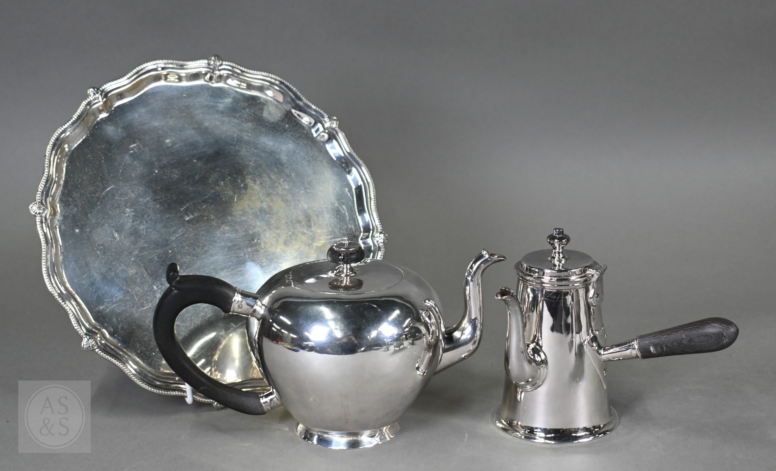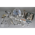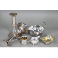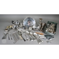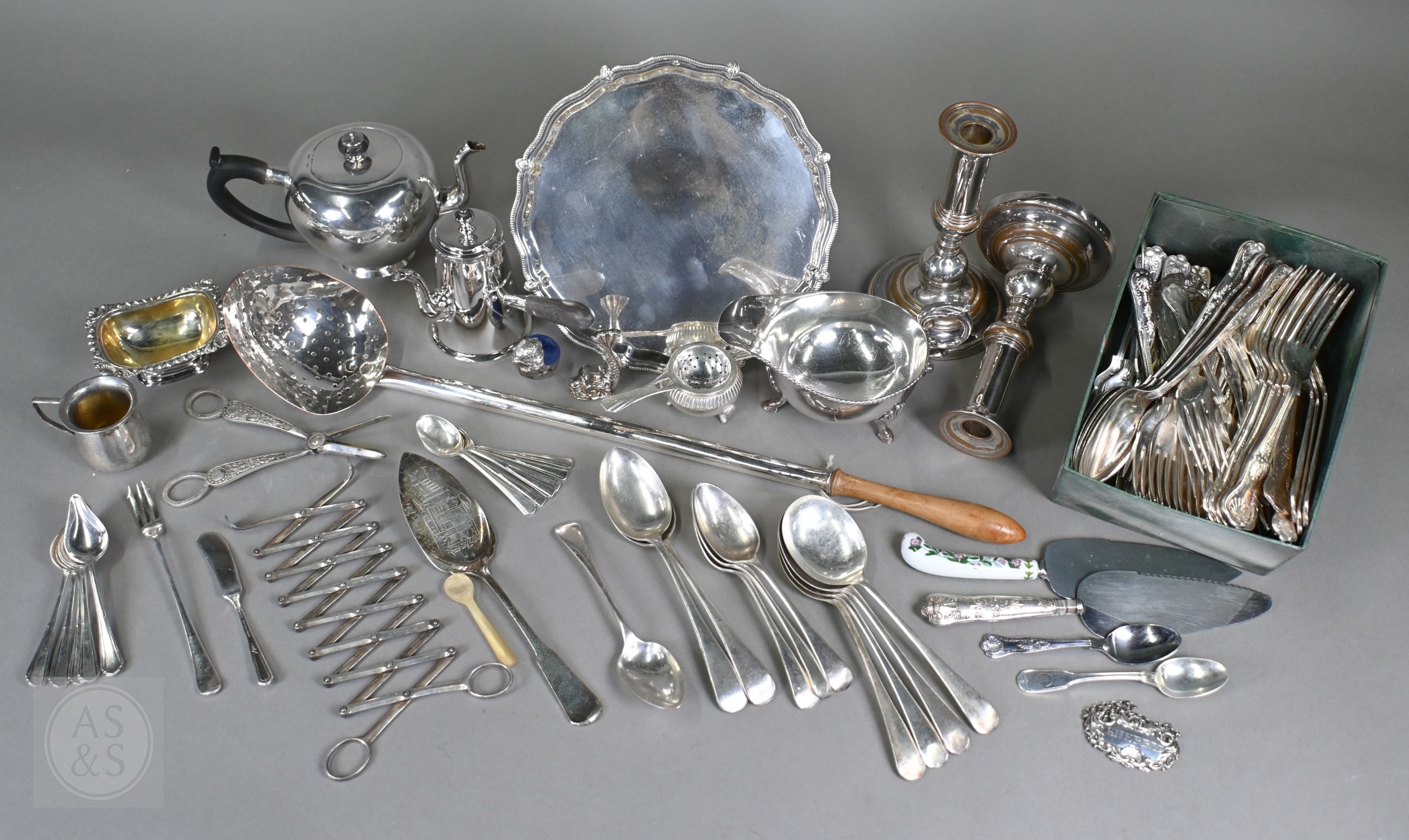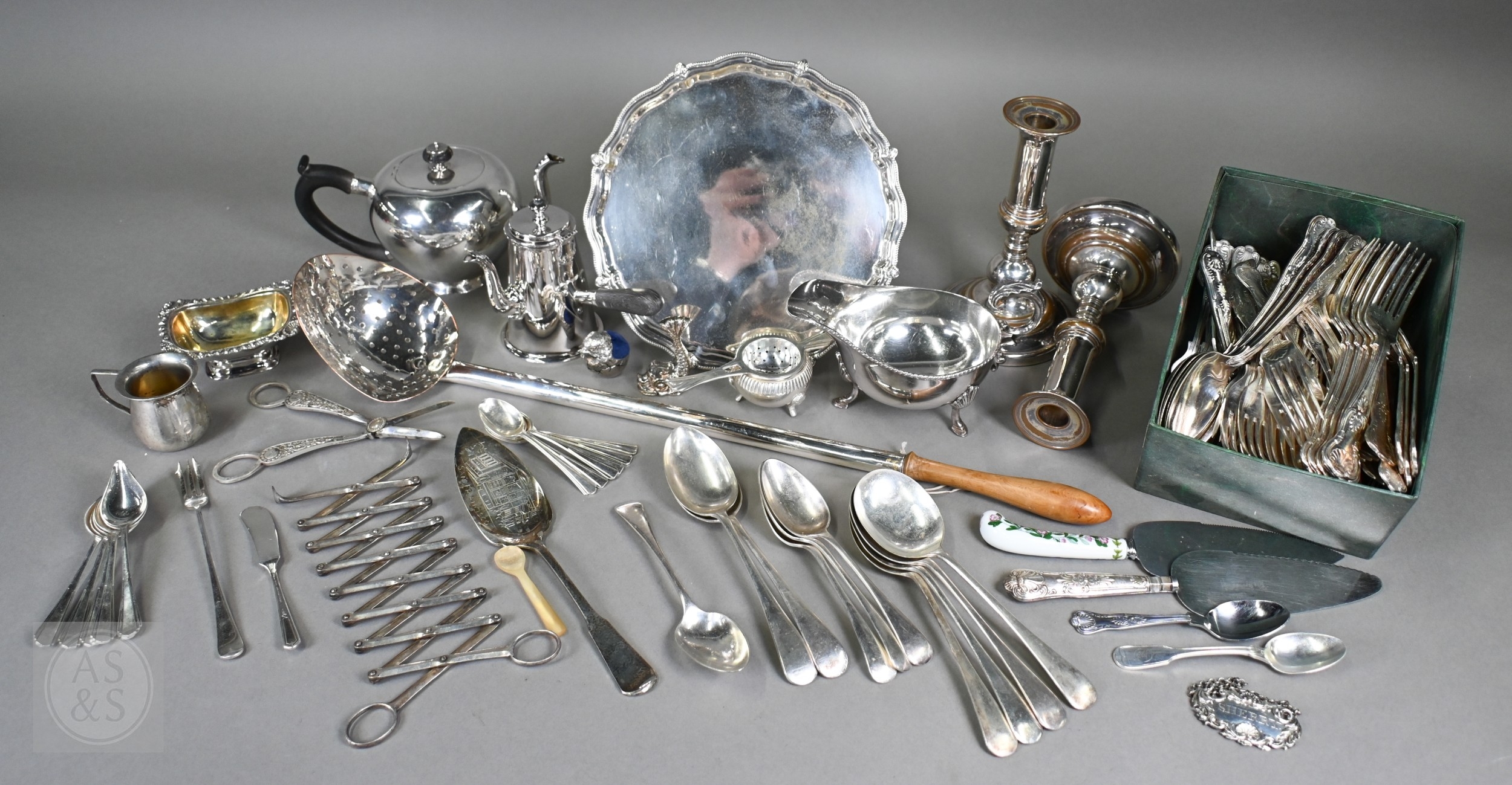 A set of epns King's pattern flatware, to/w various other electroplated wares including large dairy cream-skimming ladle with fruitwood handle, a pair of plated on copper candlesticks, concertina tongs, salver, sauce boat, small coffee pot, etc.; lot also includes an antique Continental unmarked white metal bullet-shaped tea pot (not successfully tested as silver) (box)