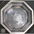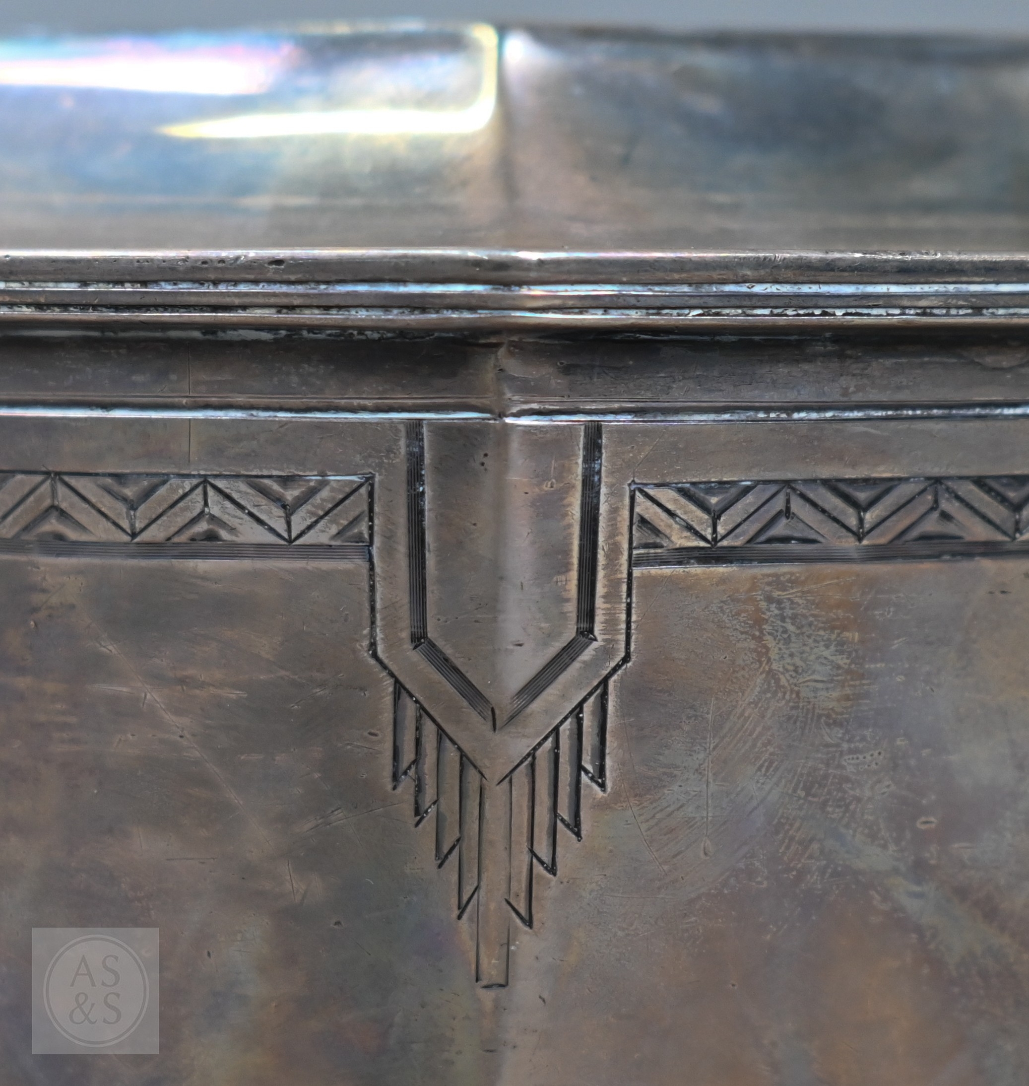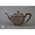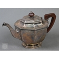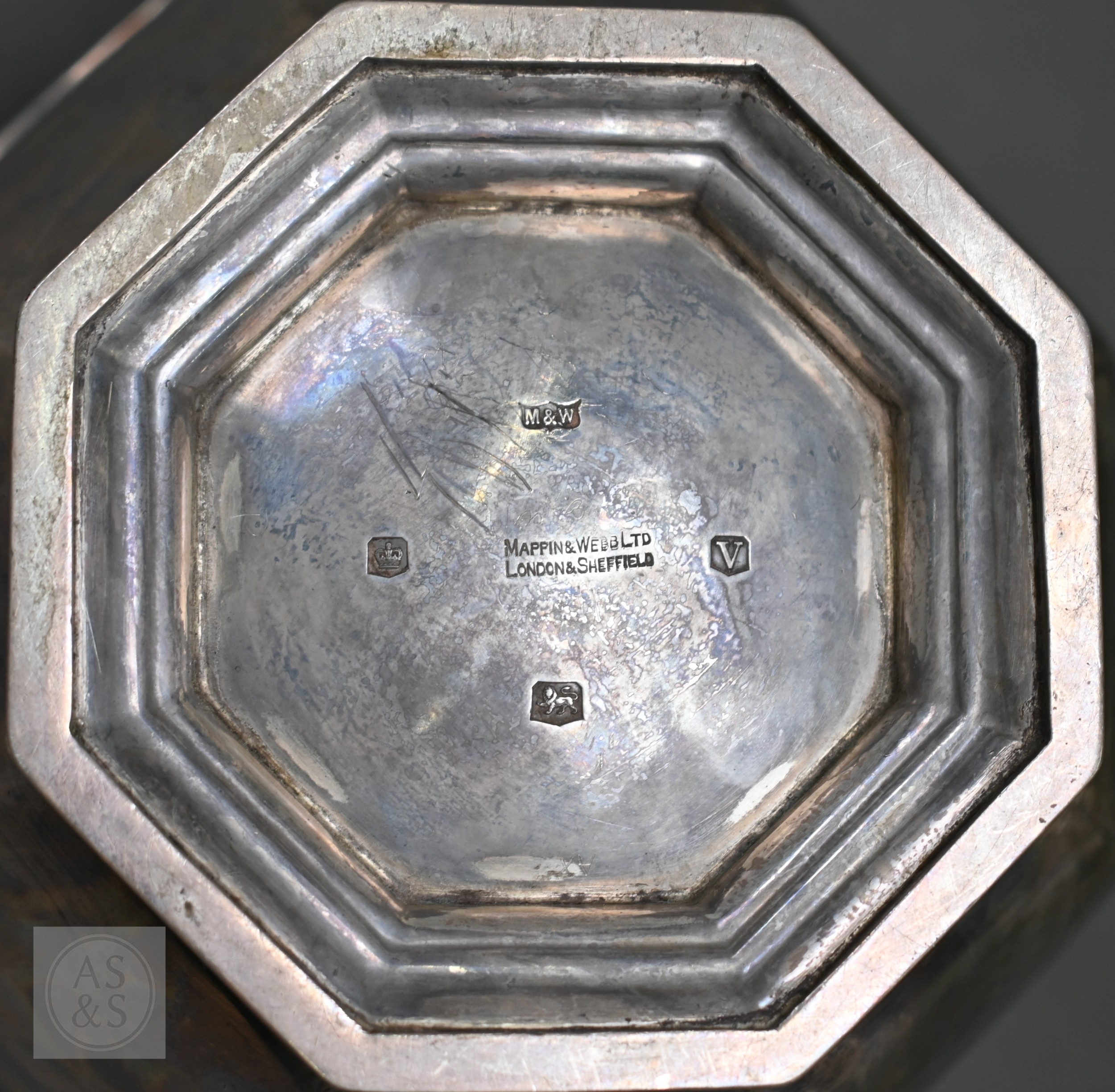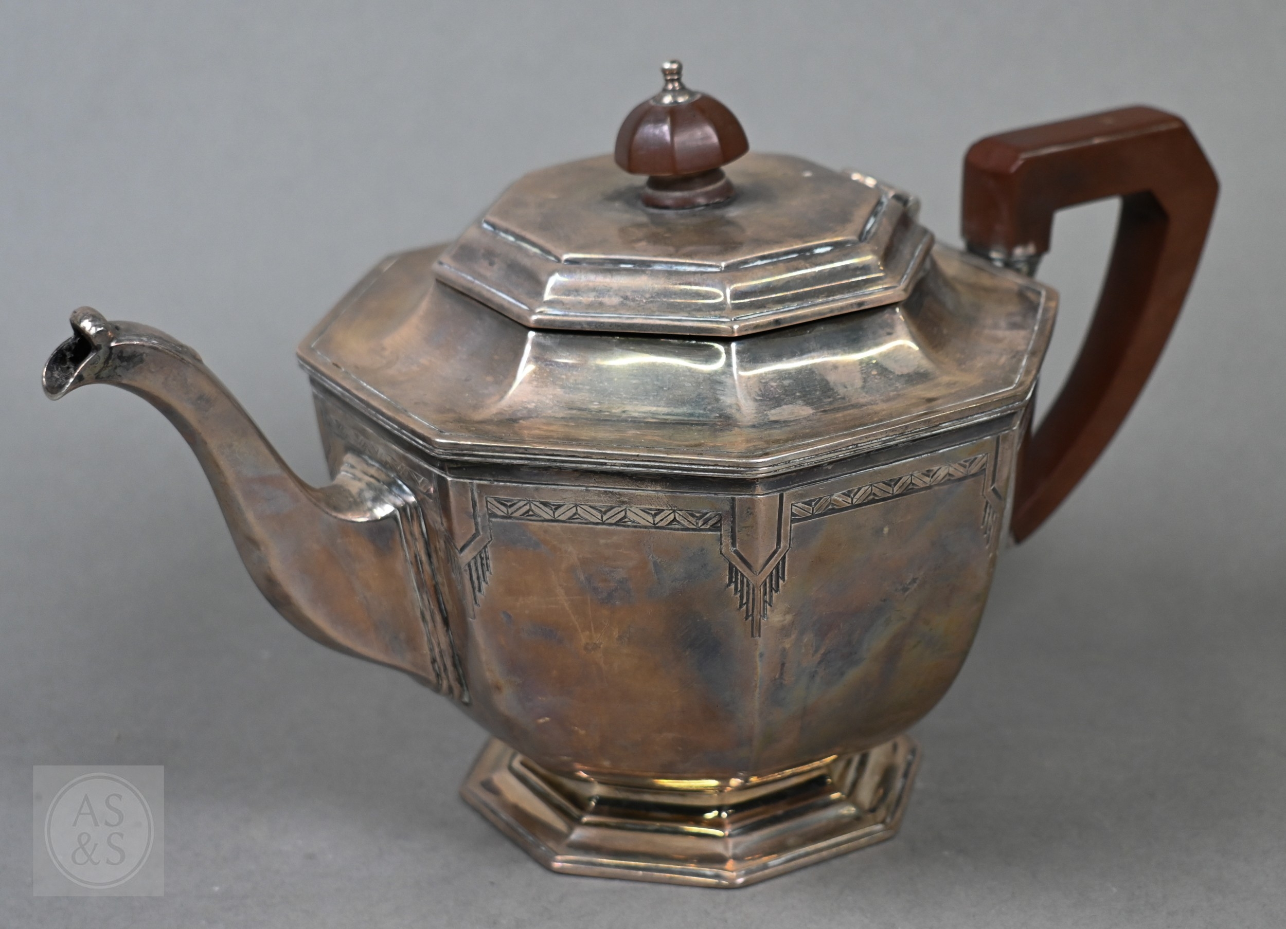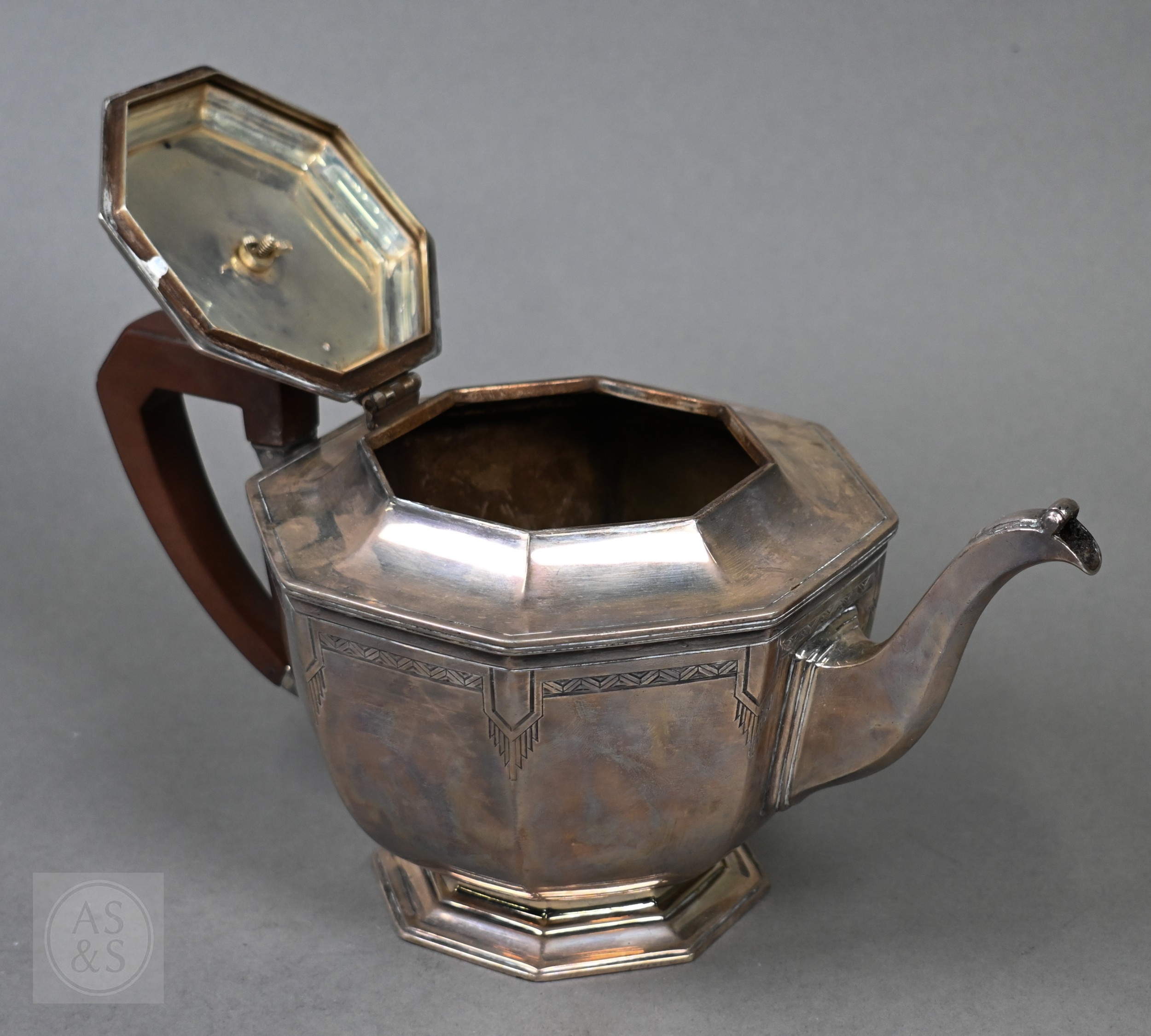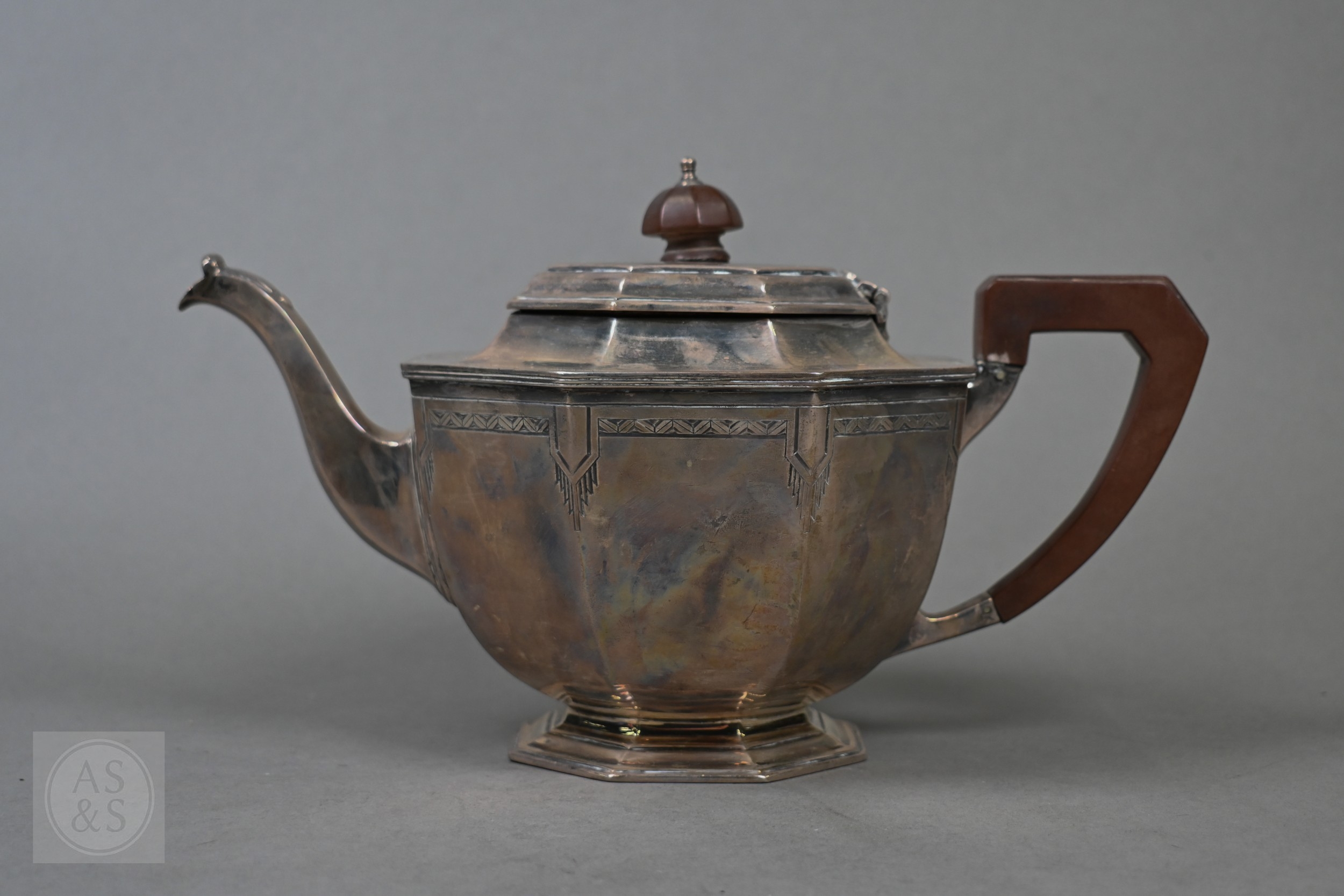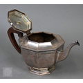 A heavy quality Art Deco silver octagonal tea pot with composite mounts and engraved decoration, on moulded foot, Mappin & Webb, Sheffield 1938, 22.8ozt gross, 15cm high