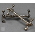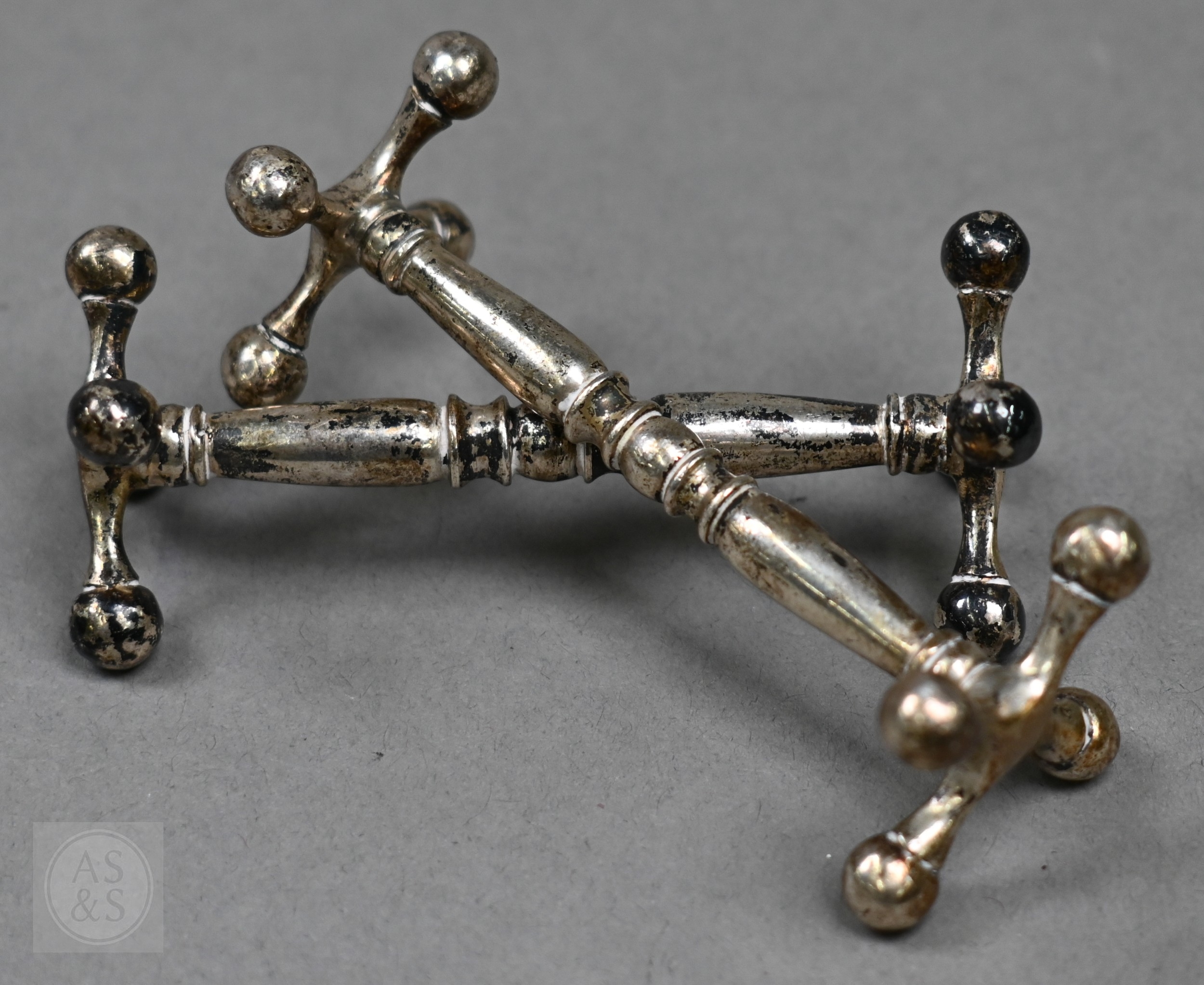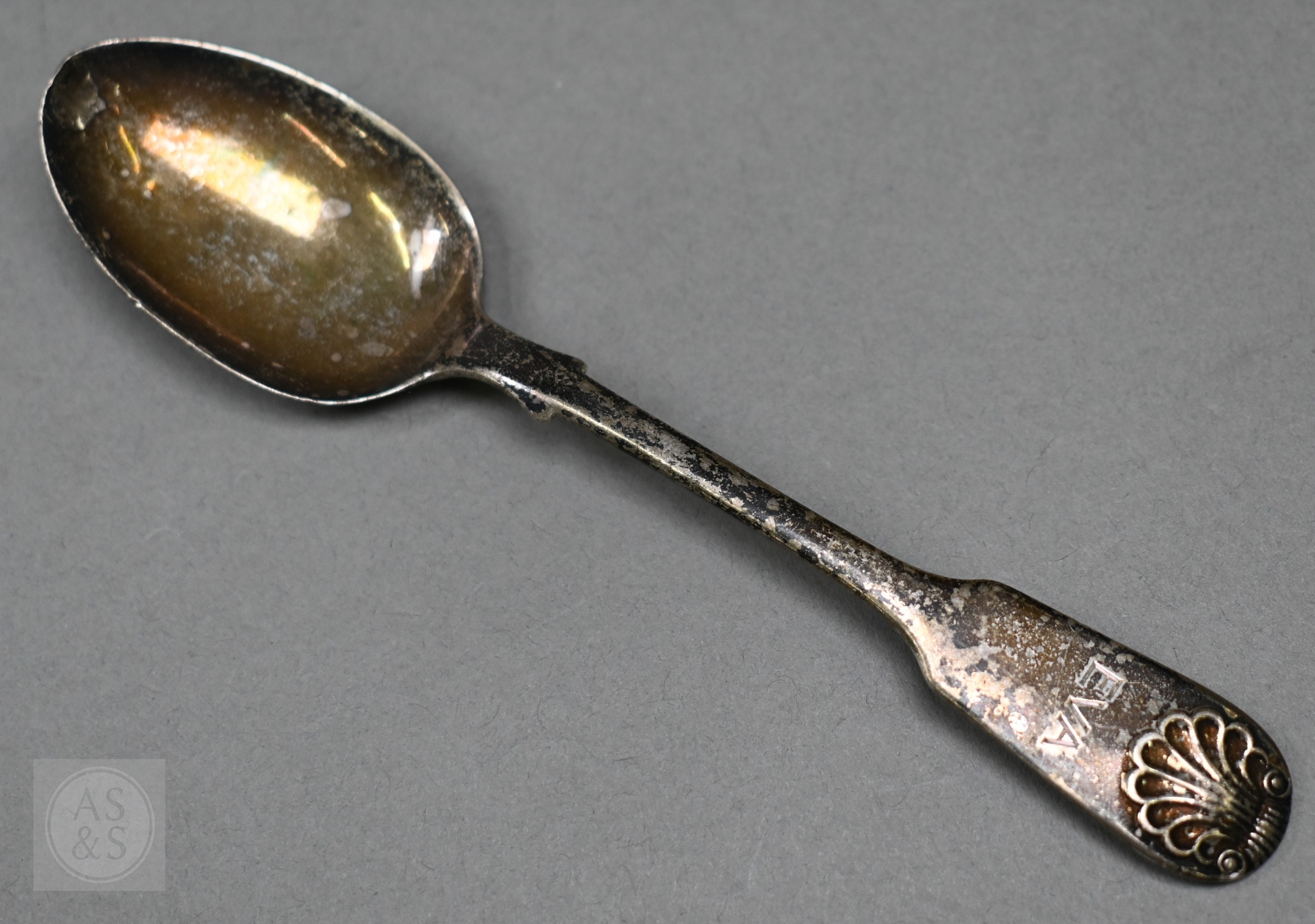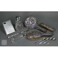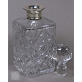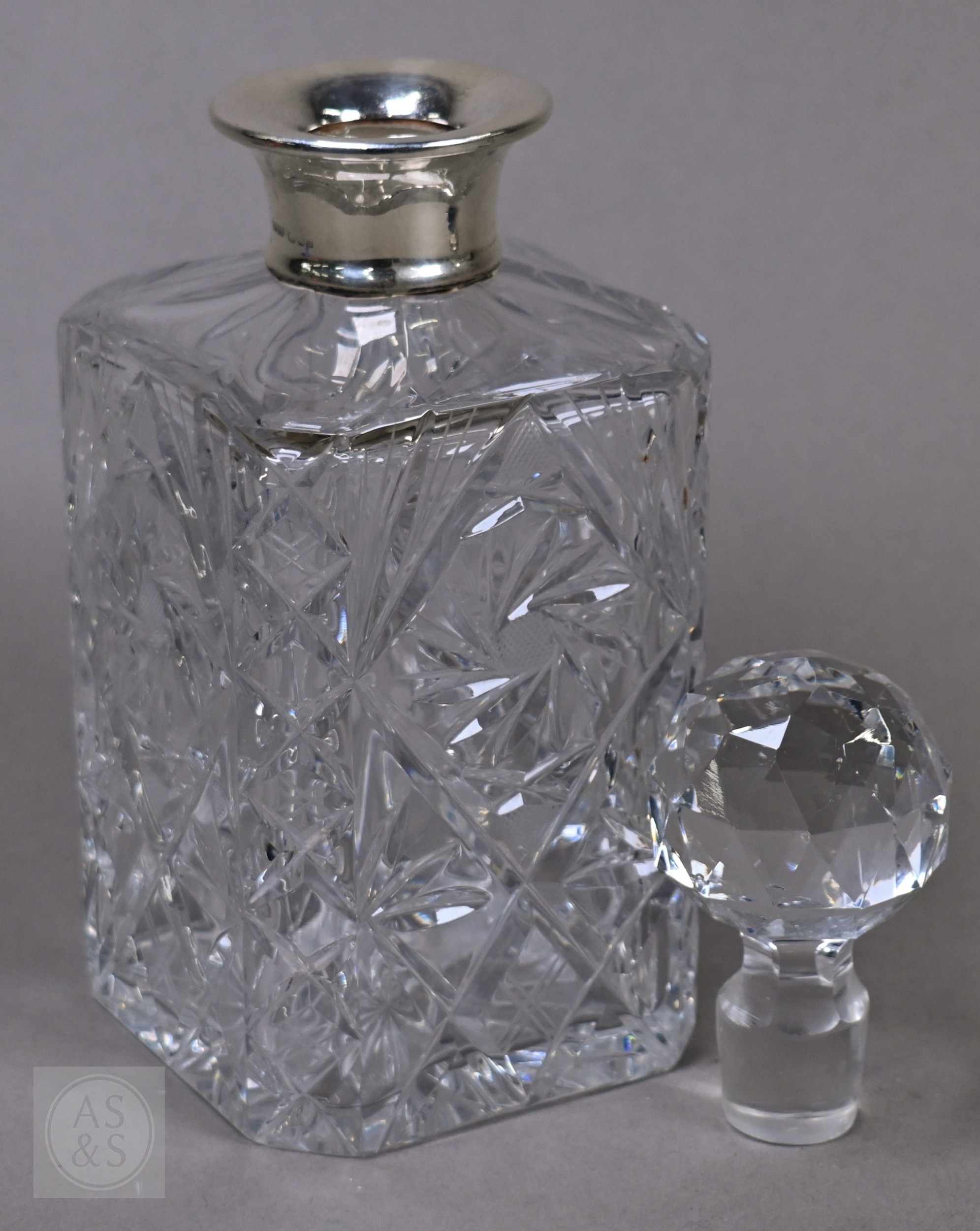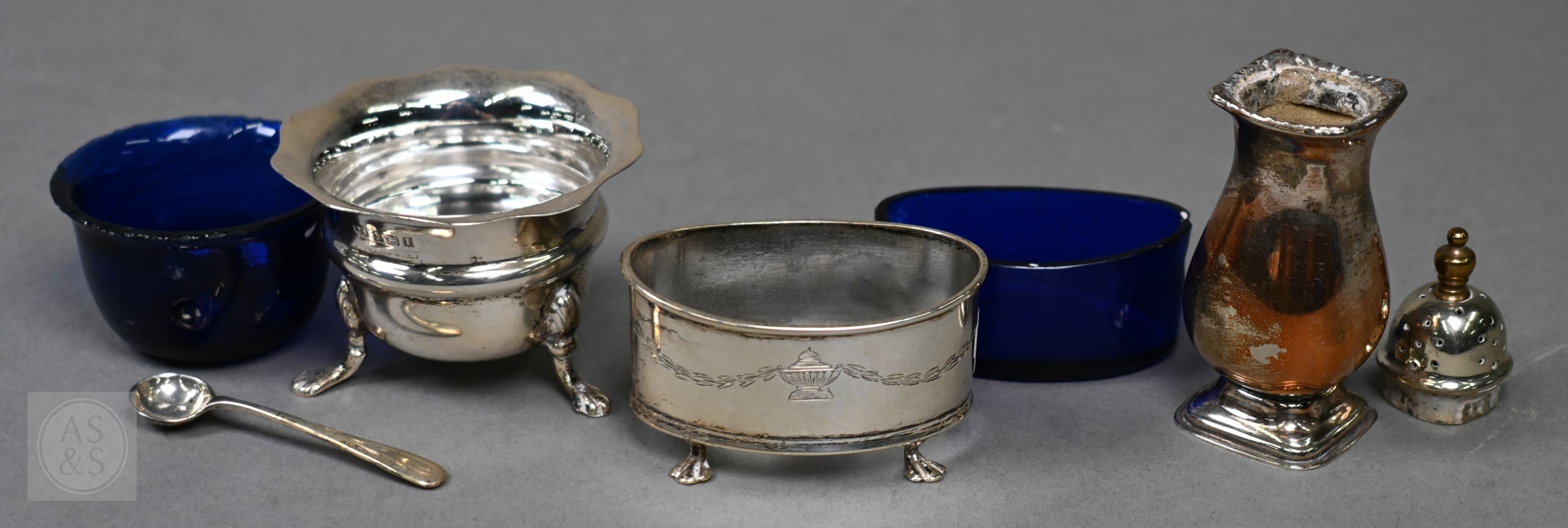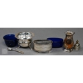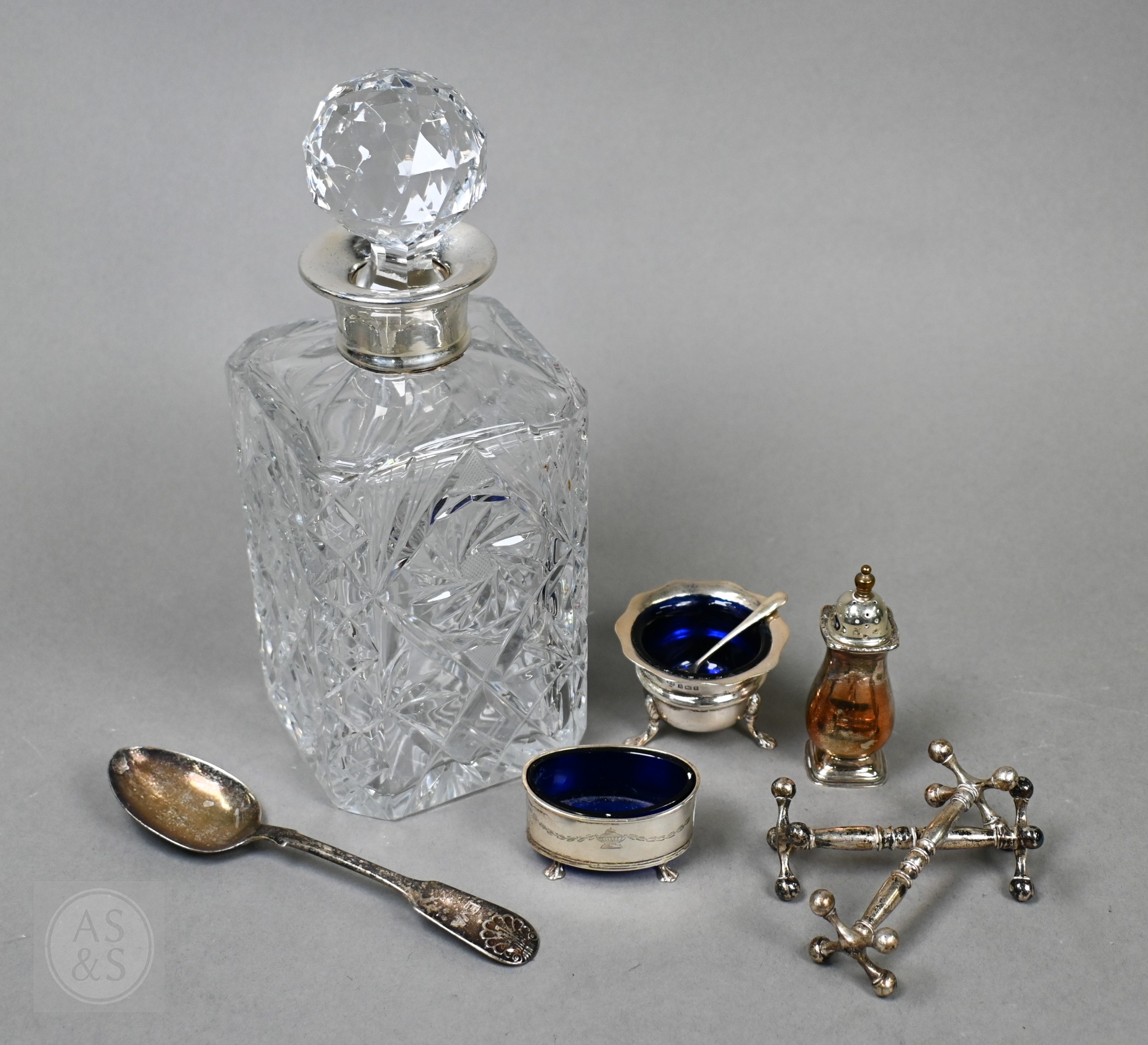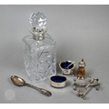 An Edwardian pair of silver knife rests, Sheffield 1902, two open salts with glass liners and a Victorian Scottish silver fiddle and shell dessert spoon, Edinburgh 1868, 6.6oz of weighable silver, to/w a square-cut decanter with silver collar and an epns pepperette