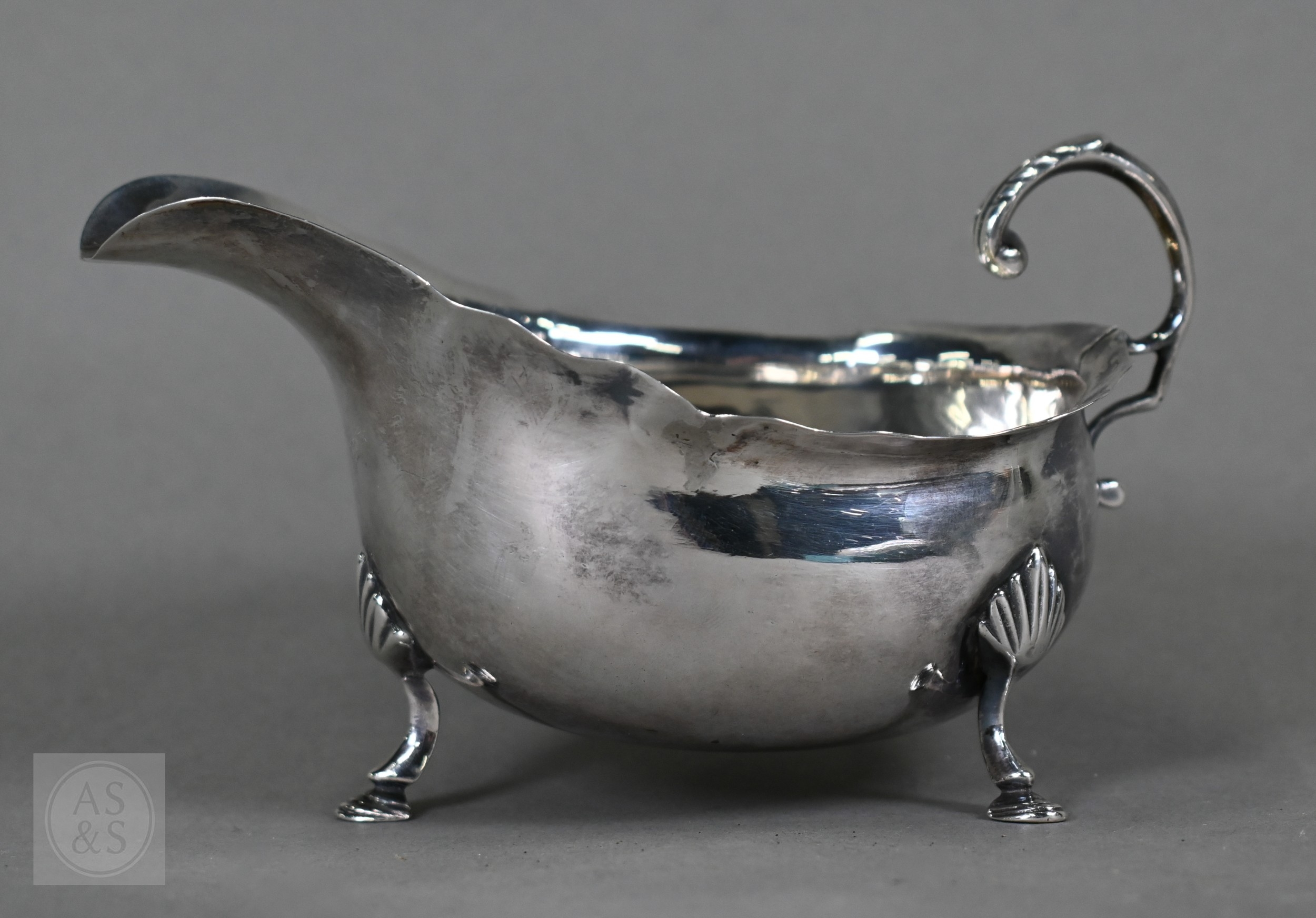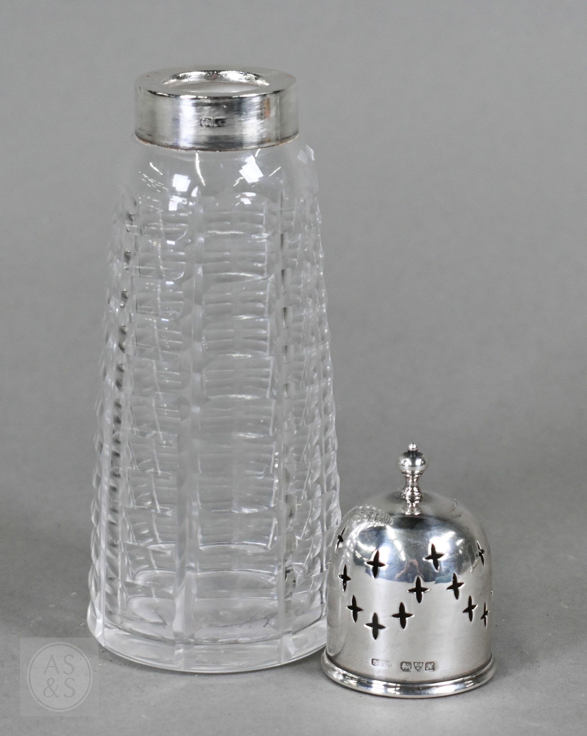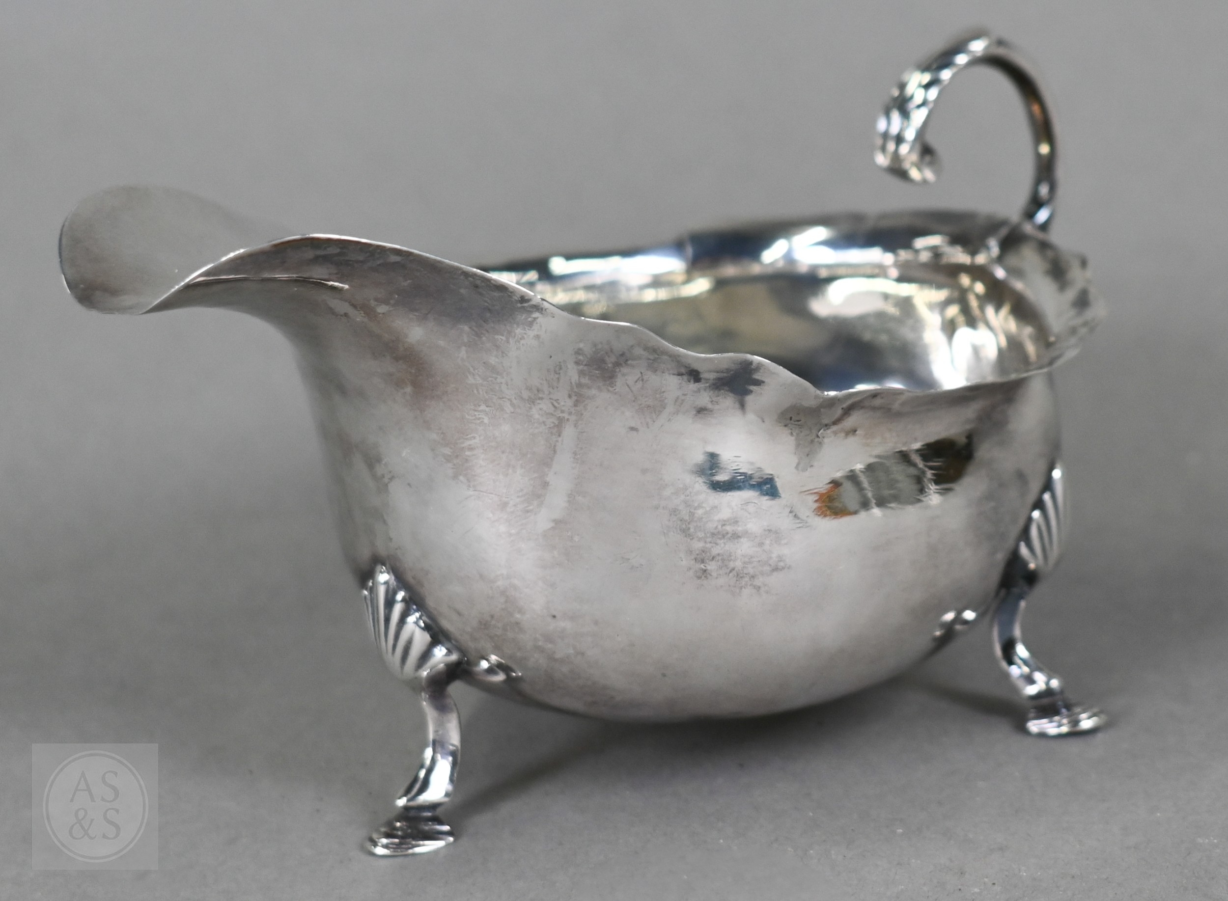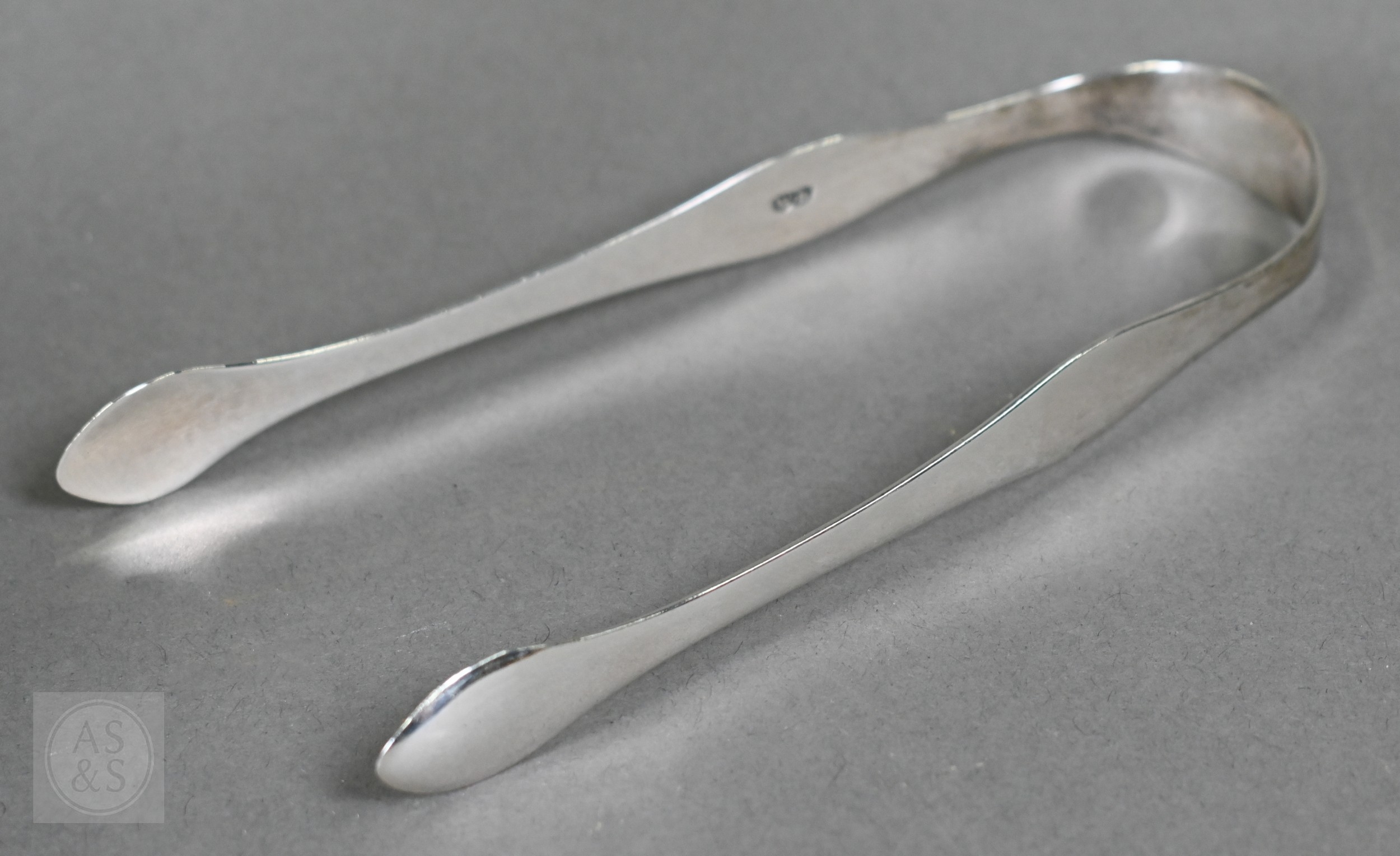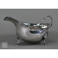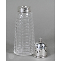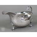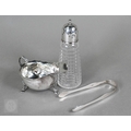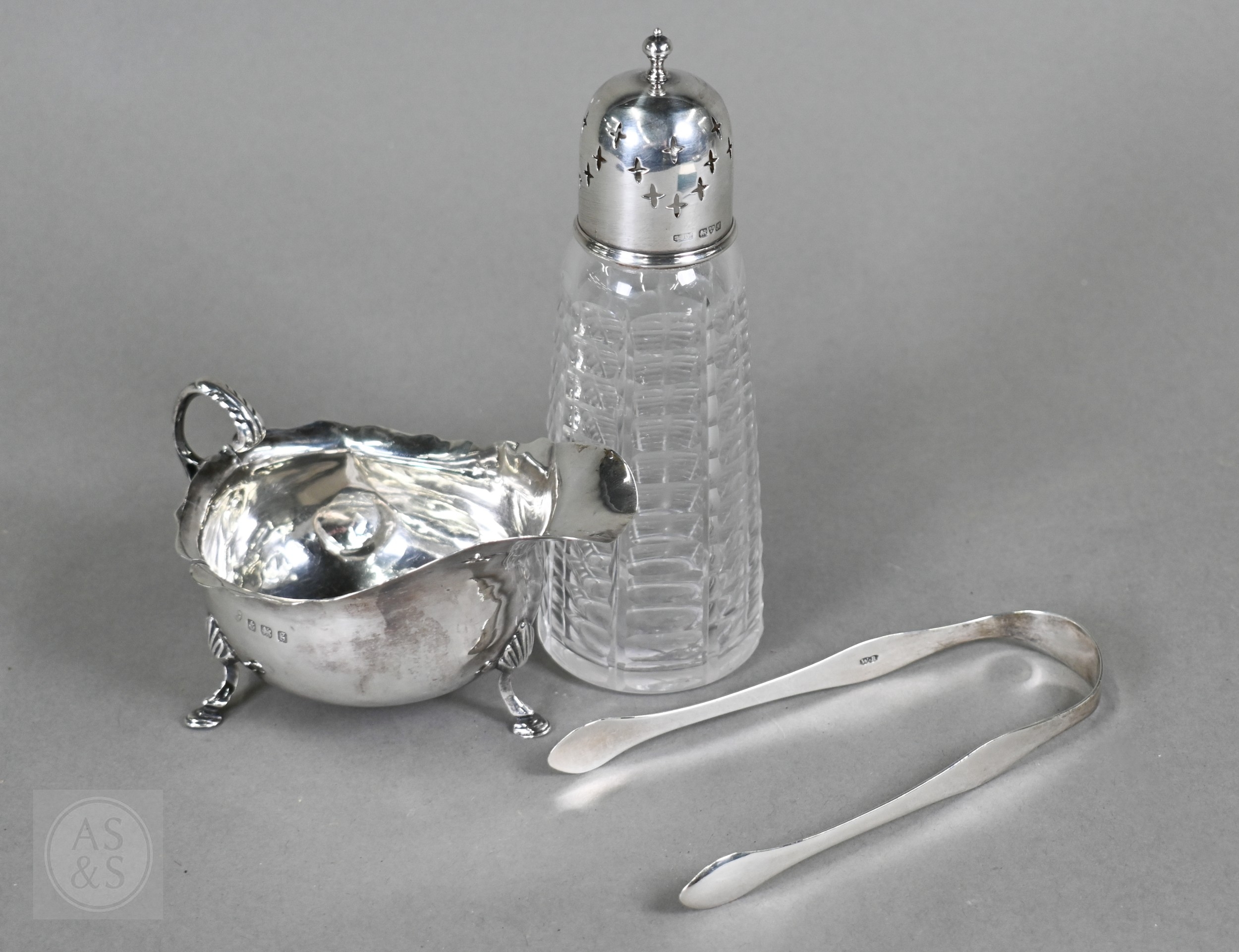 An Edwardian silver cream boat, Birmingham 1906, to/w a pair of George IV sugar tongs, William Bateman I, London 1822 and a cut glass sugar caster with silver top, 4.9ozt of weighable silver (3)
