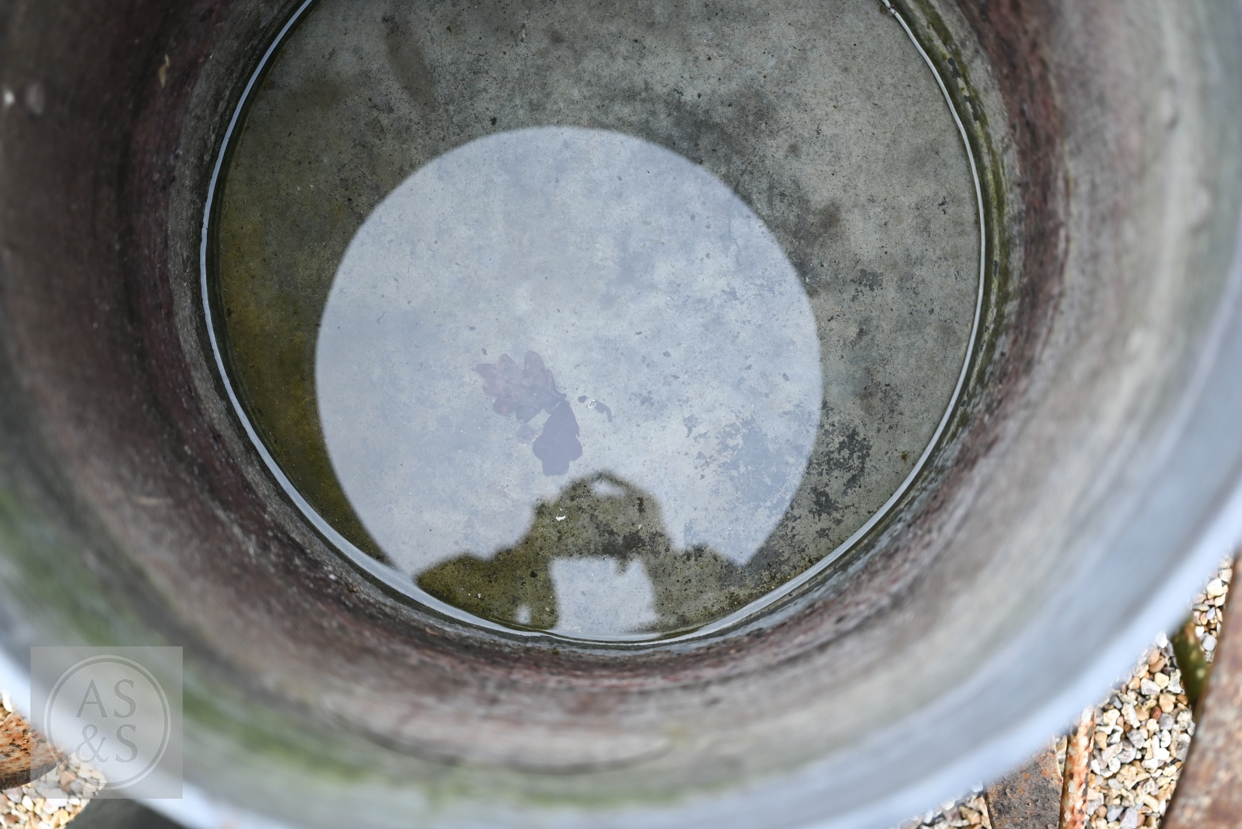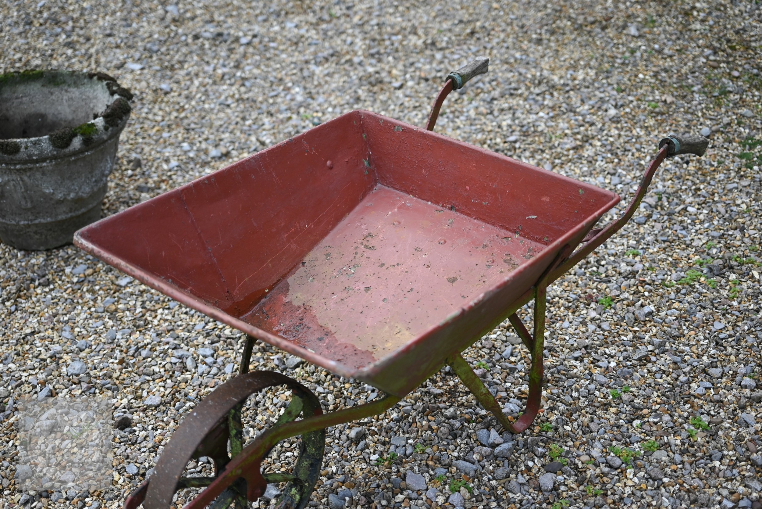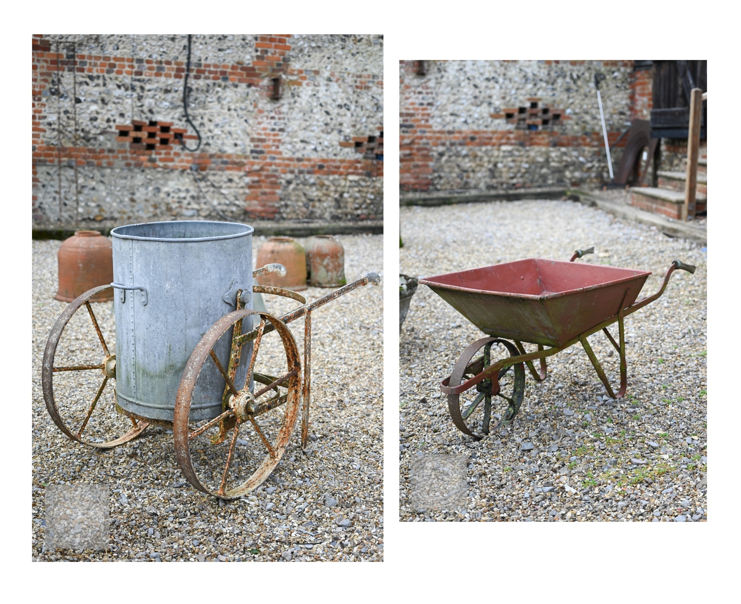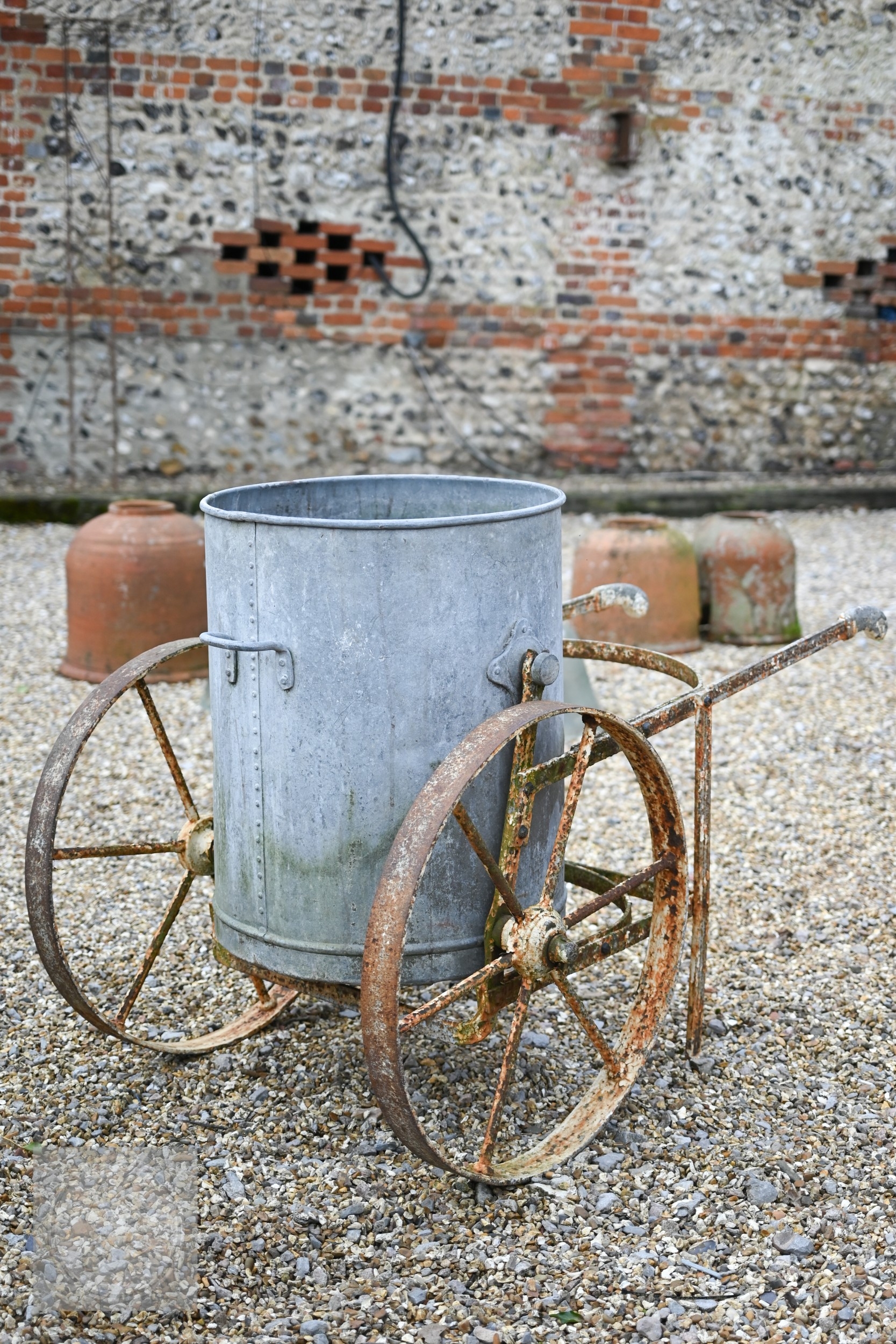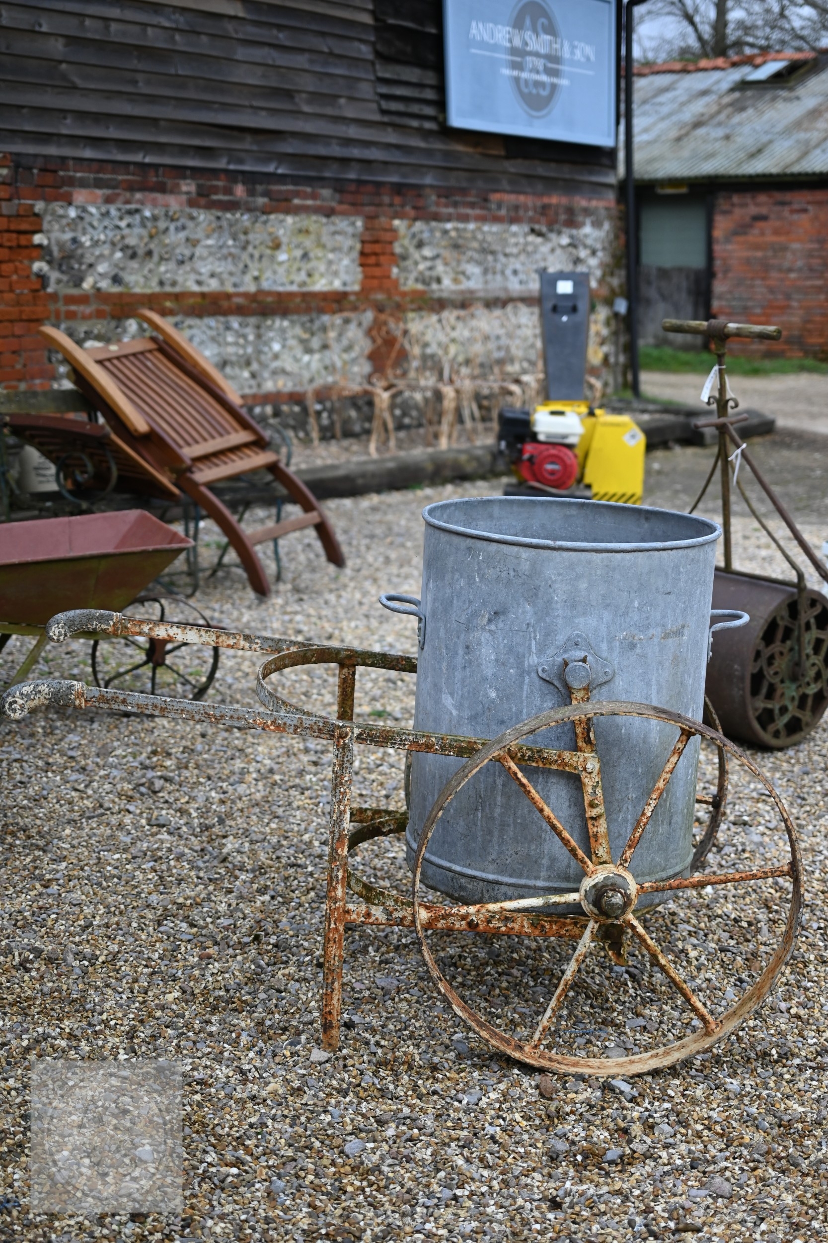 A vintage galvanised water carrier on twin wheeled cast iron frame to/with a wheel barrow (2)
