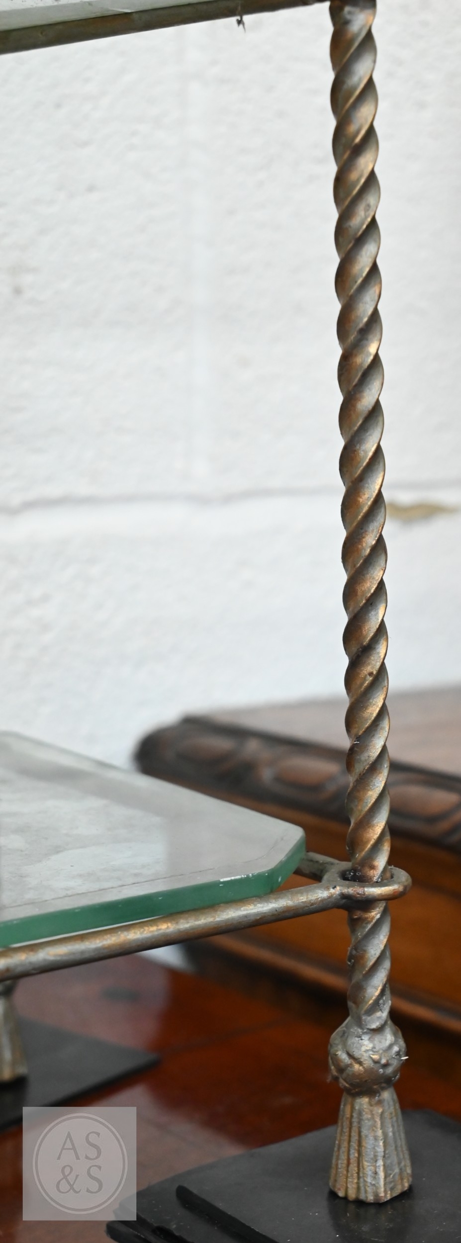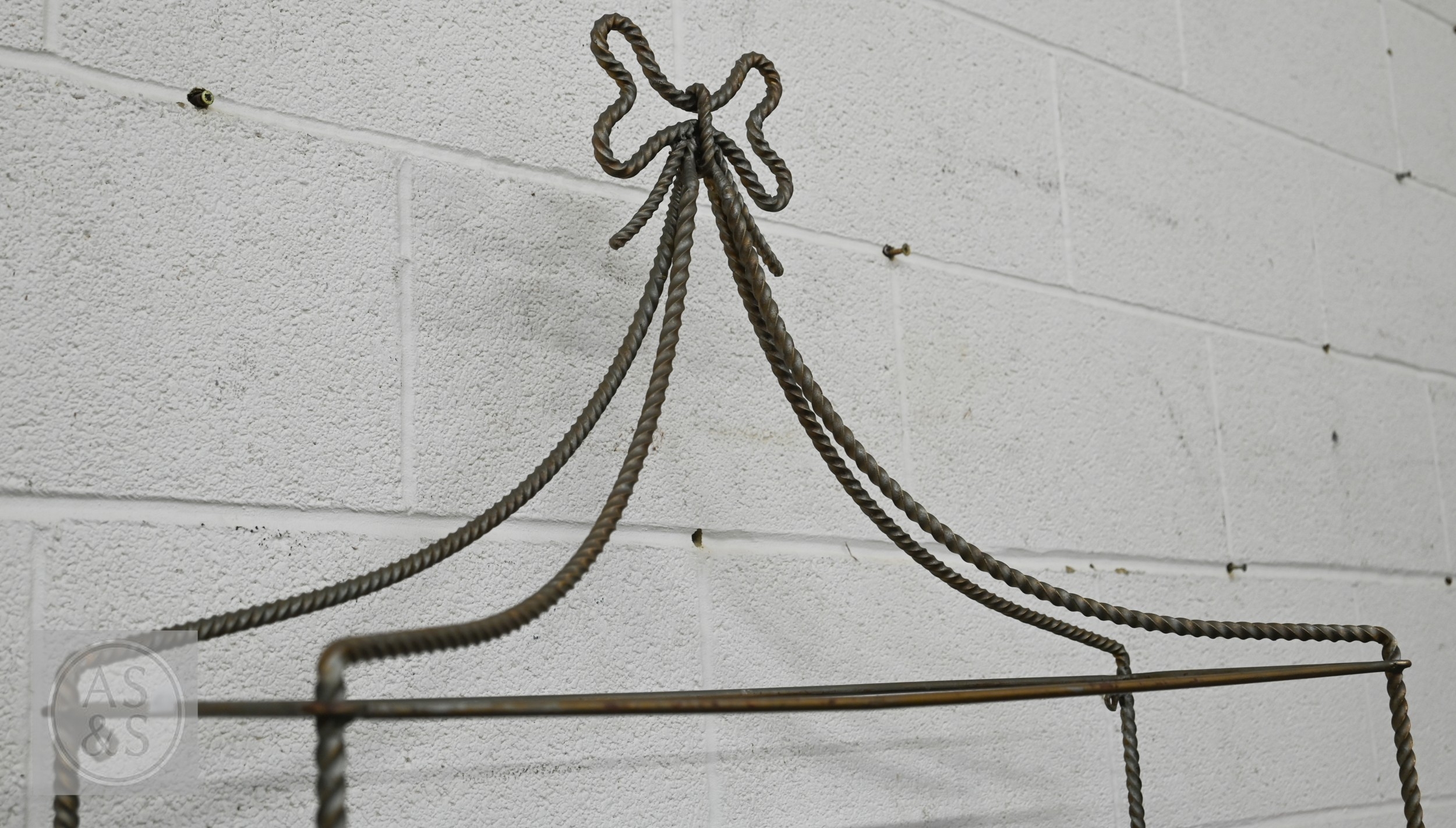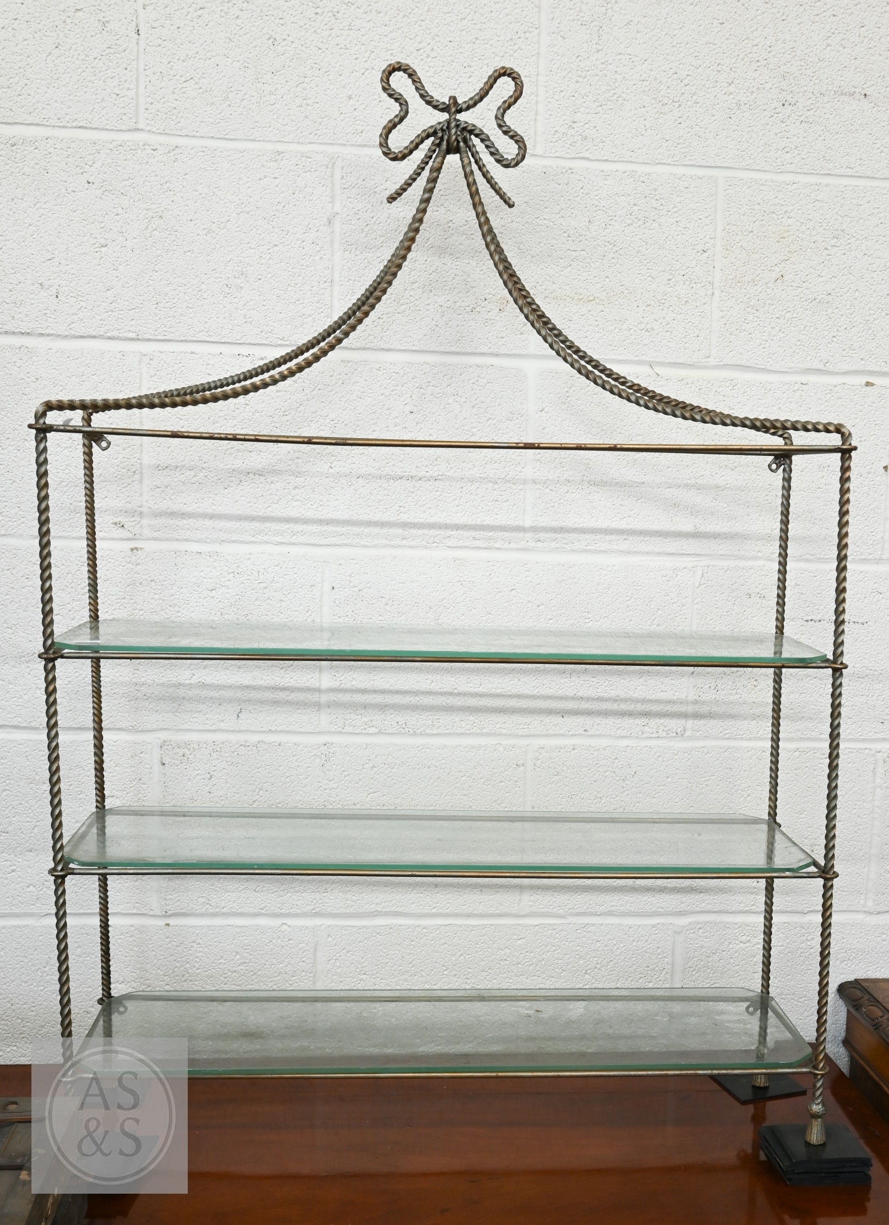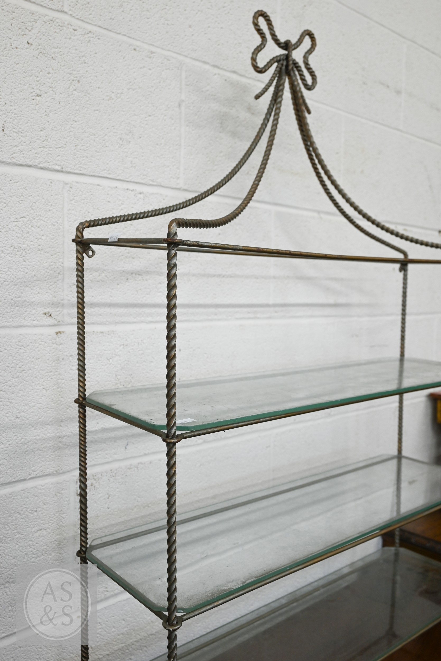 A gilt metal 'rope twist' open shelving unit with three glass shelves, 80 x 24 x 110 cm high