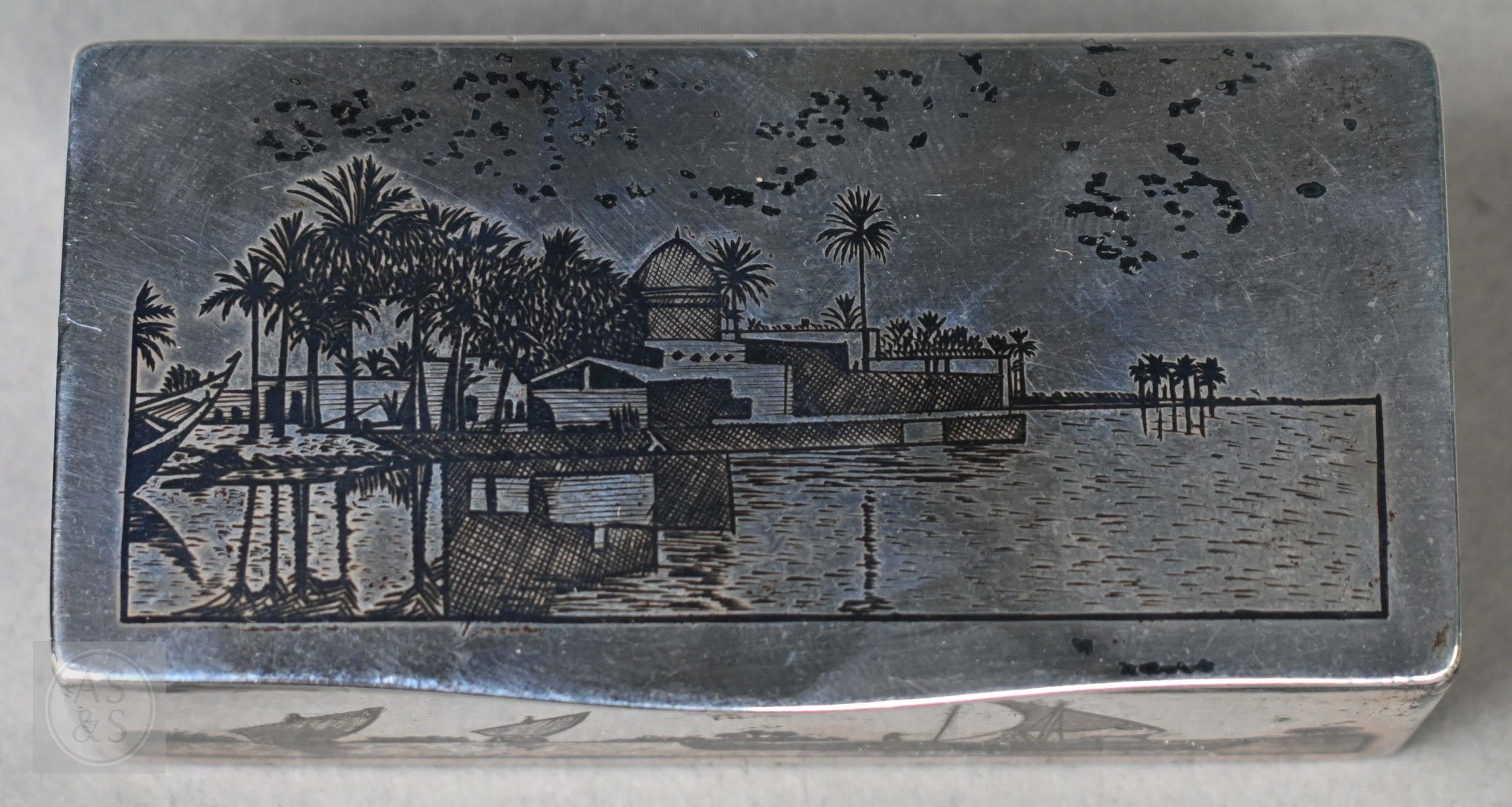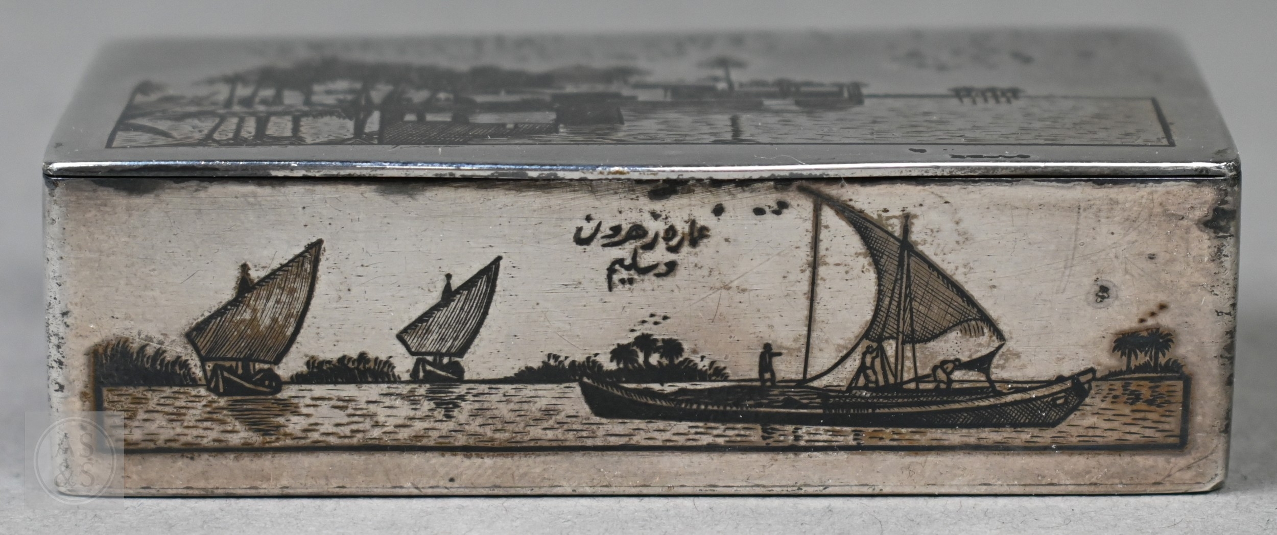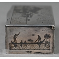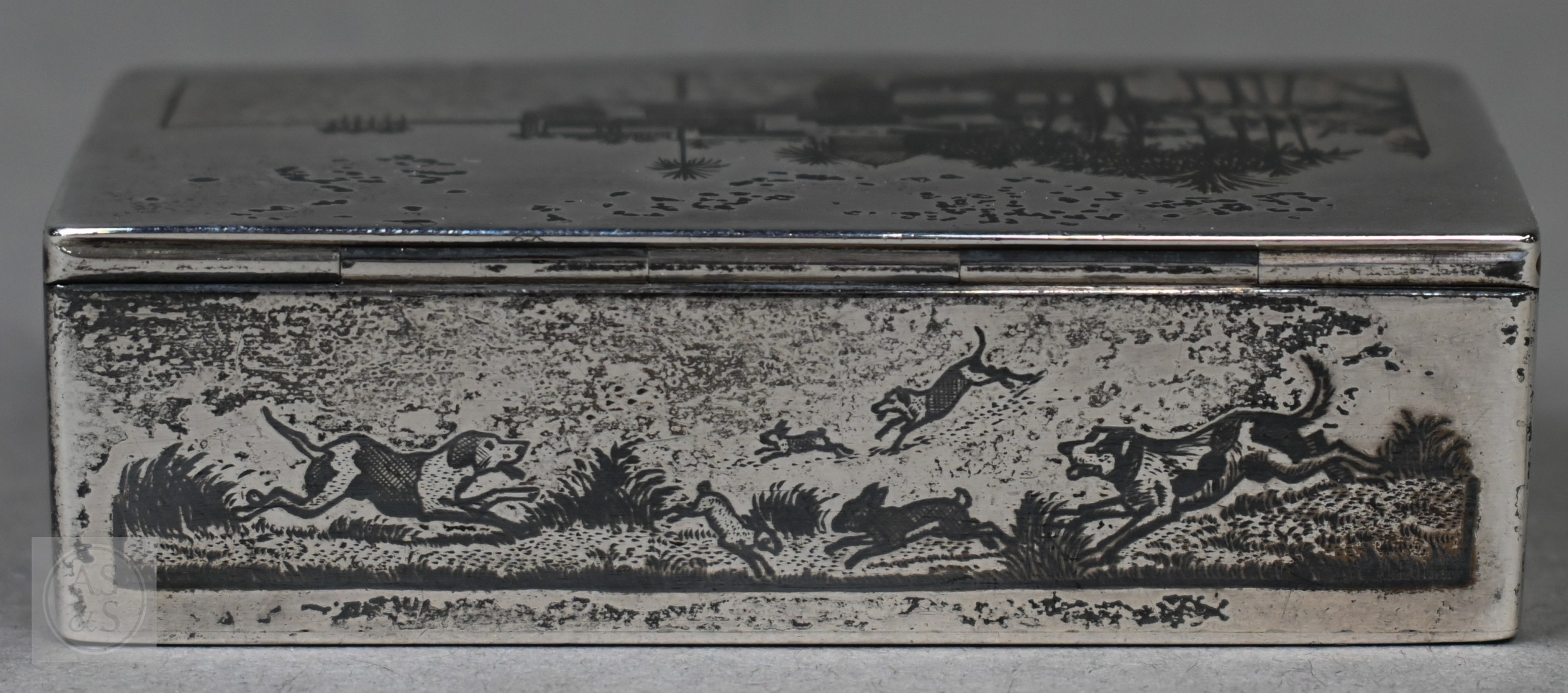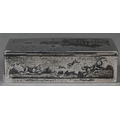 An antique Egyptian unmarked (and untested) white metal snuff box with niello decoration of Nile views, the back depicting dogs hunting rabbits, 7.5cm wide