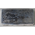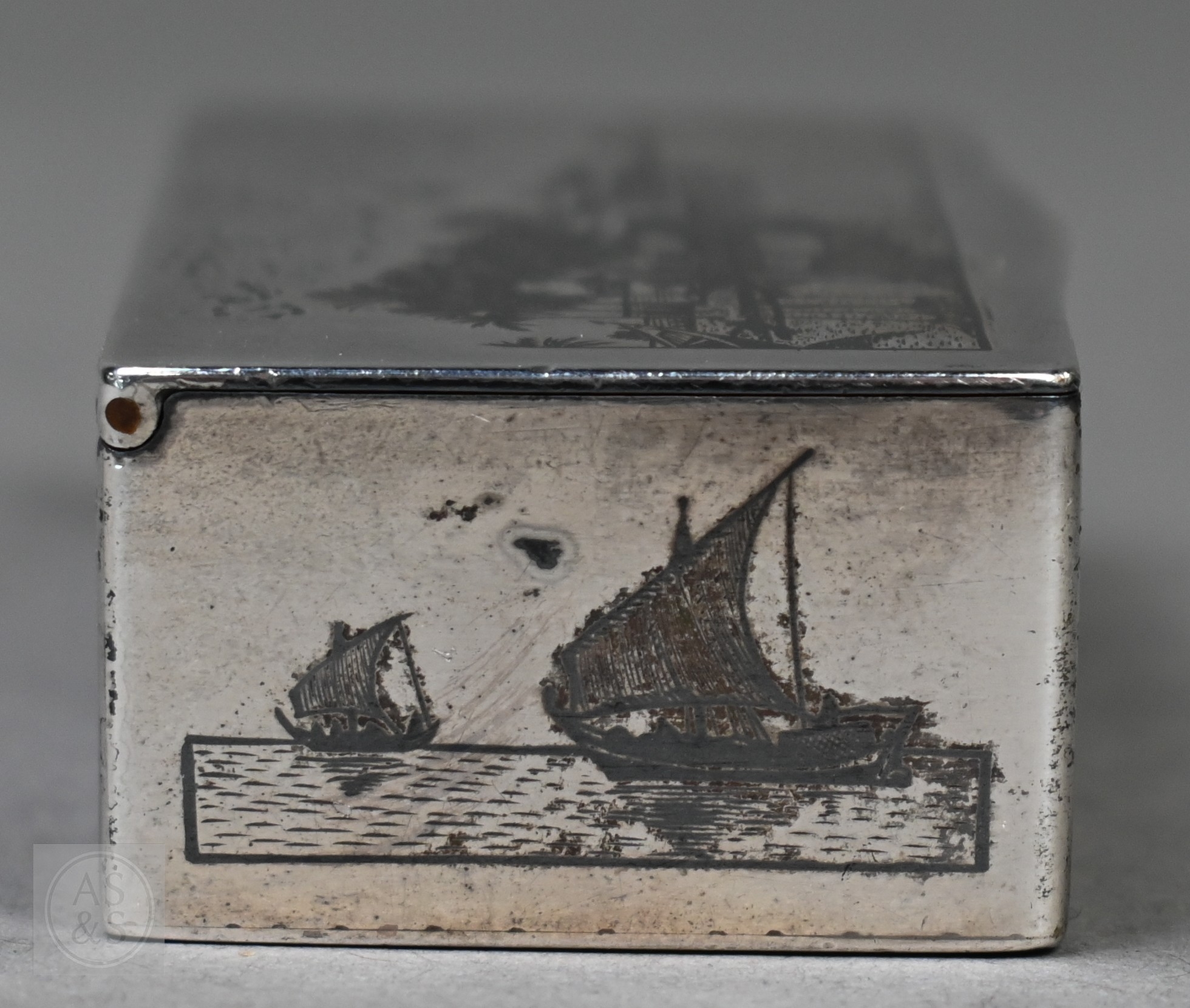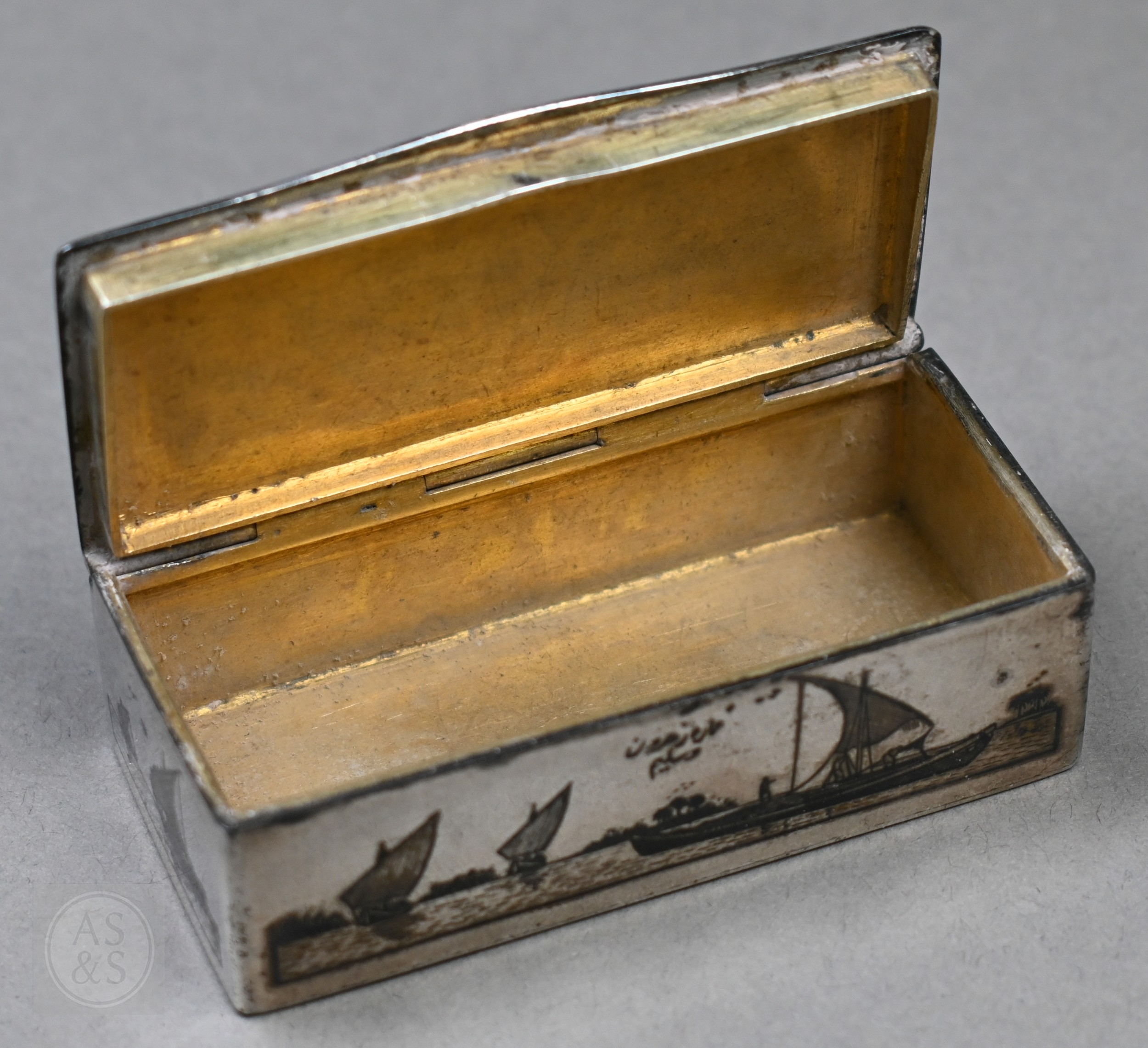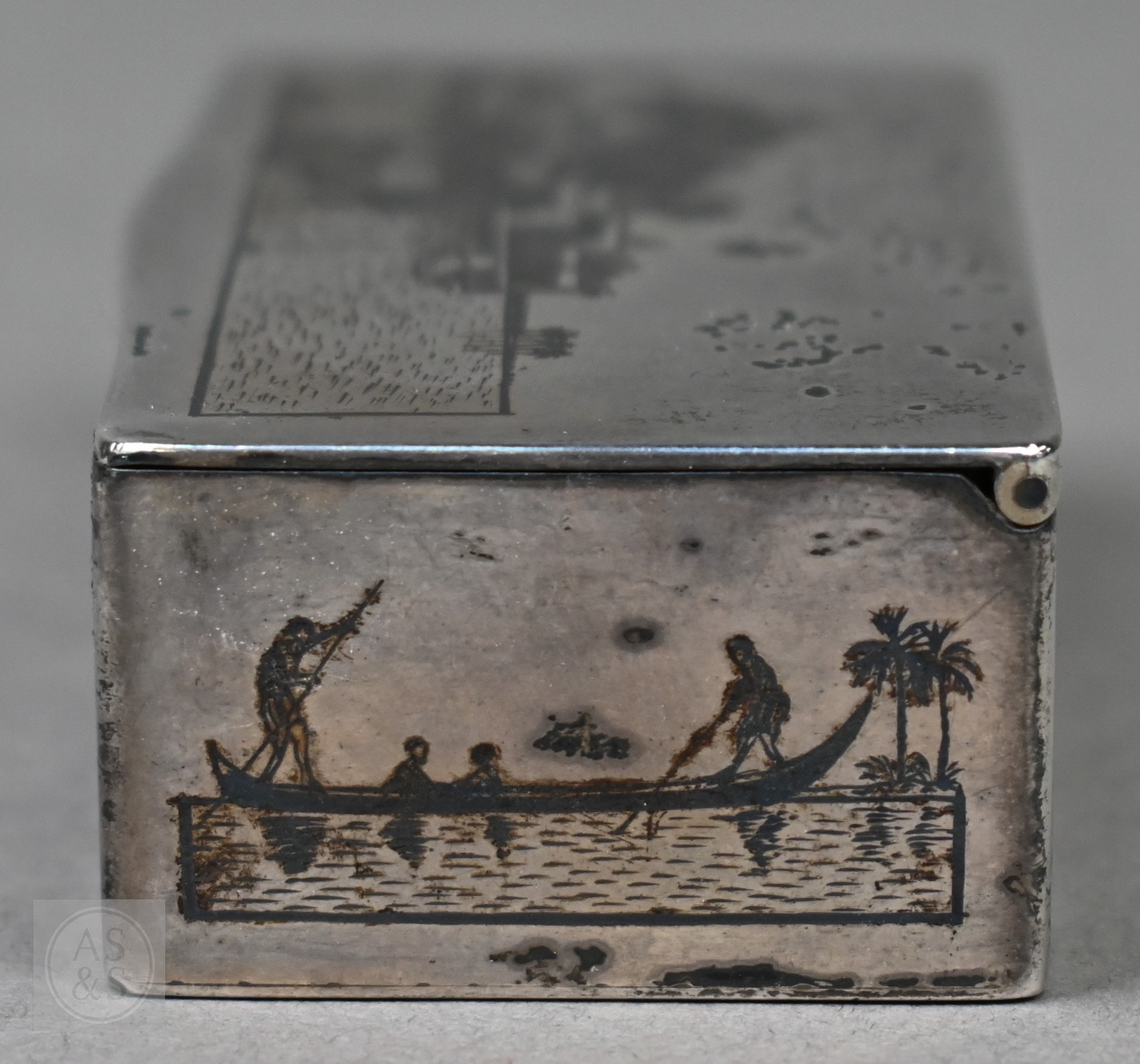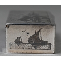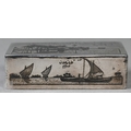 An antique Egyptian unmarked (and untested) white metal snuff box with niello decoration of Nile views, the back depicting dogs hunting rabbits, 7.5cm wide