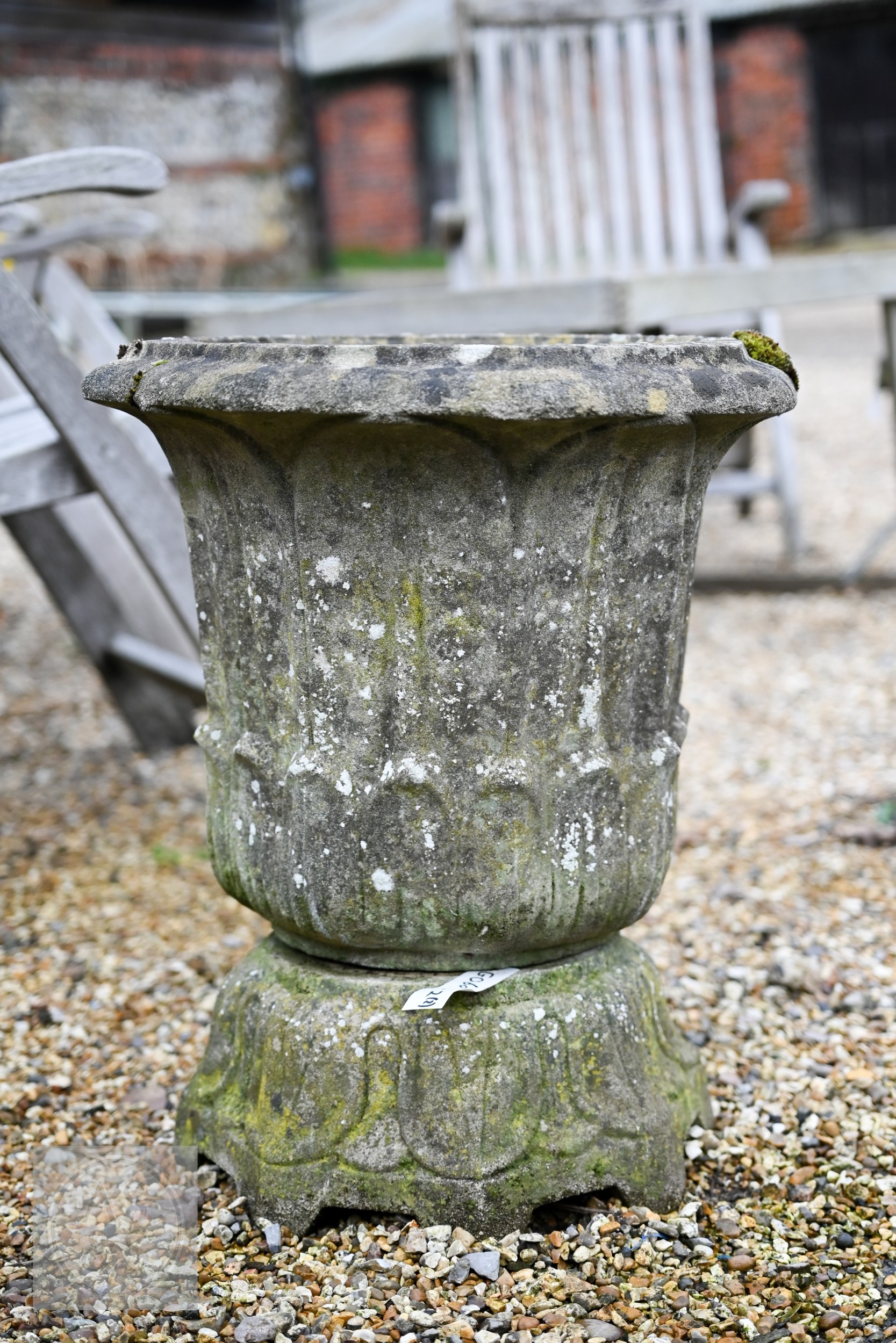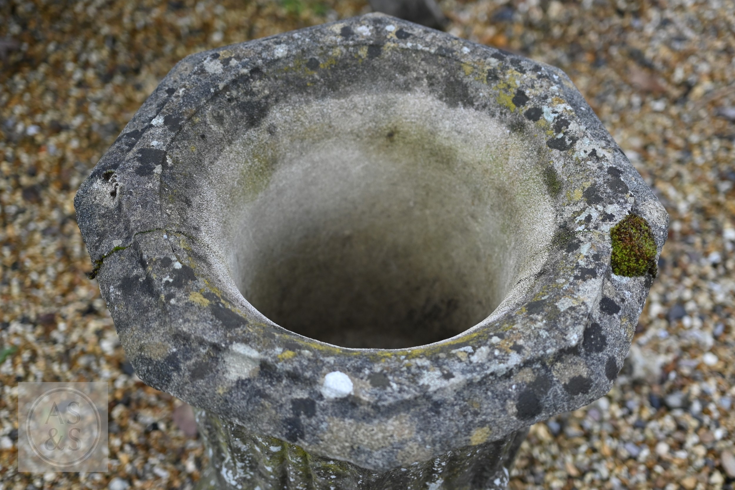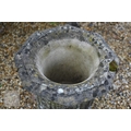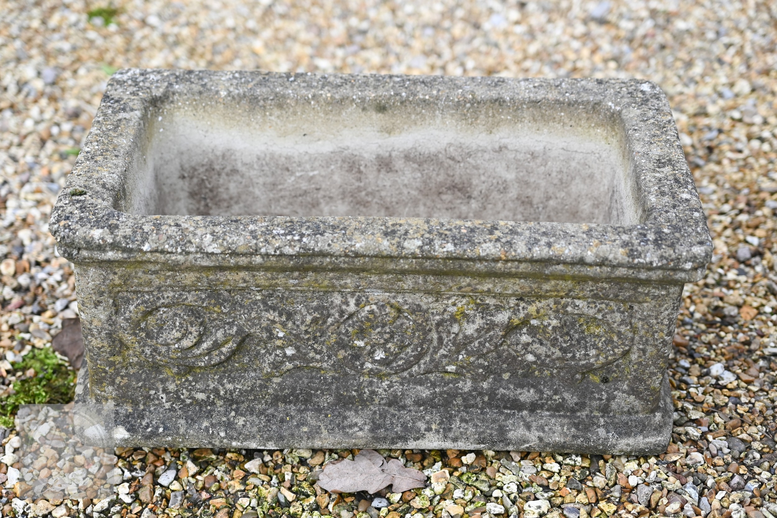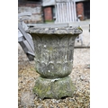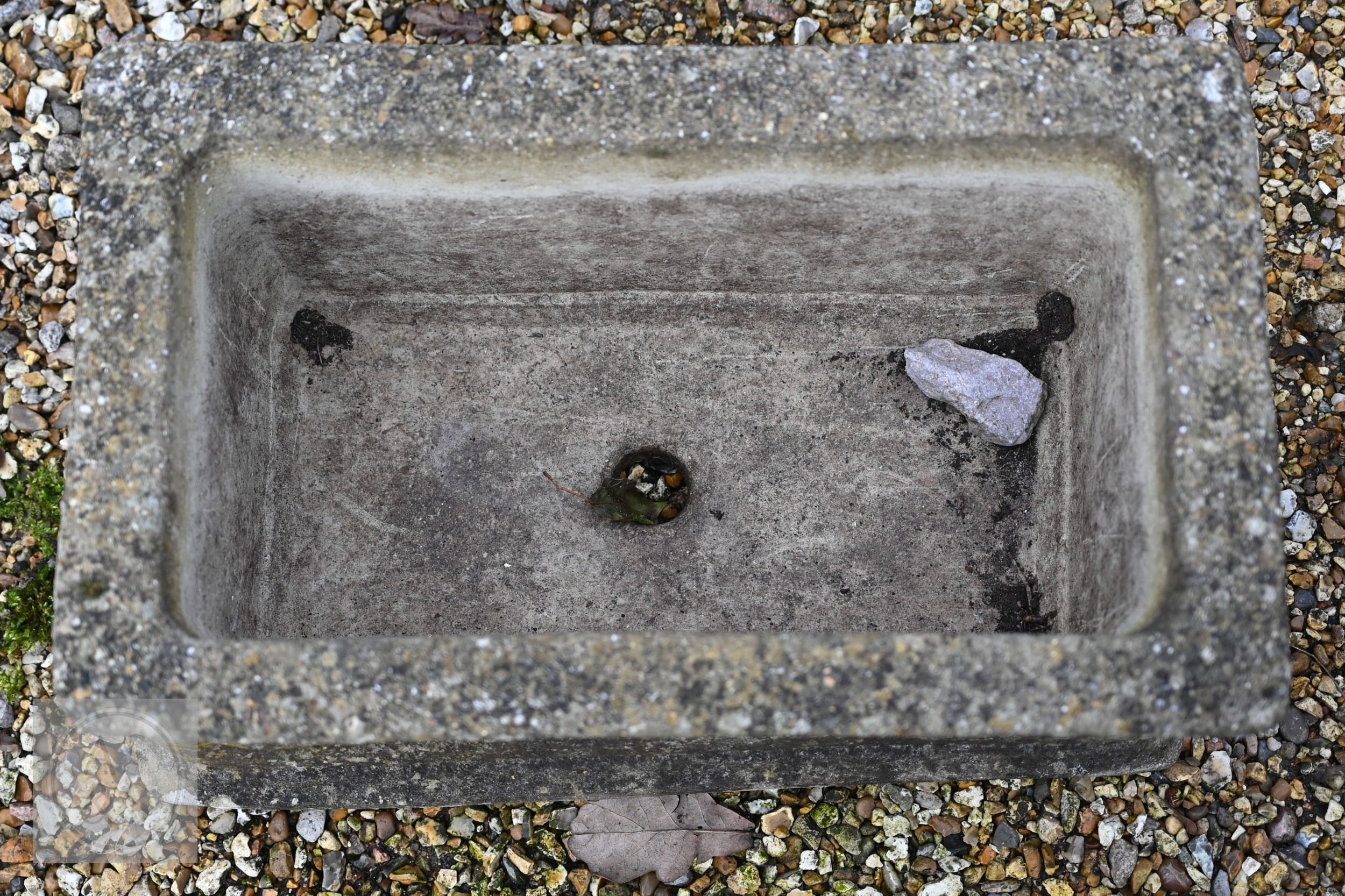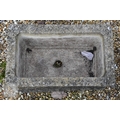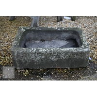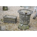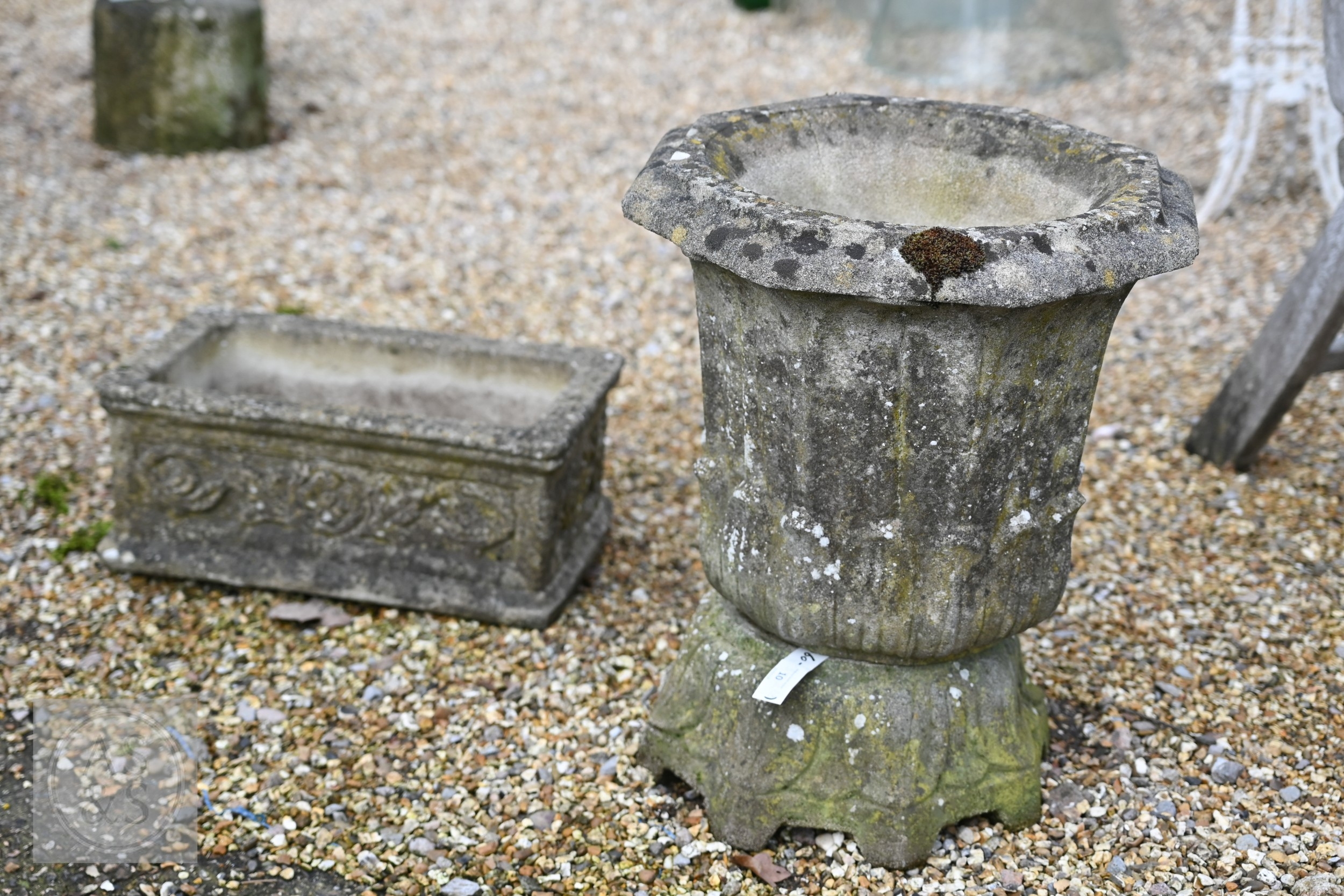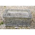 An old weathered cast stone two piece garden planter to/with a small cast stone trough planter (2)