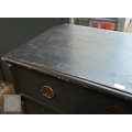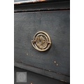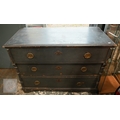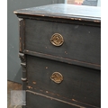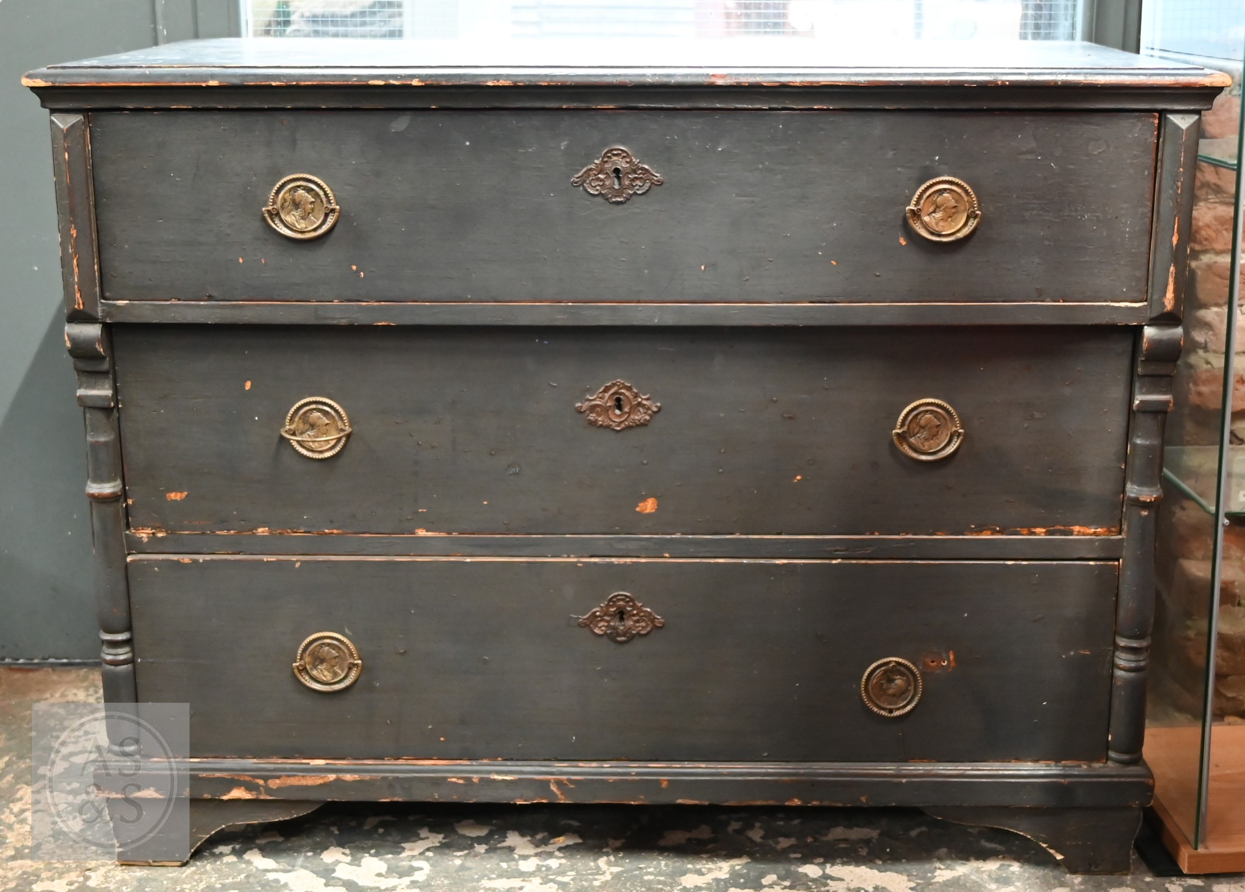 An antique continental three drawer commode chest, with brass fittings, painted dark grey and raised on shaped bracket feet, 125 cm w x 59 cm x 92 cm h