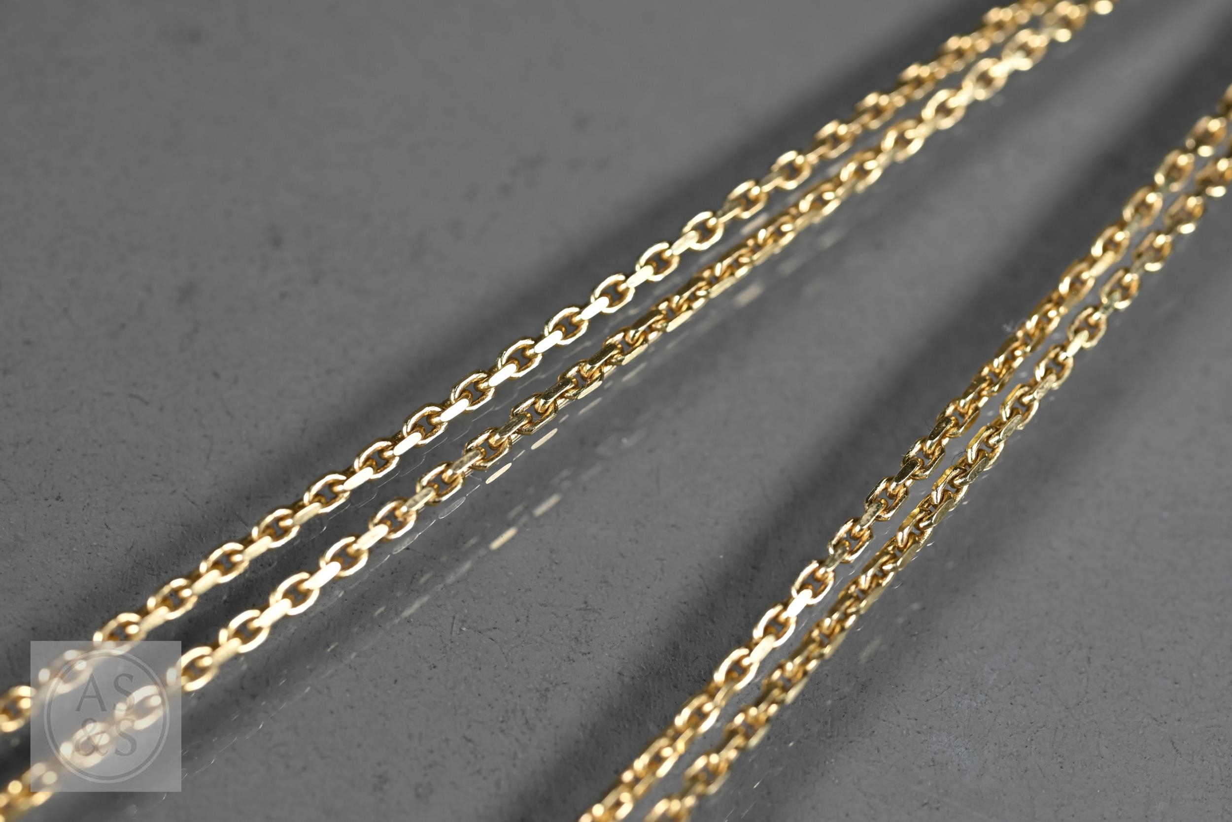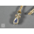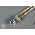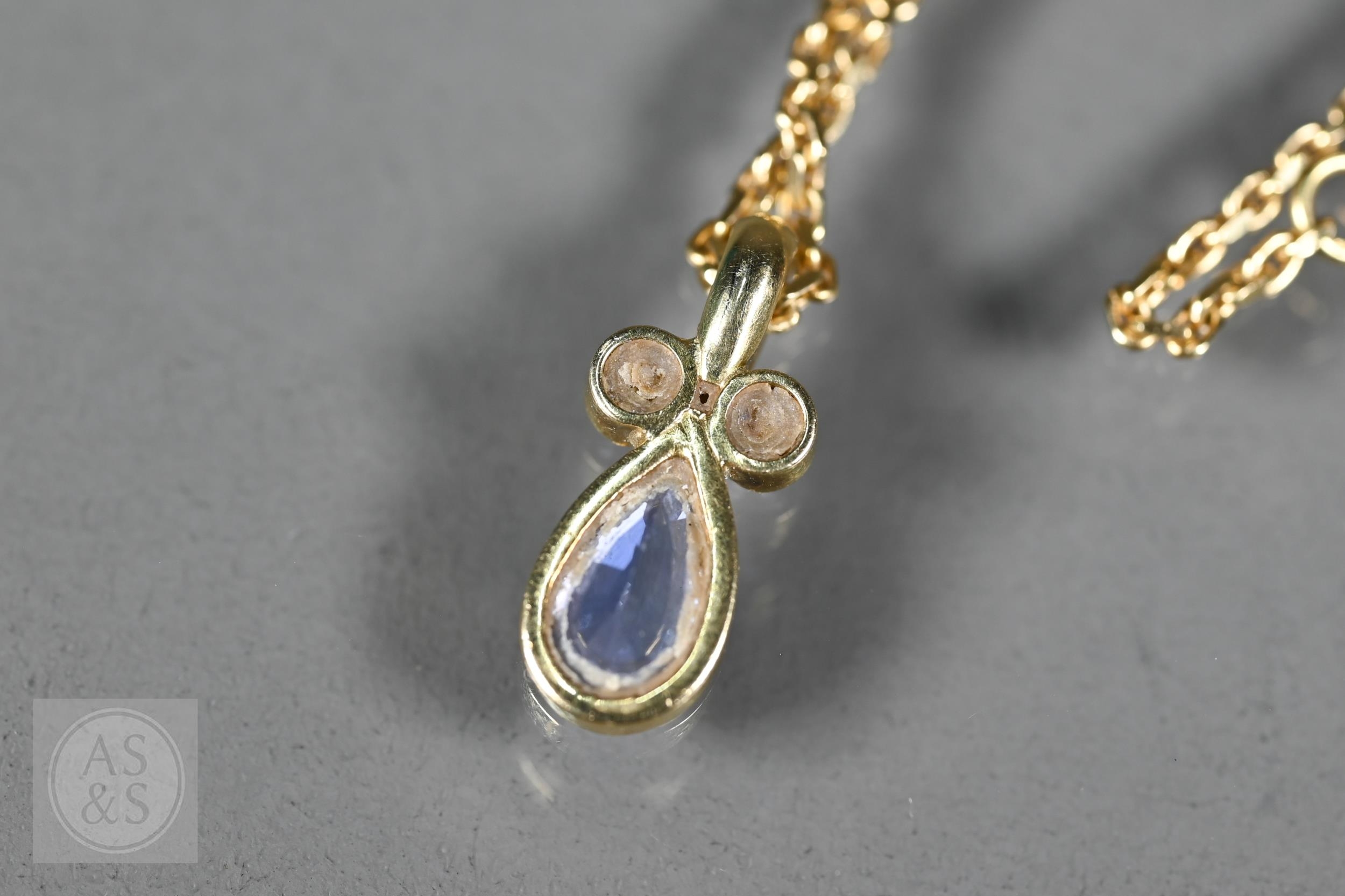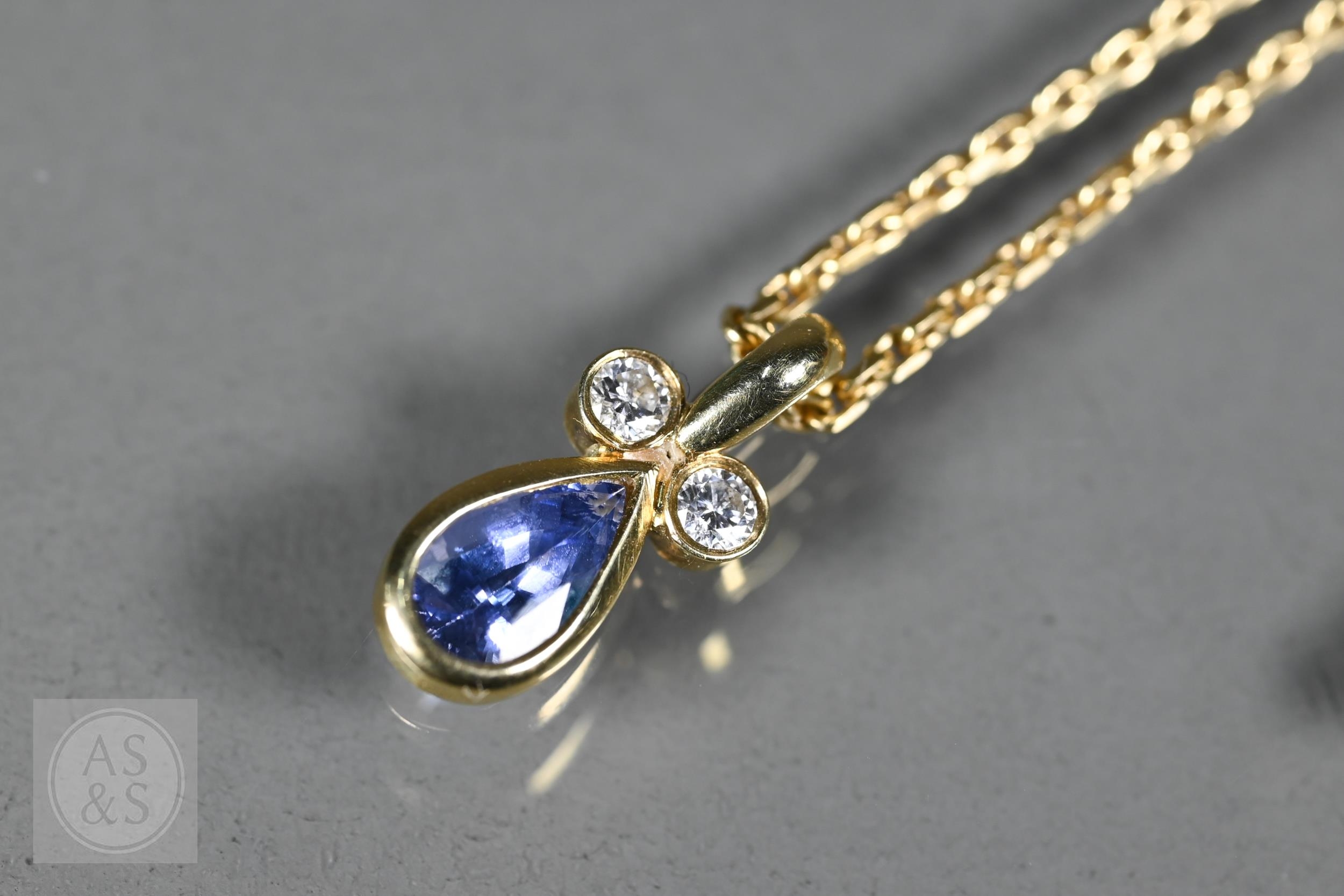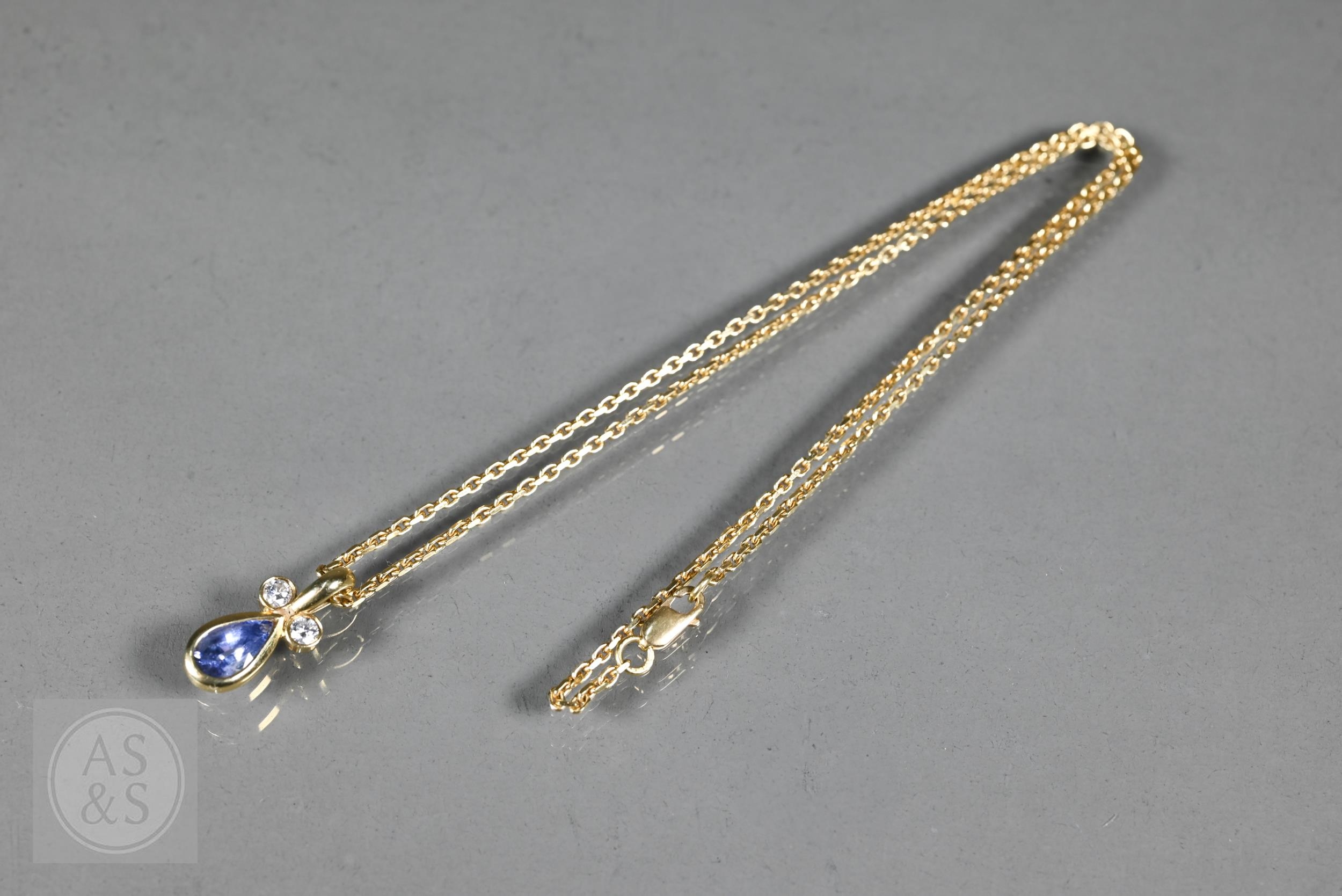 An 18ct yellow gold pendant with tear-shaped blue sapphire and two collet-set diamonds above, on 18ct yellow gold flat curb link chain, approx 7g all in