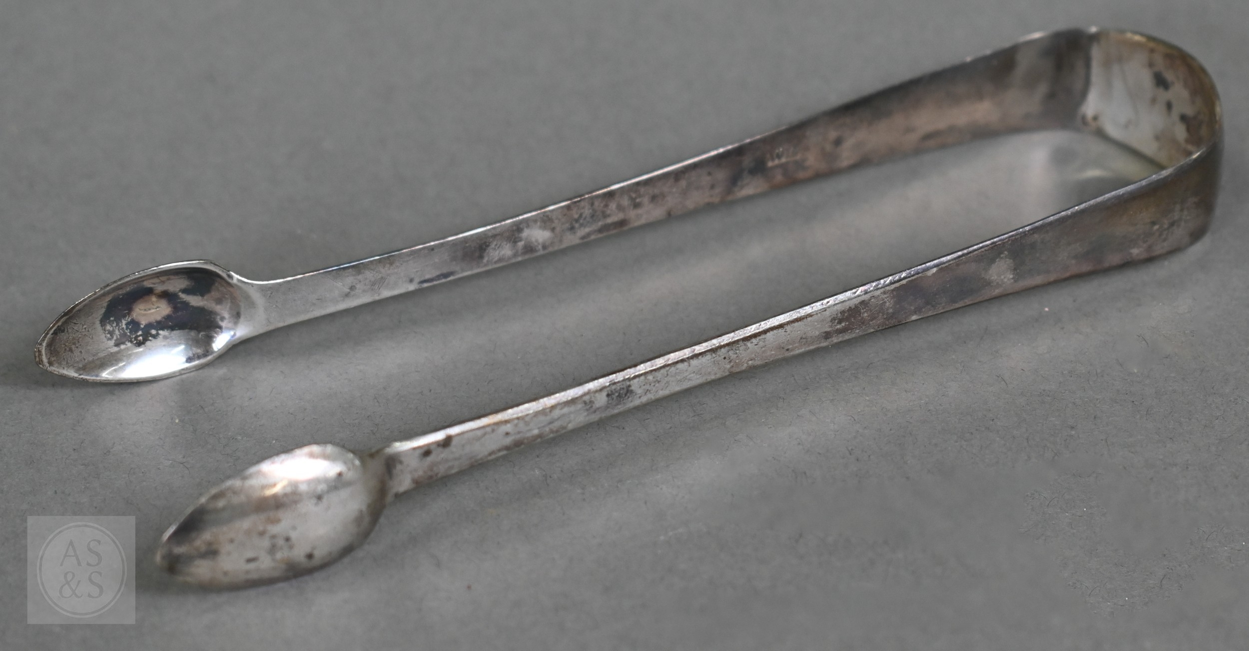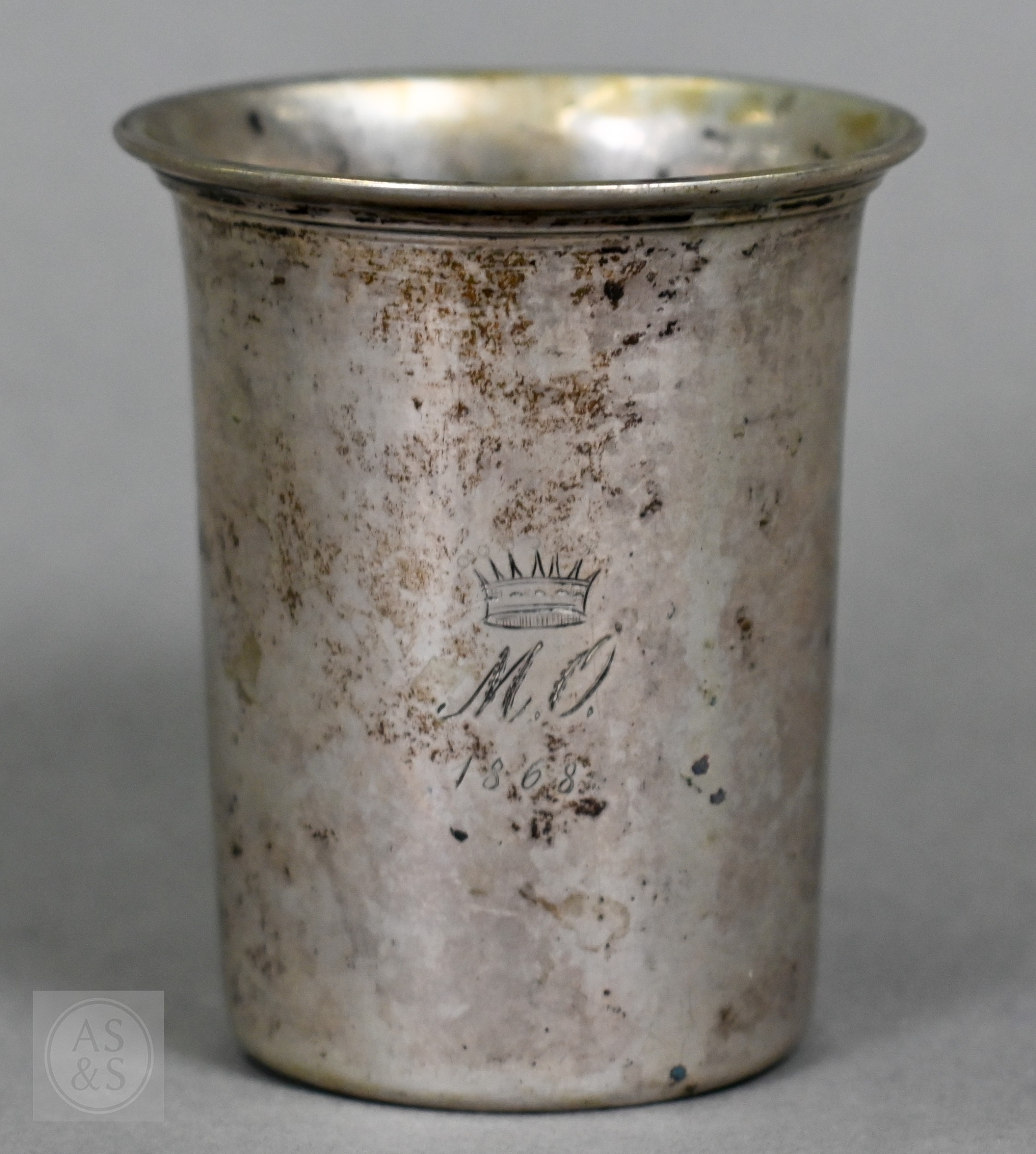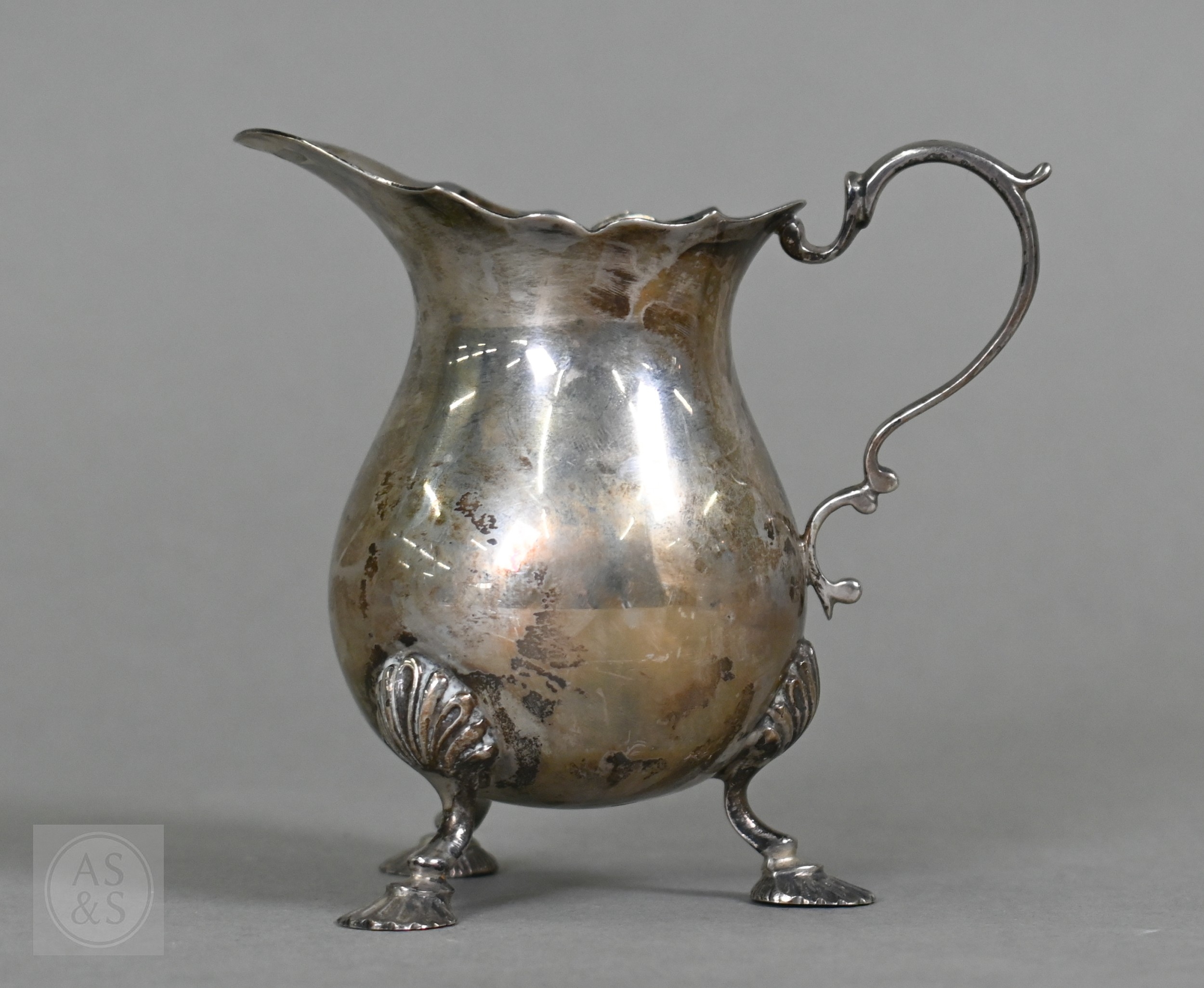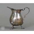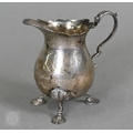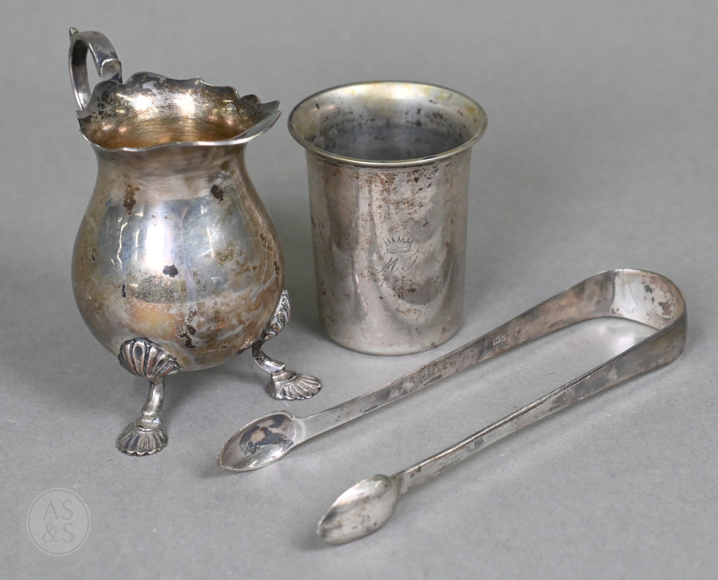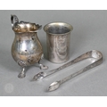 A heavy quality silver pear-shaped cream jug in the Georgian manner, with scroll handle and shell feet, Payne & Son (Oxford), London 1965 and a pair of George III sugar tongs, William Eaton (probably), London 1818, 4.5 ozt total, to/w an Austro-Hungarian 13 lothige (.812 grade) shot-beaker engraved with crowned MO cypher and dated 1868 (3)