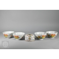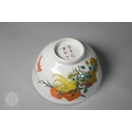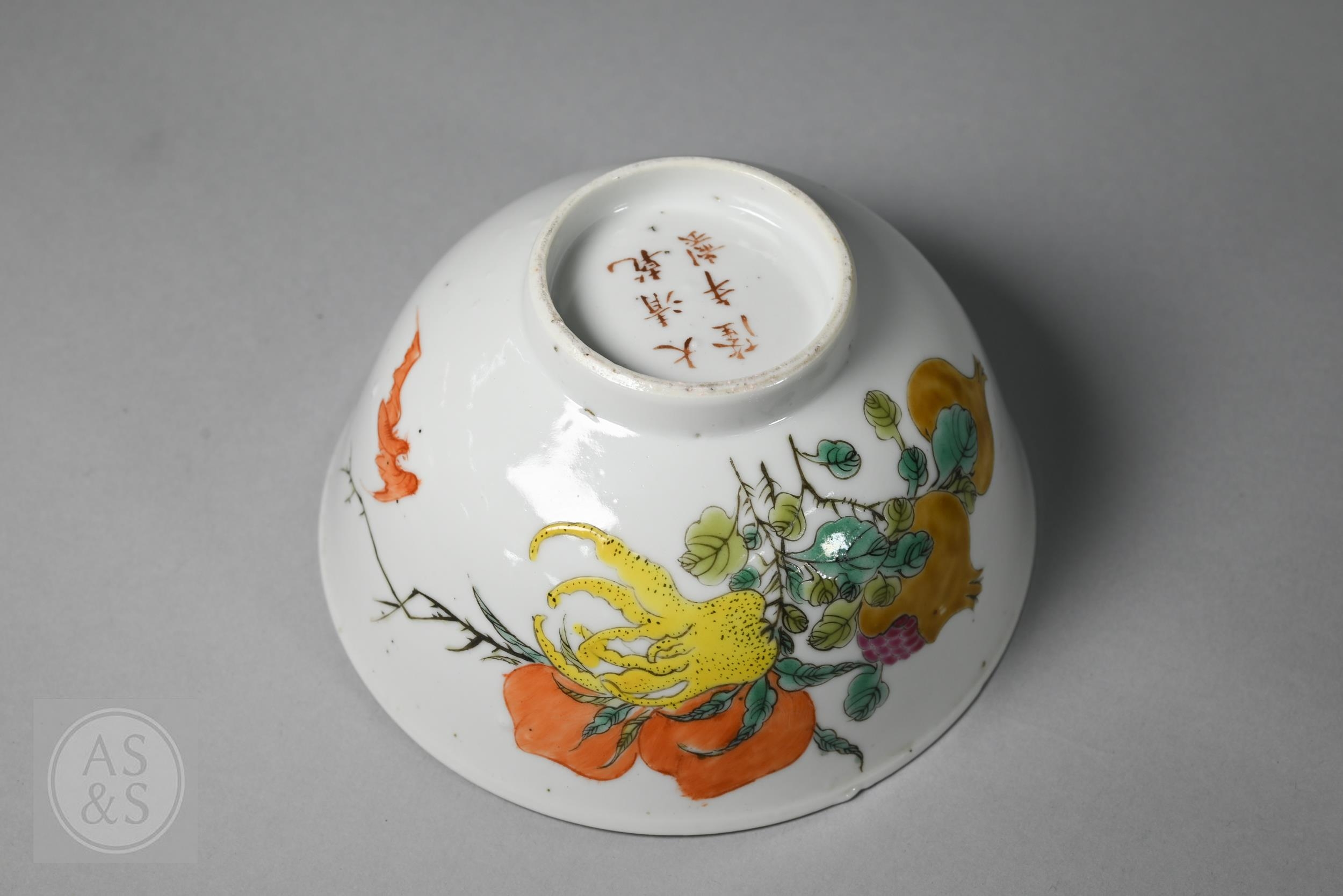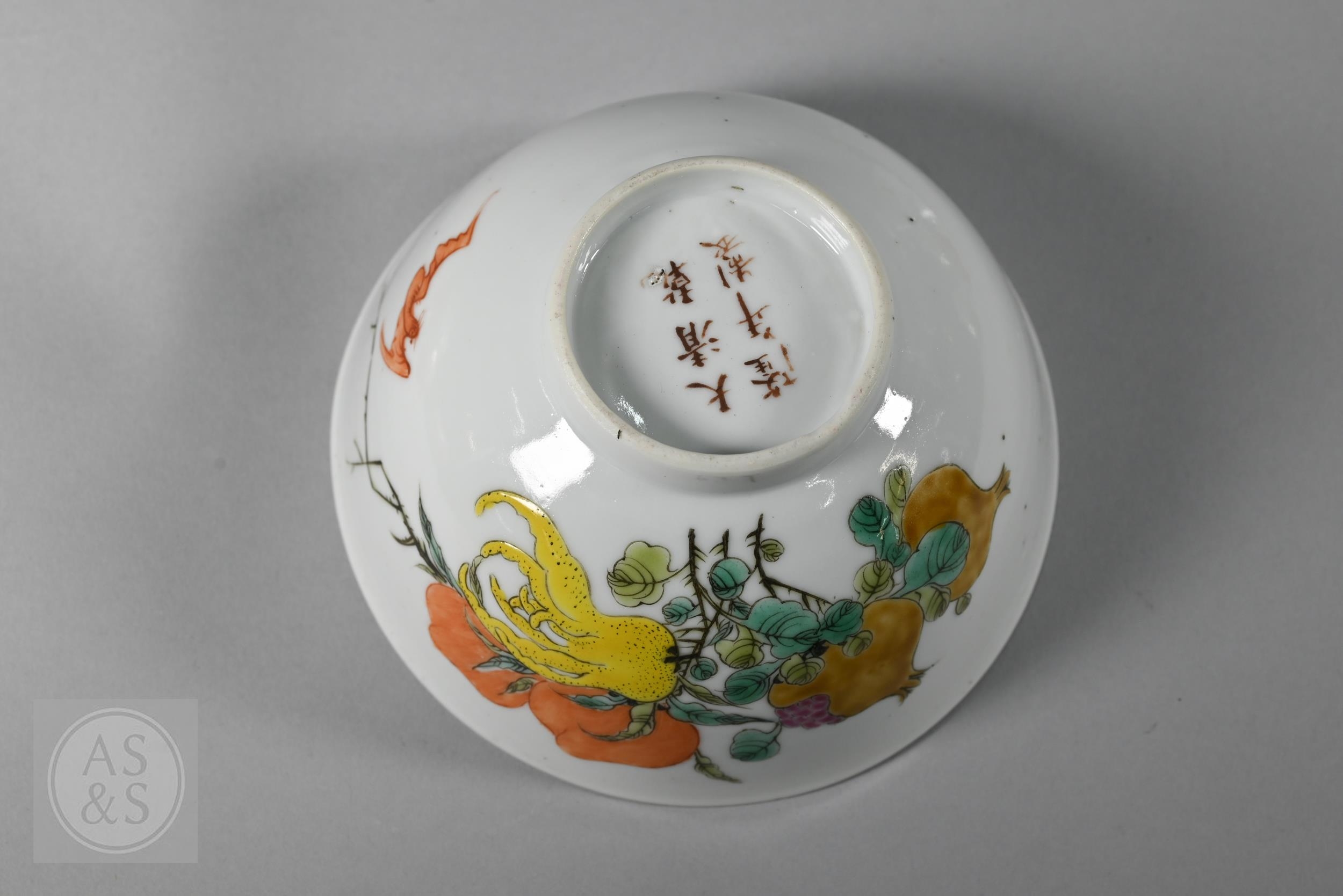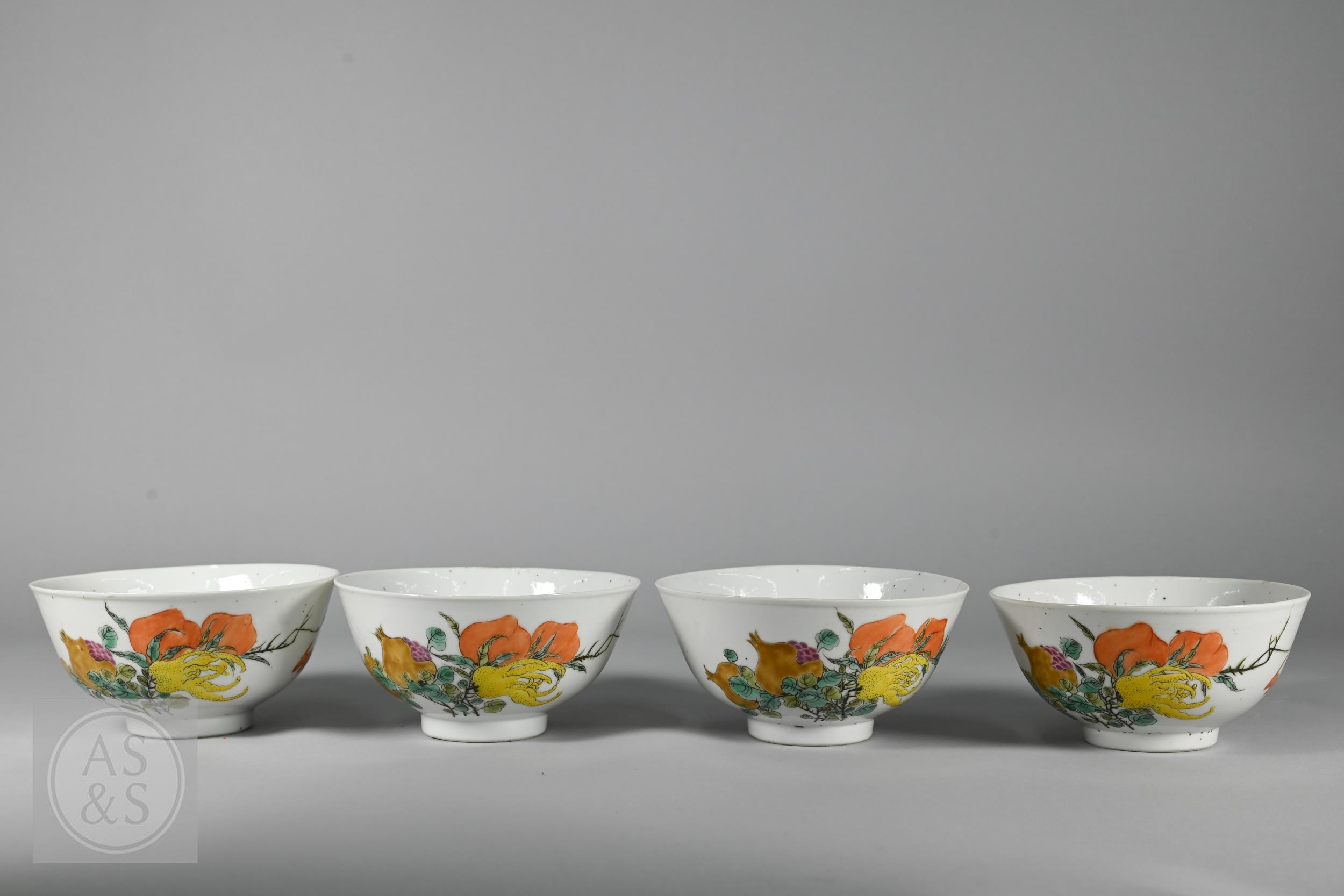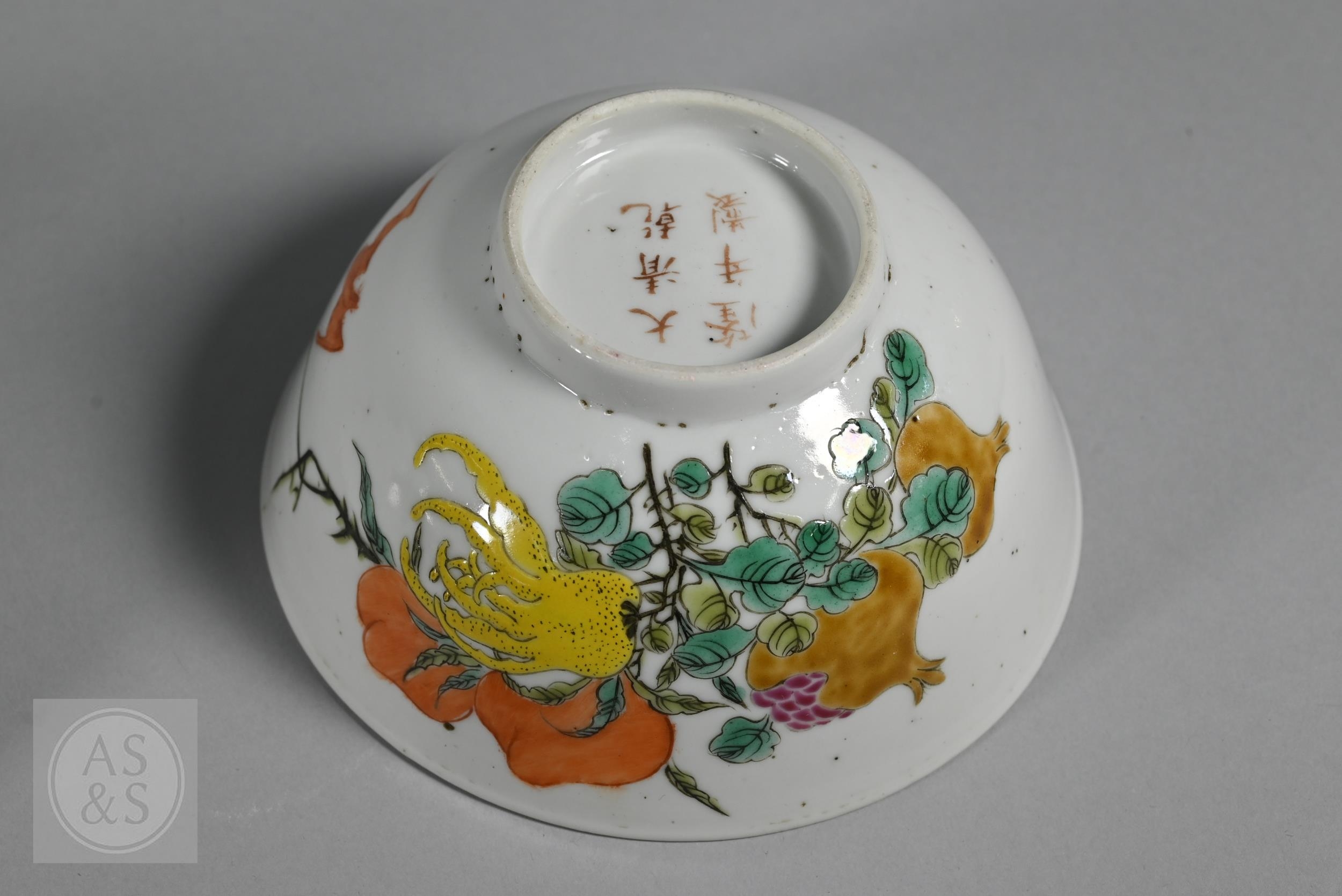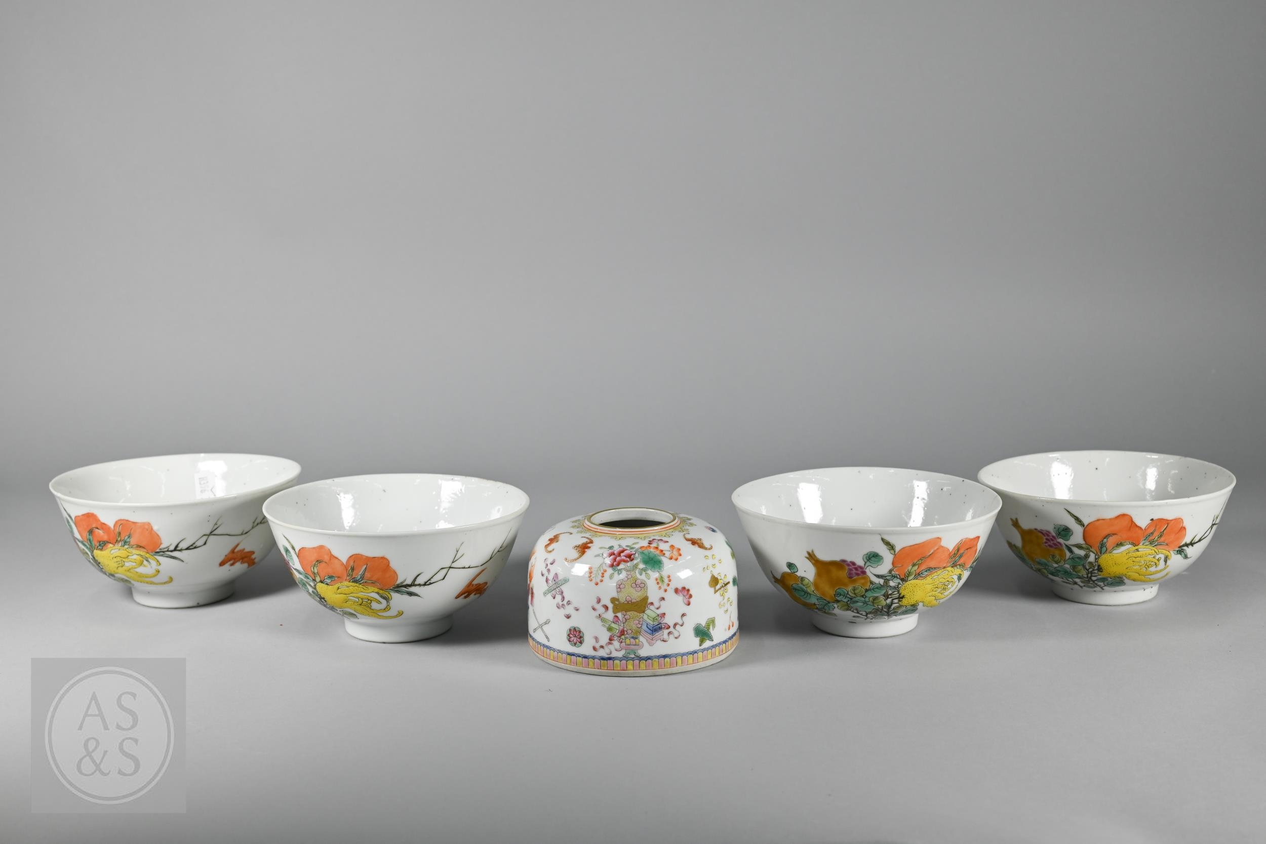 A Chinese famille rose 'beehive' brush washer, painted in polychrome enamels with five bats, Daoist emblems and scholar's desk objects, the base with six-character Daoguang mark but Republic period or later (post Qing) to/w four early 20th century Chinese famille rose 'sanduo' bowls, painted with 'The Three Abundances' featuring leafy fruiting branches of peach, pomegranate and finger citron in polychrome enamels, each base with six-character Qianlong mark but Republic period, 12.5 cm diameter x 6 cm high (5)