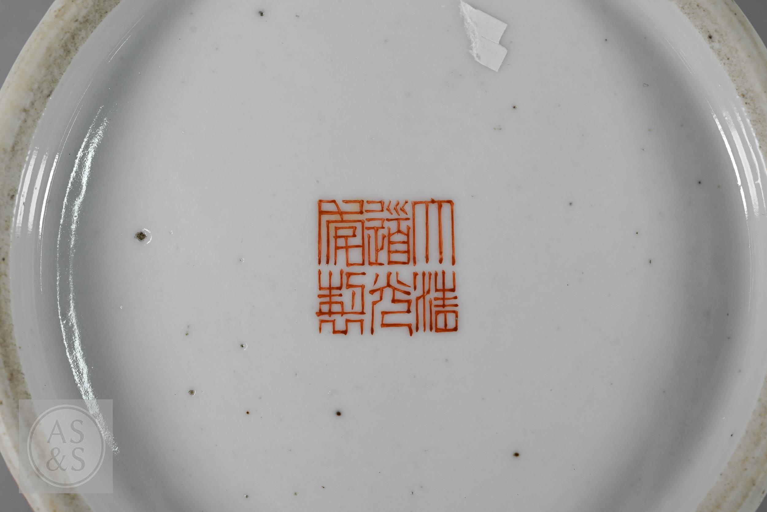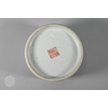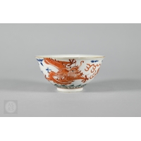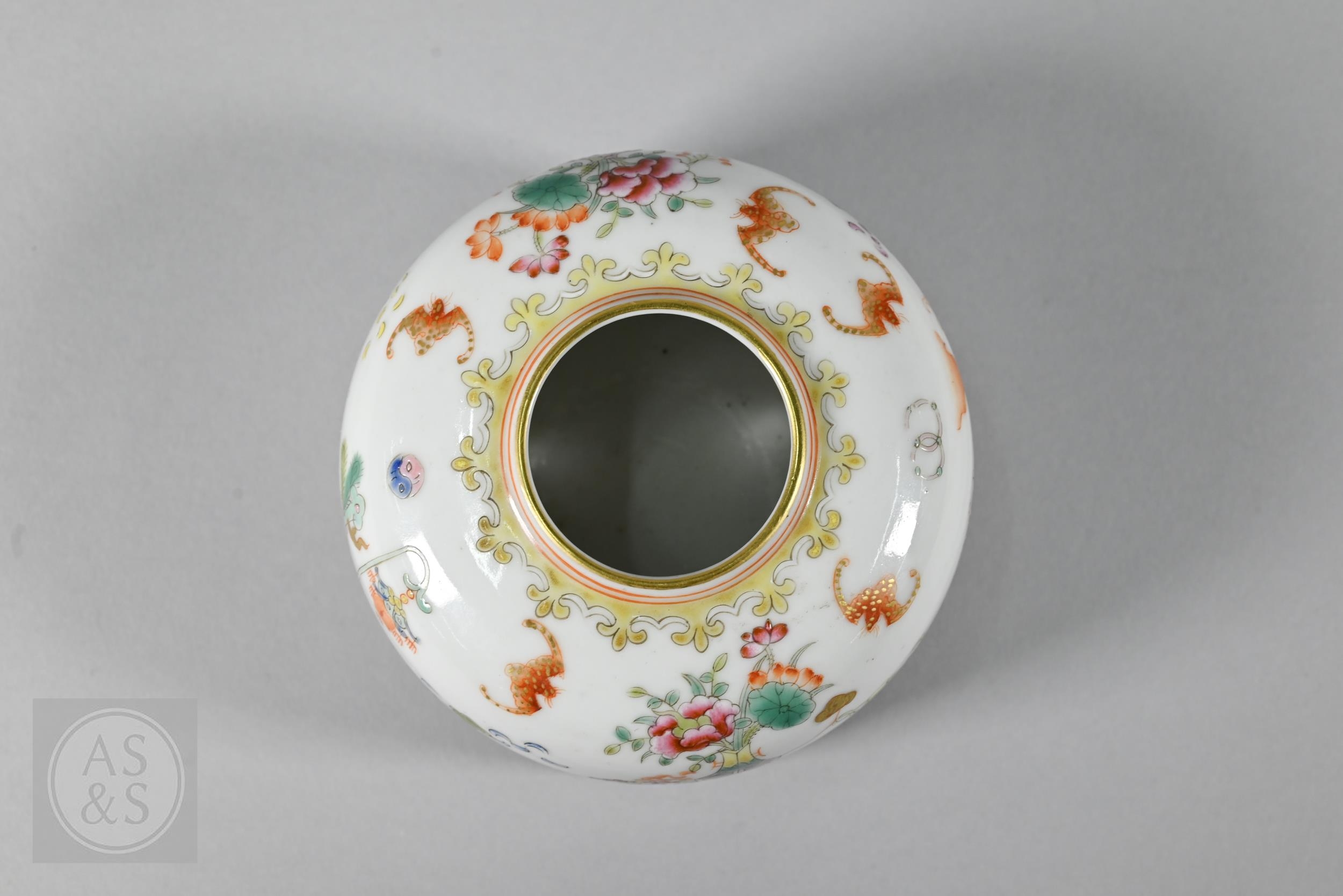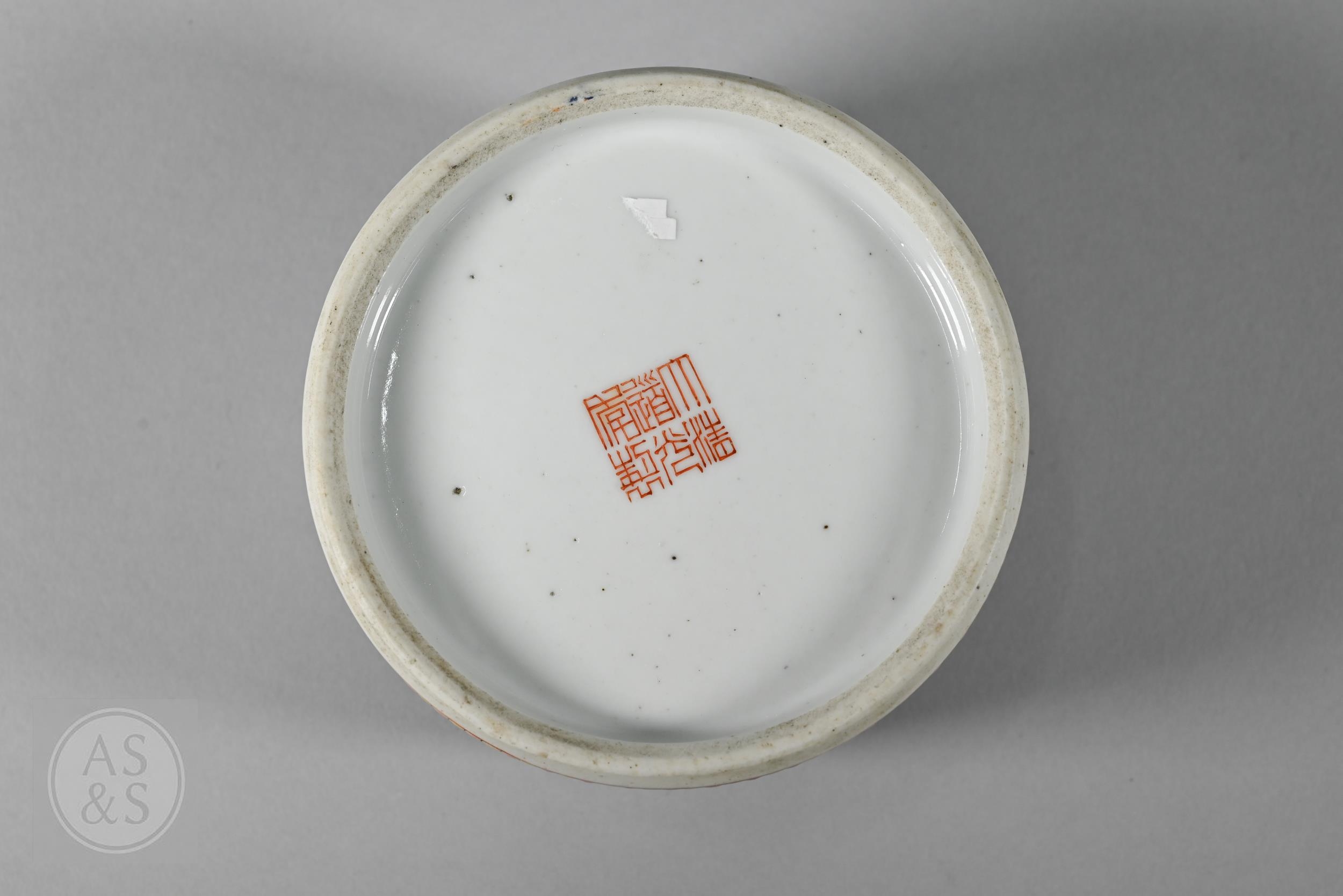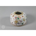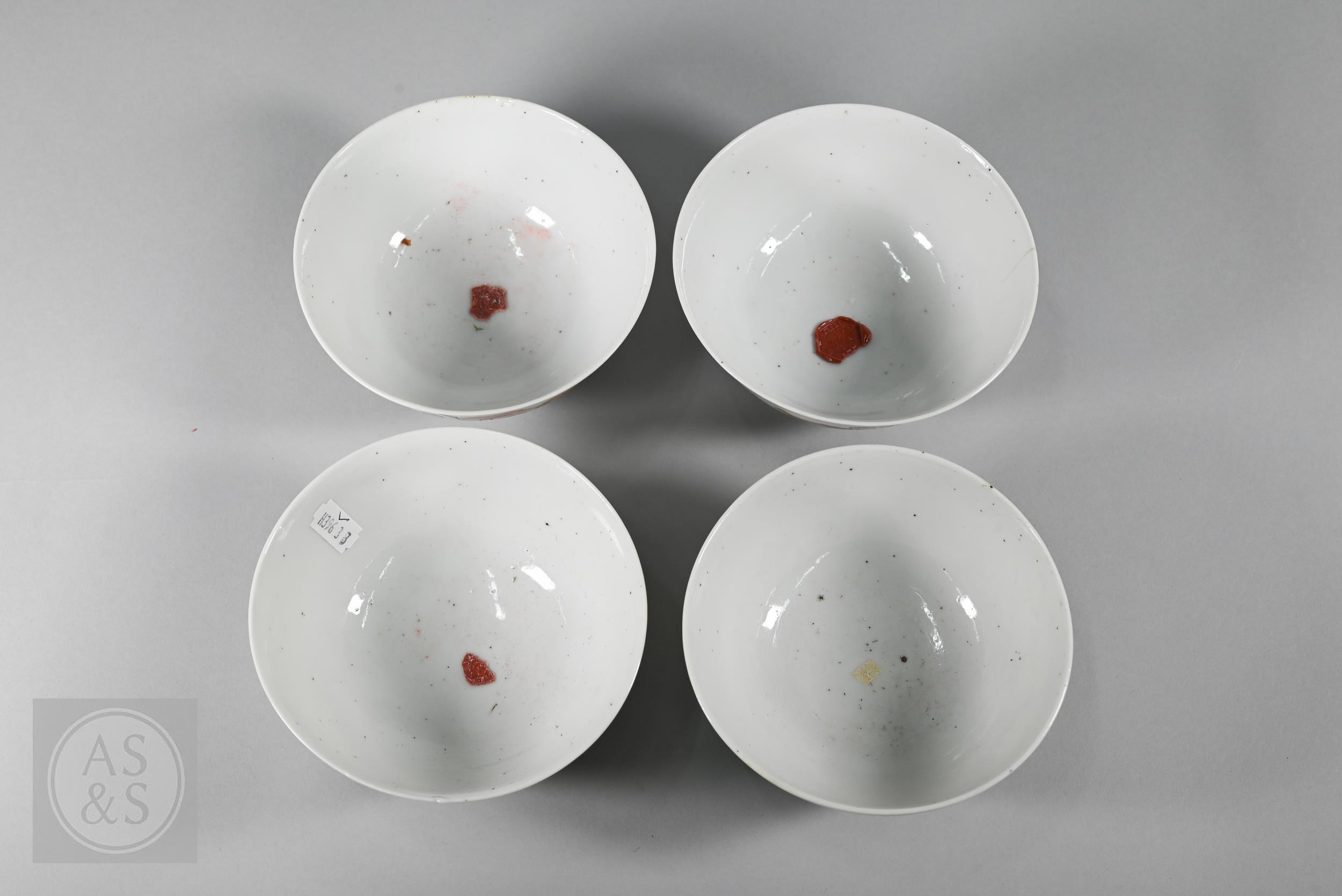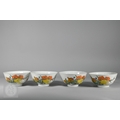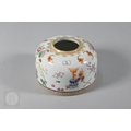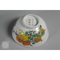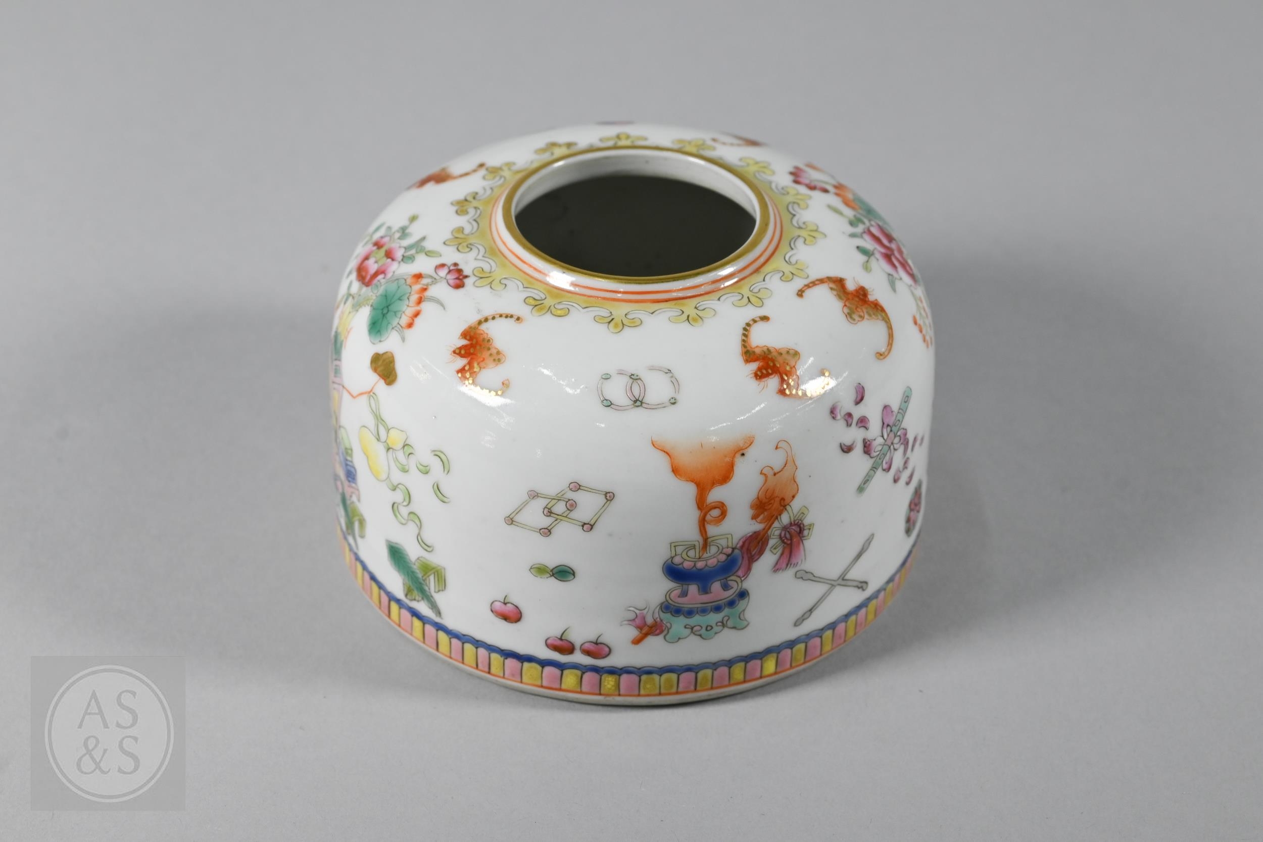 A Chinese famille rose 'beehive' brush washer, painted in polychrome enamels with five bats, Daoist emblems and scholar's desk objects, the base with six-character Daoguang mark but Republic period or later (post Qing) to/w four early 20th century Chinese famille rose 'sanduo' bowls, painted with 'The Three Abundances' featuring leafy fruiting branches of peach, pomegranate and finger citron in polychrome enamels, each base with six-character Qianlong mark but Republic period, 12.5 cm diameter x 6 cm high (5)