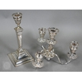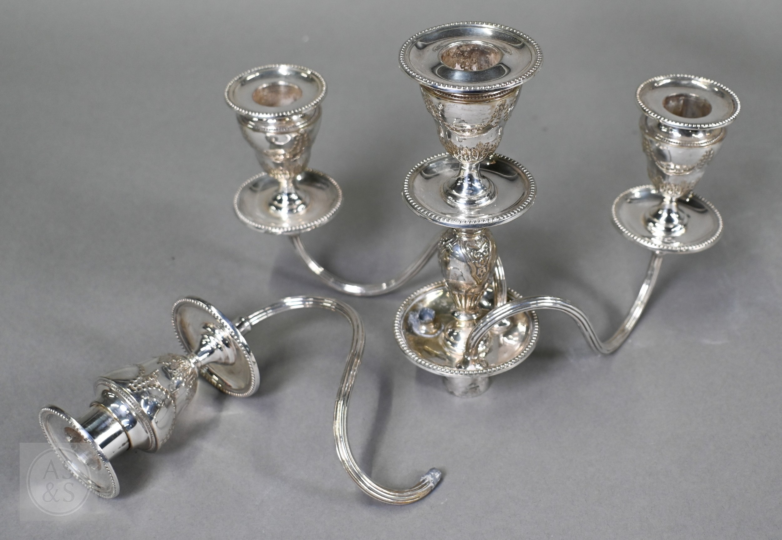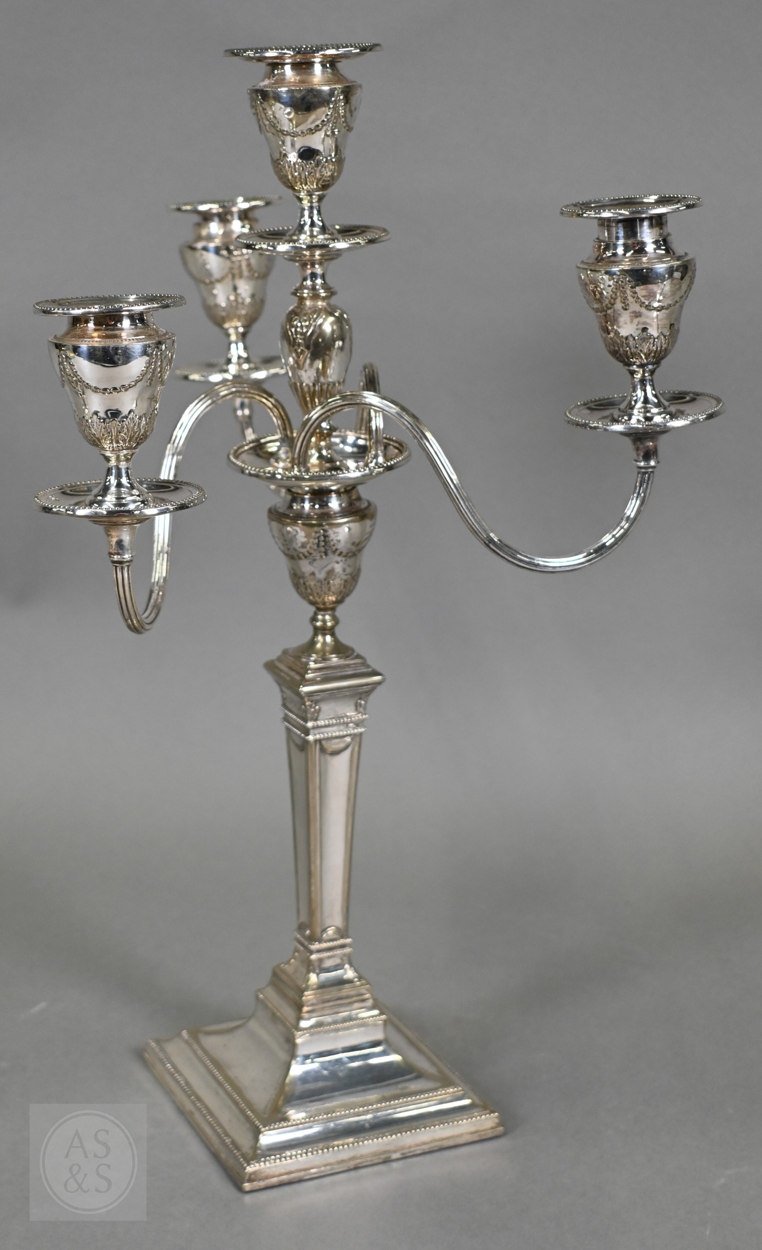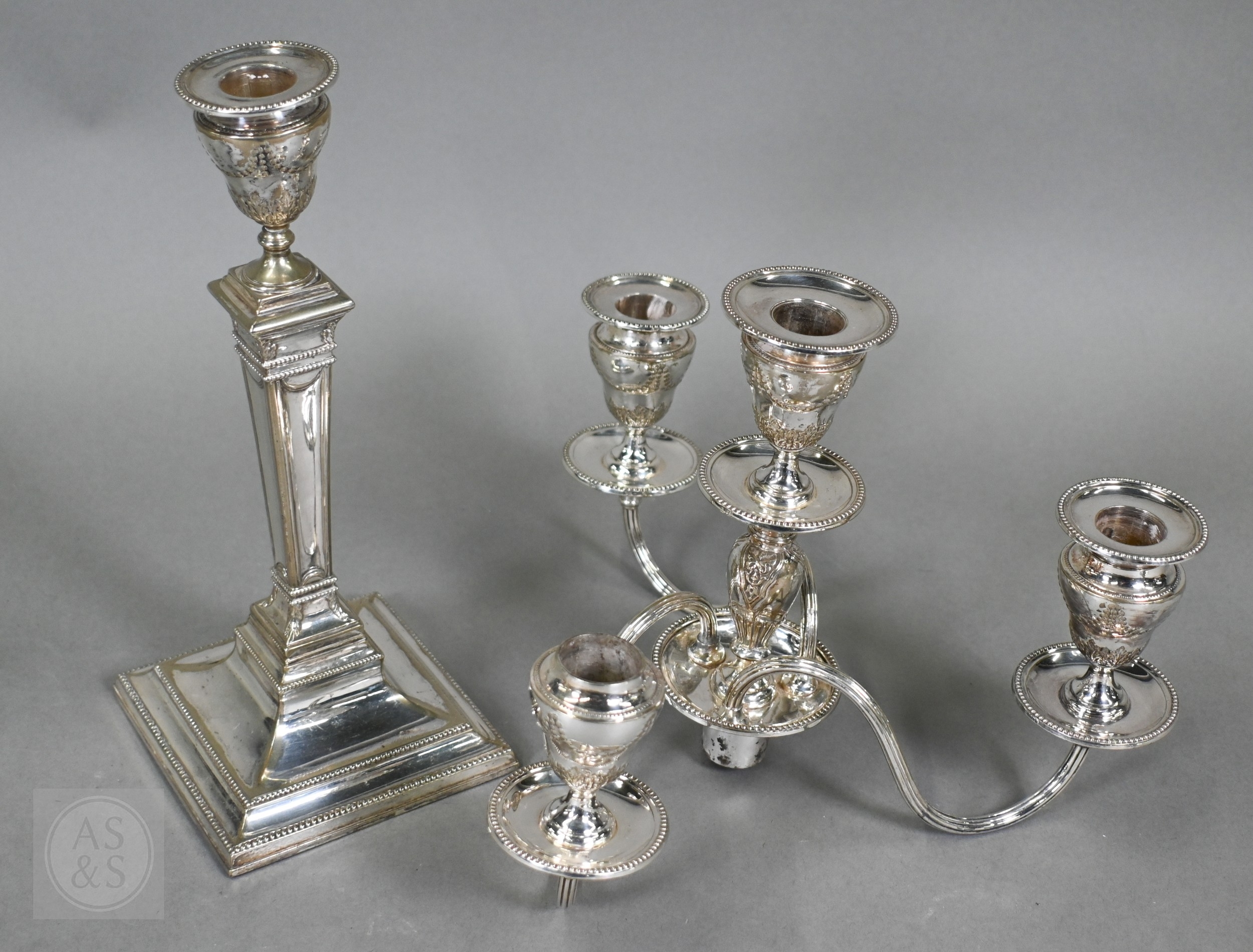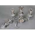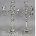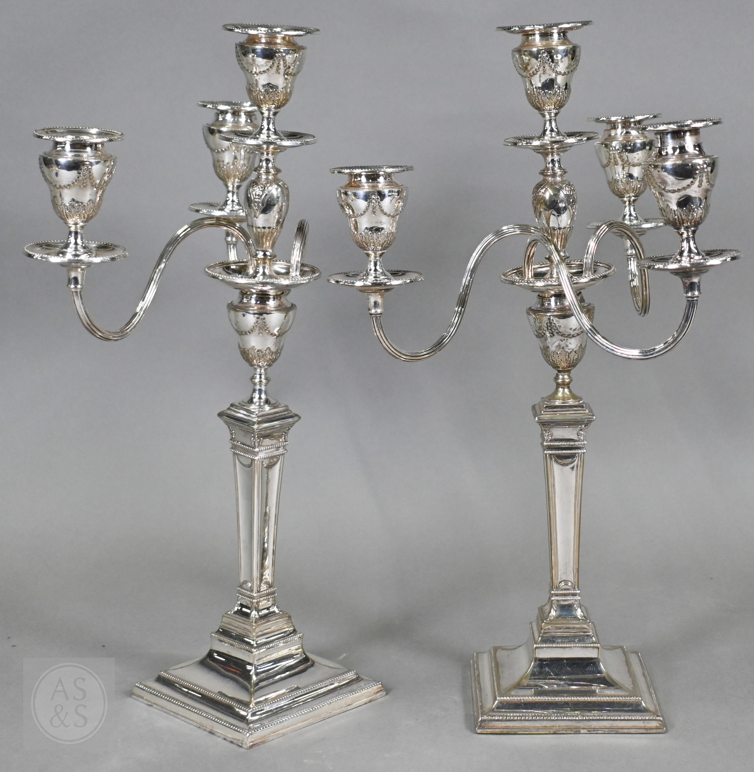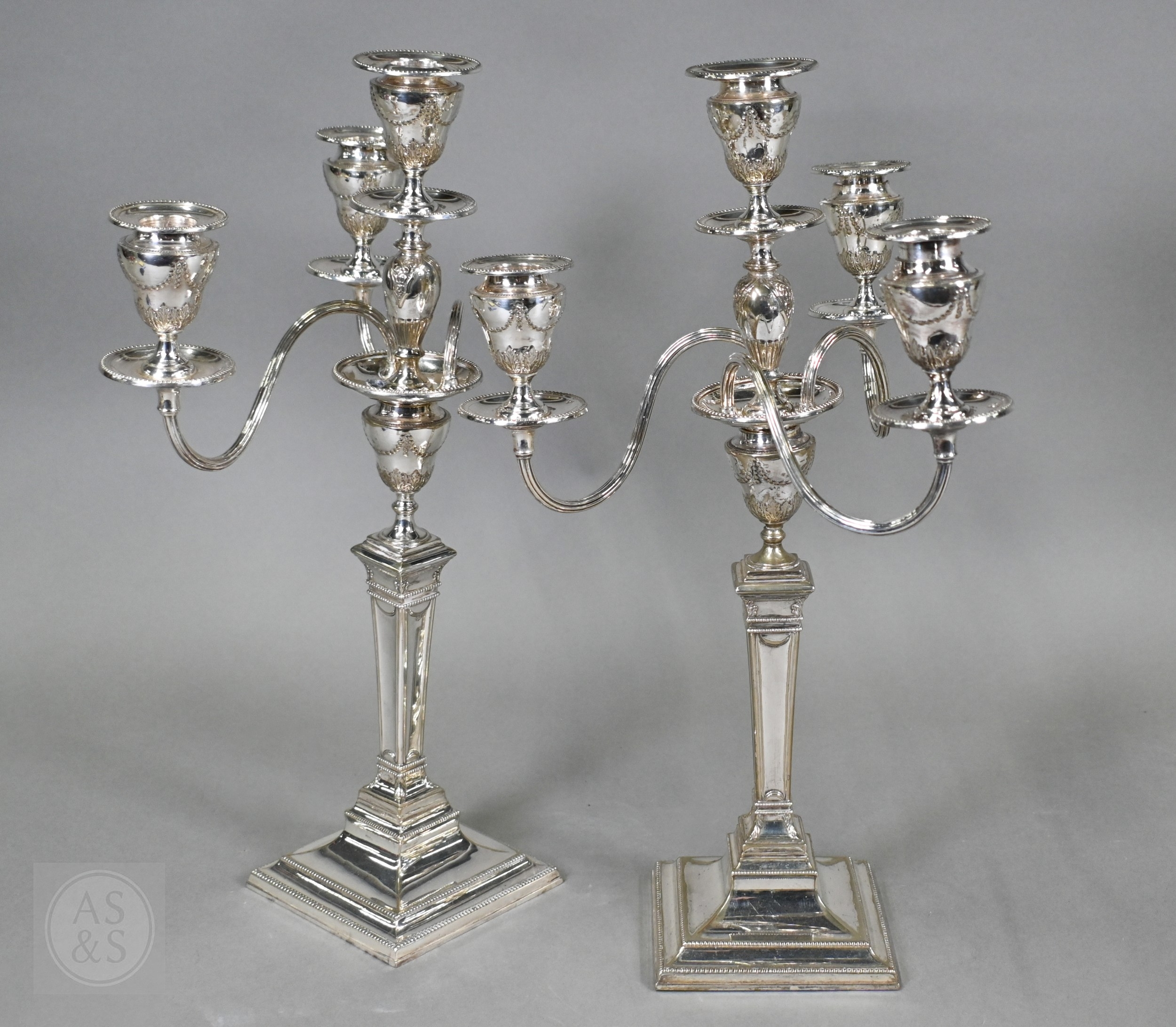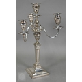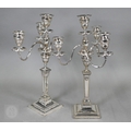 A pair of late Victorian/Edwardian Adam Revival three-branch candelabra, each with four urn-shaped sconces, on square baluster pillars, 43cm high