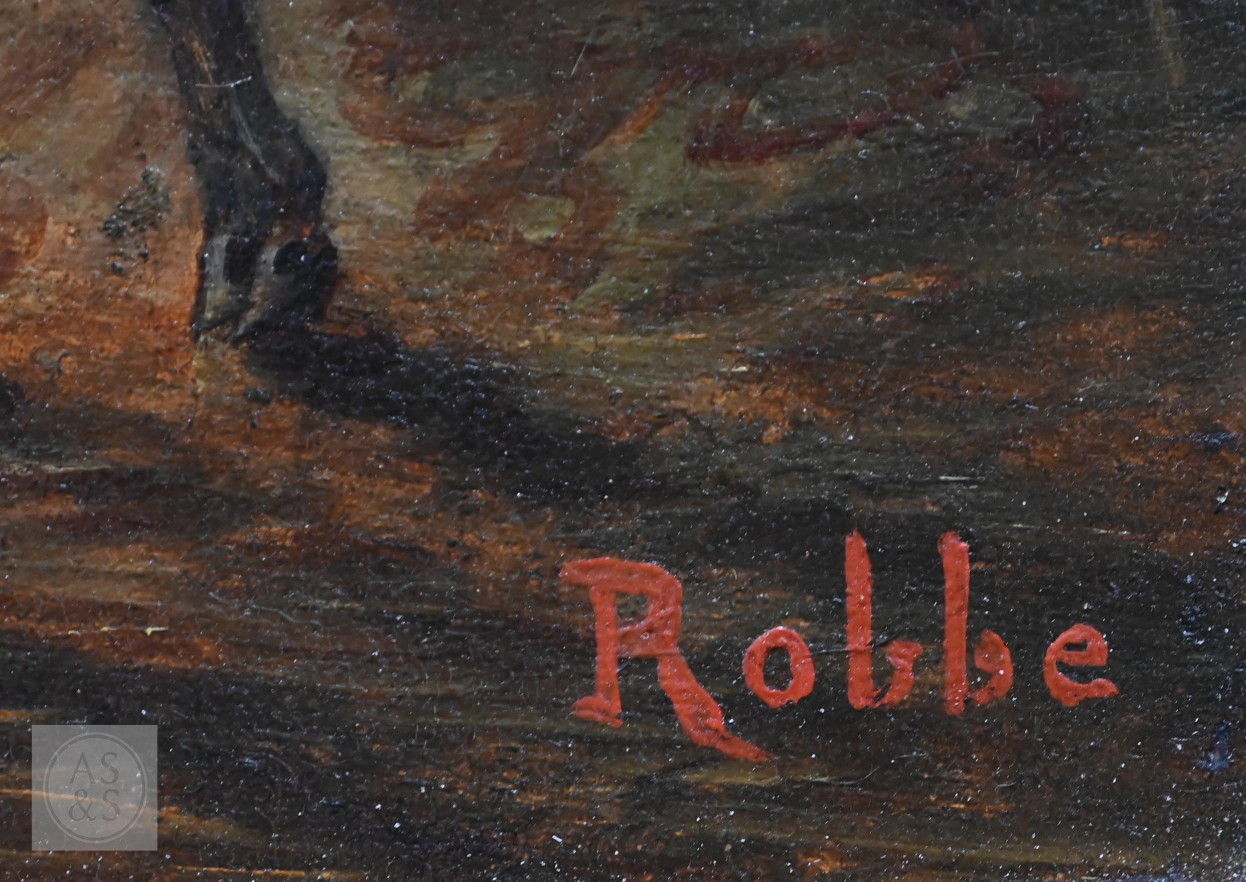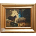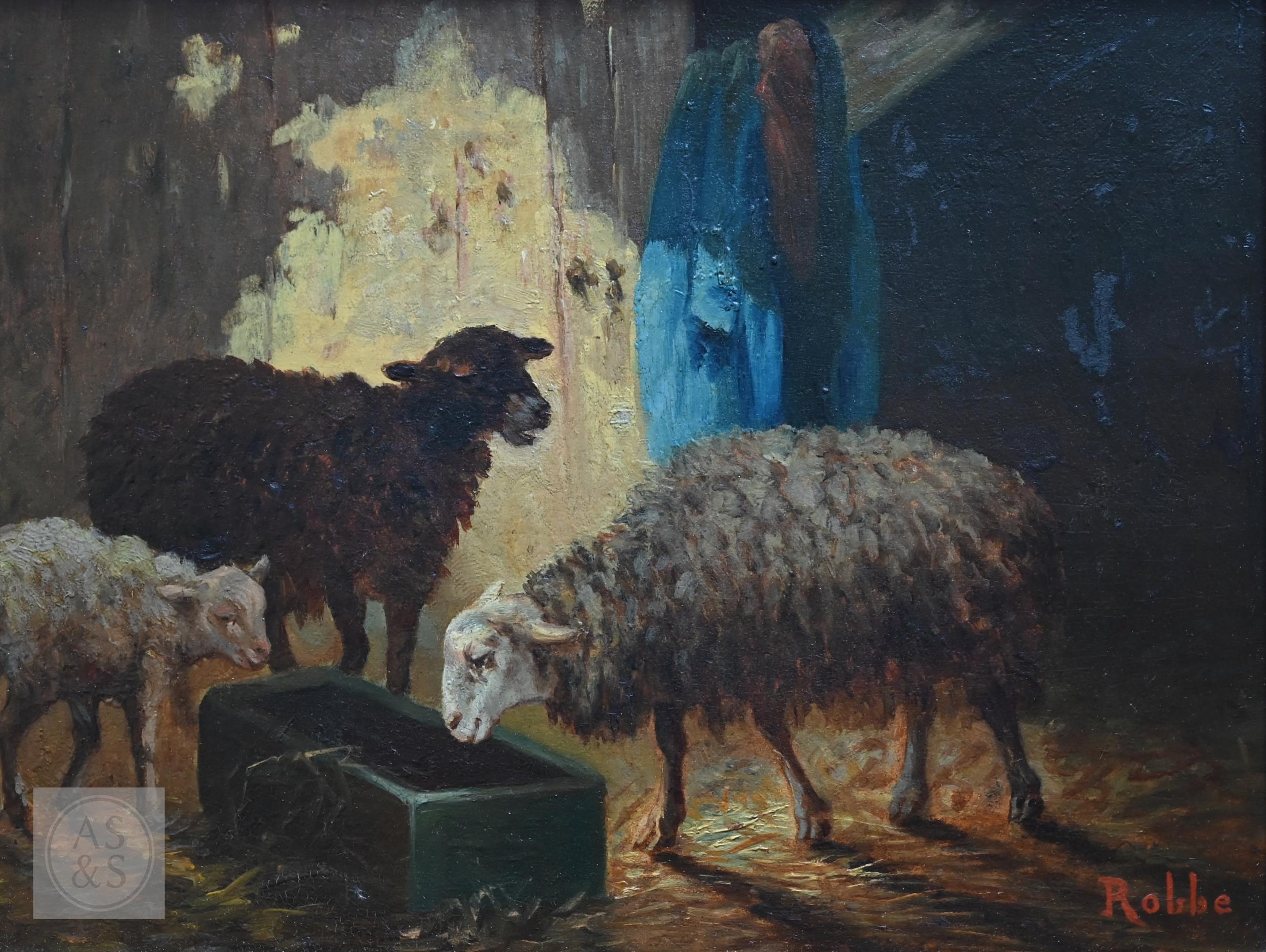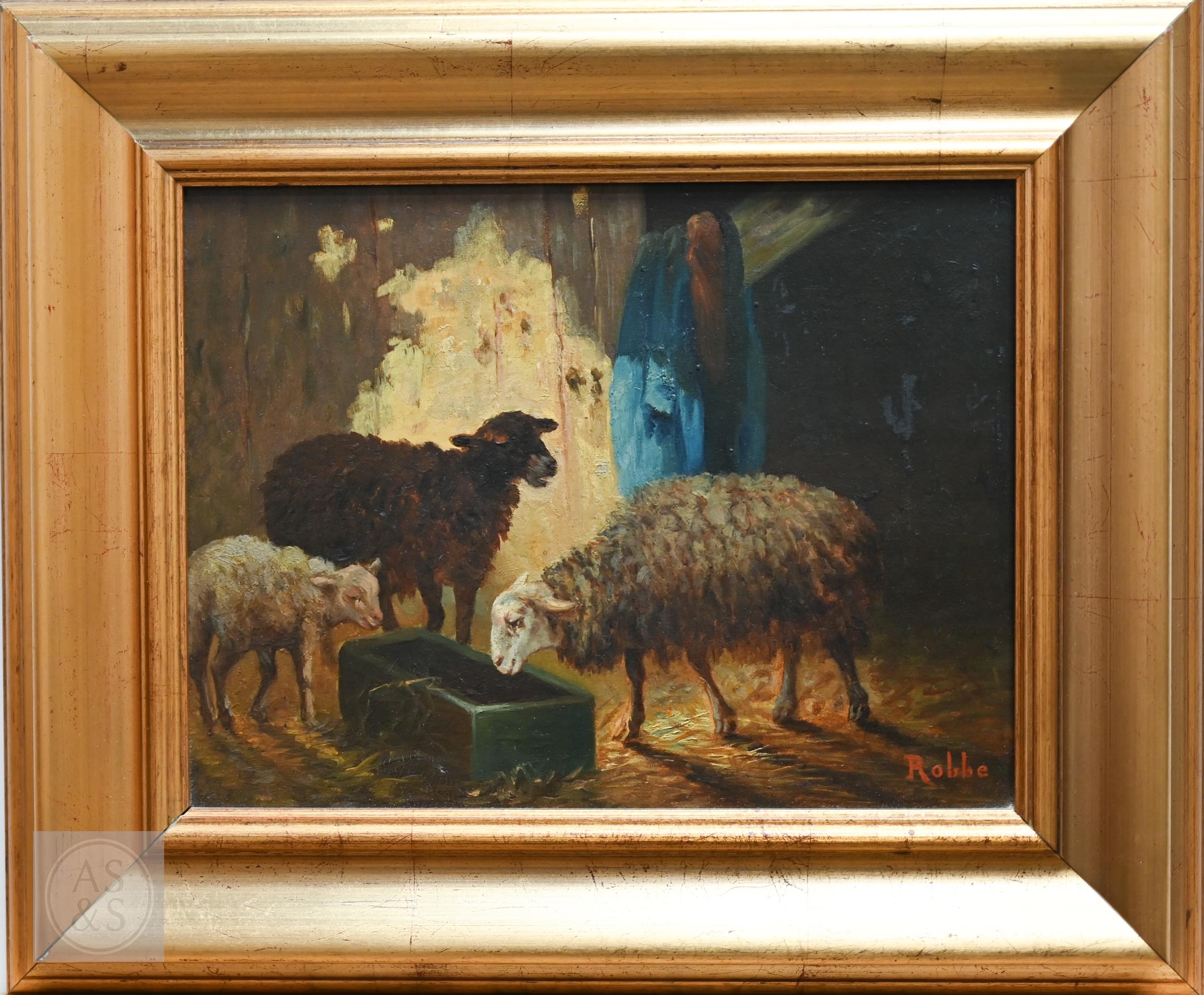 Louis Robbe (1806-87) - Sheep in a barn interior, oil on board, signed lower right, 23 x 29 cm, 37 x 44 cm (including frame)