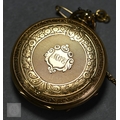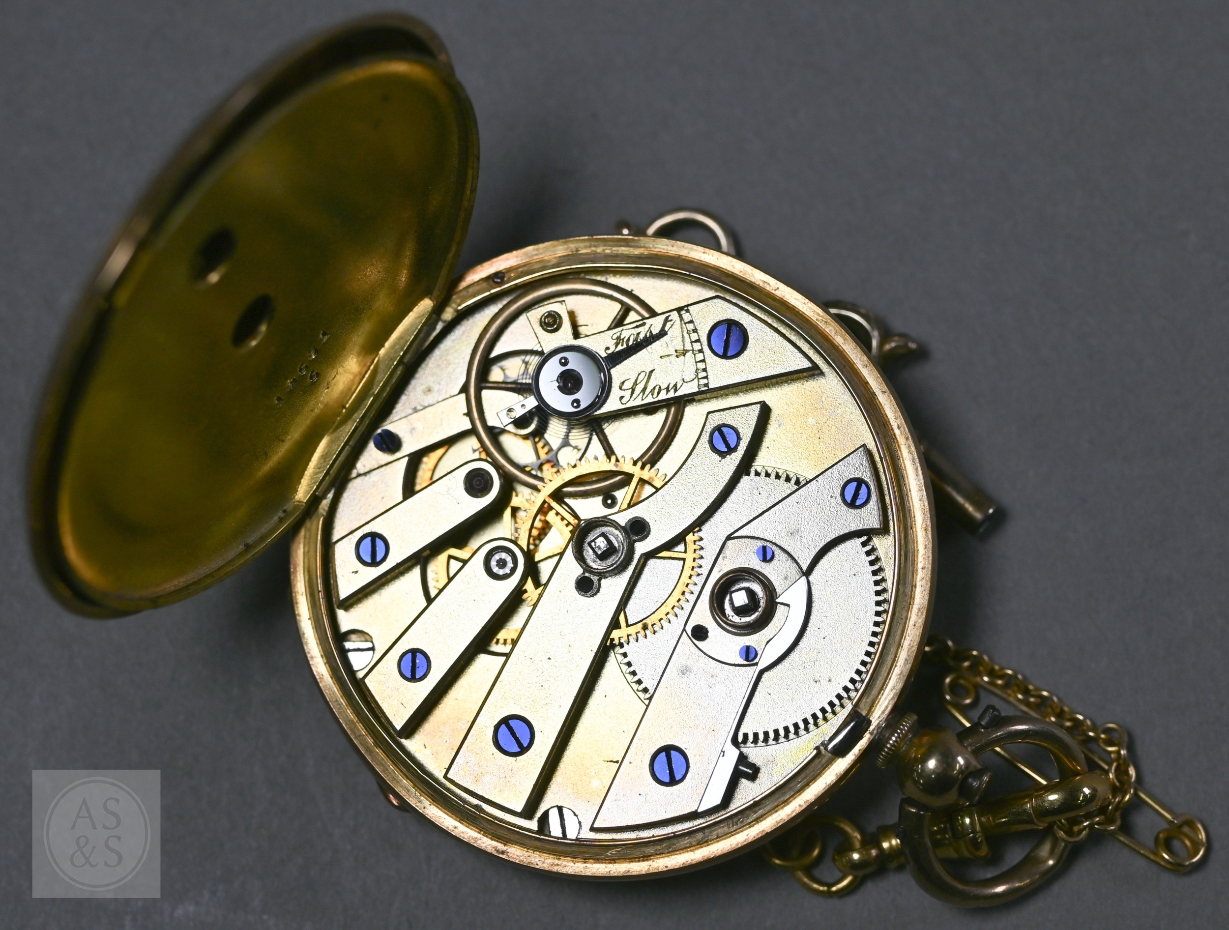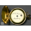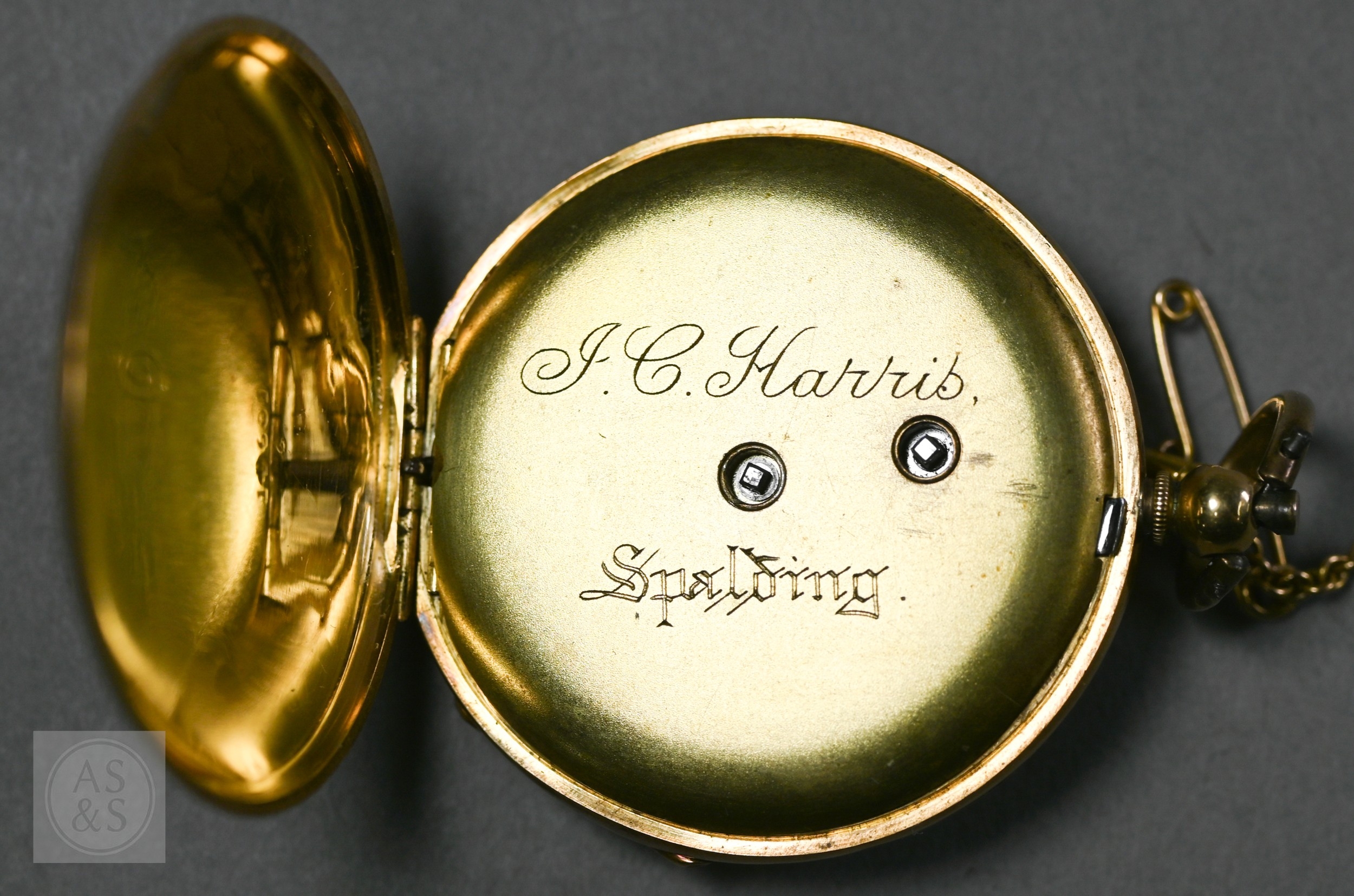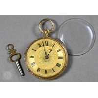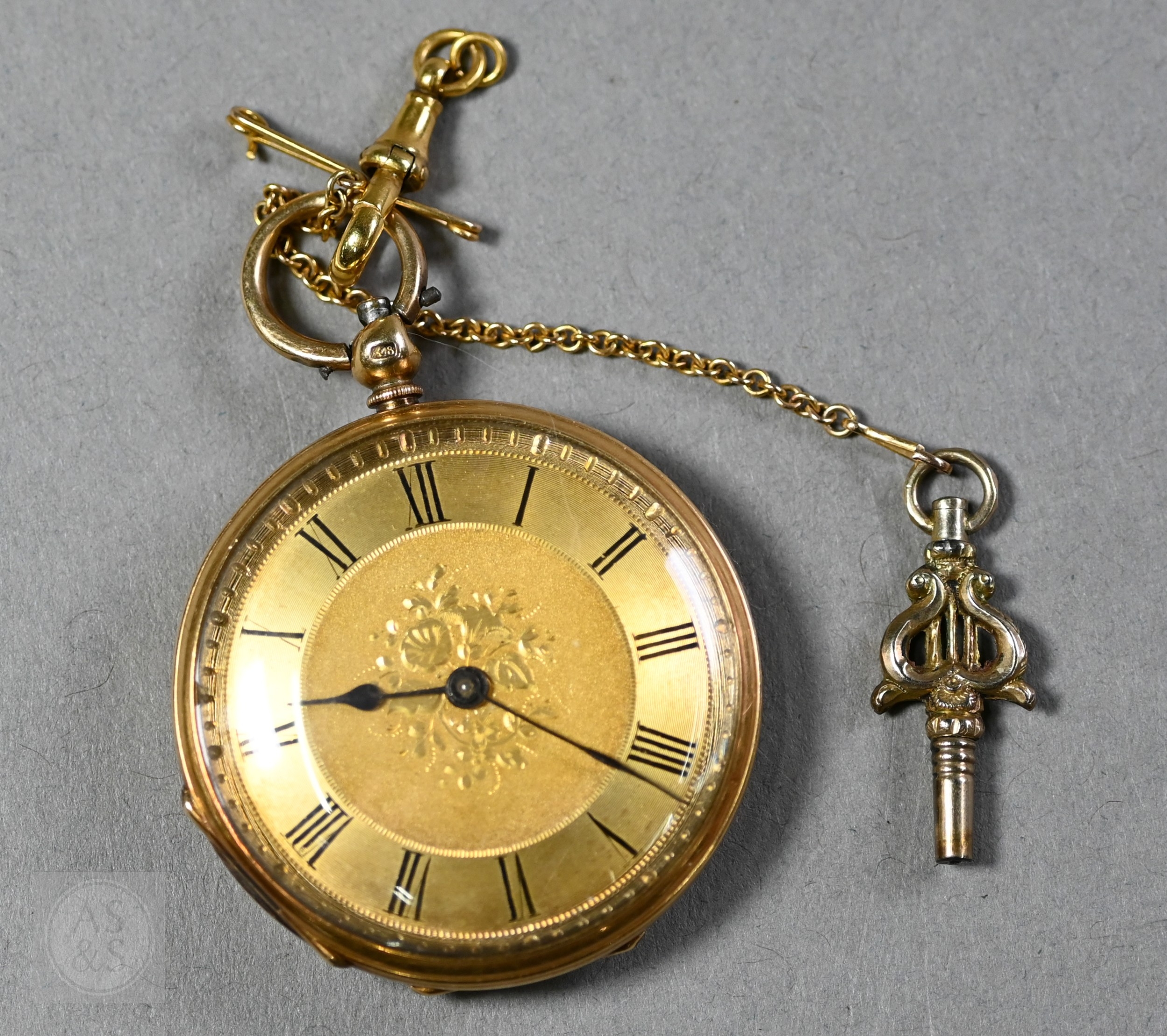 Harris, Spalding, an 18ct gold ladies fob watch, the key wind movement with gilded Roman numeral dial, the verso with engine turned and chased decoration, with 9ct dog clip, short chain and key, the watch 42.6g all-in