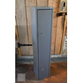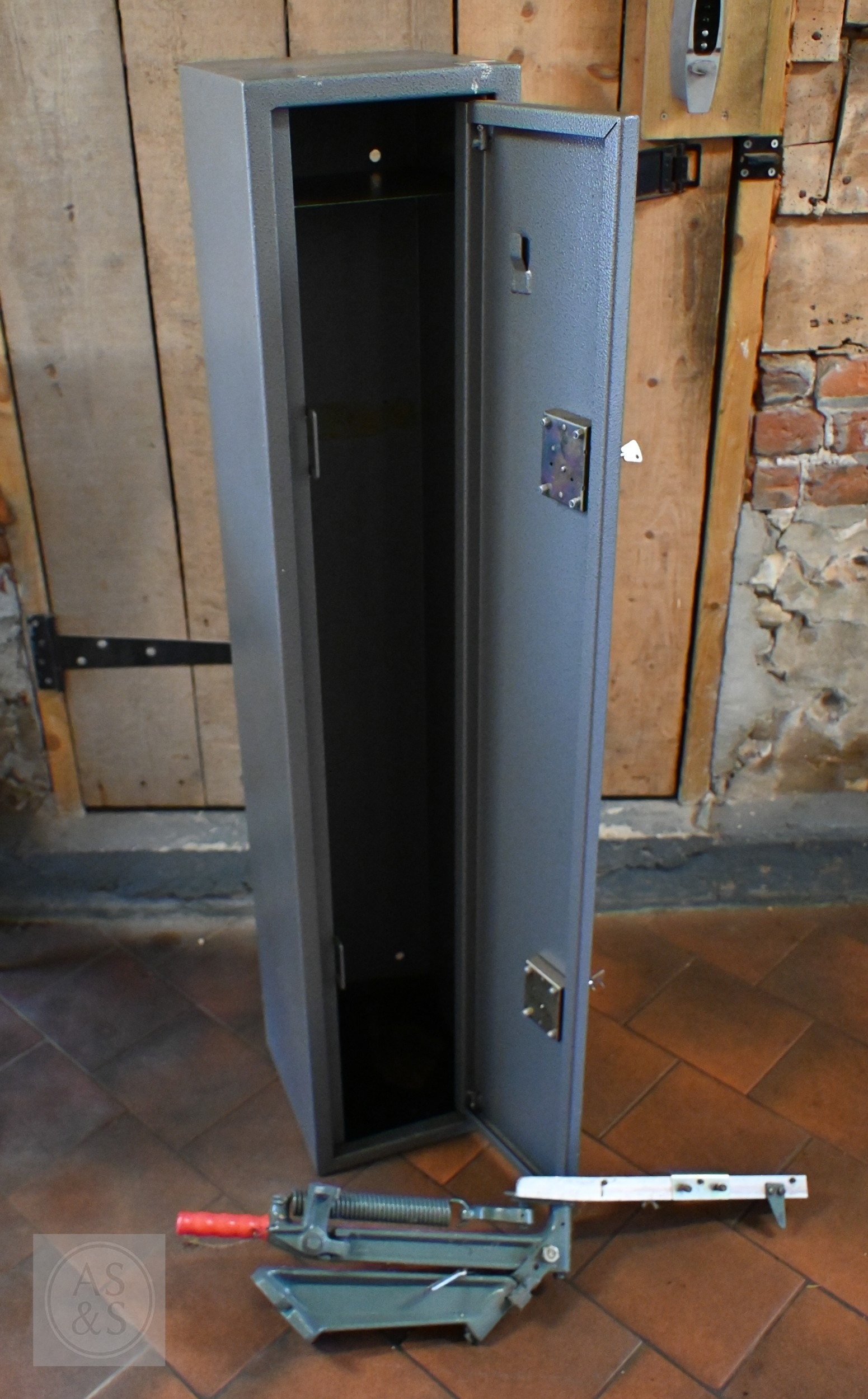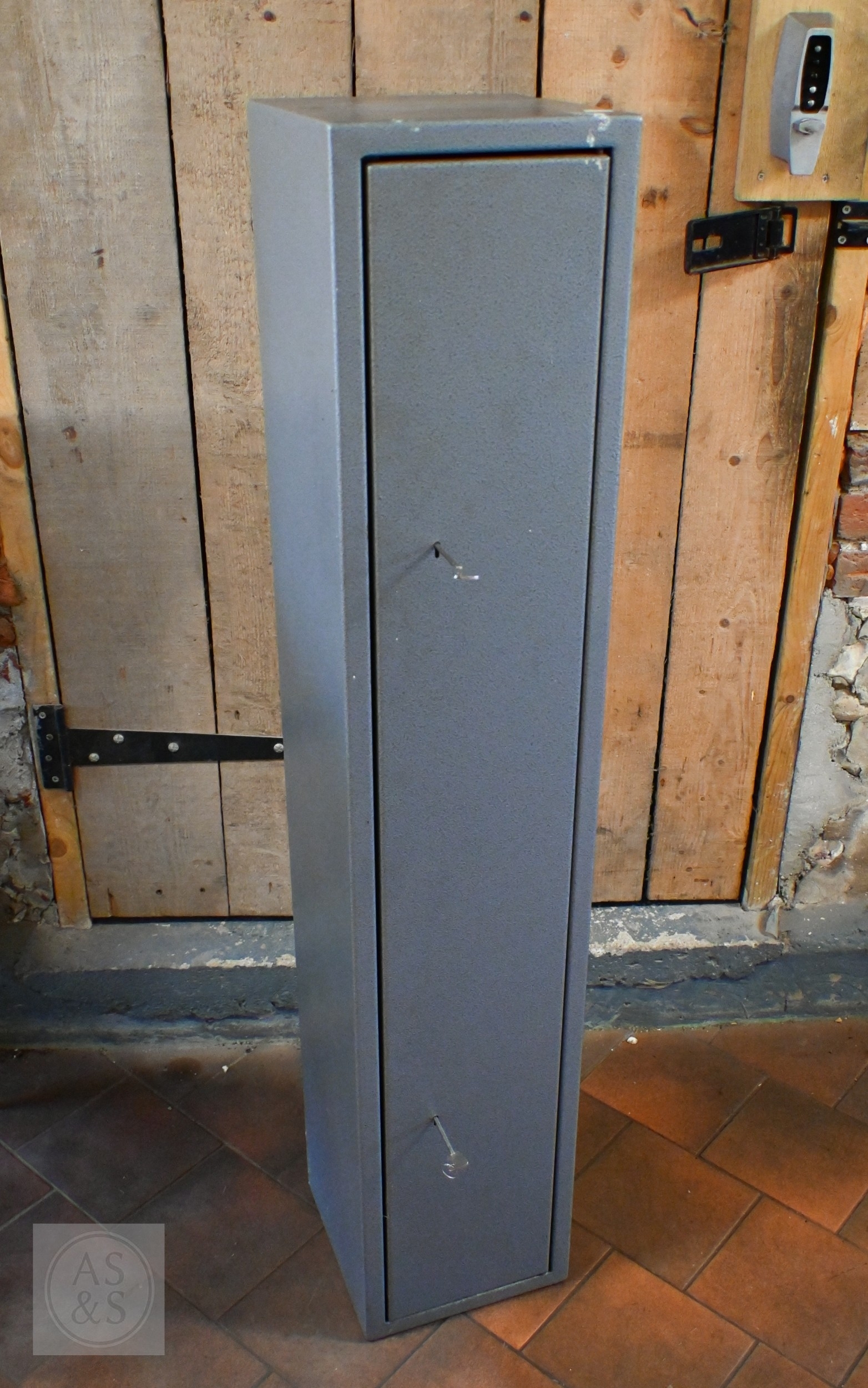 A gun cabinet c/w key, 26 cm x 26 cm x 130 cm h to/with a clay trap (2)