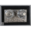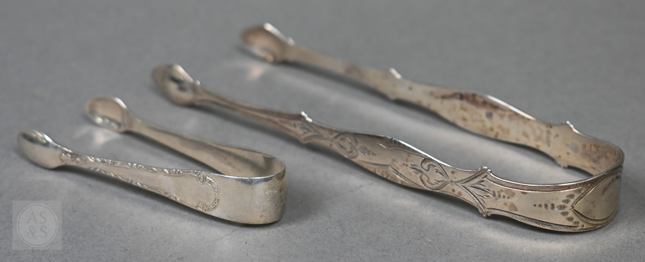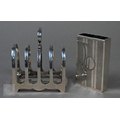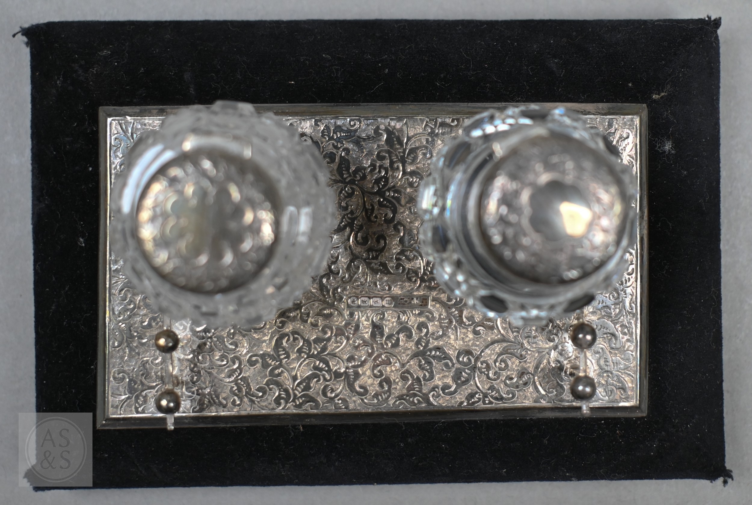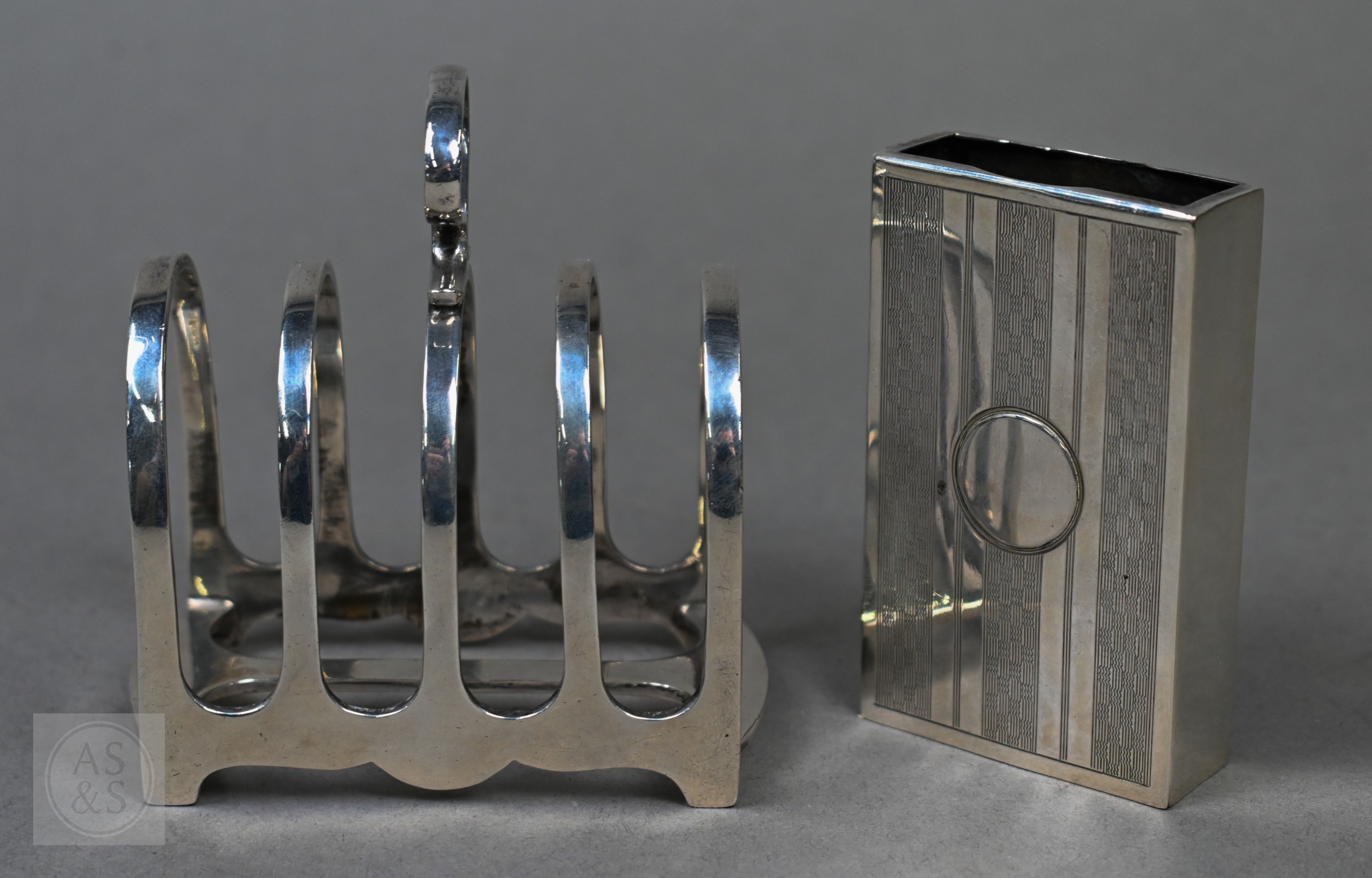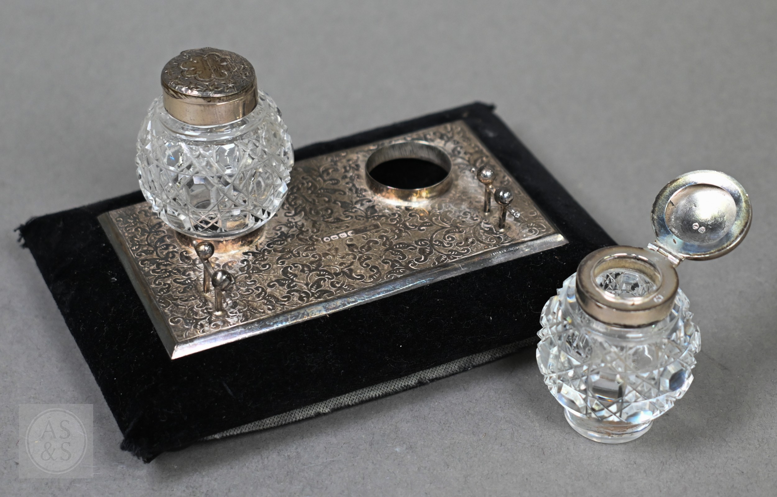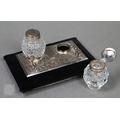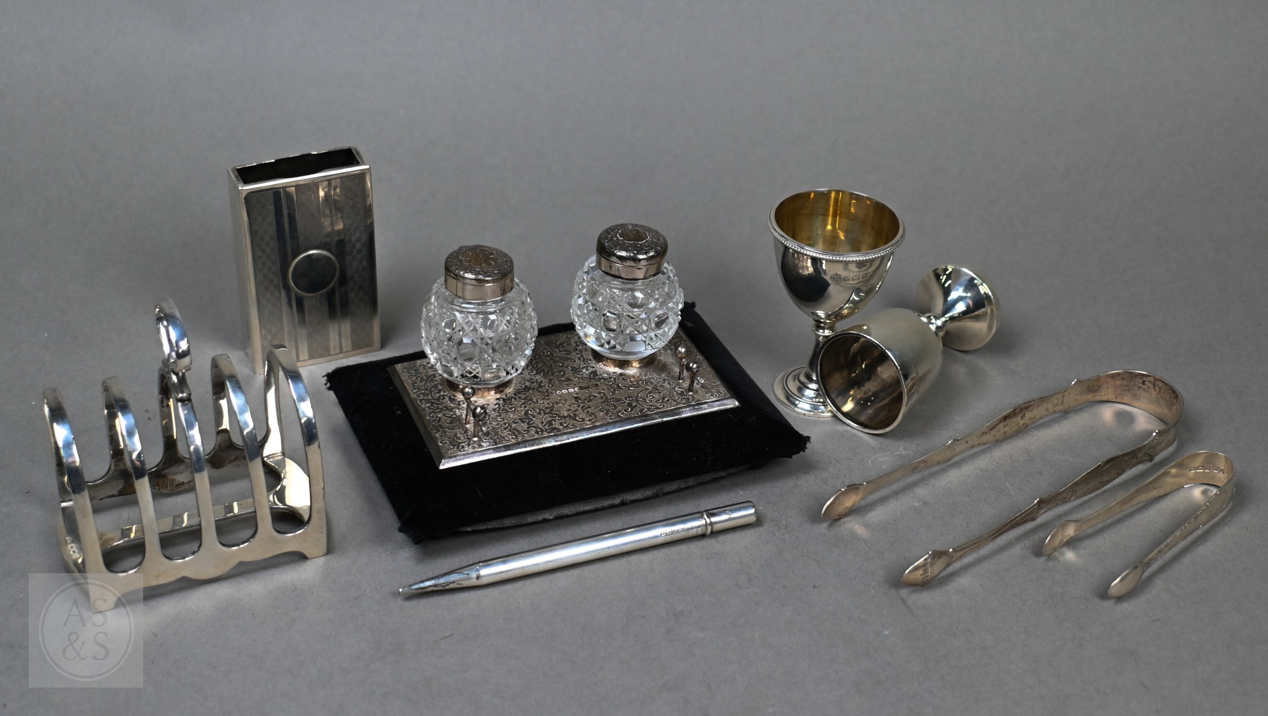 A small Victorian silver-mounted inkstand with engraved decoration and two cut glass bottles, Birmingham 1886, 14cm wide, (velvet-covered base refurbished), to/w a heavy quality toast rack, and egg cup, small trophy cup, matchbox cover and two pairs of sugar tongs, 9.4ozt of weighable silver