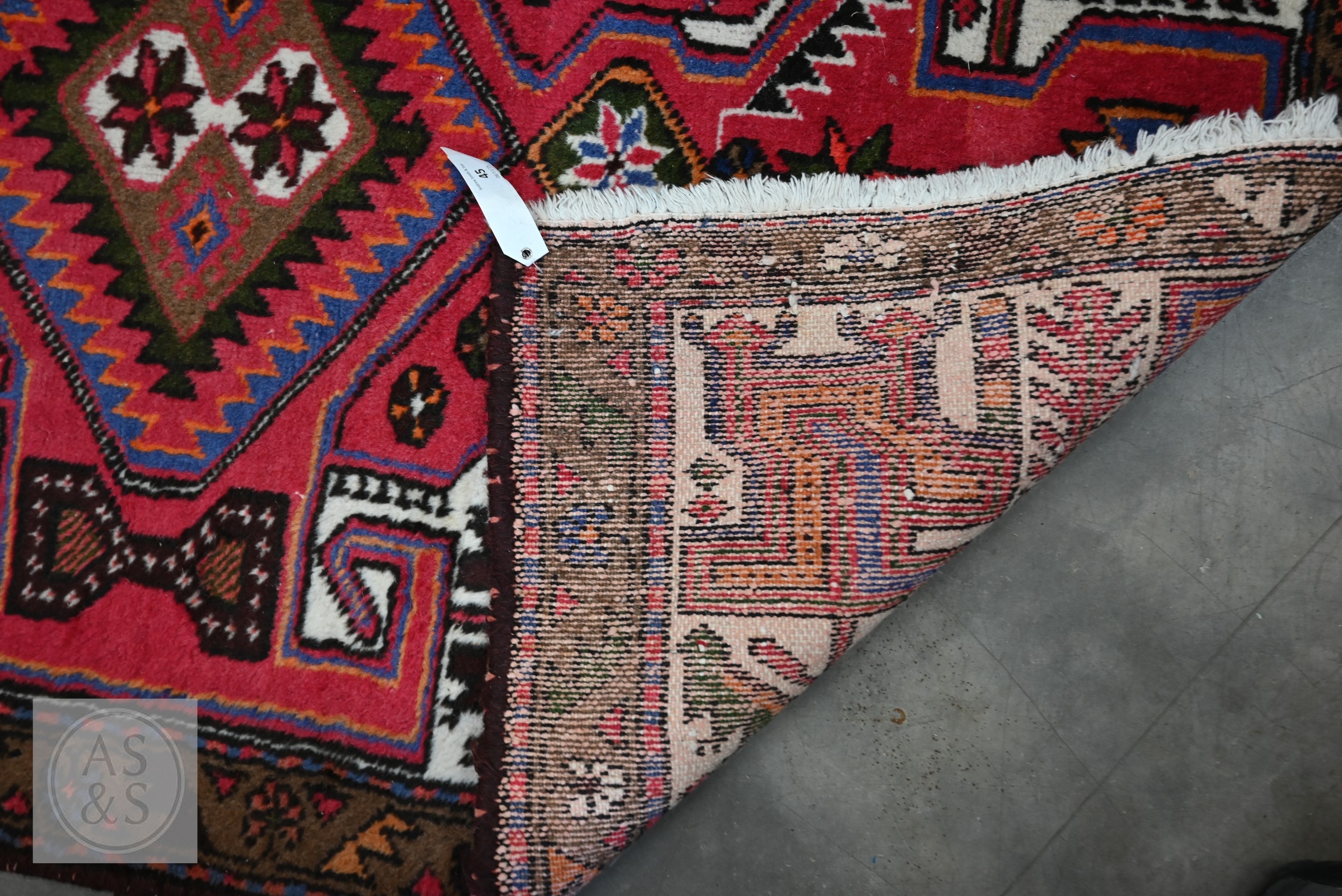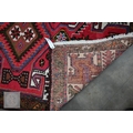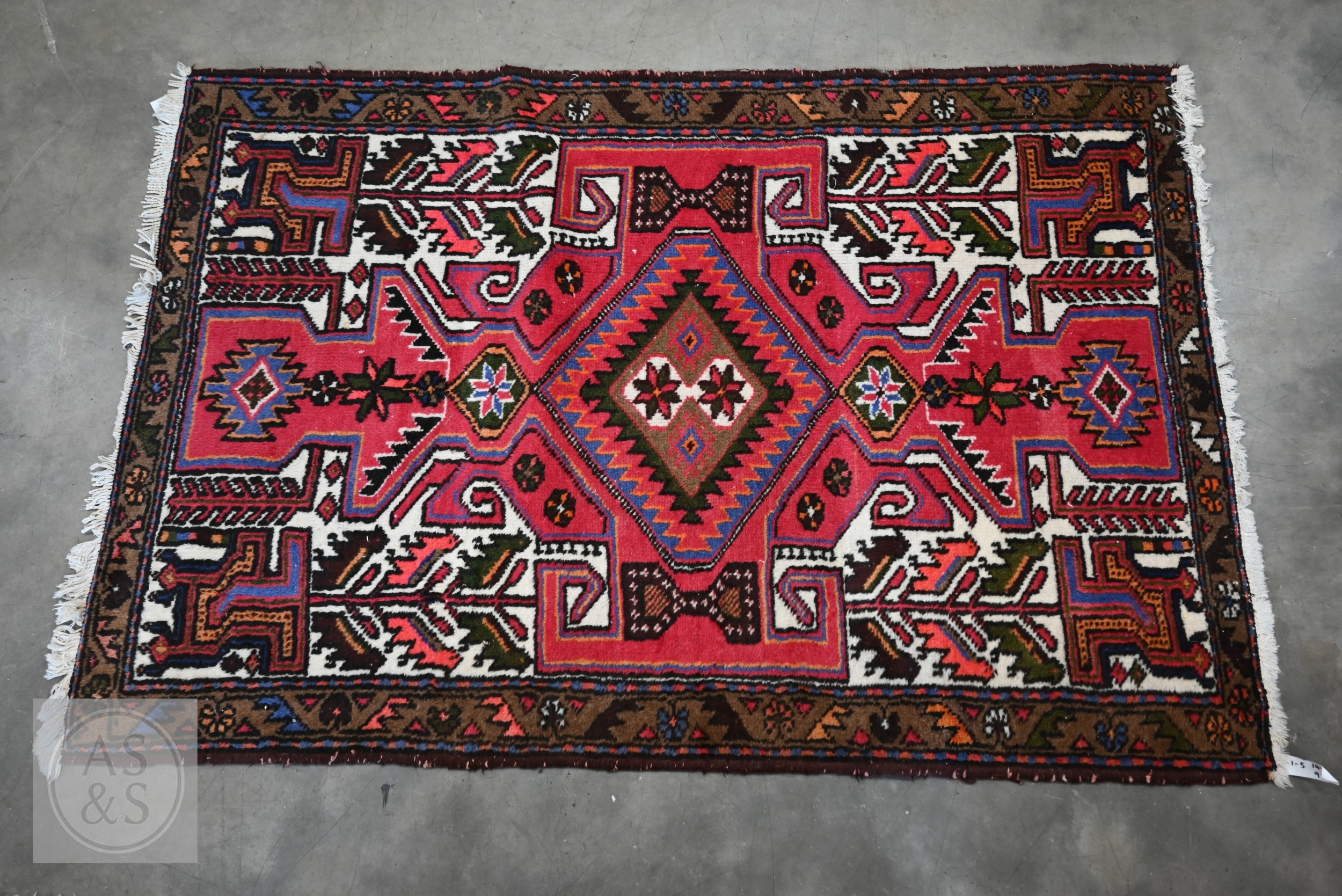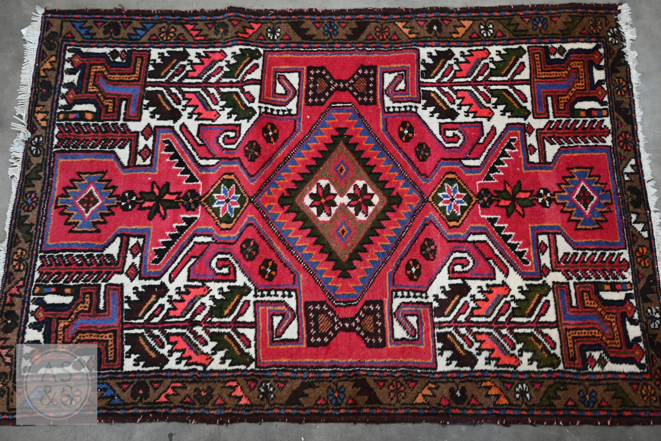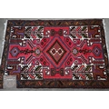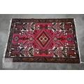 A Persian Hamadan rug, of lozenge medallion design on red ground, with brown palmette and leaf borders, 148 x 98 cm