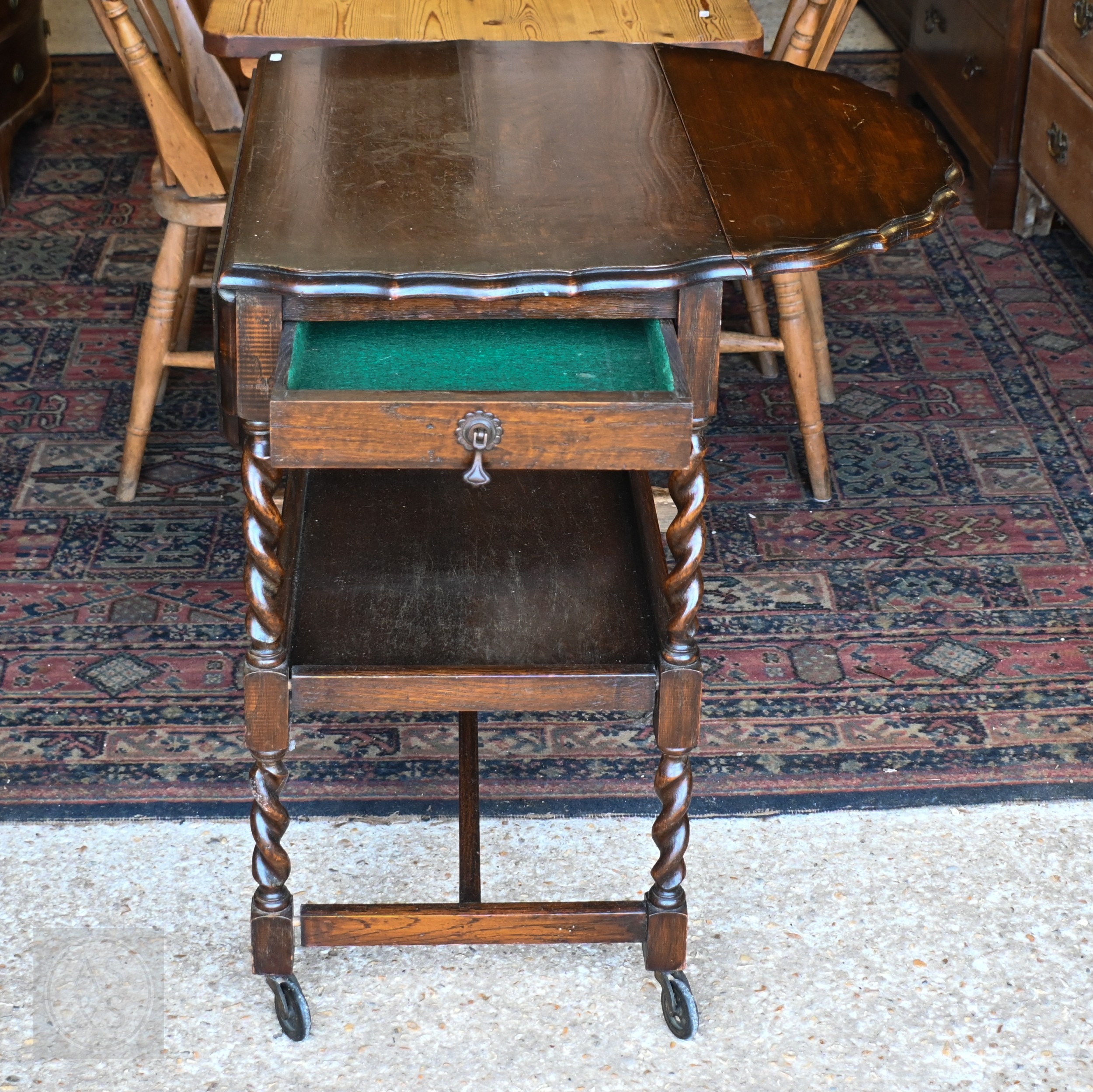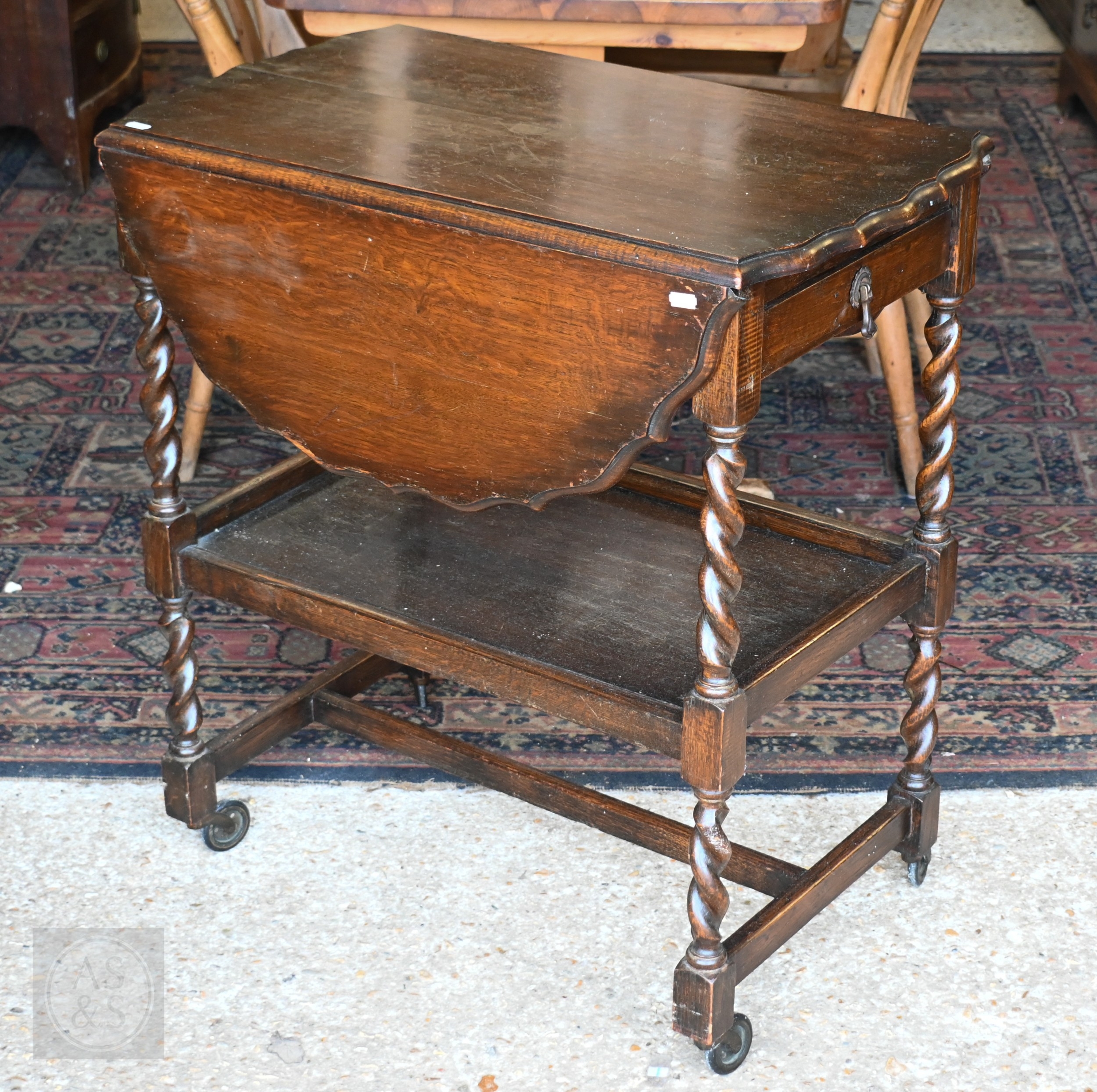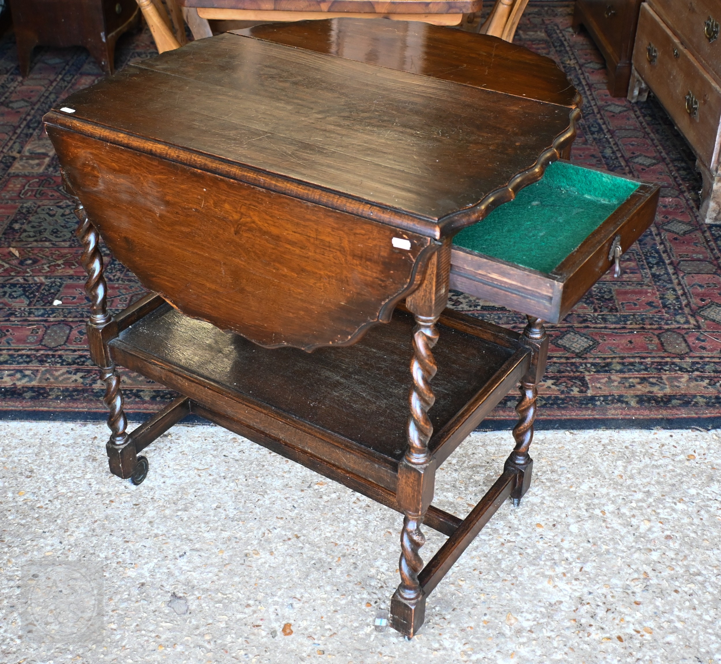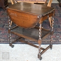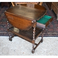 An Art Deco period oak barley-twist drop leaf serving trolley 44.5 cm x 37 cm x 103 cm h to/w an oak gateleg table (2)