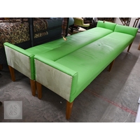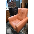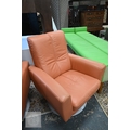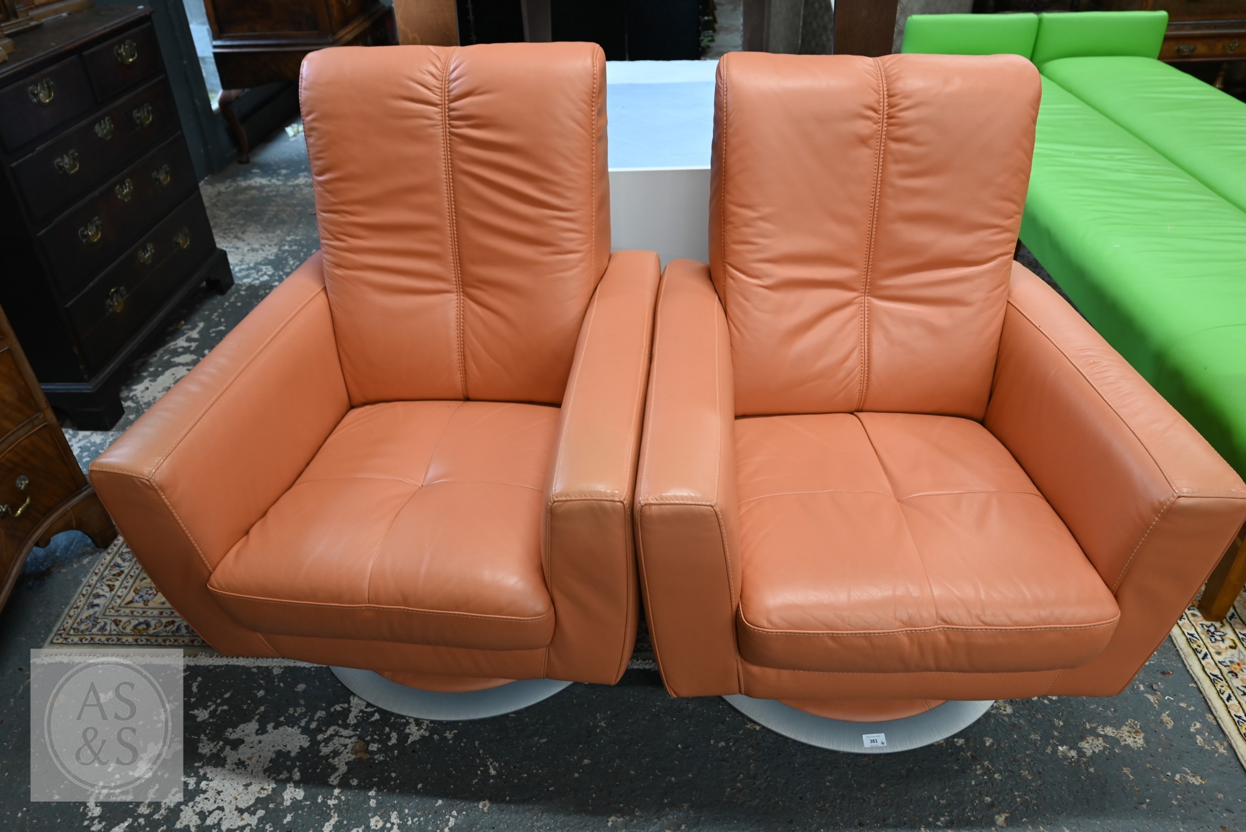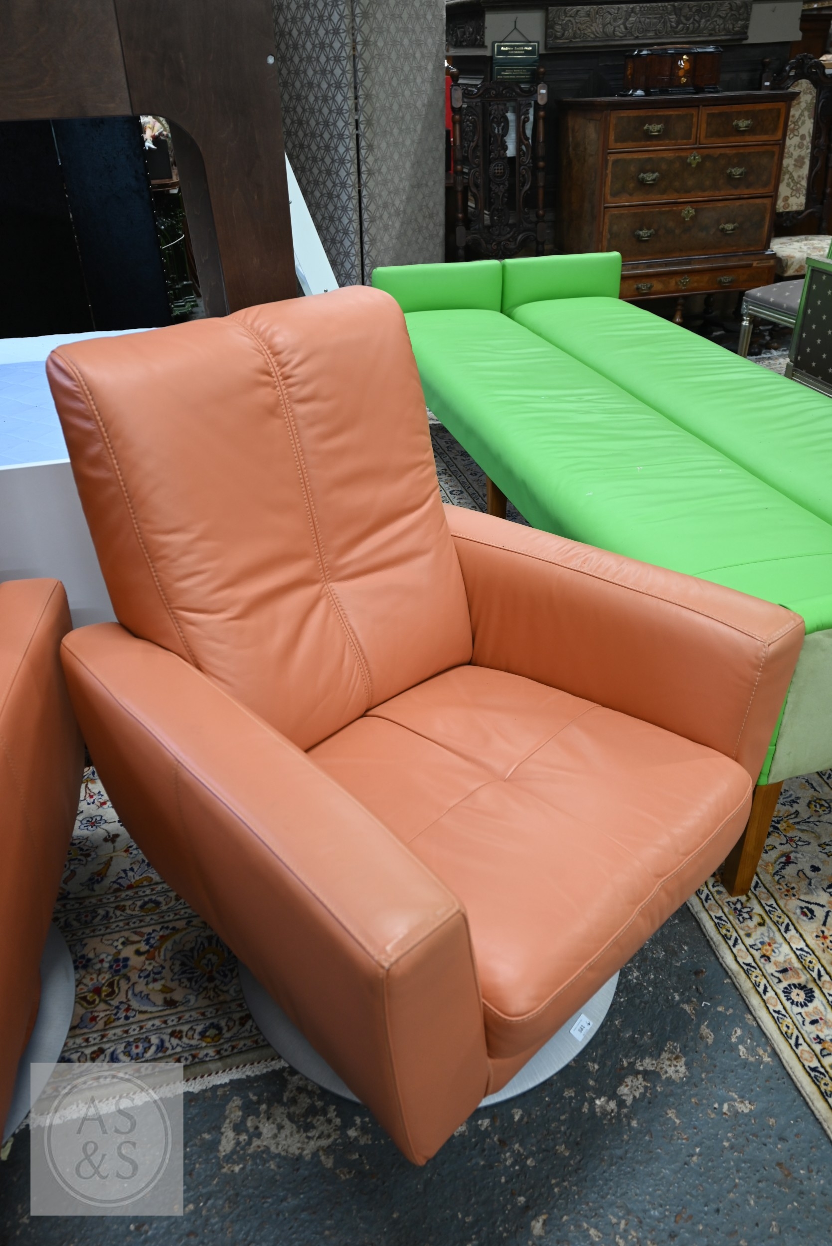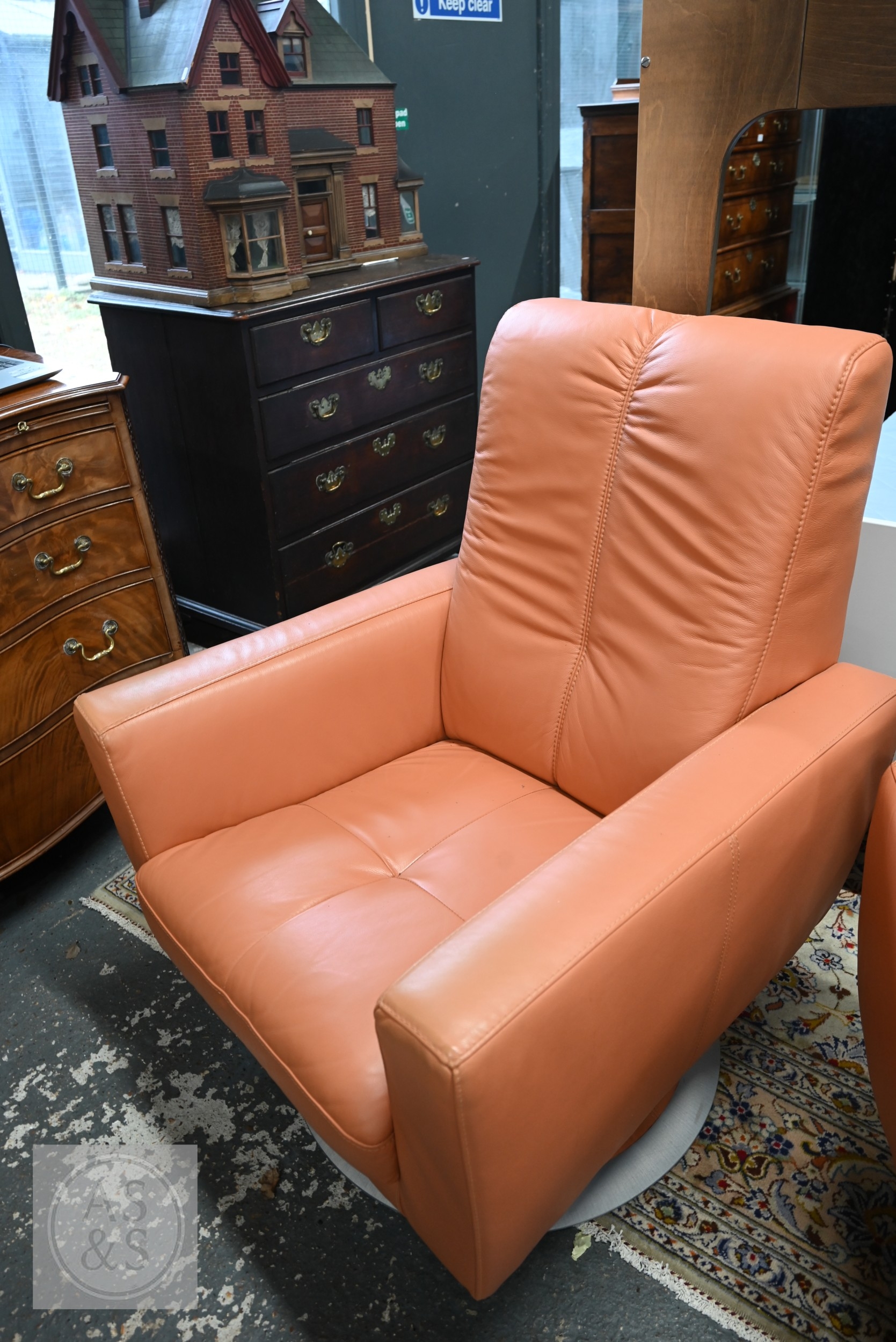 A pair of mid-century modern style swivel chairs in peach leather upholstery, circular brushed aluminium base stamped Orbus Type 4 9266-C