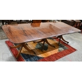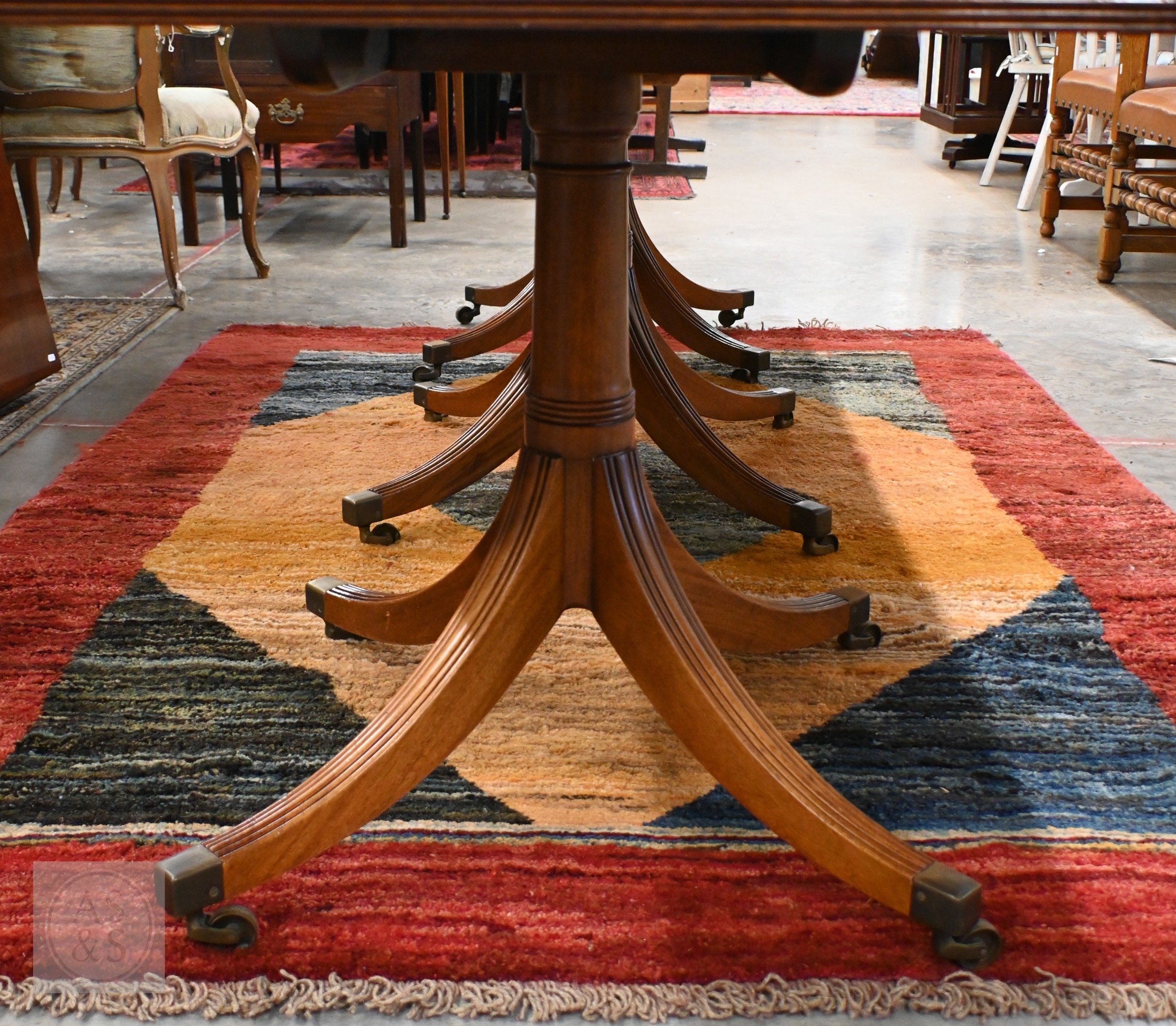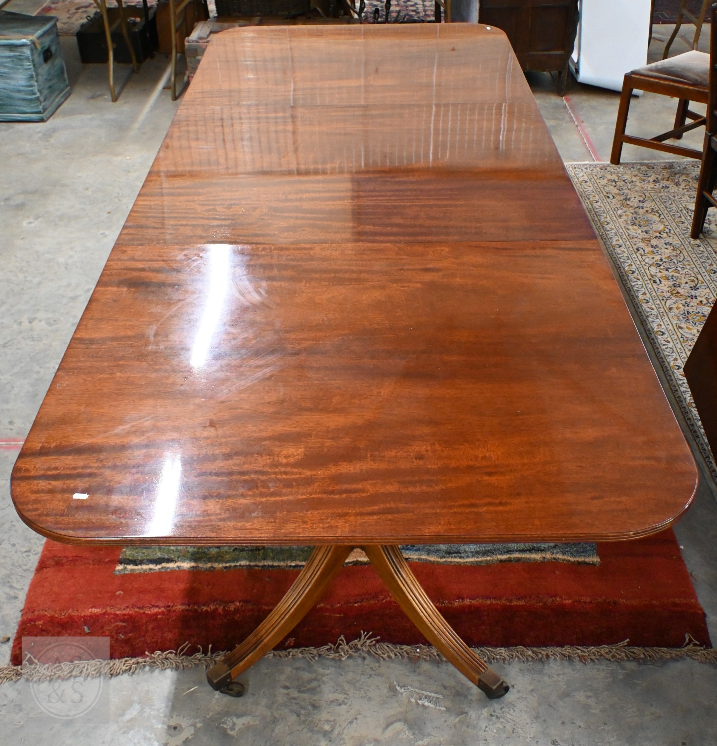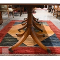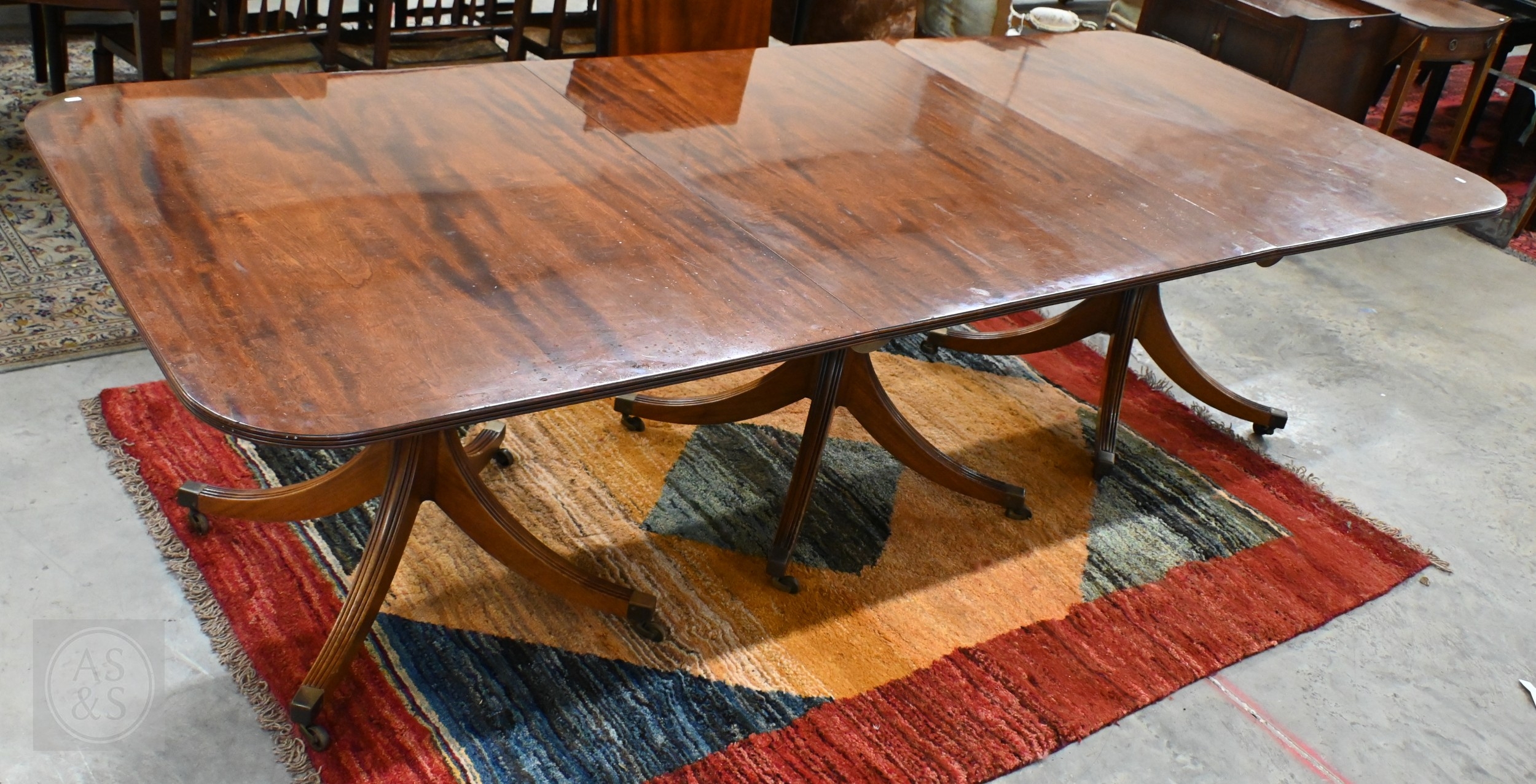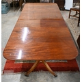 A large Regency style mahogany triple pedestal extending dining table with two extra optional leaves, each section with moulded edge top on a turned column and four splayed legs with casters, 274 x 114 x 72 cm high (two x 46 wide leaves)