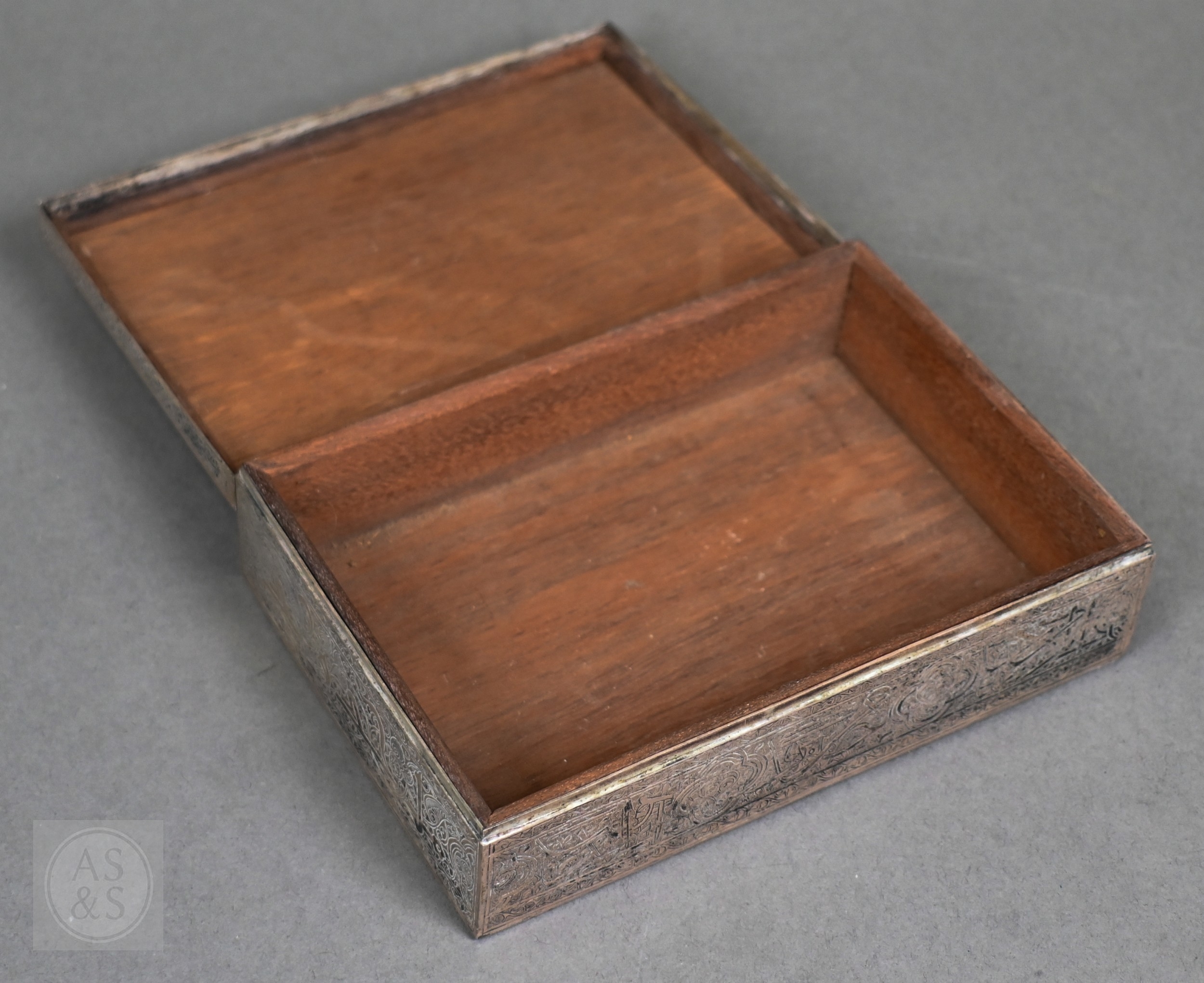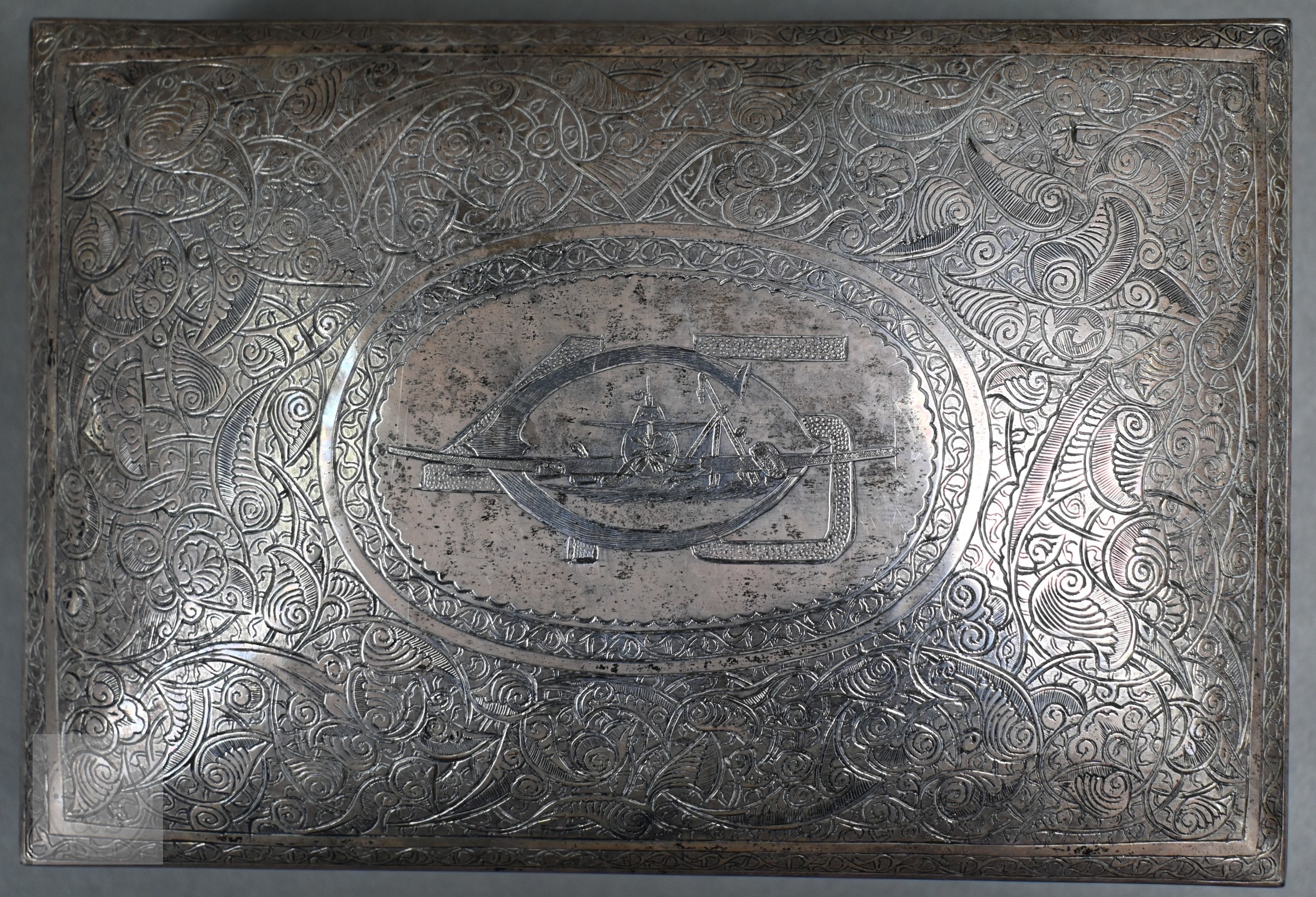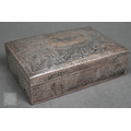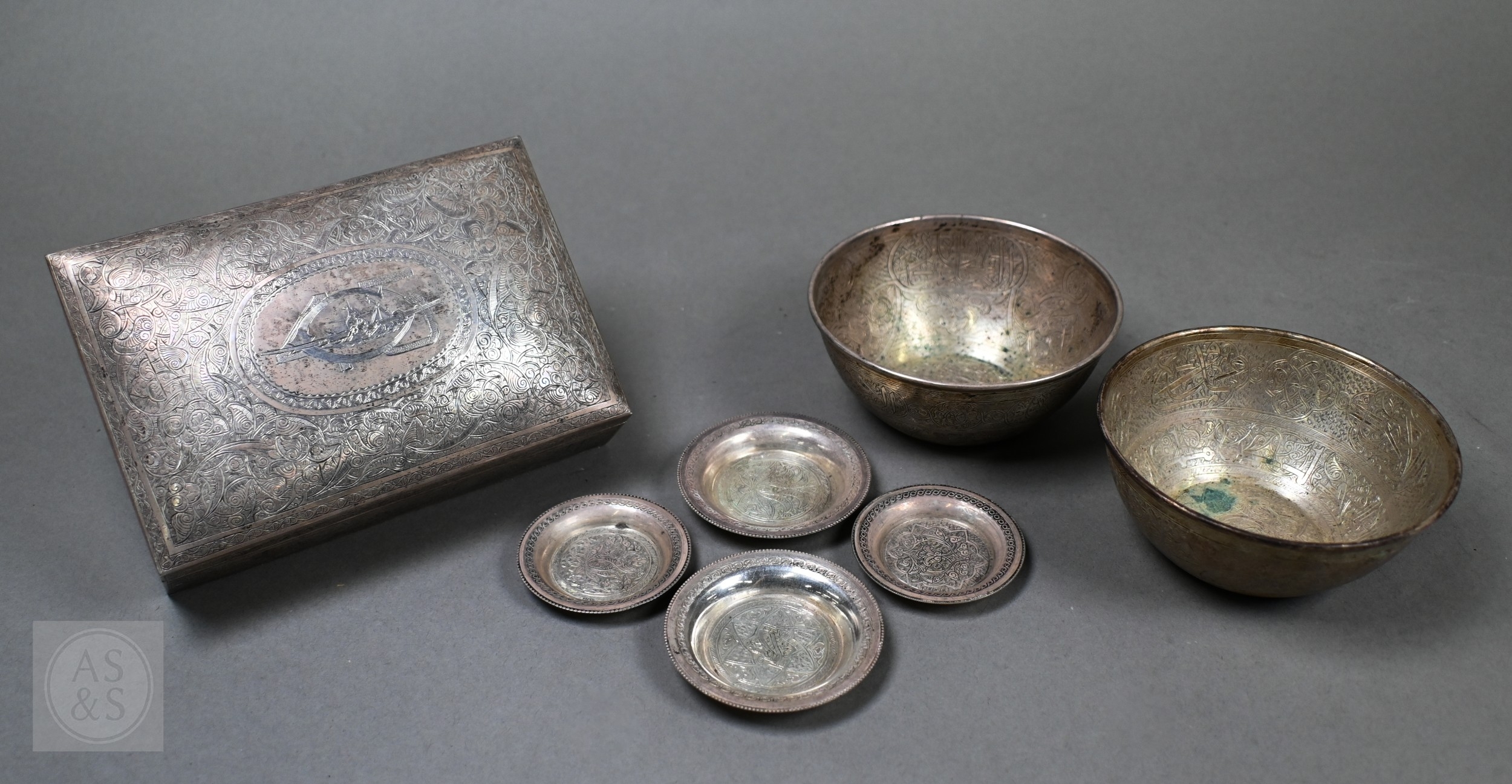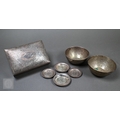 An Egyptian .90 grade cigarette box, engraved with a WW2 fighter aeroplane on 'C45' cypher, on richly engraved ground, date letter for 1939, 15.5cm wide, to/w two bowls with similar decorative engraving (not including aircraft), also 1939, and two pairs of small dishes, 1938/40 (7), 8.7ozt of weighable .90 grade silver