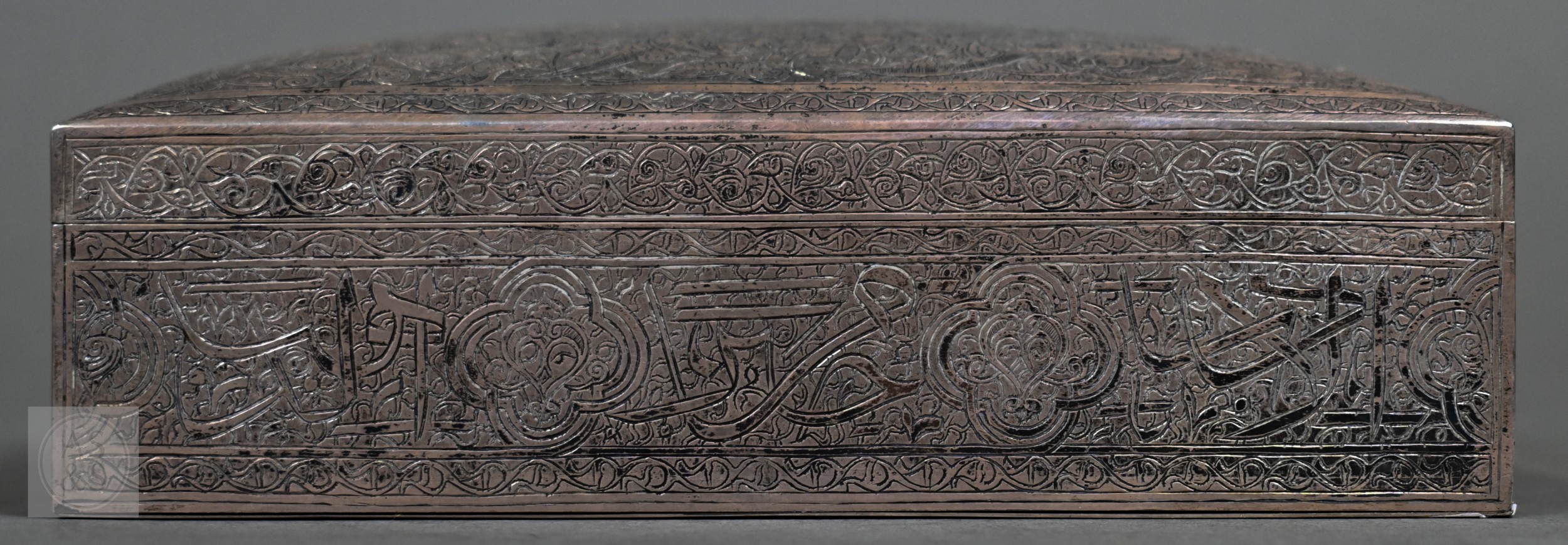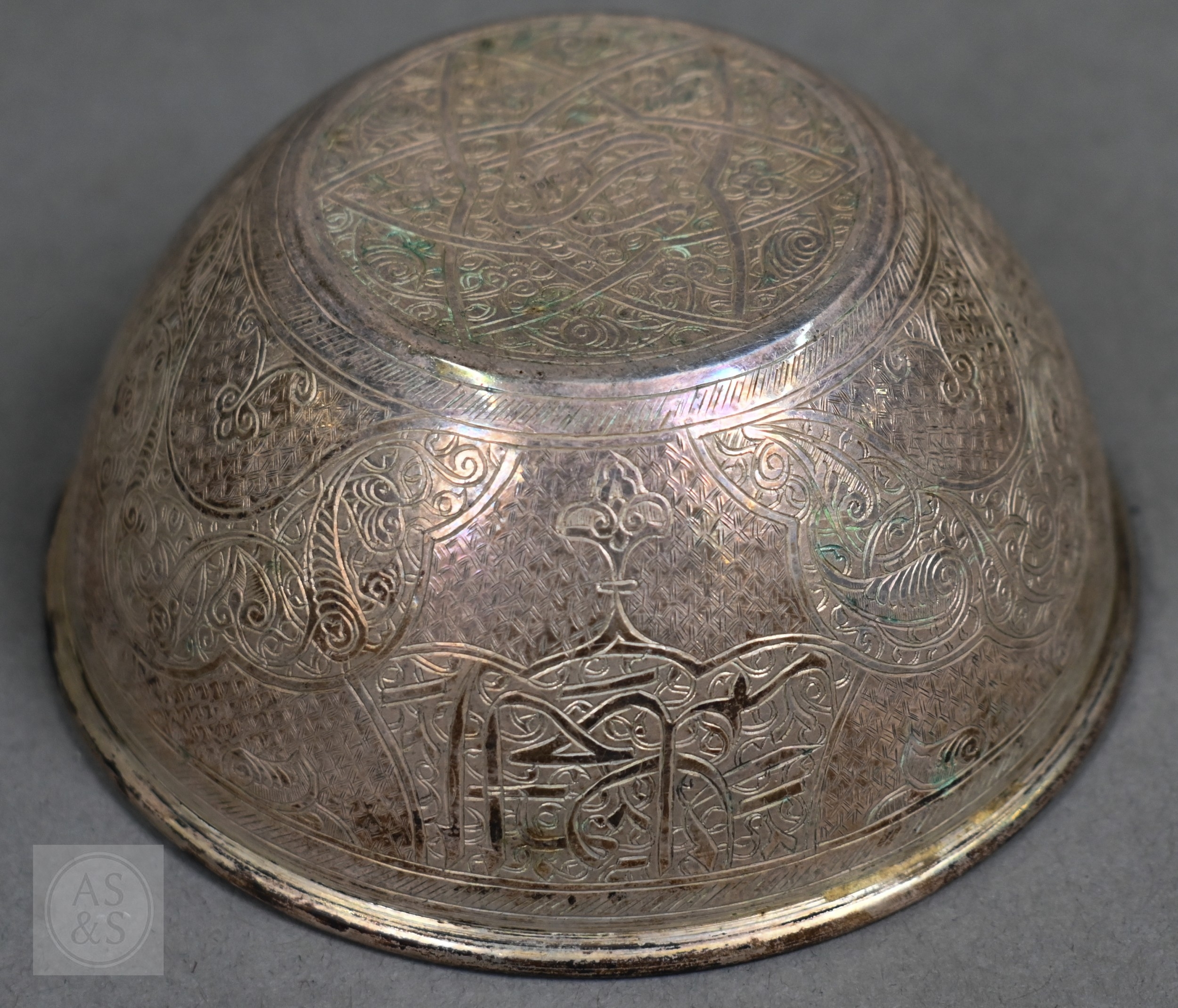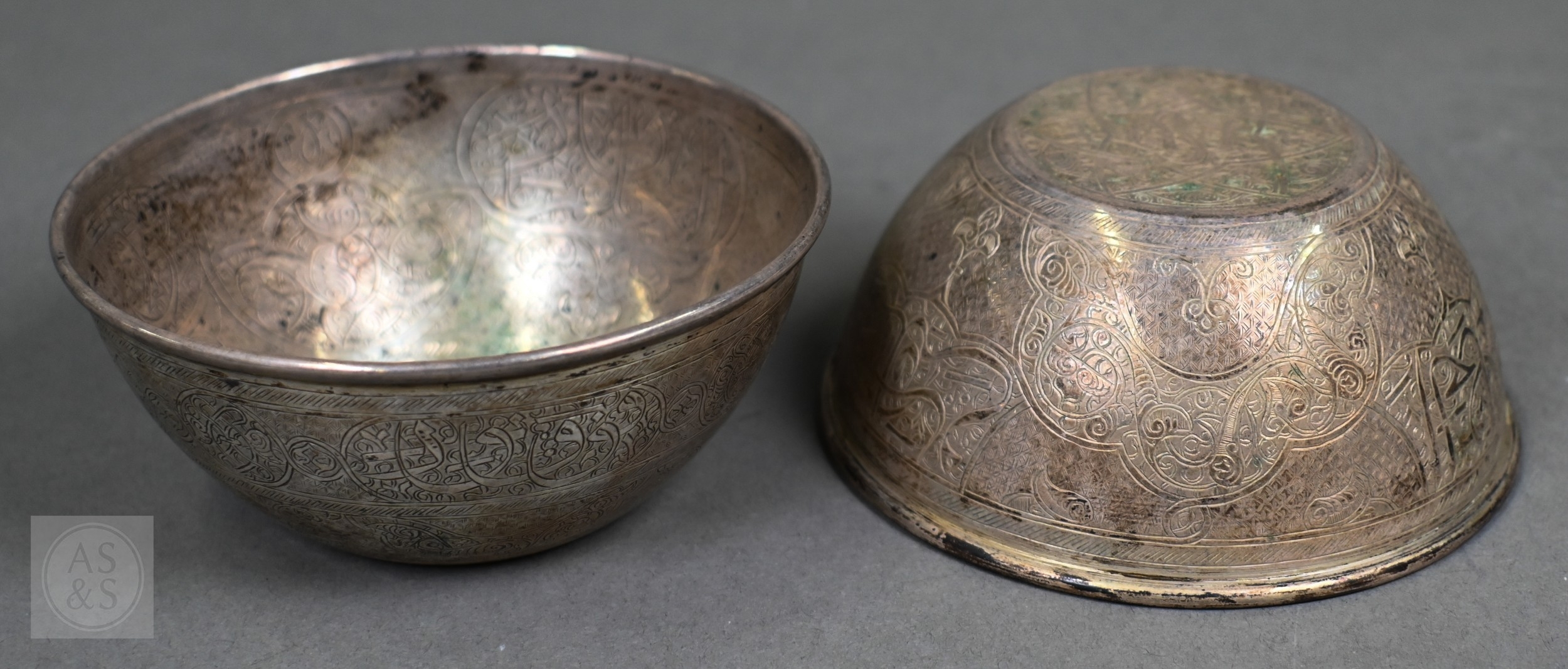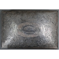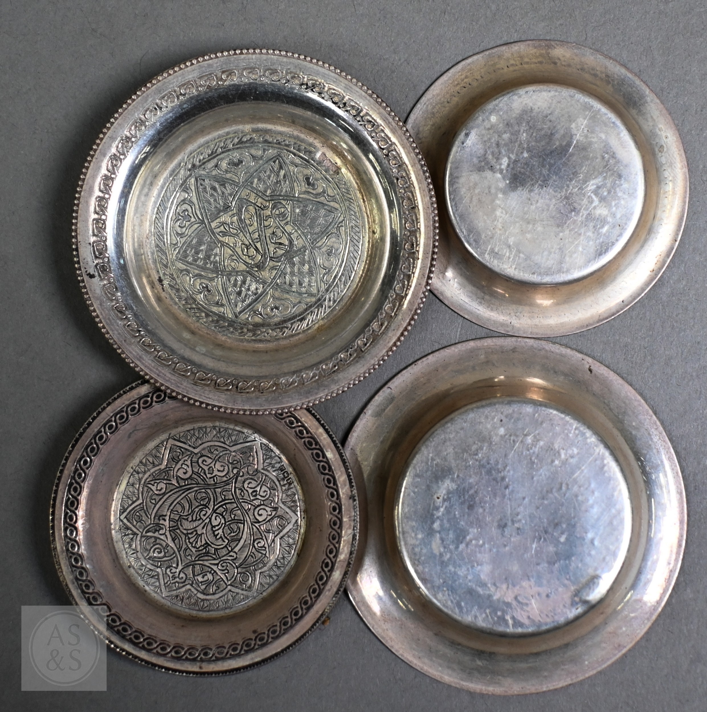 An Egyptian .90 grade cigarette box, engraved with a WW2 fighter aeroplane on 'C45' cypher, on richly engraved ground, date letter for 1939, 15.5cm wide, to/w two bowls with similar decorative engraving (not including aircraft), also 1939, and two pairs of small dishes, 1938/40 (7), 8.7ozt of weighable .90 grade silver