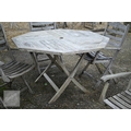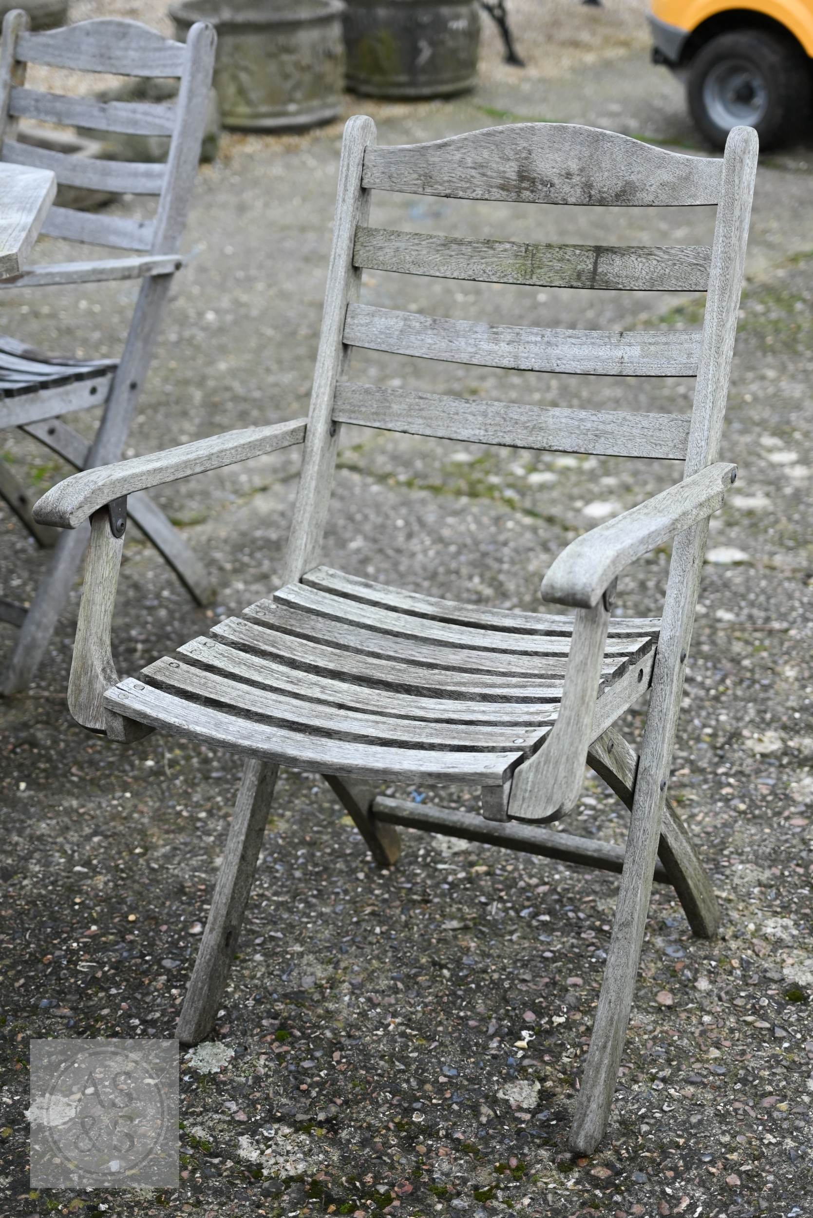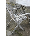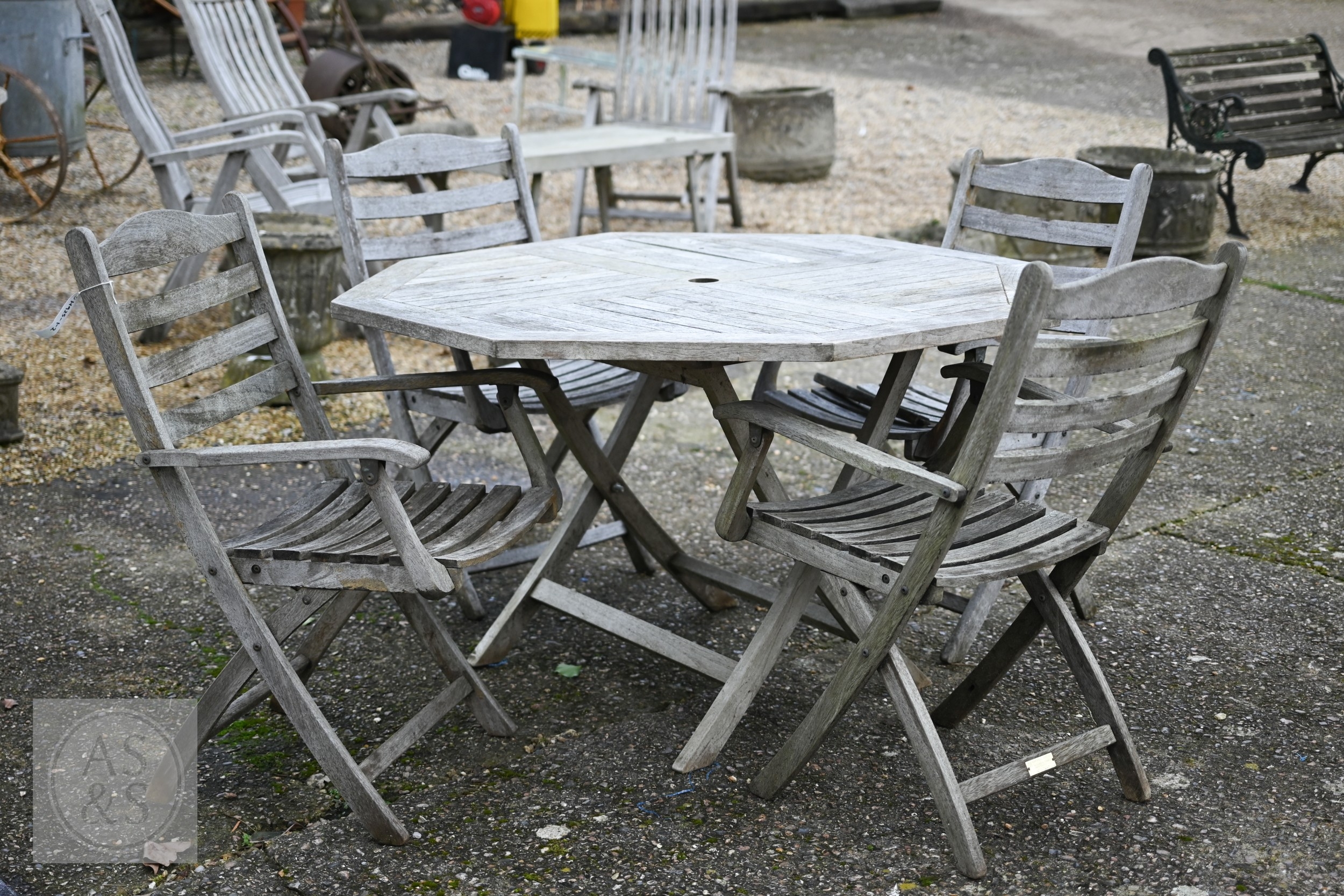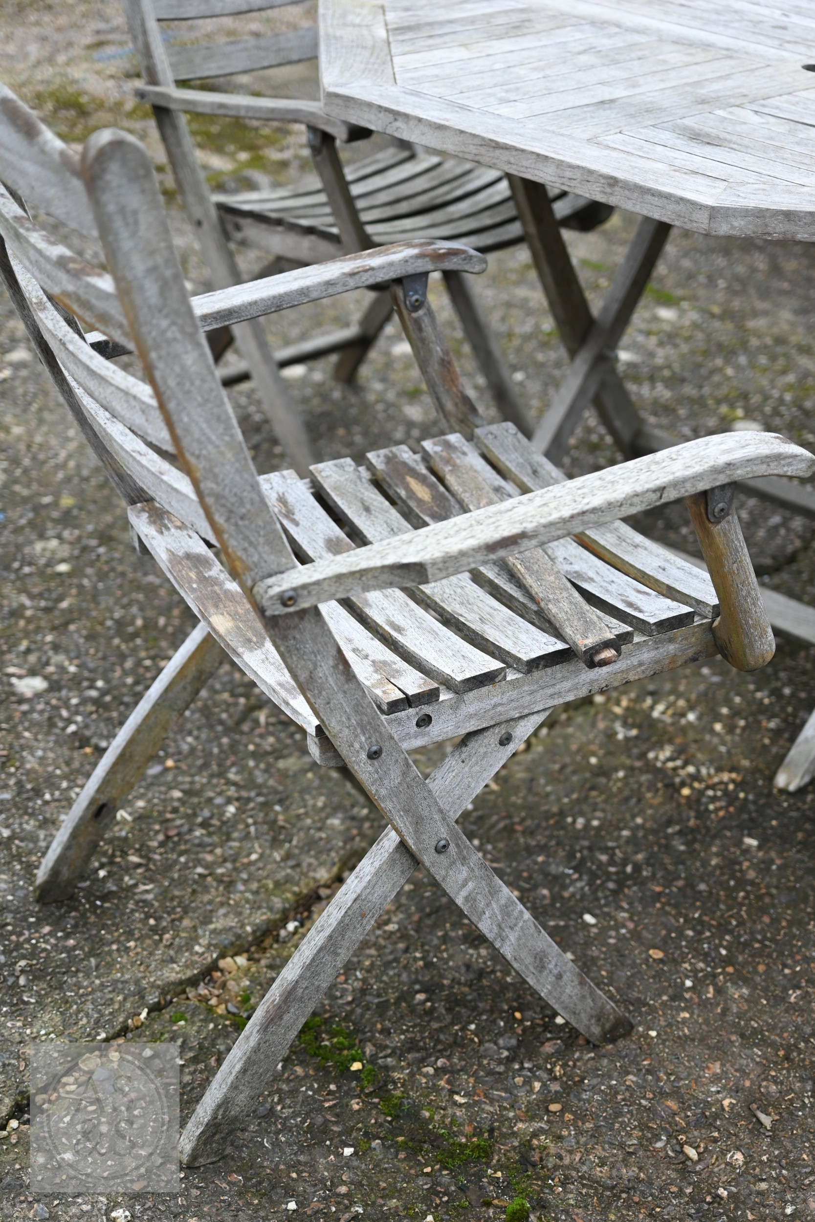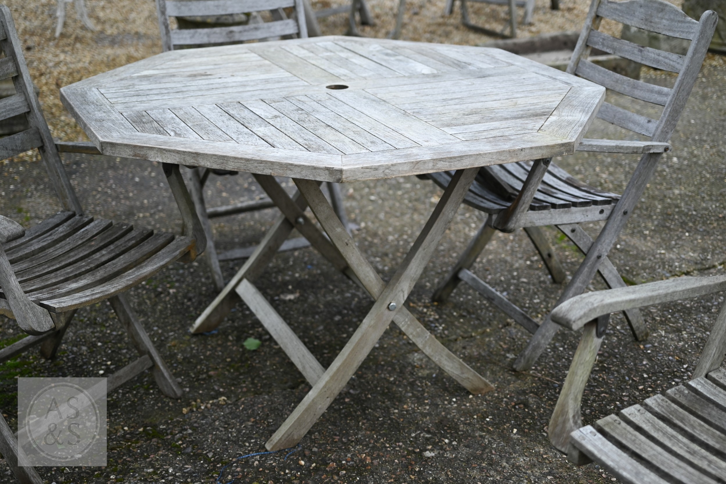 A weathered octagonal teak garden table 120 cm x 120 cm x 73 cm h to/with a set of four chairs by Alexander Rose