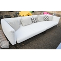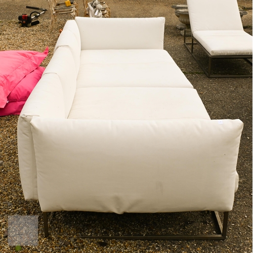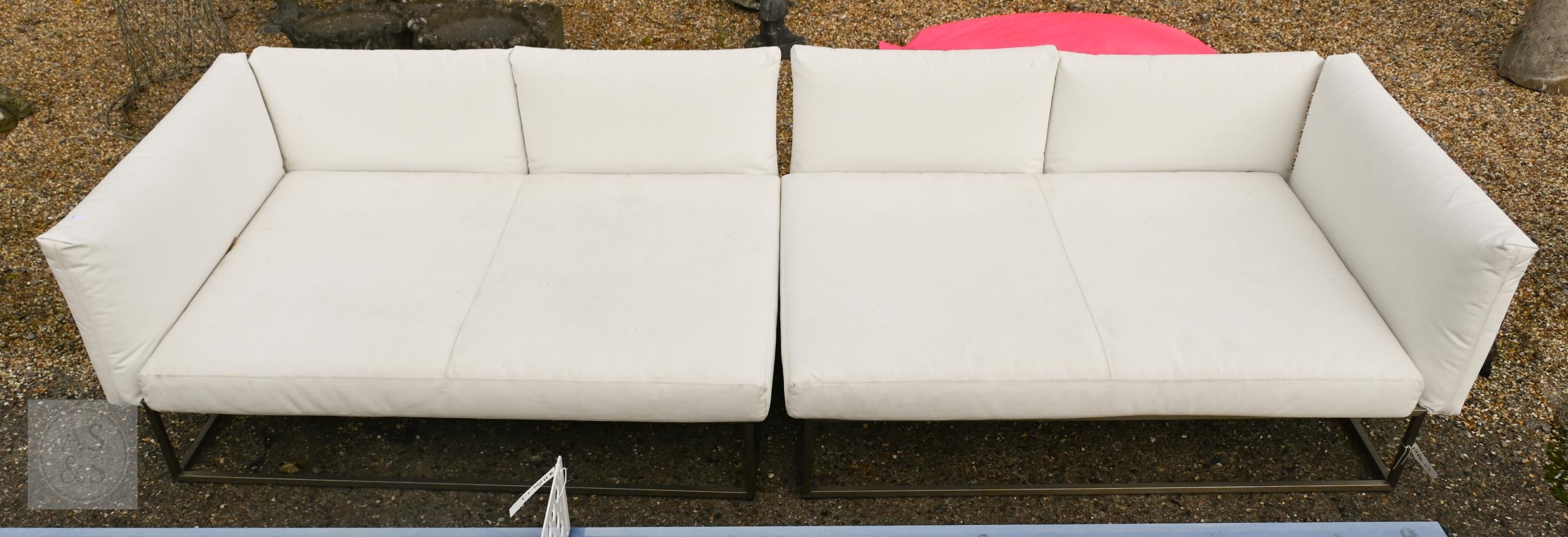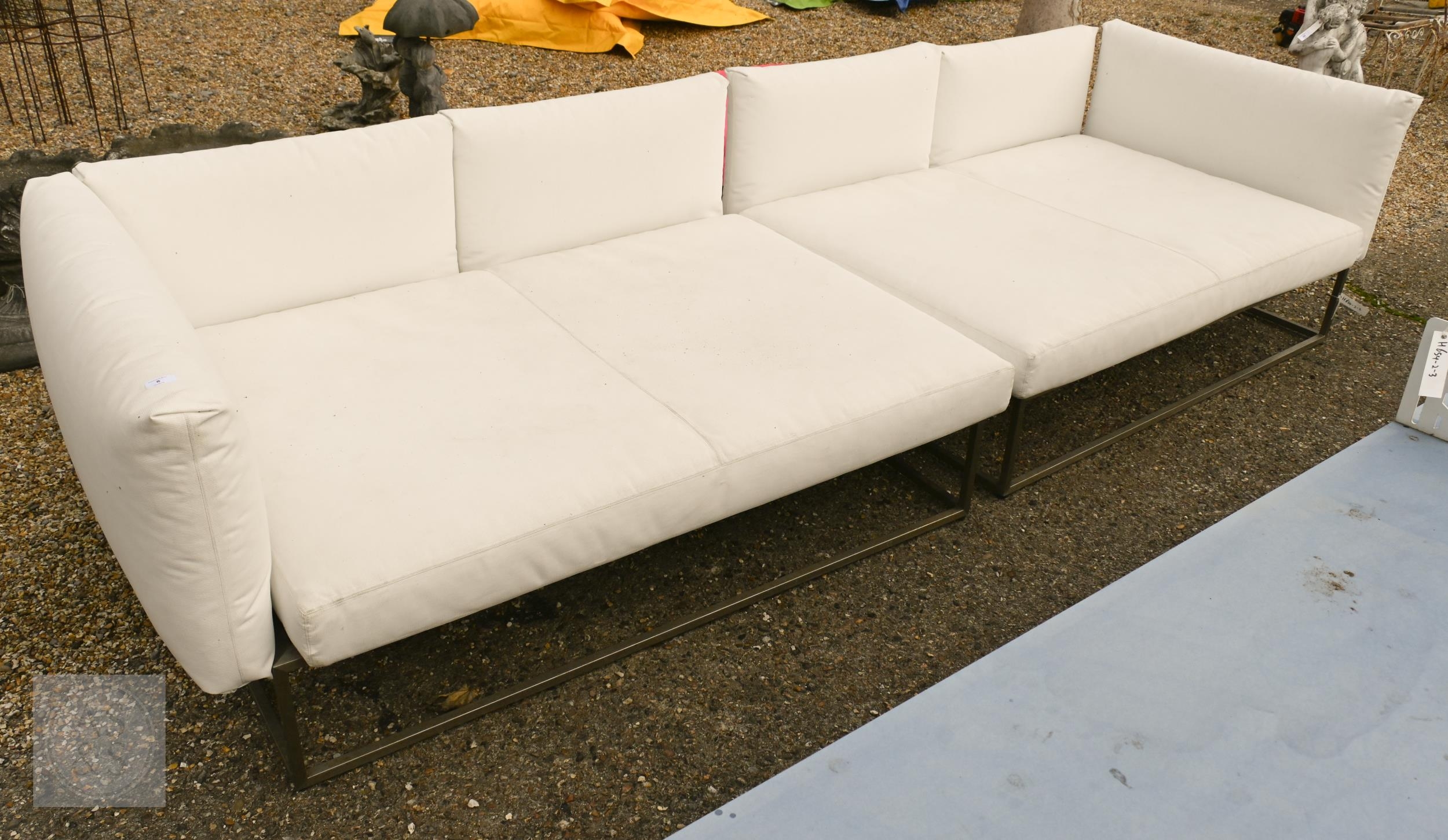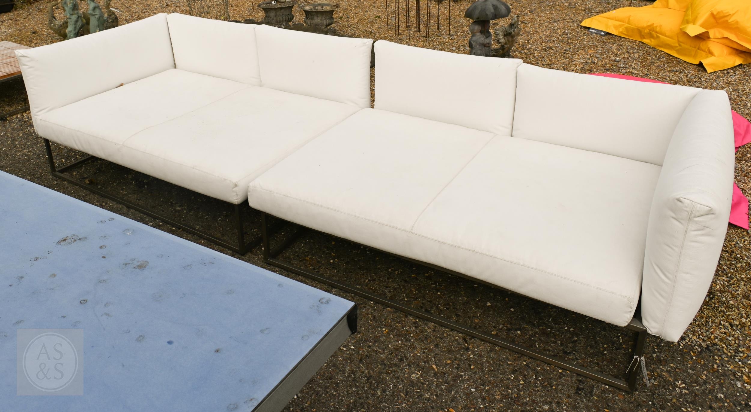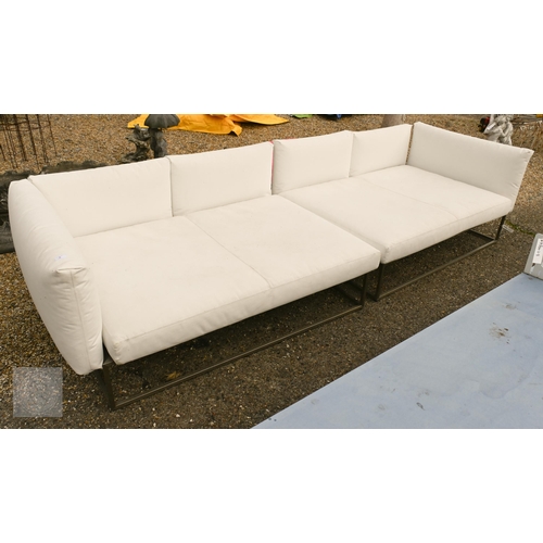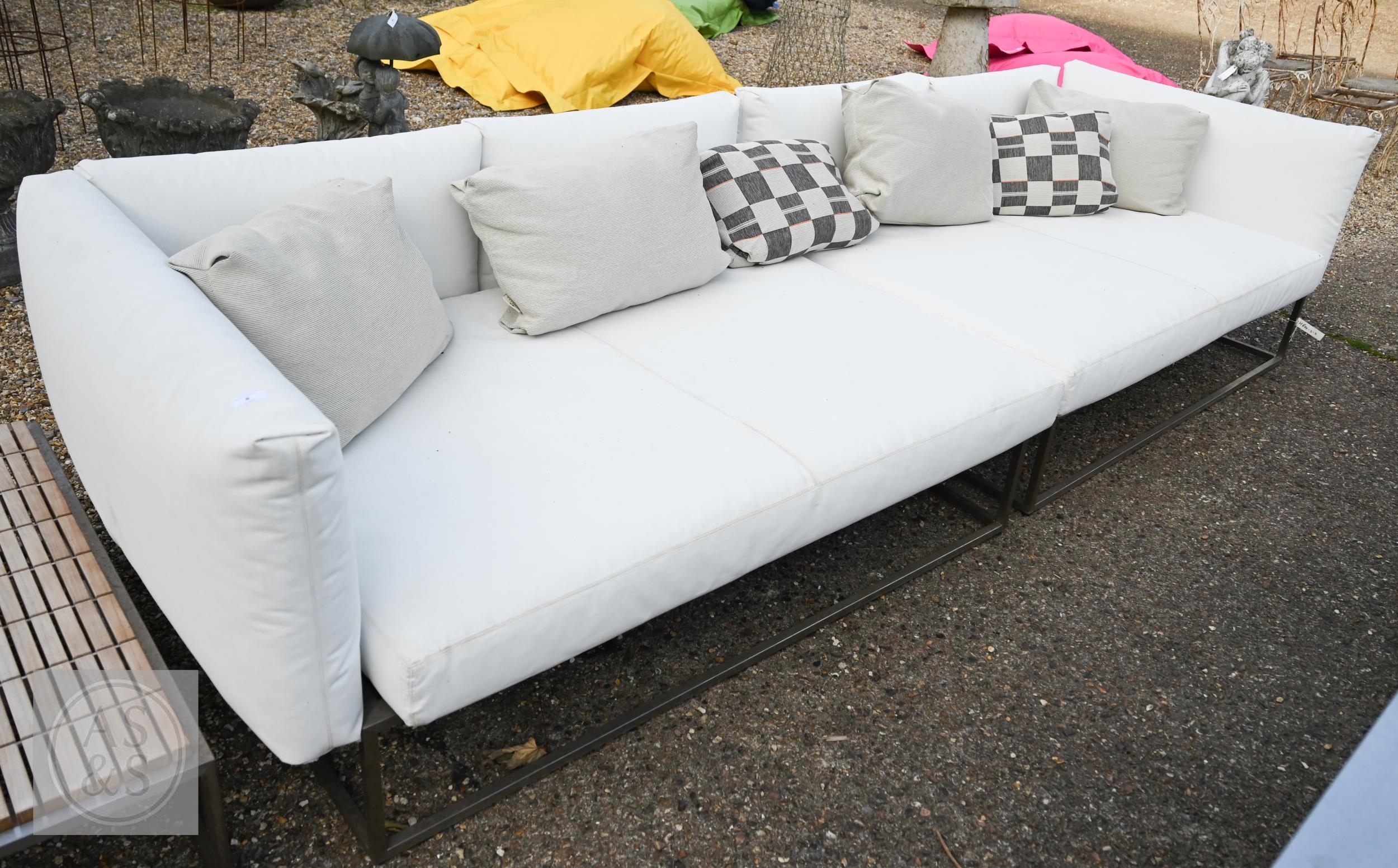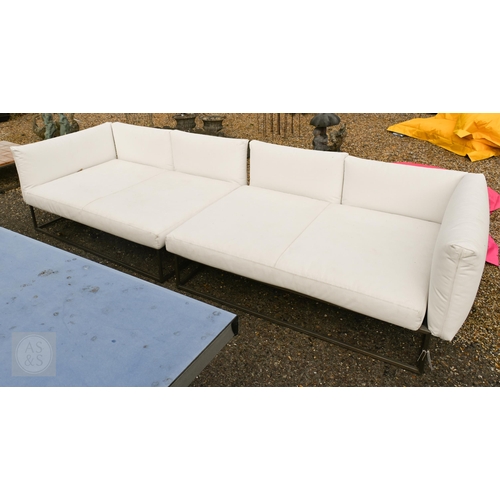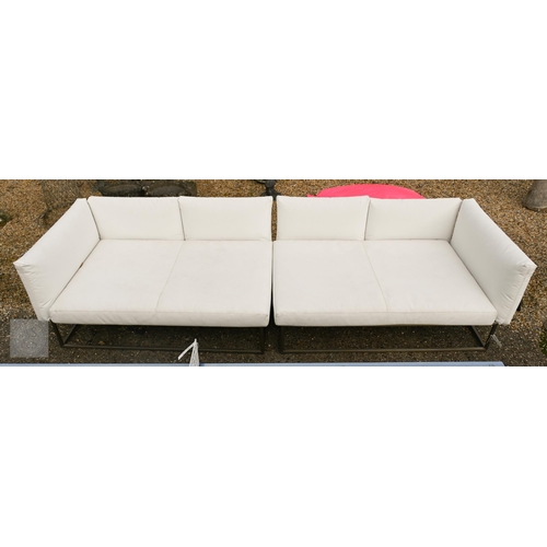 Gloster, a companion pair of modular 'Cloud' model left and right handed all-weather corner sofa sections, designed by Mark Gabbertas, the stainless steel frames with removeable Leisuretex mesh fabric covers and c/with eight contrasting Gloster scatter cushions, each sofa 166 cm x 112 cm deep (2)
