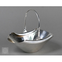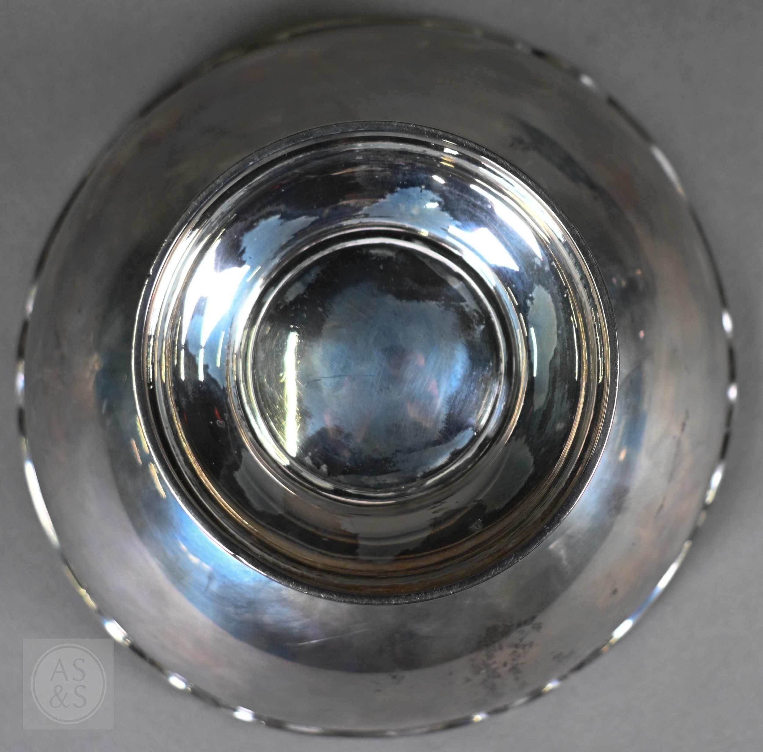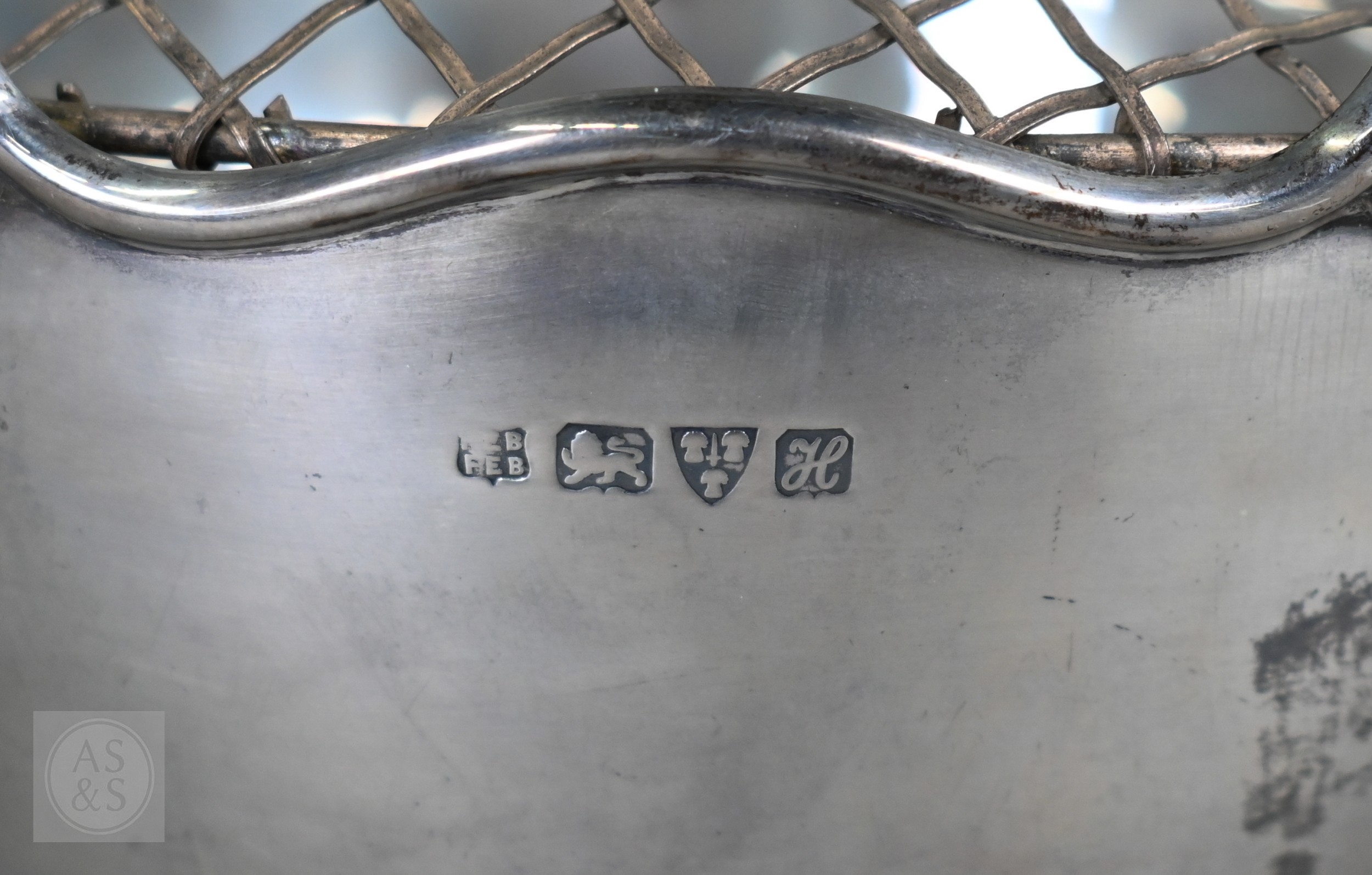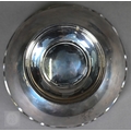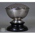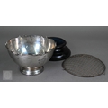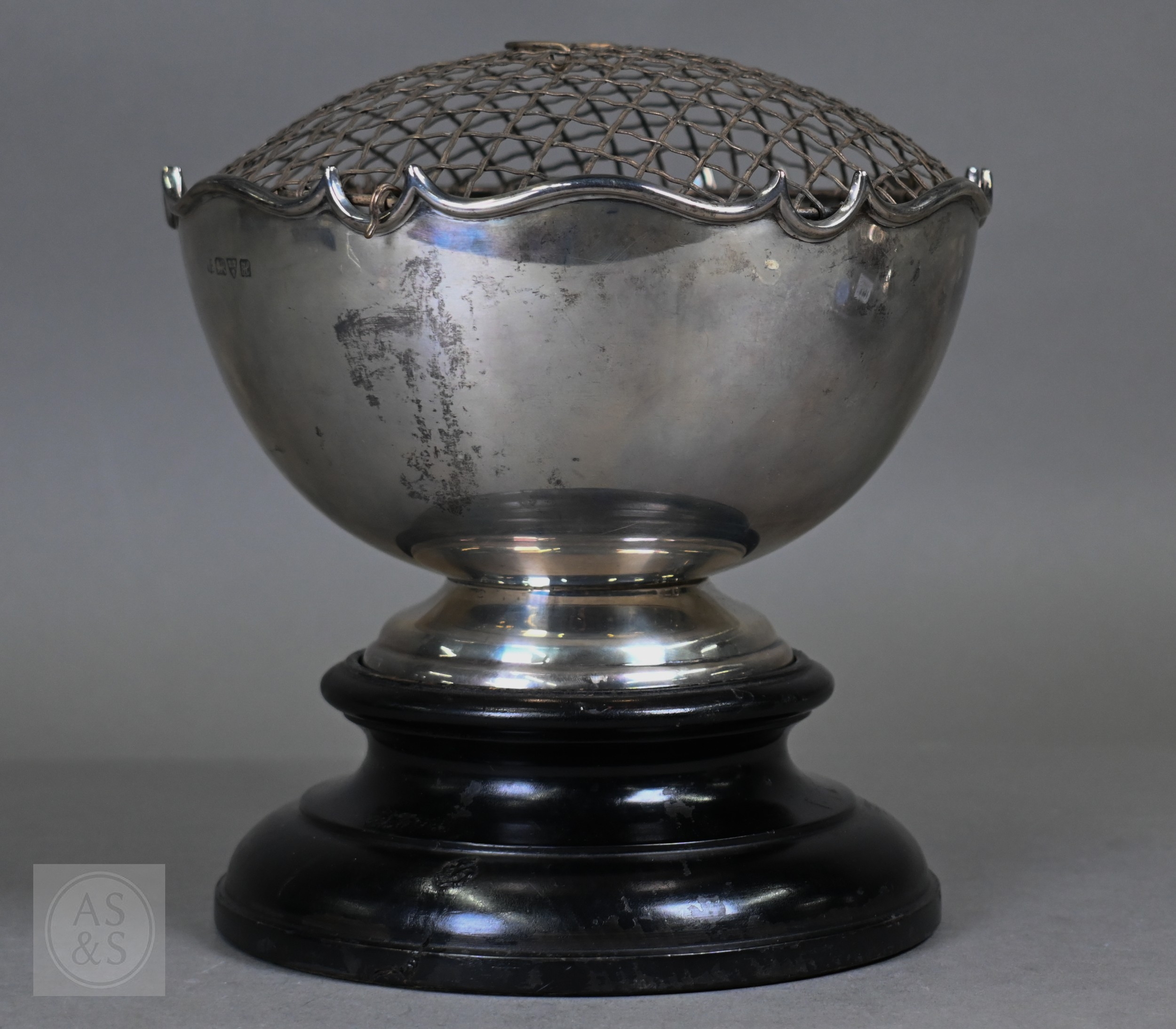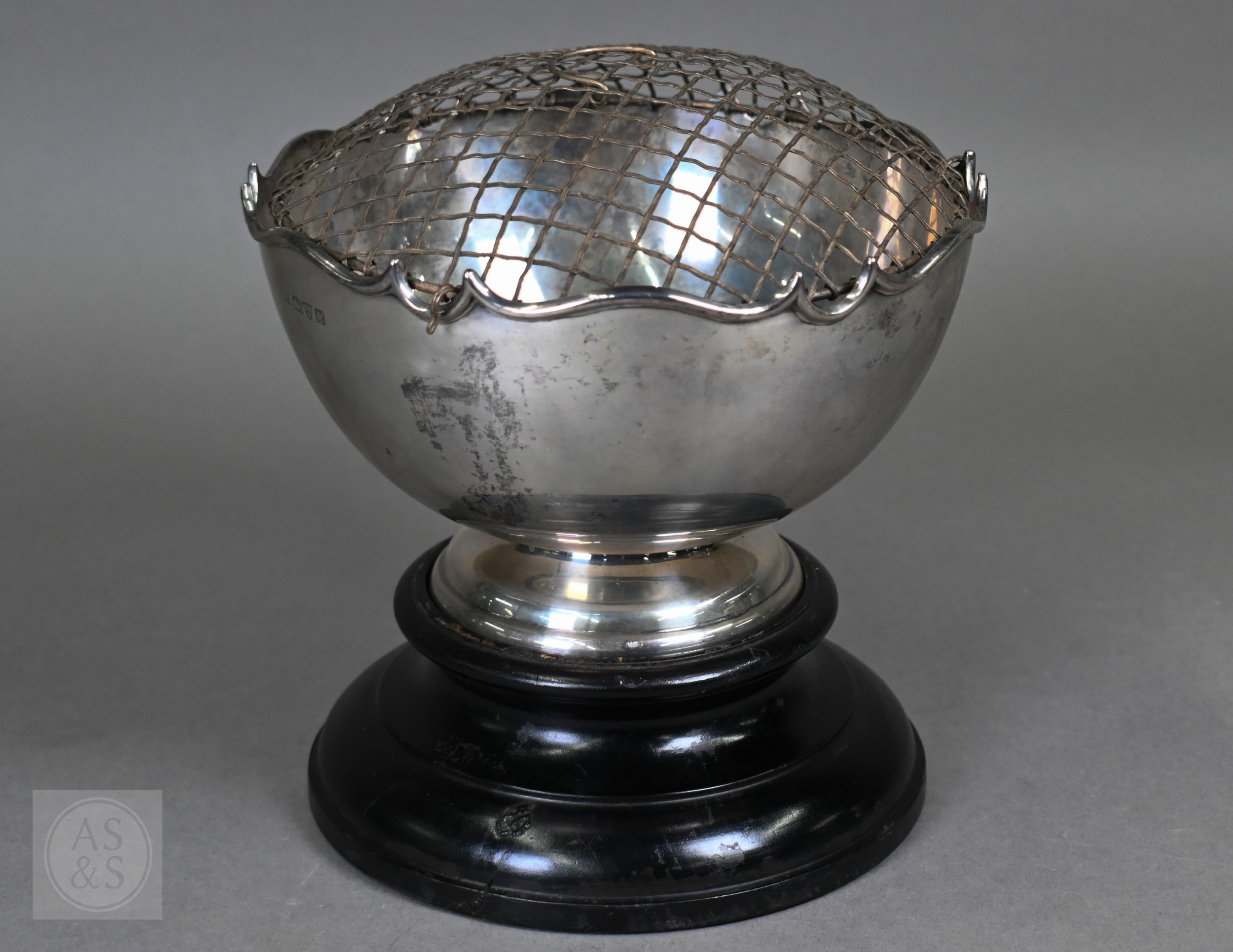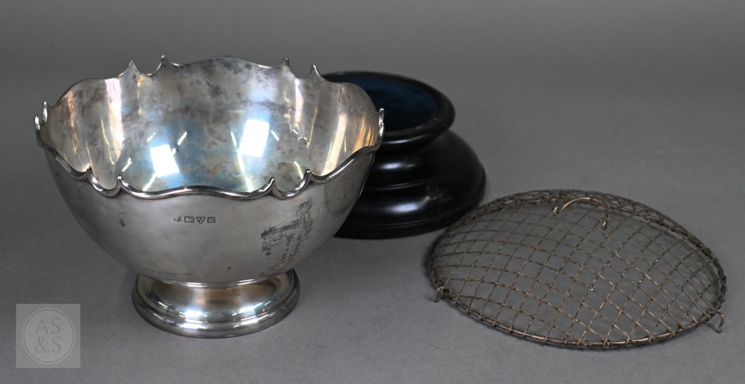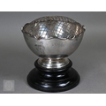 An Edwardian silver rose bowl with shaped rim and raised foot, Barker Brothers, Chester 1908, 13.2oz net, 19cm diameter; includes wire 'rose' grill and ebonised plinth
