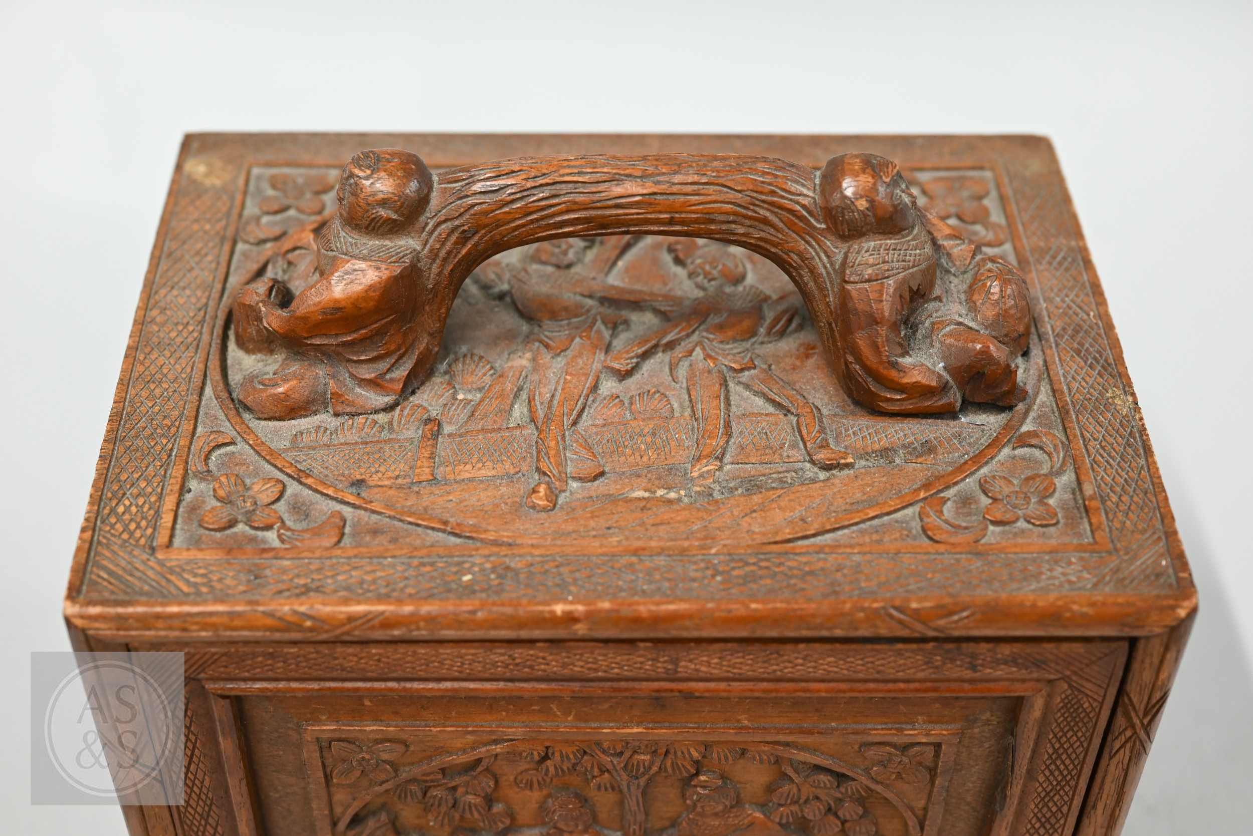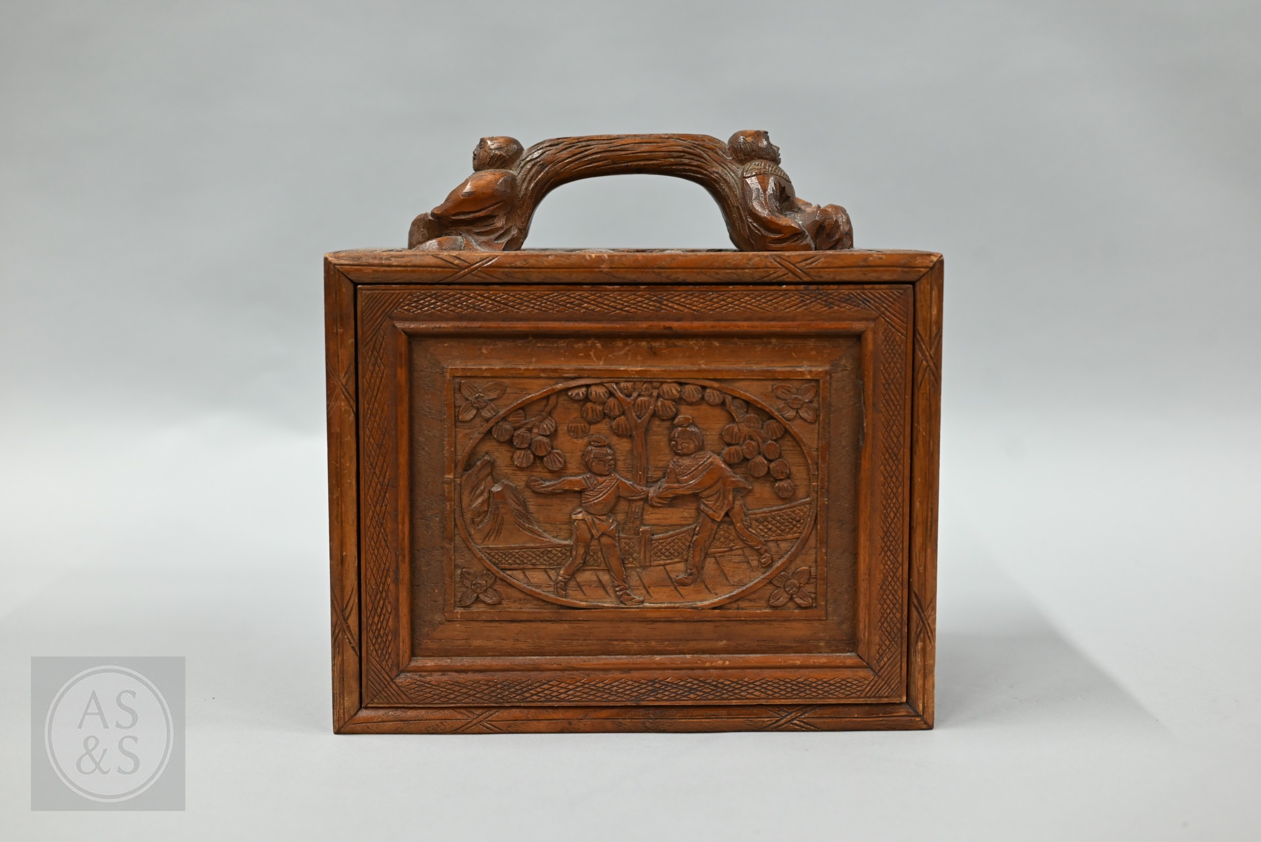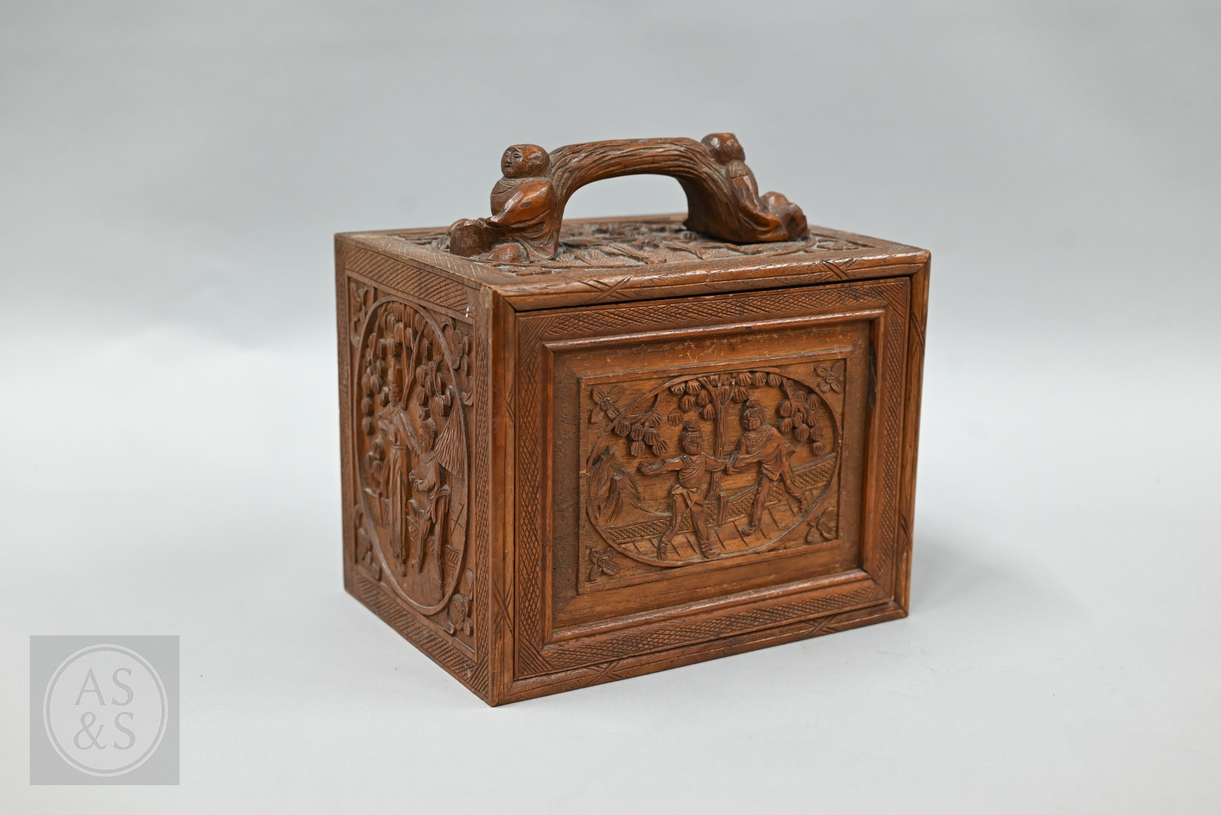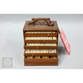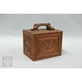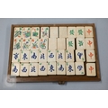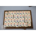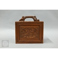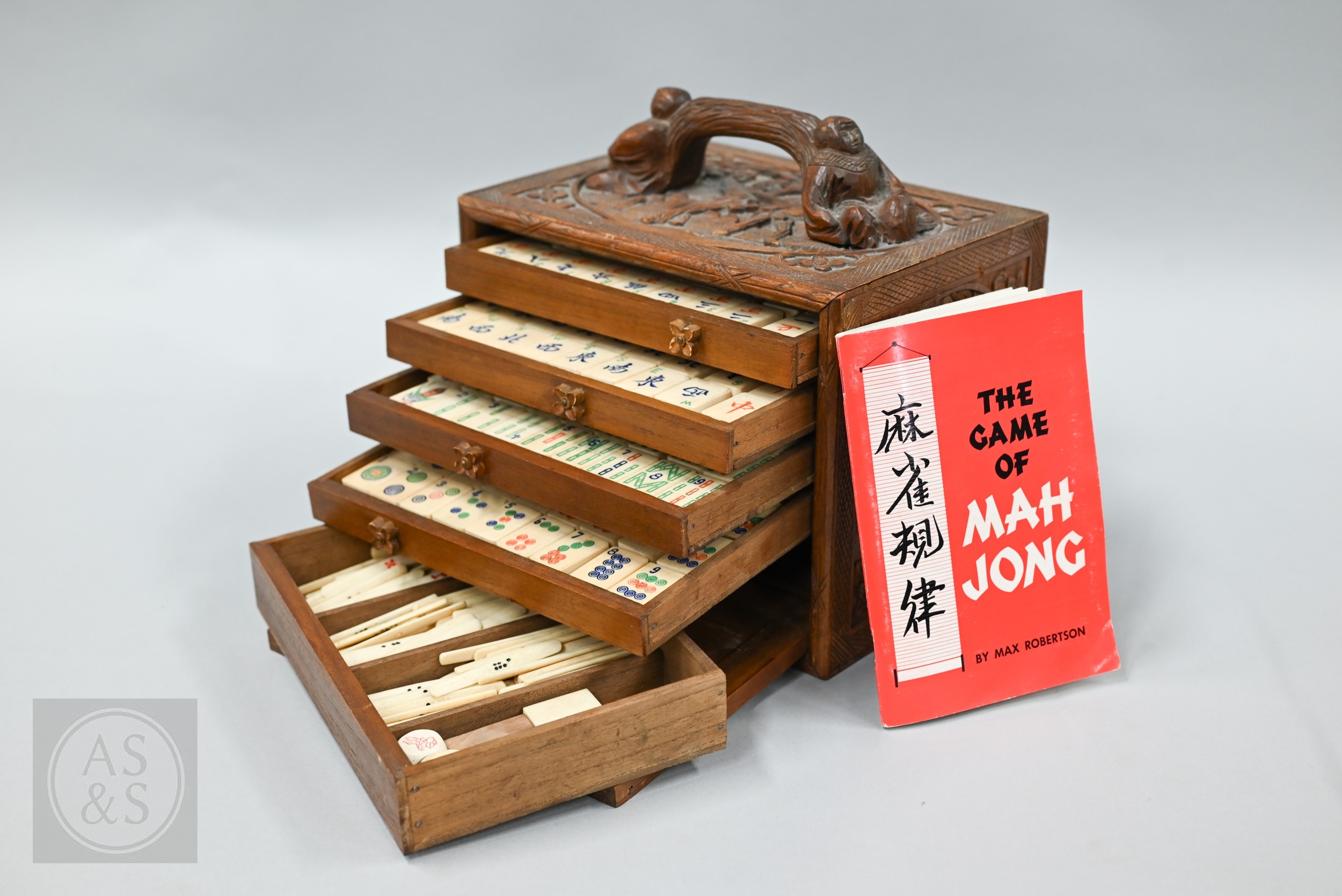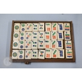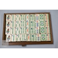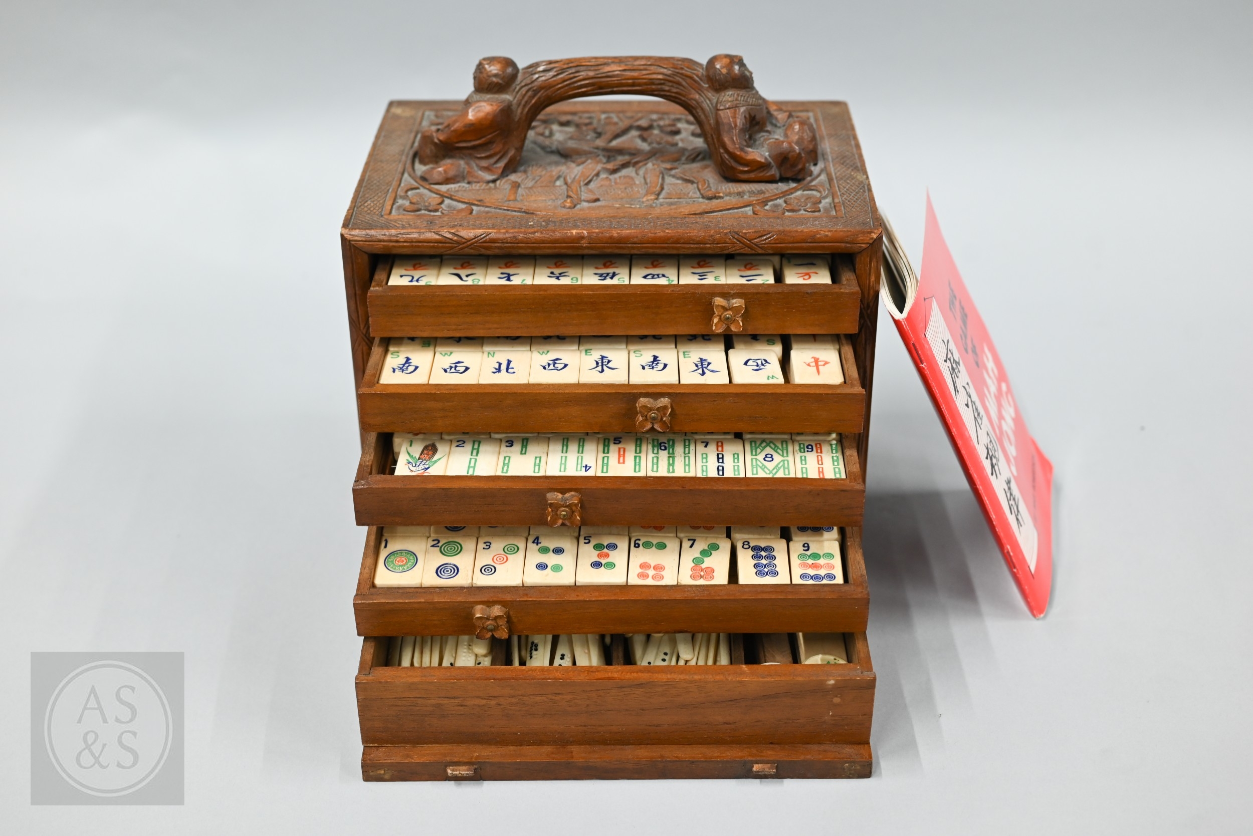 An early-mid 20th century Chinese Mah Jong set, the wooden case decoratively carved with landscapes and figures mounted by a tree branch handle with two seated figures, the pop-out panelled front door opening to reveal five drawers containing bamboo and bone tiles (144 + 4 blanks) counting sticks/betting counters etc, box measures 24 cm w x 18 cm d x 24 cm h c/w instructions