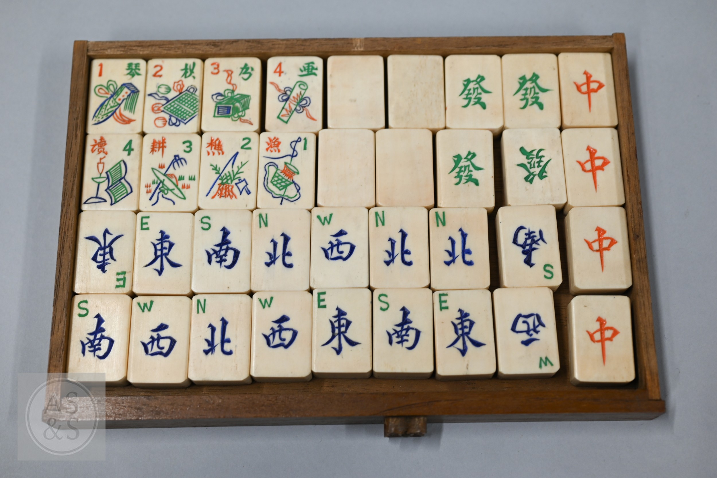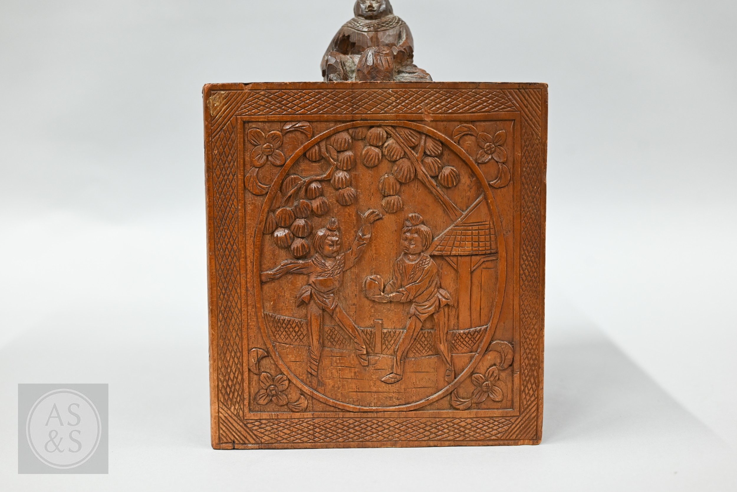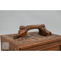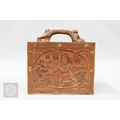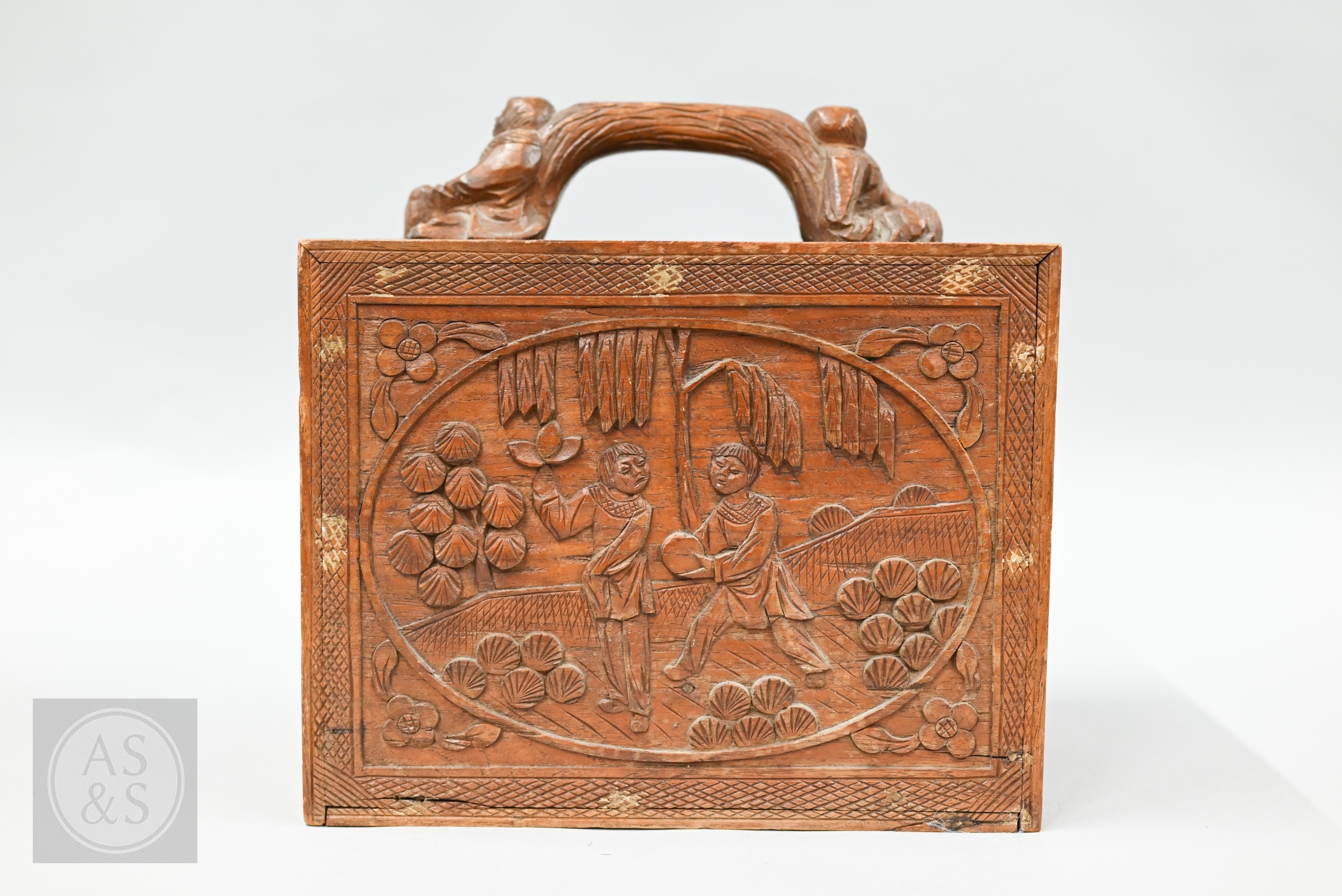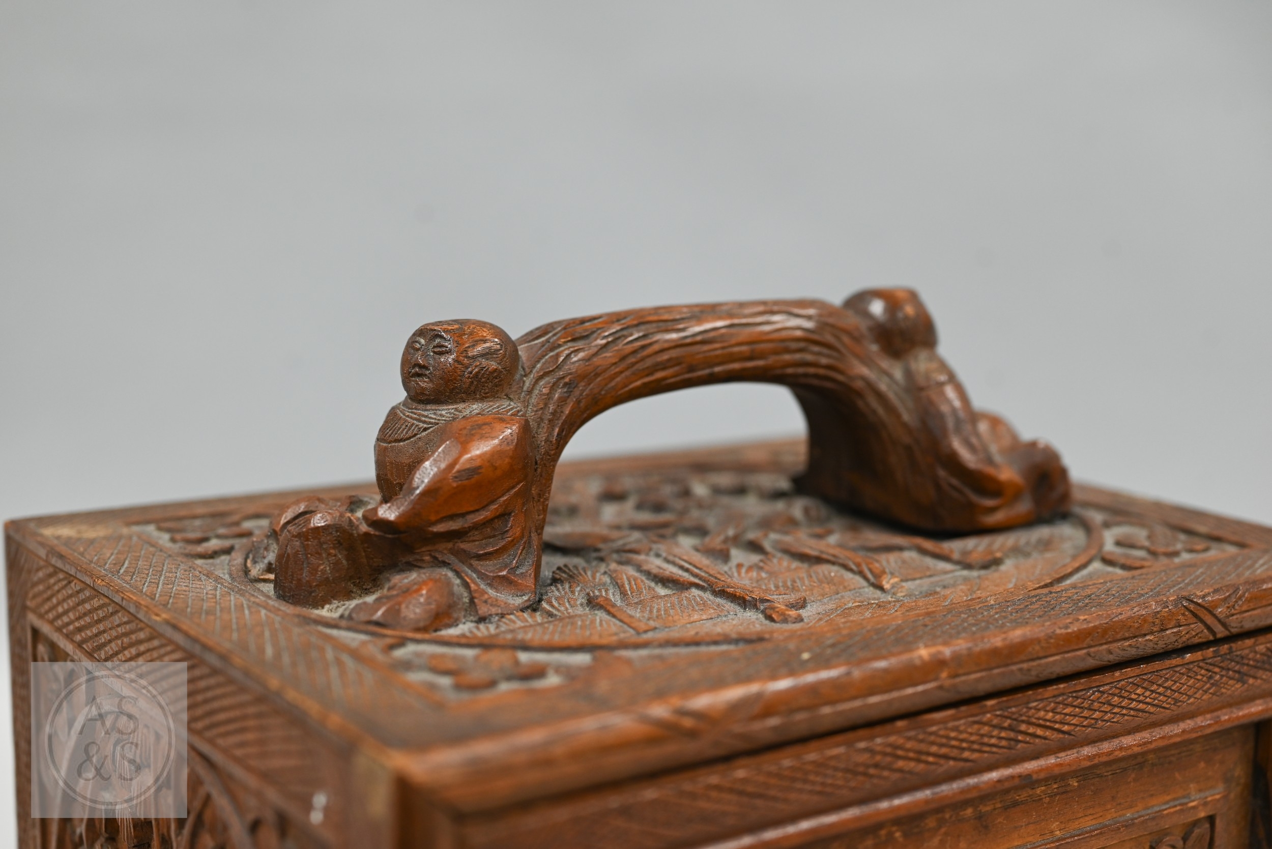An early-mid 20th century Chinese Mah Jong set, the wooden case decoratively carved with landscapes and figures mounted by a tree branch handle with two seated figures, the pop-out panelled front door opening to reveal five drawers containing bamboo and bone tiles (144 + 4 blanks) counting sticks/betting counters etc, box measures 24 cm w x 18 cm d x 24 cm h c/w instructions