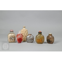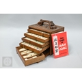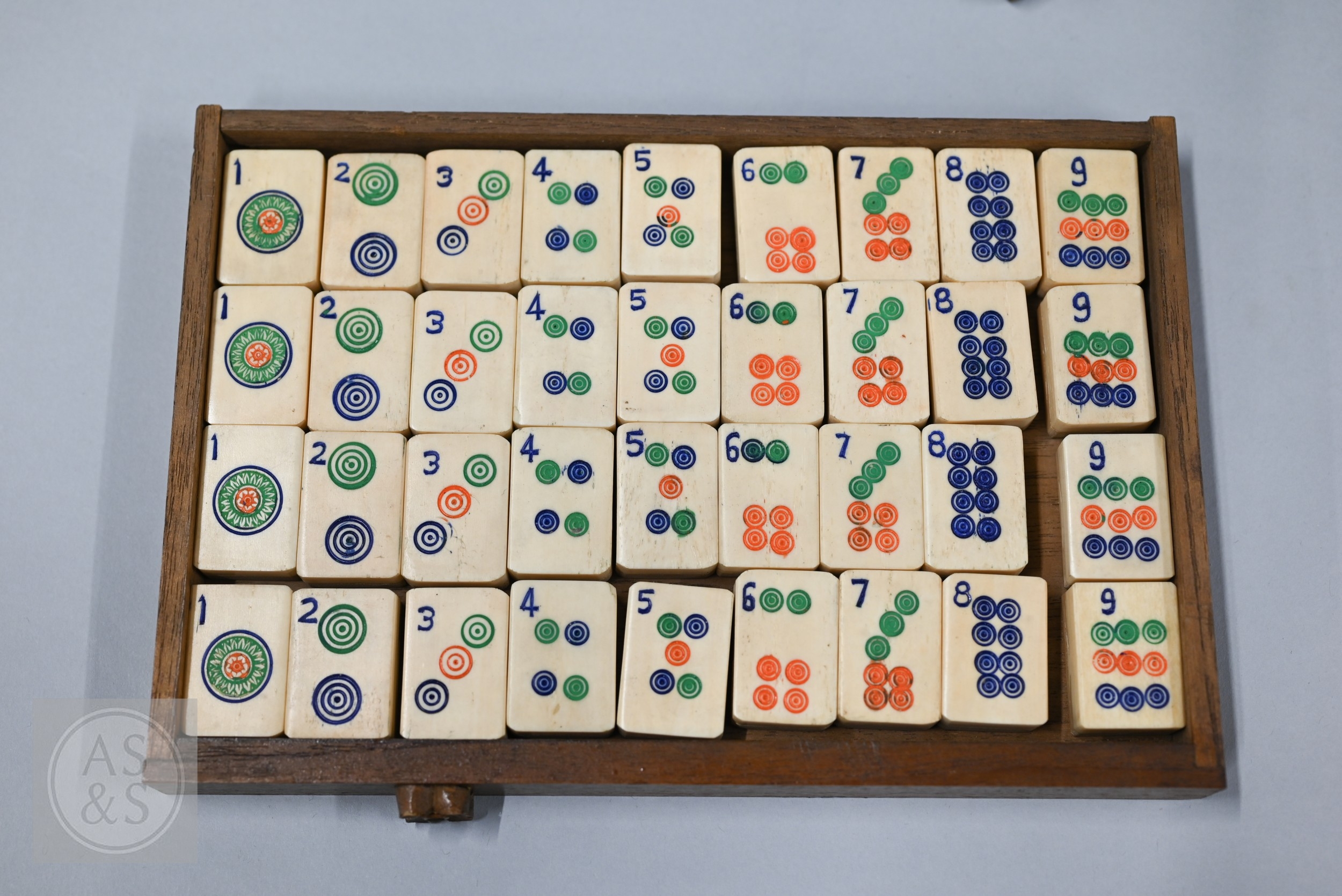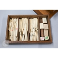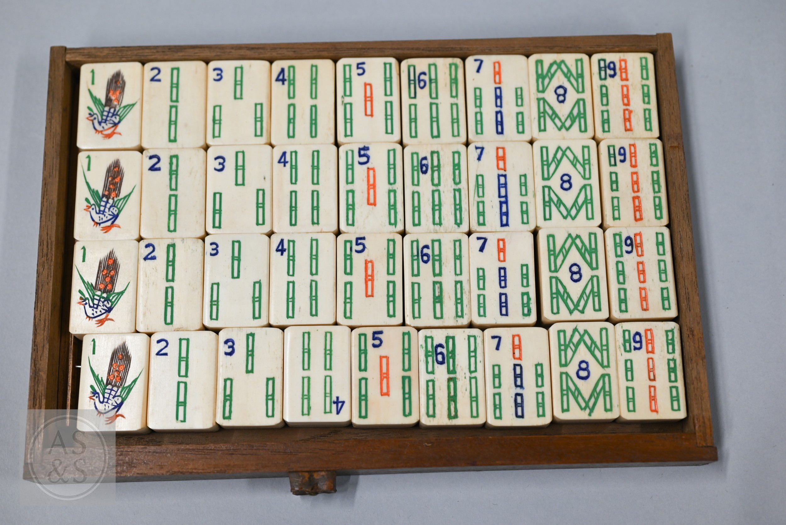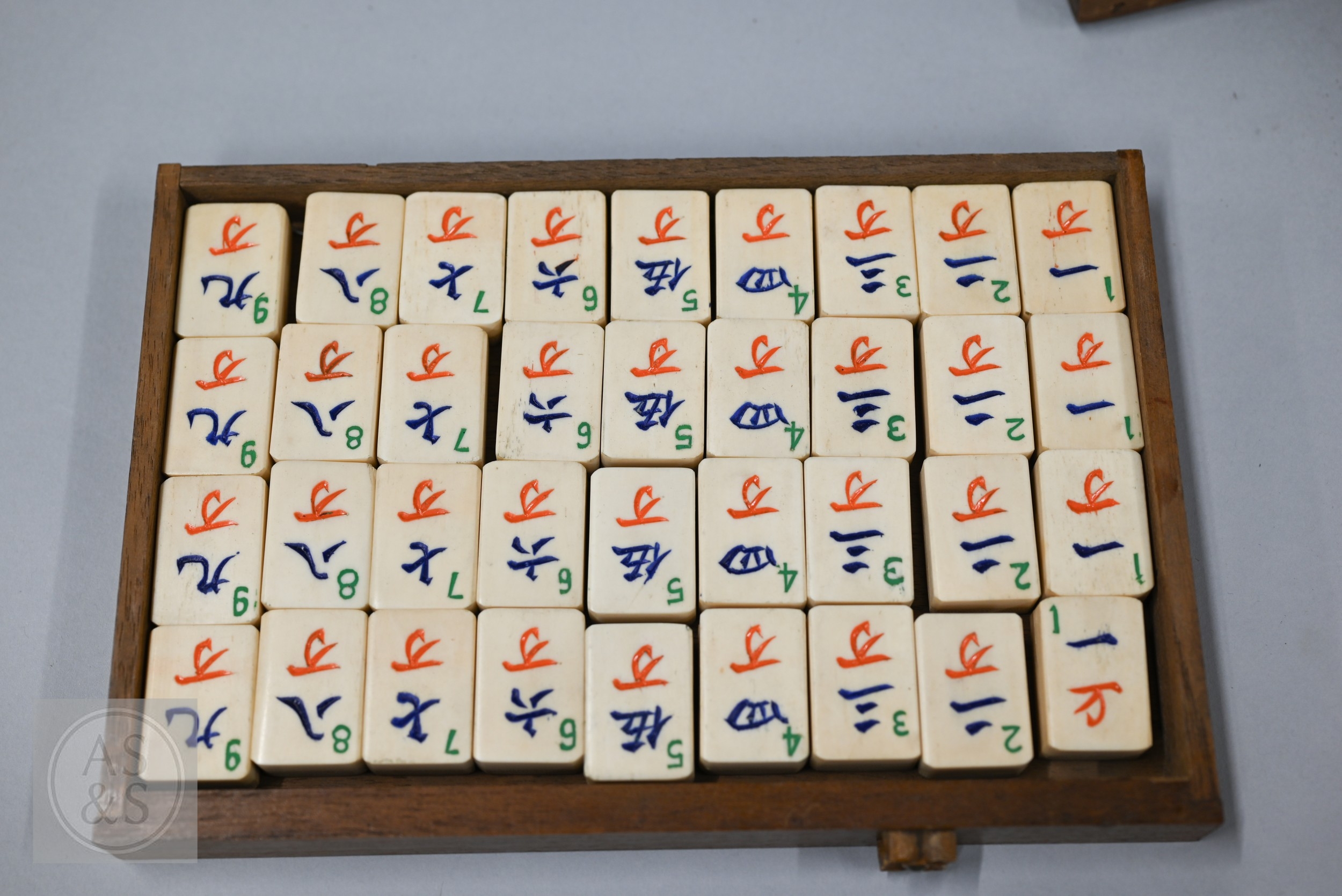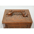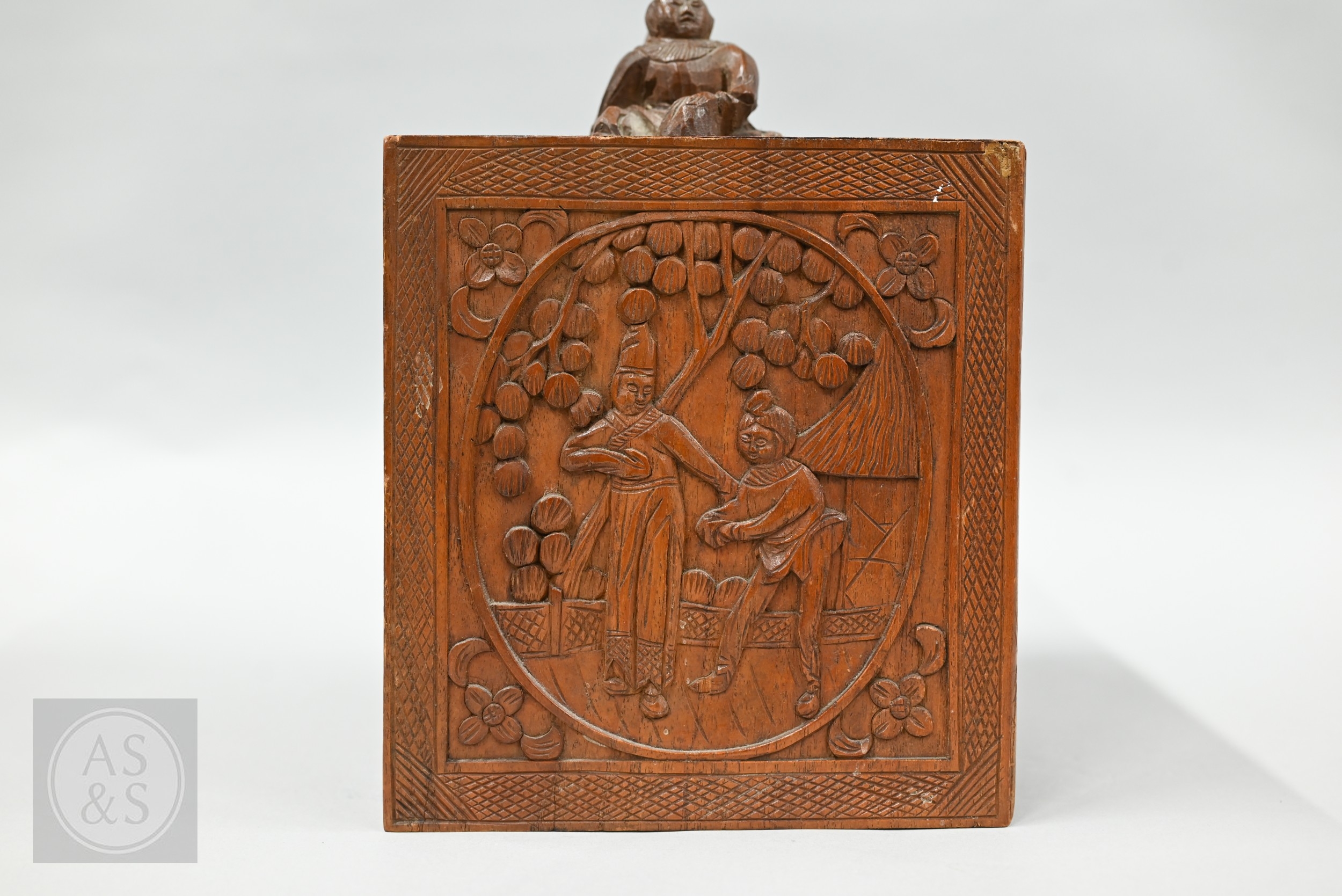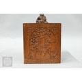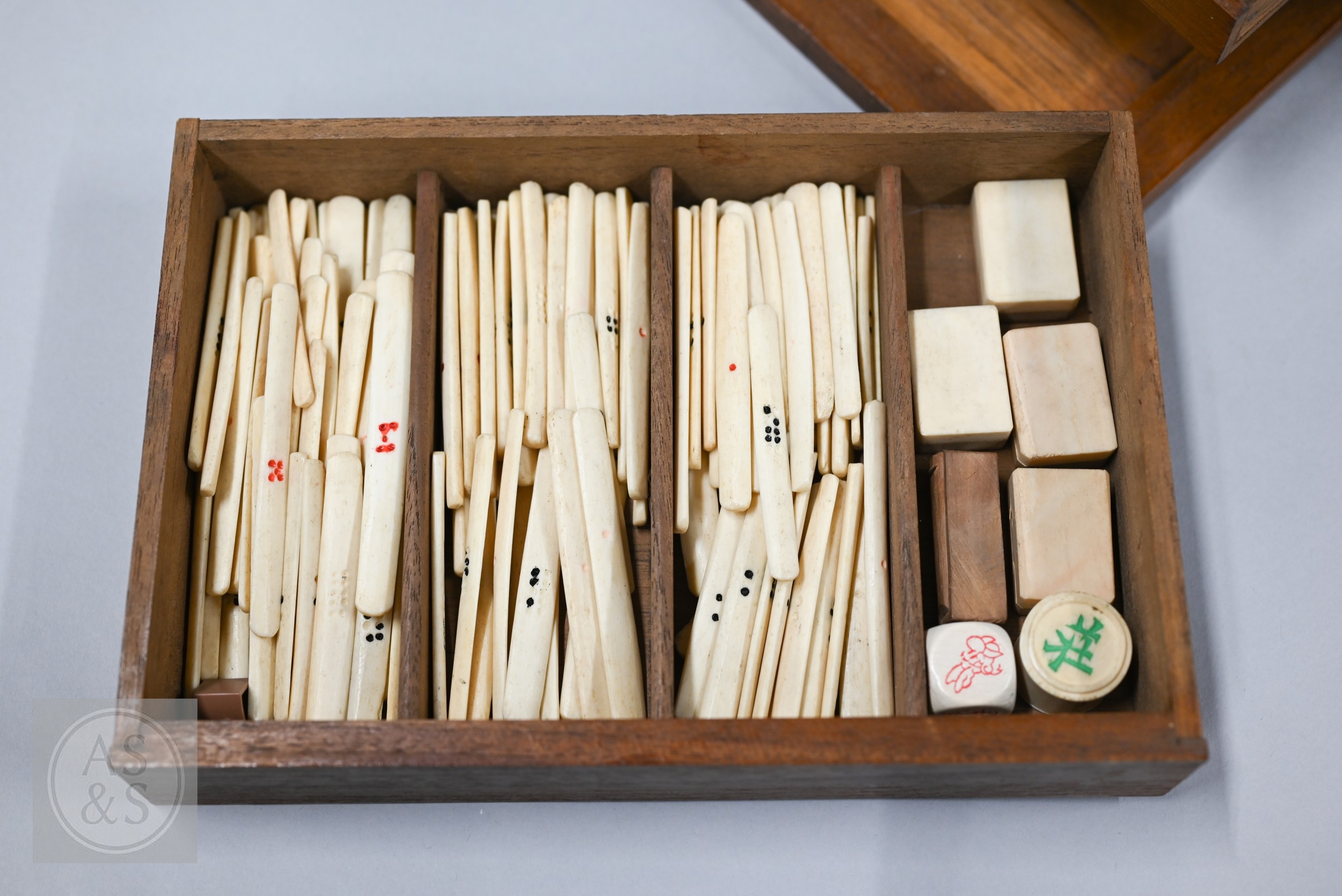 An early-mid 20th century Chinese Mah Jong set, the wooden case decoratively carved with landscapes and figures mounted by a tree branch handle with two seated figures, the pop-out panelled front door opening to reveal five drawers containing bamboo and bone tiles (144 + 4 blanks) counting sticks/betting counters etc, box measures 24 cm w x 18 cm d x 24 cm h c/w instructions