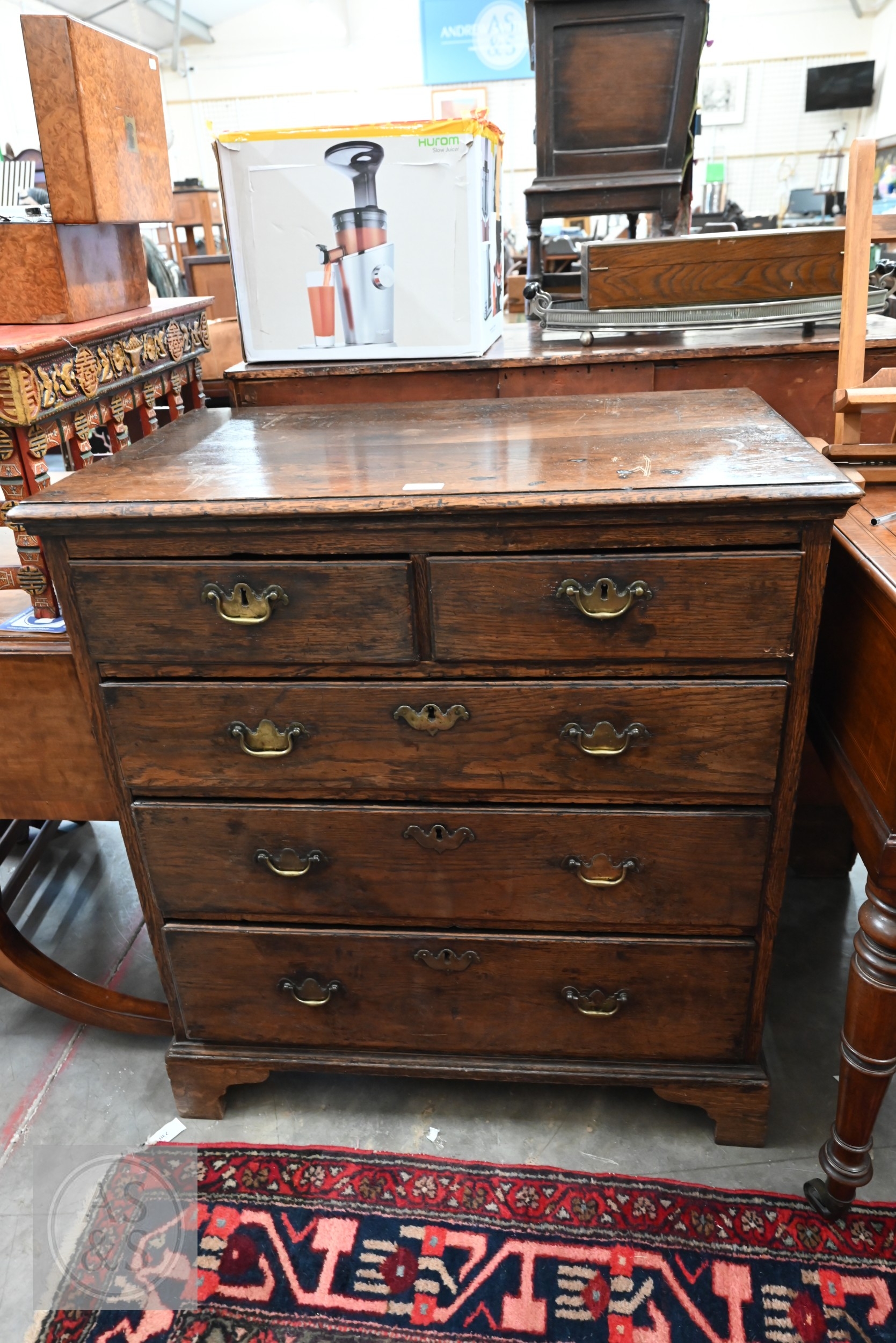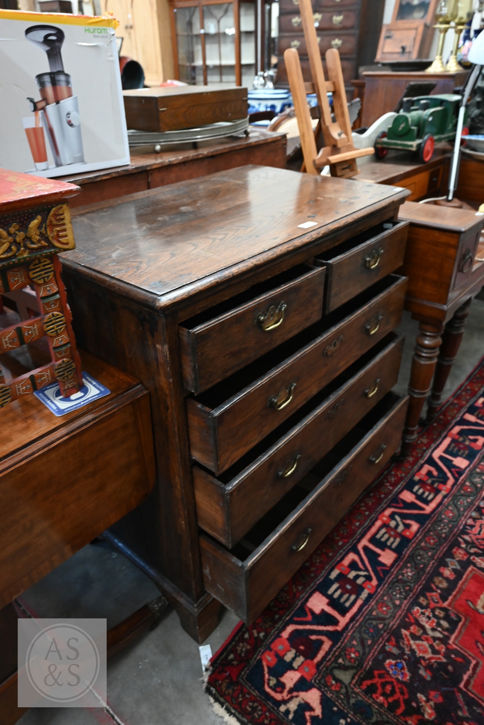 An antique and later elm chest of two short over three long drawers with brass handles standing on shaped bracket feet, 84 x 50 x 90 cm high