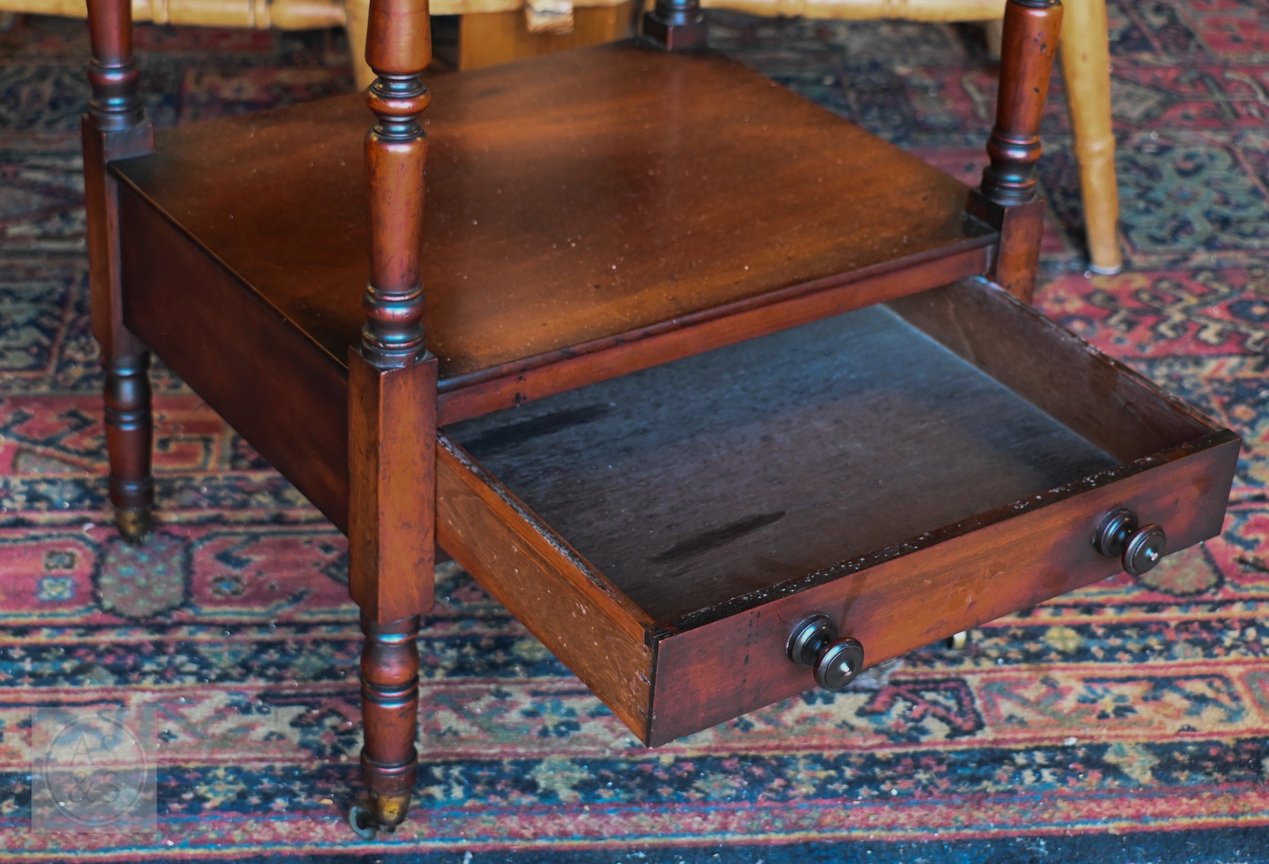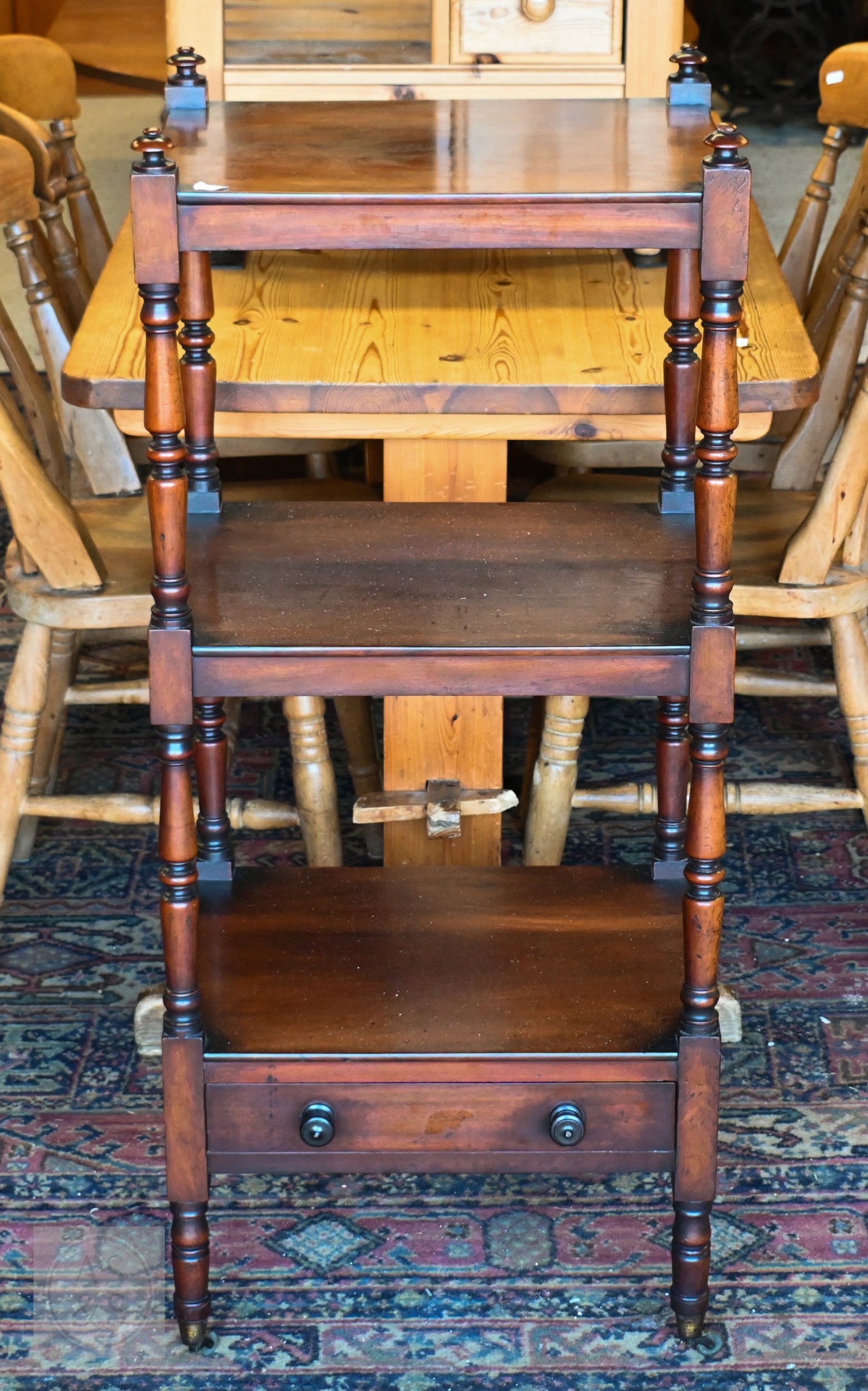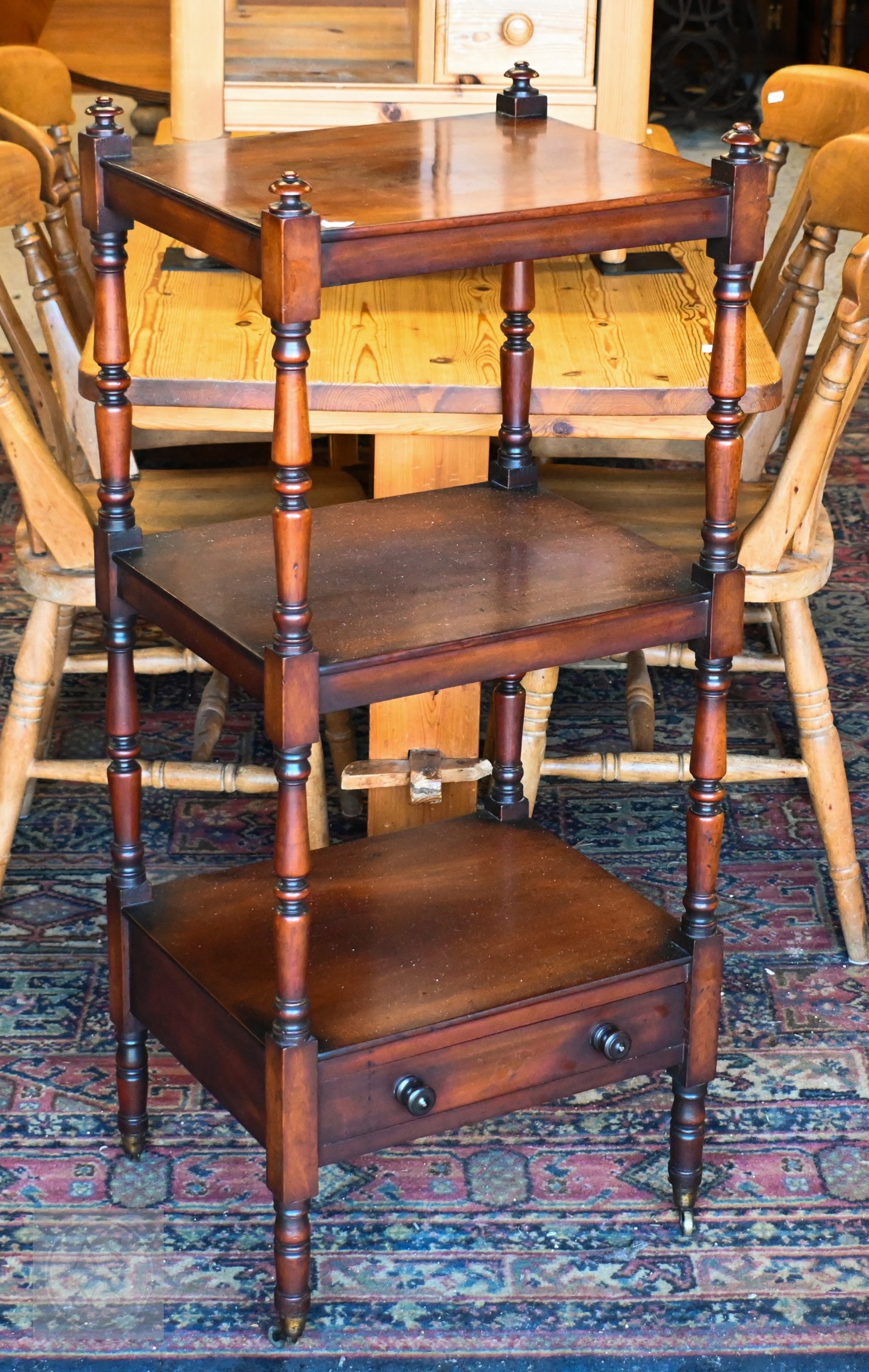 A Victorian mahogany three-tier stand with drawer to base, raised on brass castors, 44.5 cm x 37 cm x 103 cm h