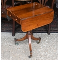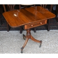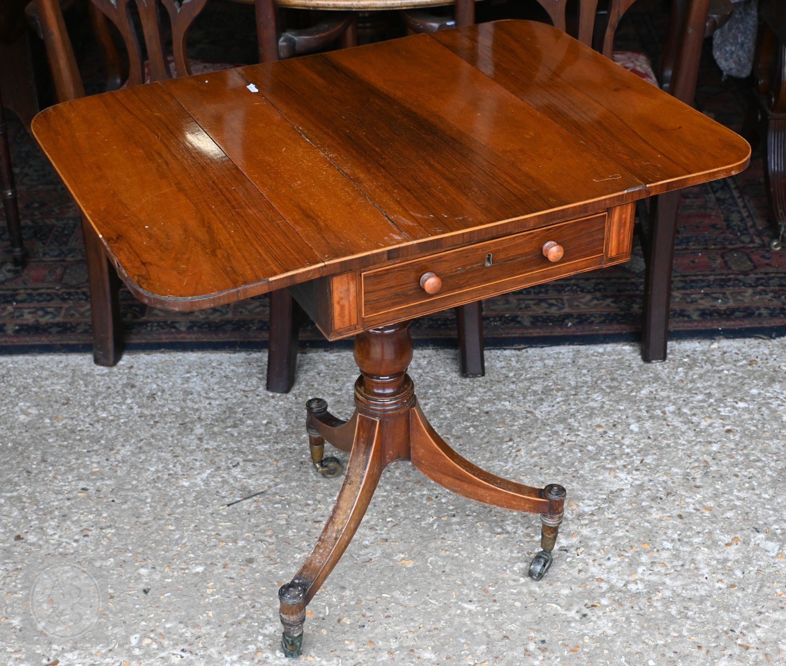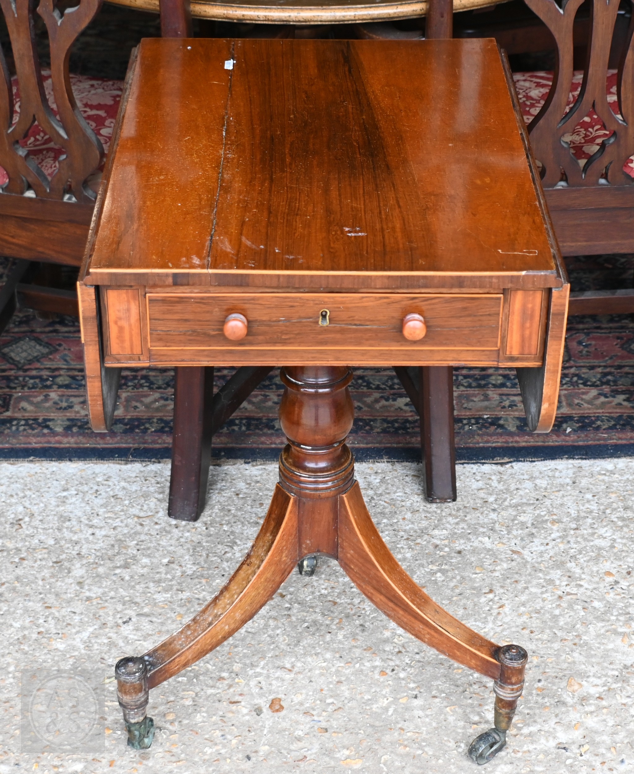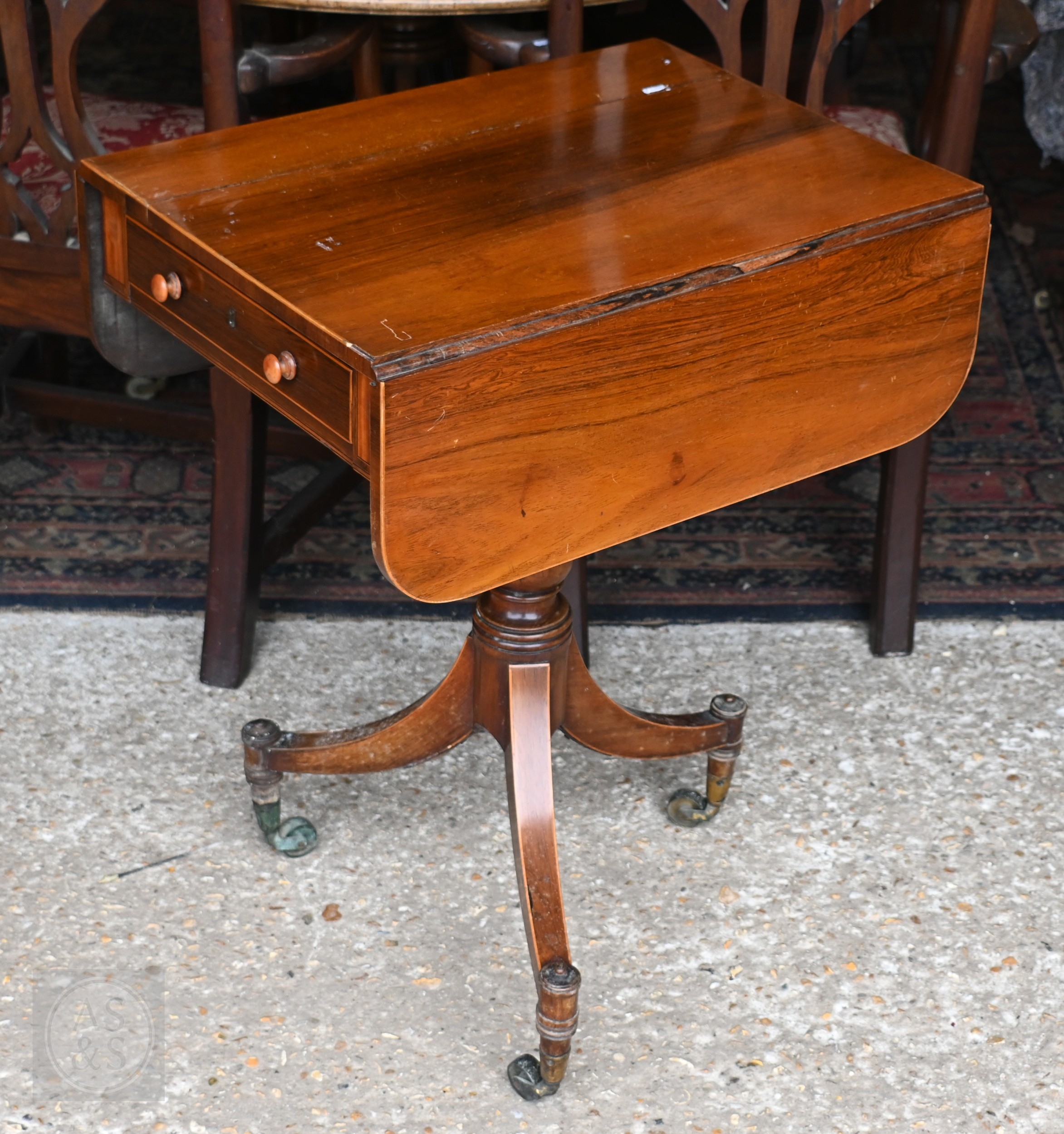 A Victorian rosewood drop leaf tripod table, with single frieze drawer raised on a baluster turned support to swept legs, on brass castors, 43 cm x 56 cm x 74 cm h