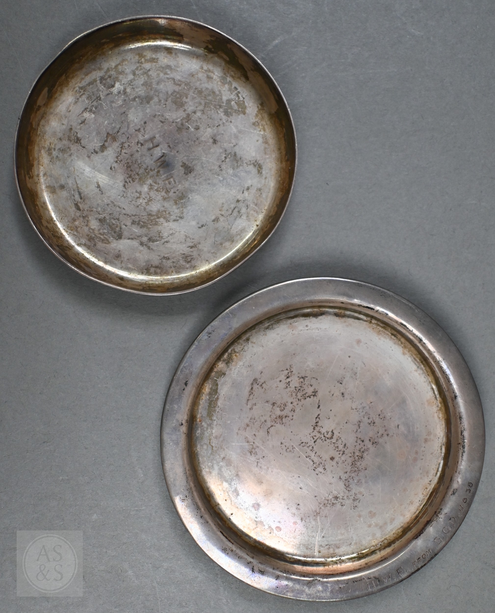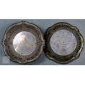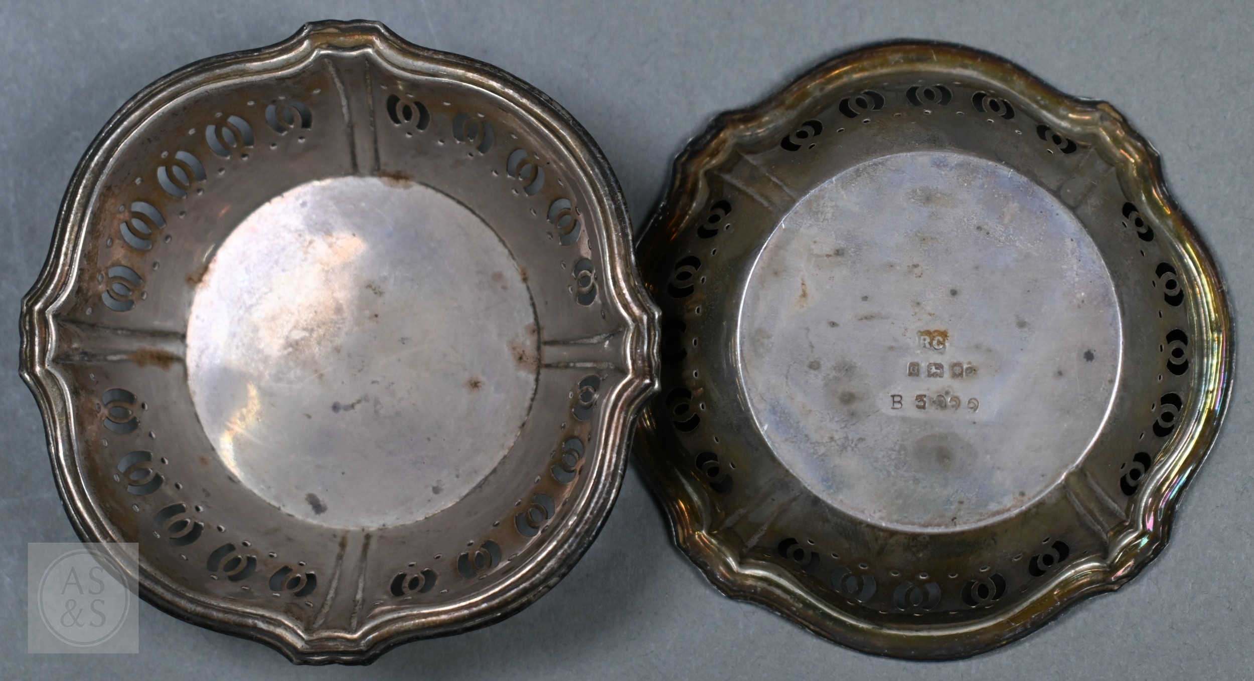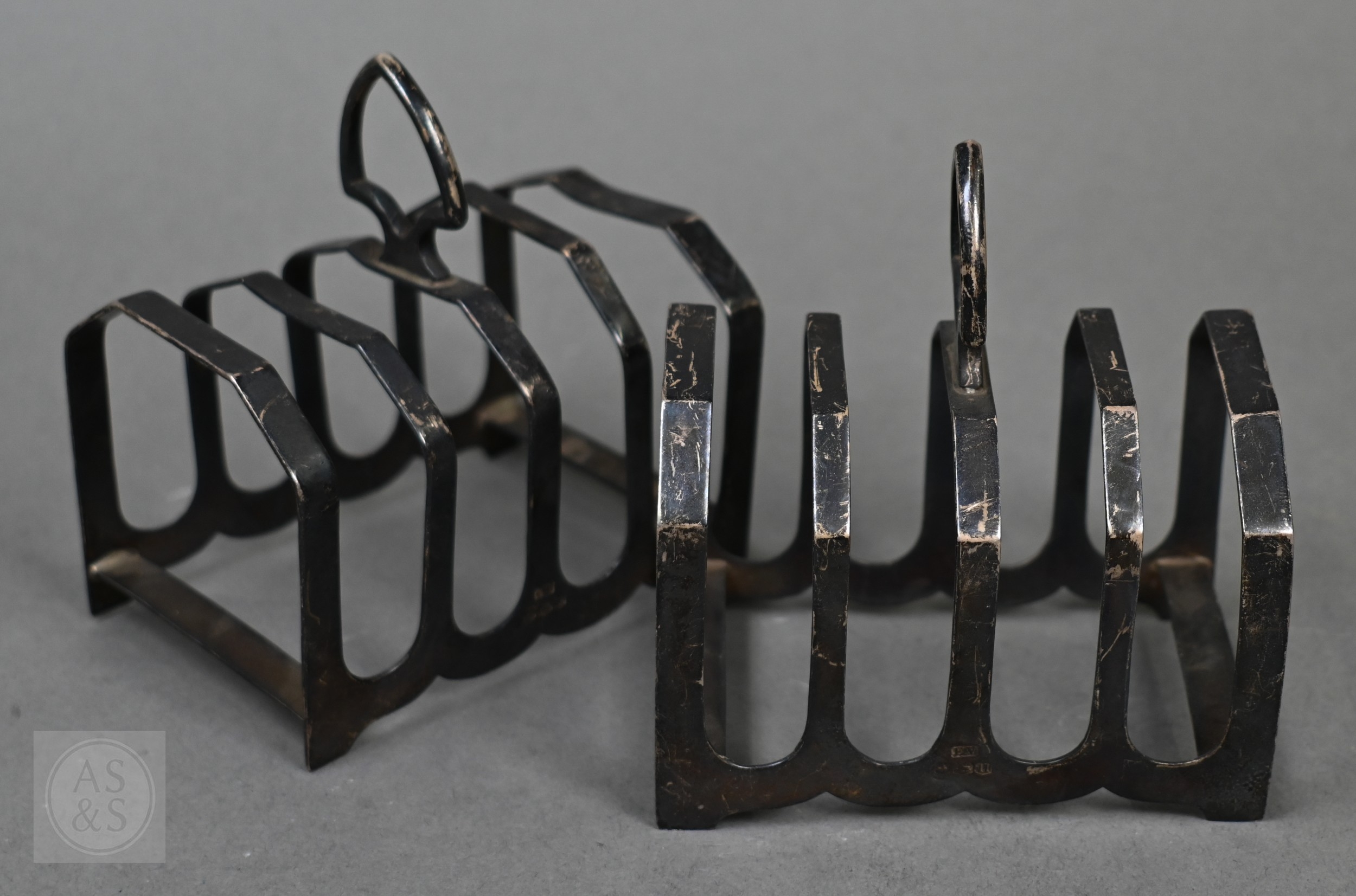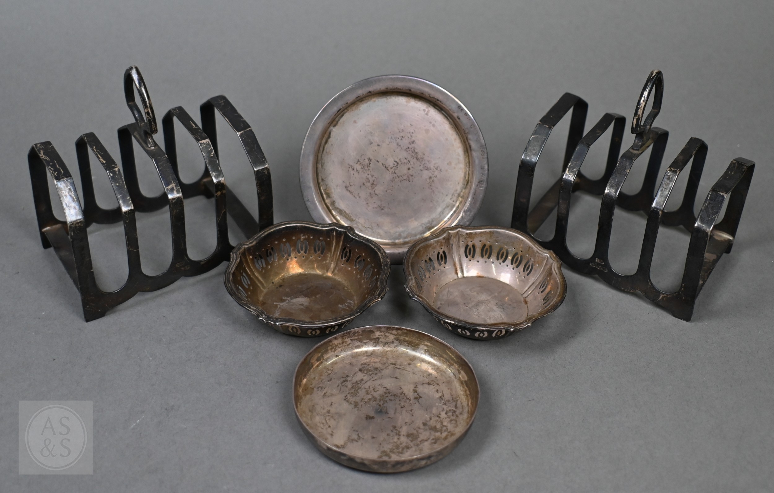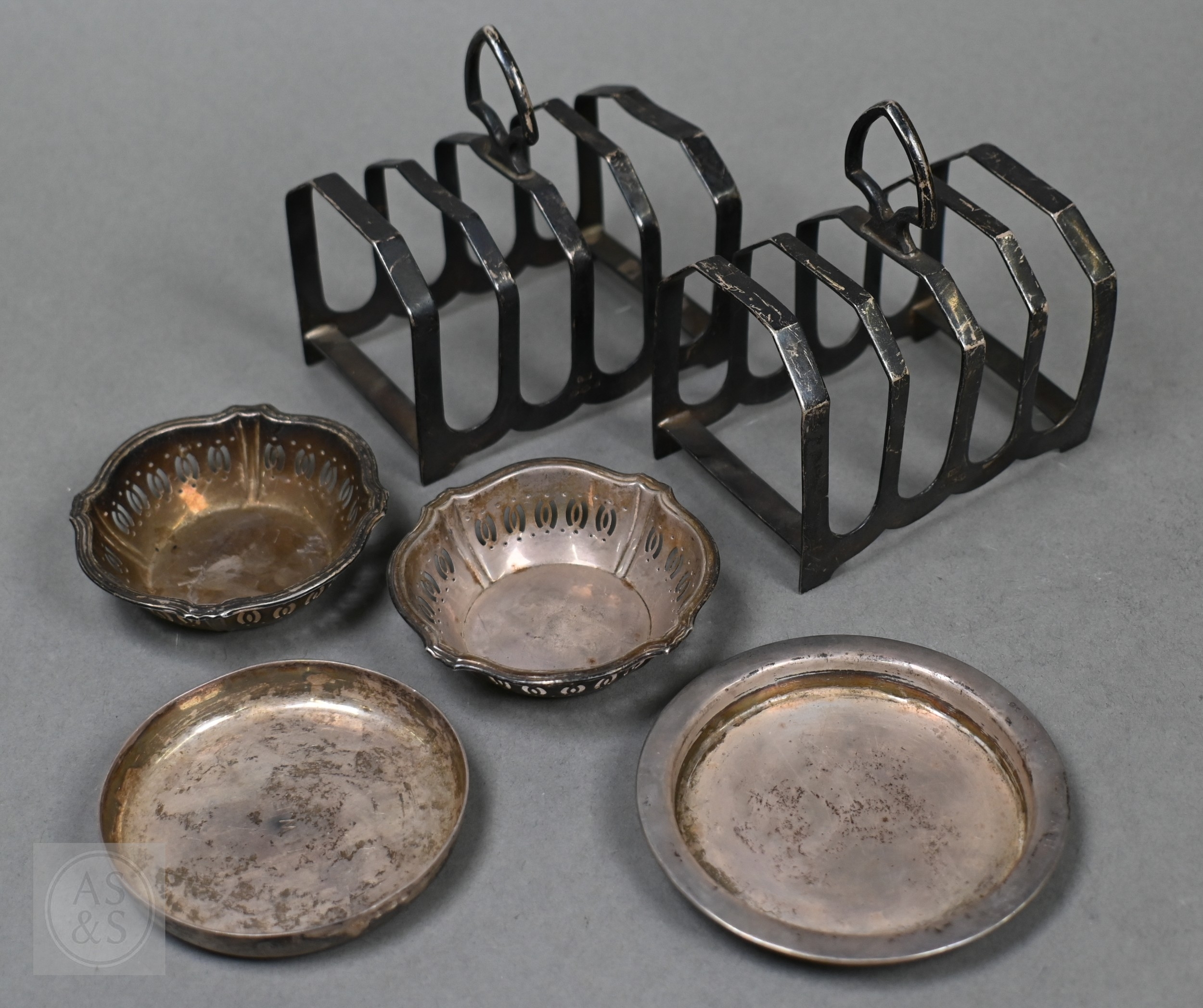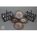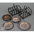 A pair of silver toast racks, Viners, Sheffield 1934, to/w four small silver dishes (6), 10.9oz