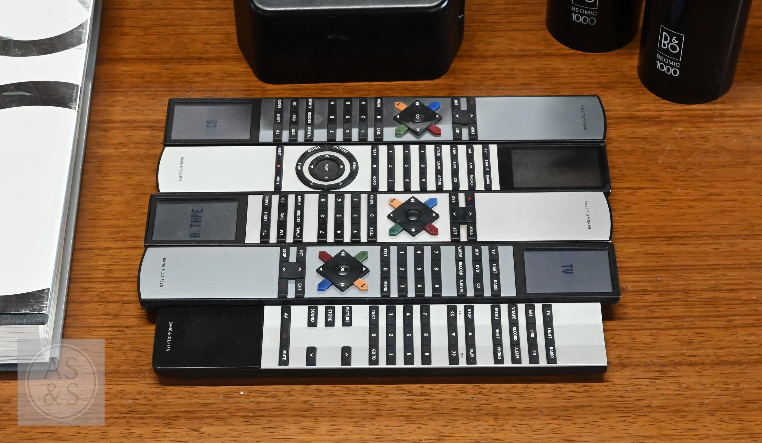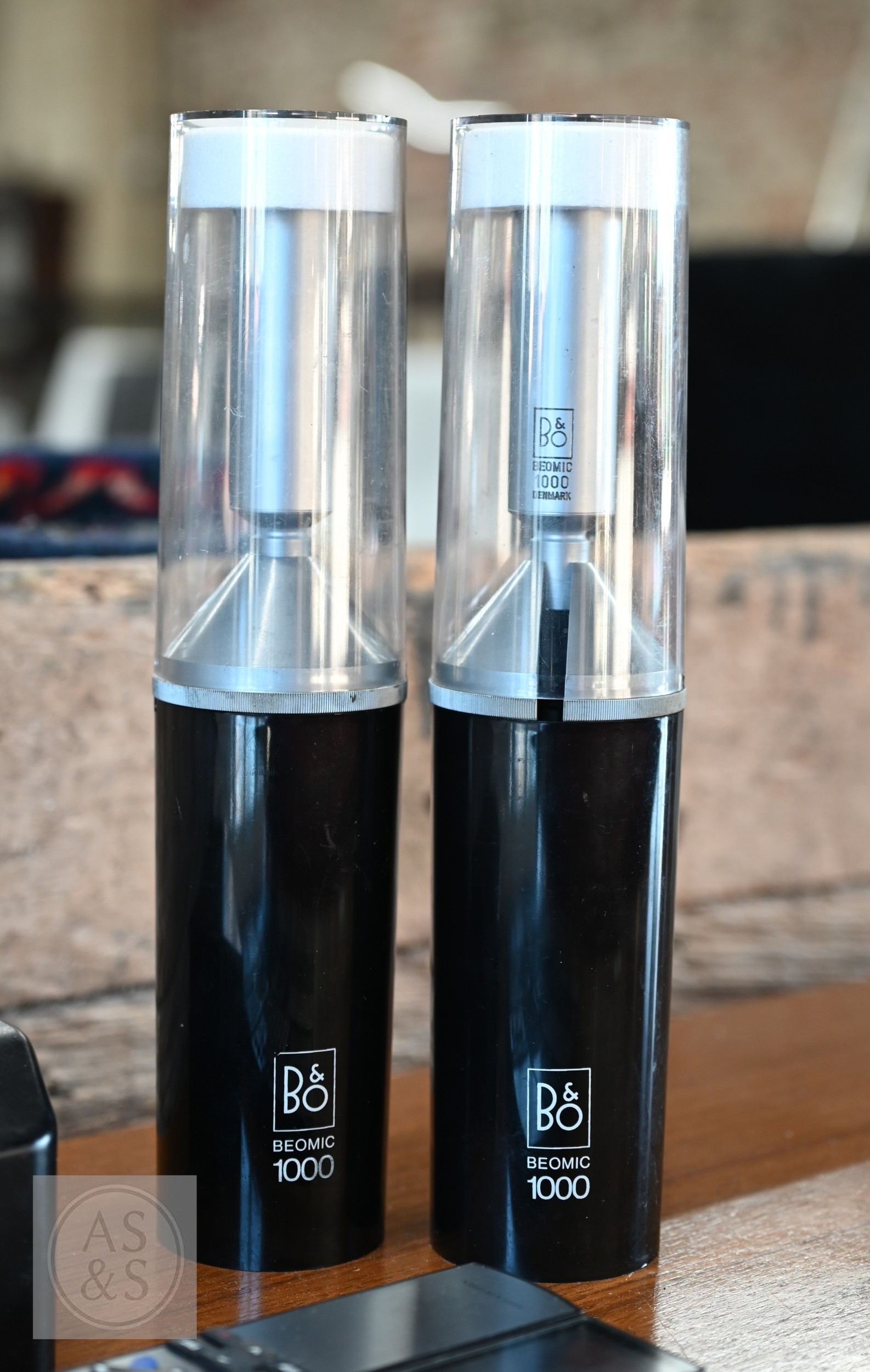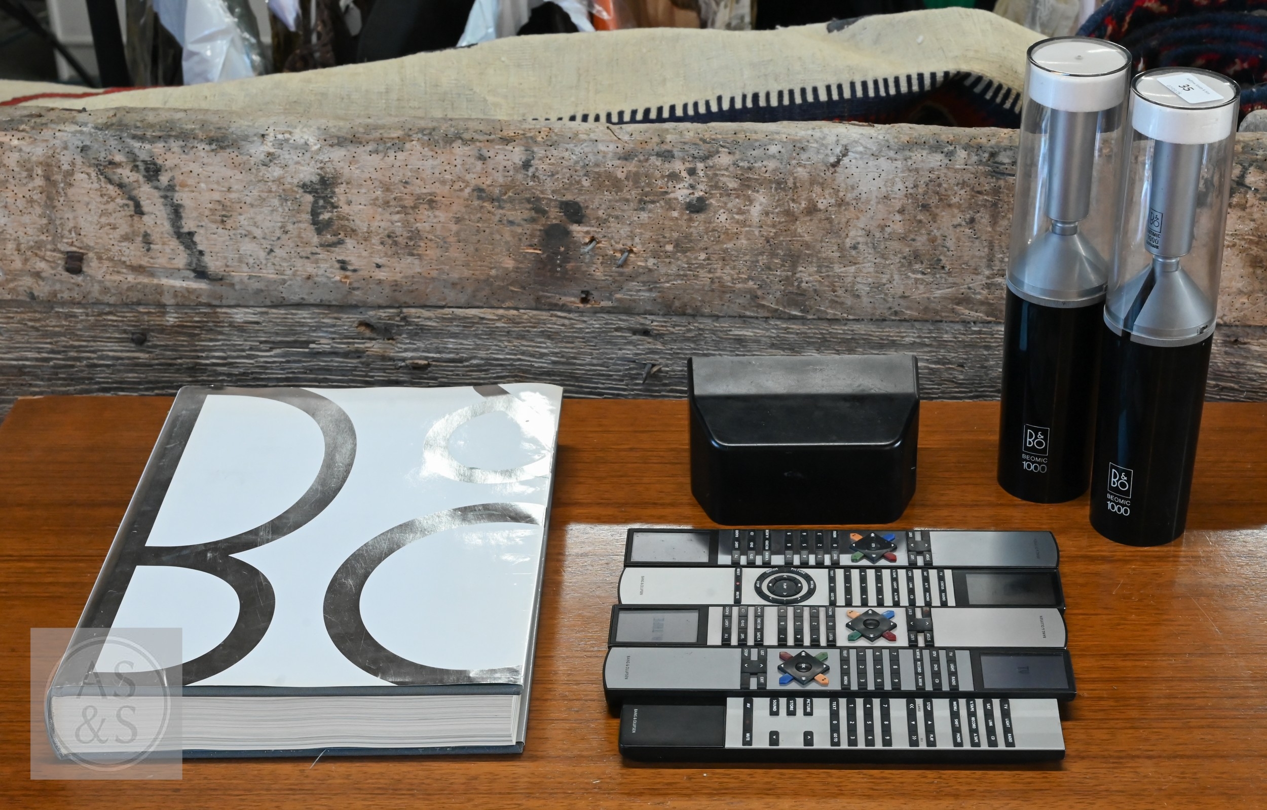 Two Bang & Olufsen Beomic 1000 microphones, in cases with styrene collar to/with a Bang & Olufsen RF Link Amplifier, two Bang & Olufsen wall brackets, assorted Bang & Olufsen remote controls etc