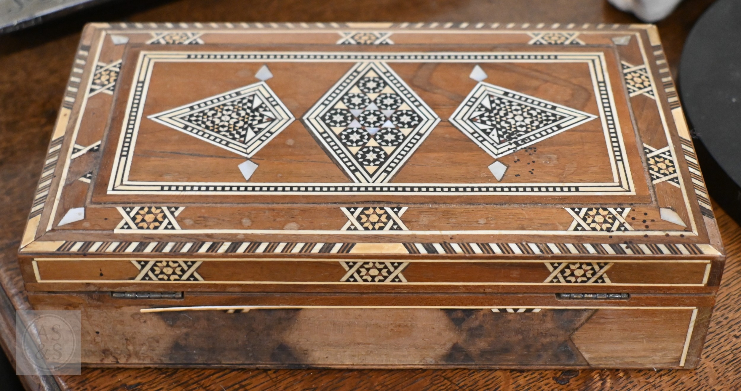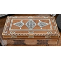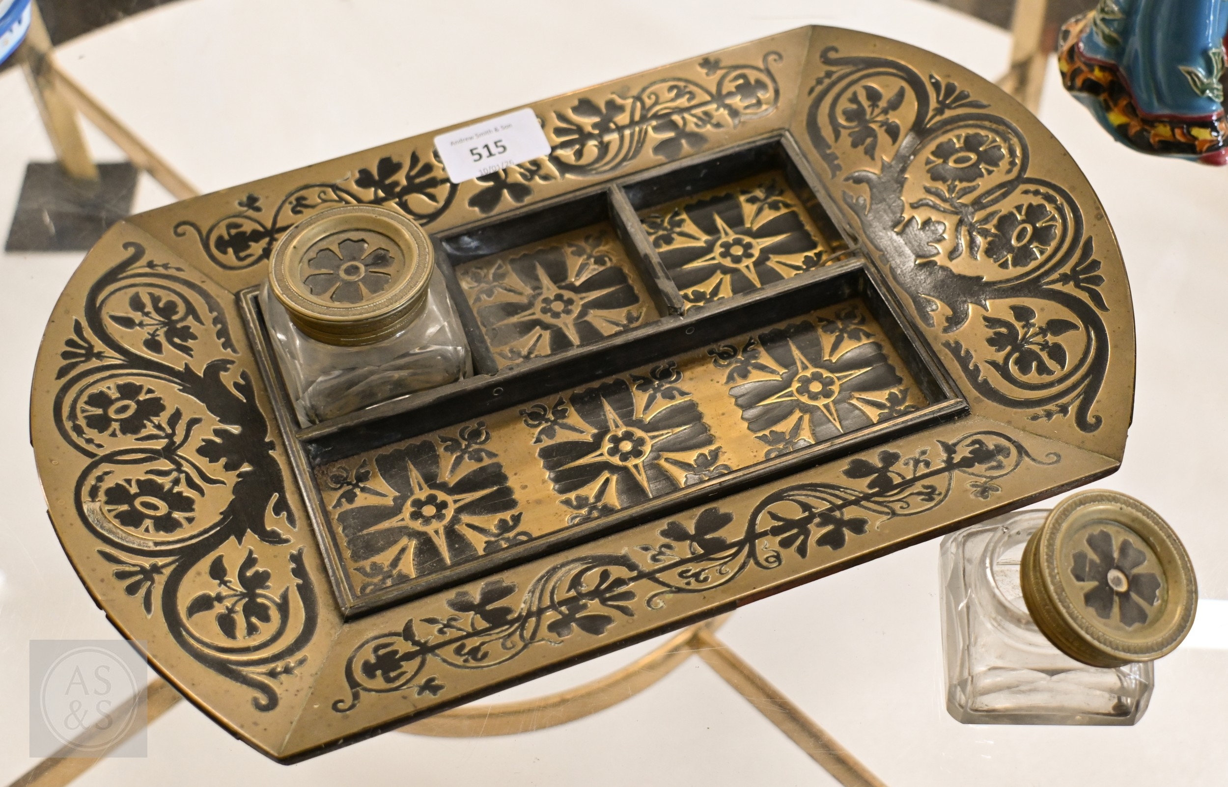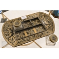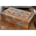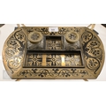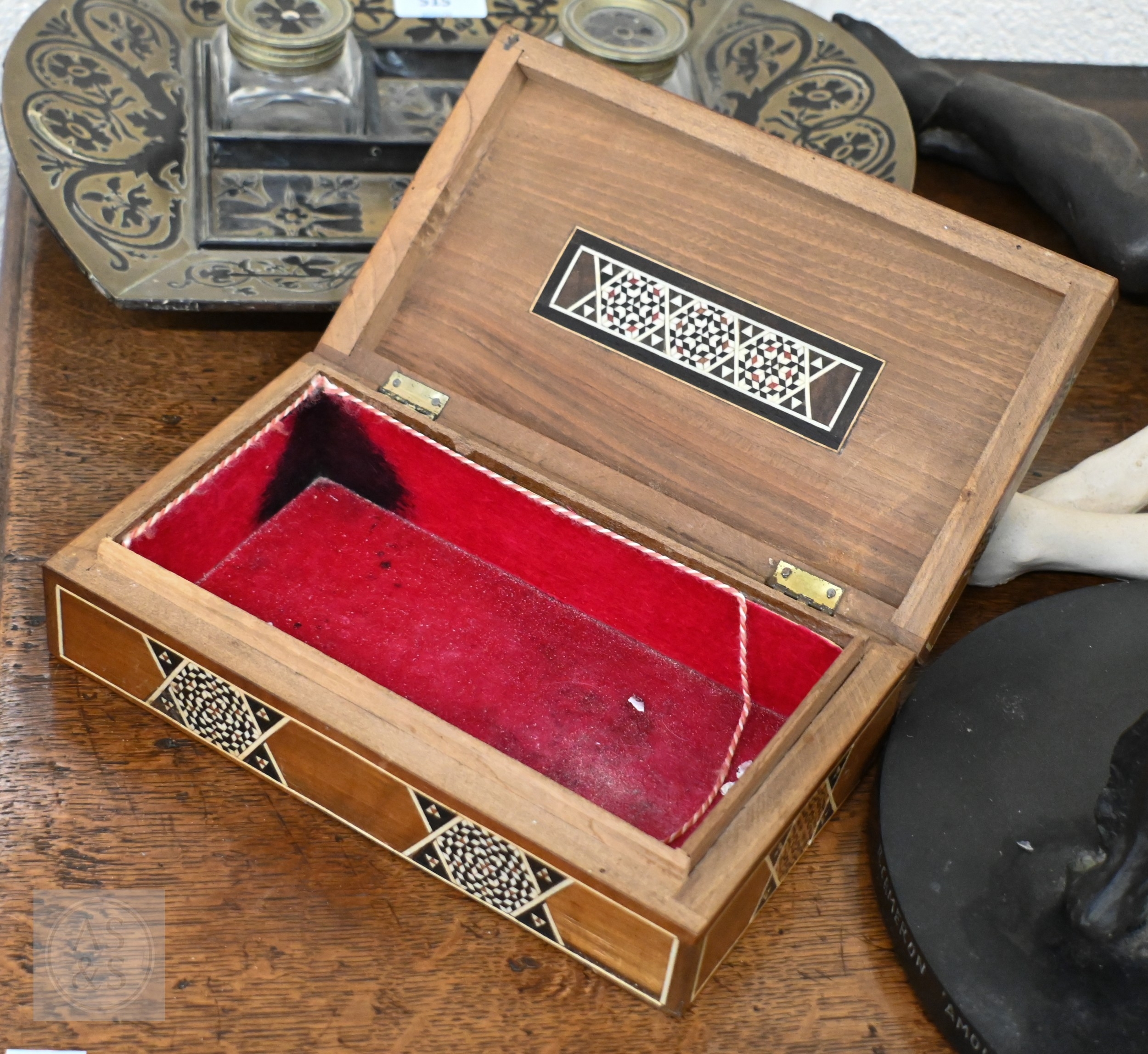 A 19th century Continental contre-boulle type inkstand (inlays are wood veneers, not tortoiseshell), c/w two glass inkwells, 35.5 cm wide, to/w an inlaid box (2)