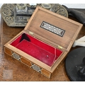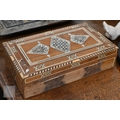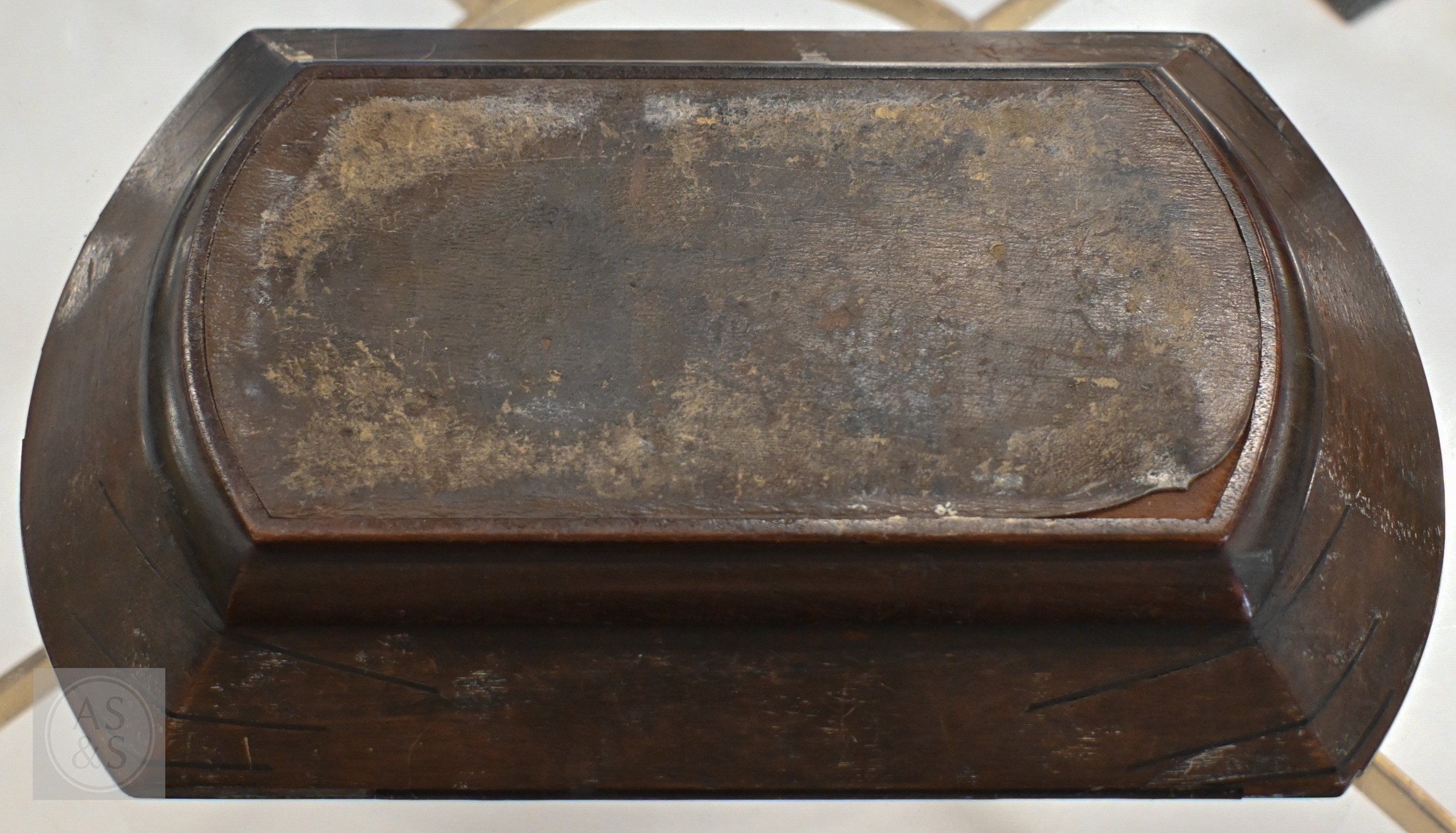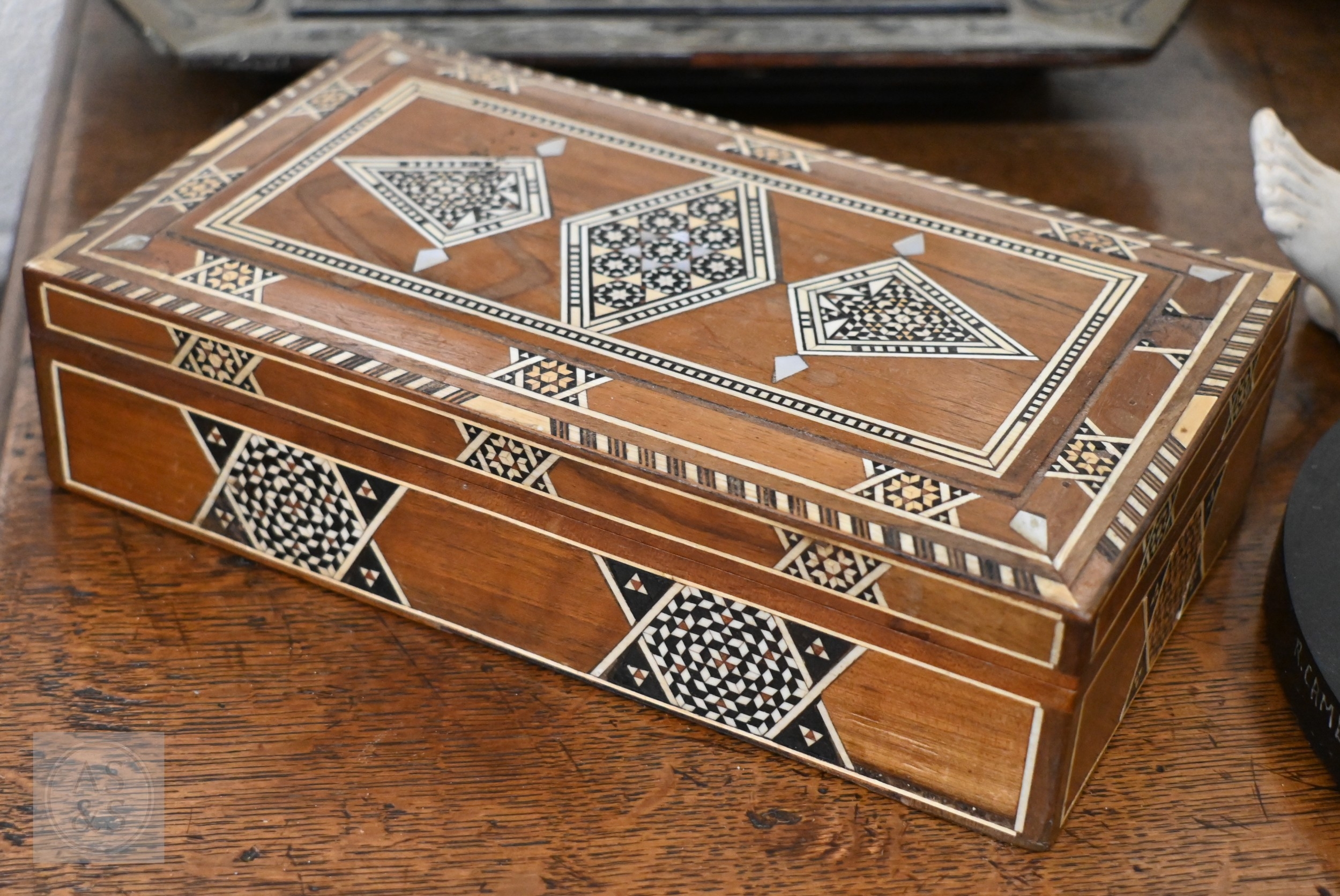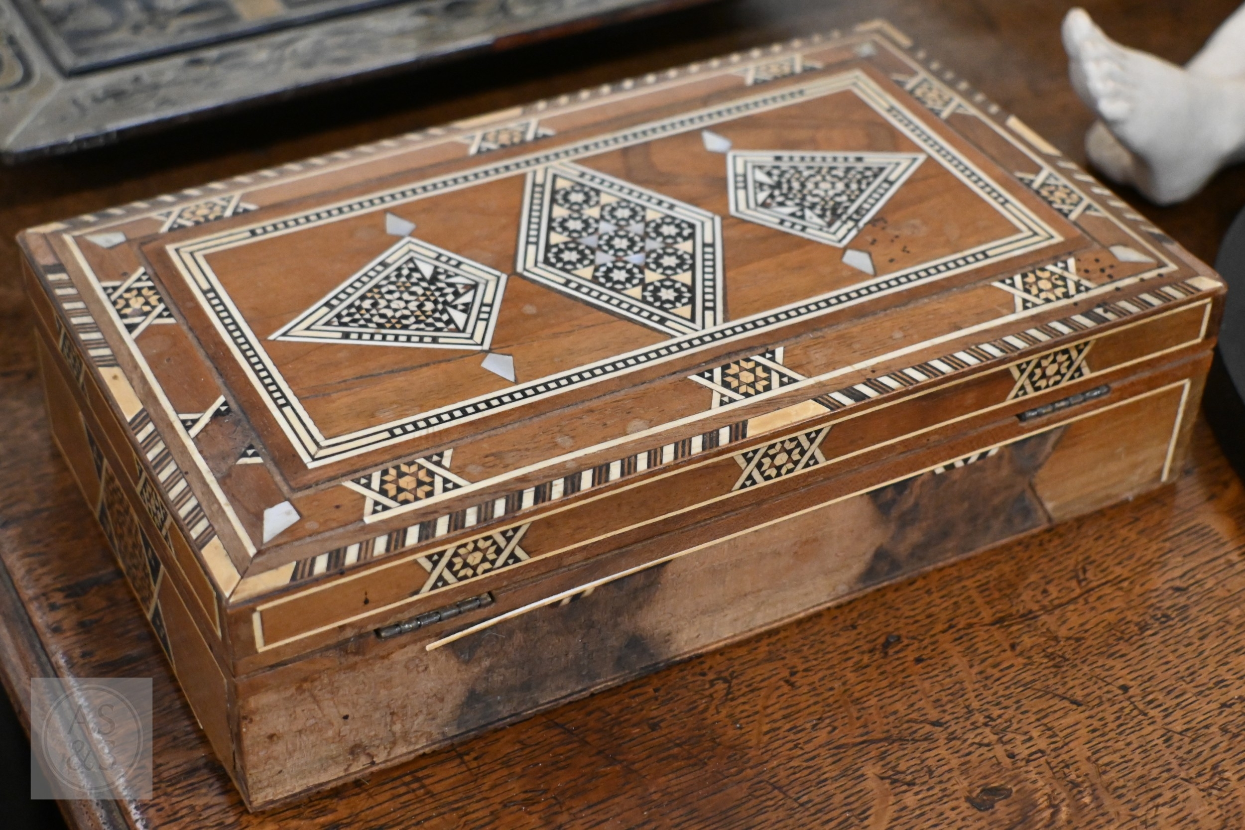 A 19th century Continental contre-boulle type inkstand (inlays are wood veneers, not tortoiseshell), c/w two glass inkwells, 35.5 cm wide, to/w an inlaid box (2)