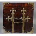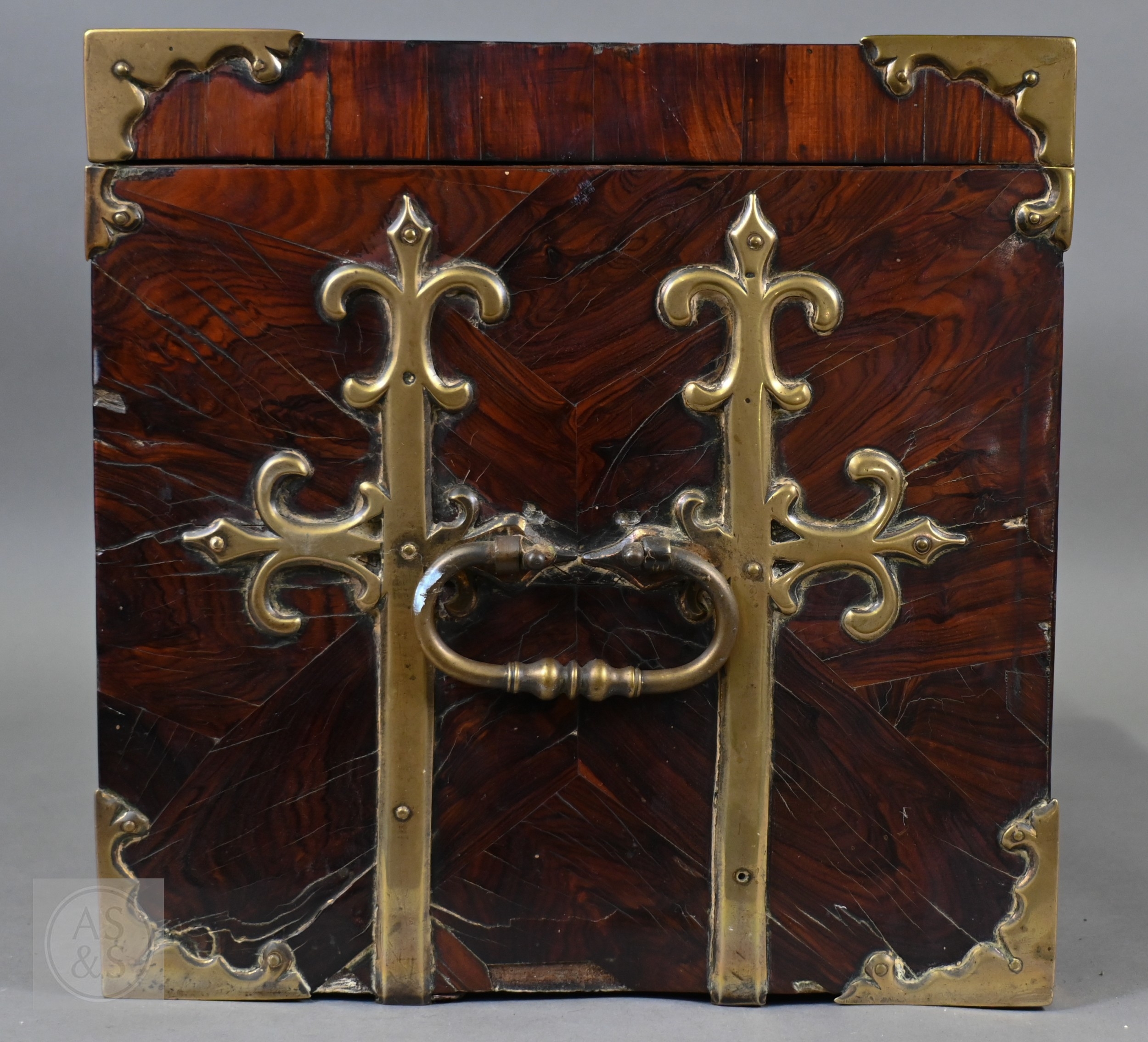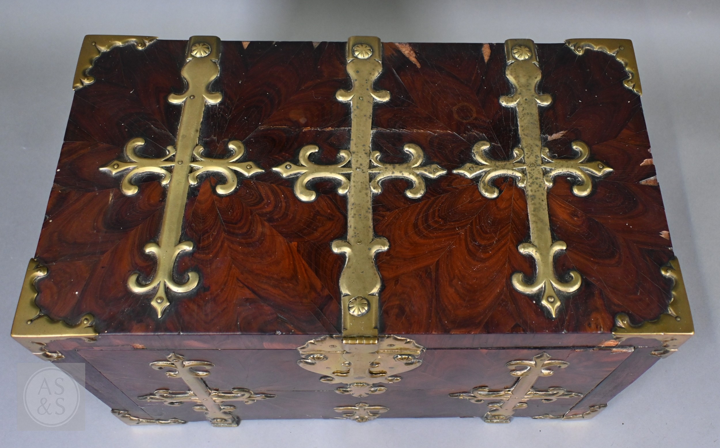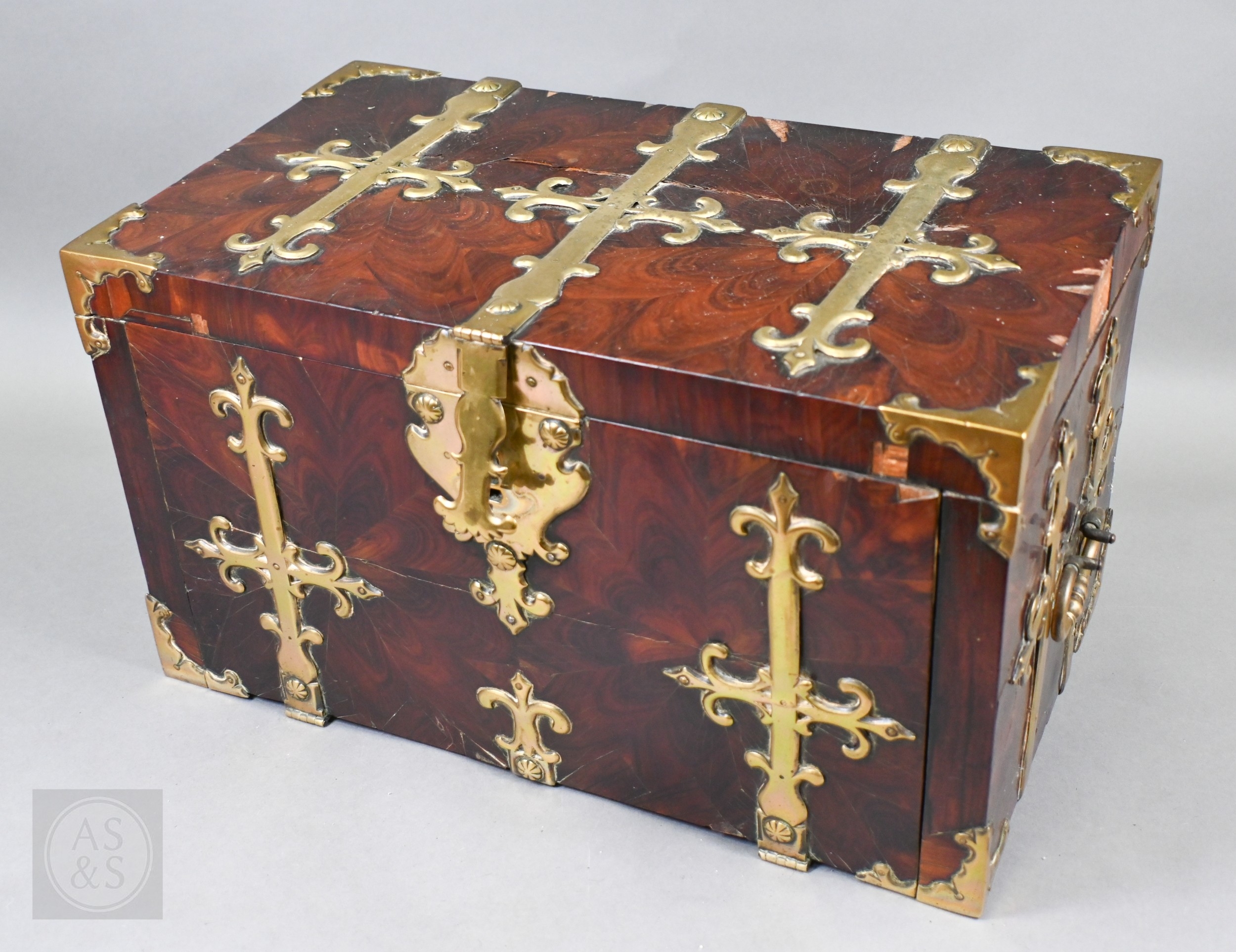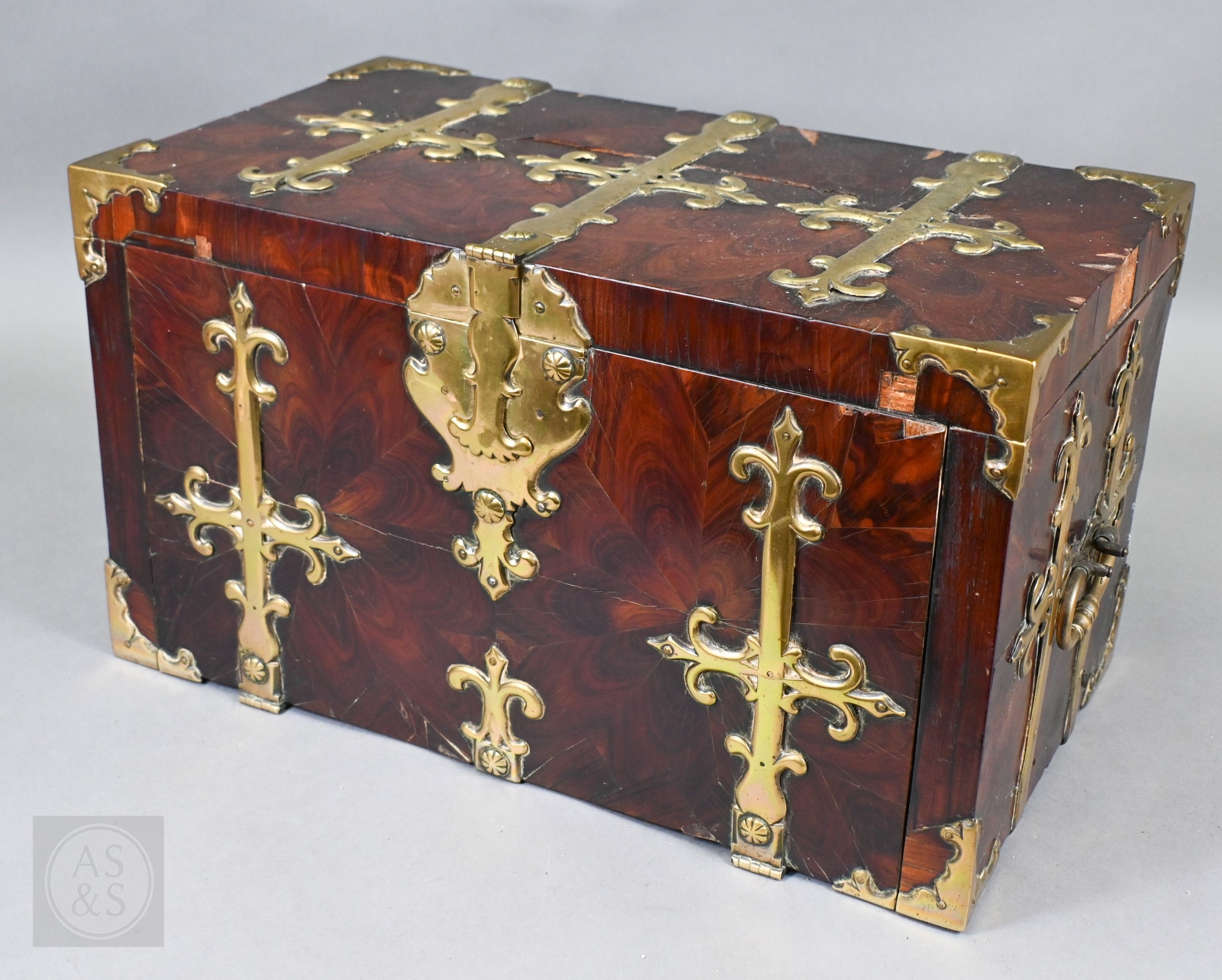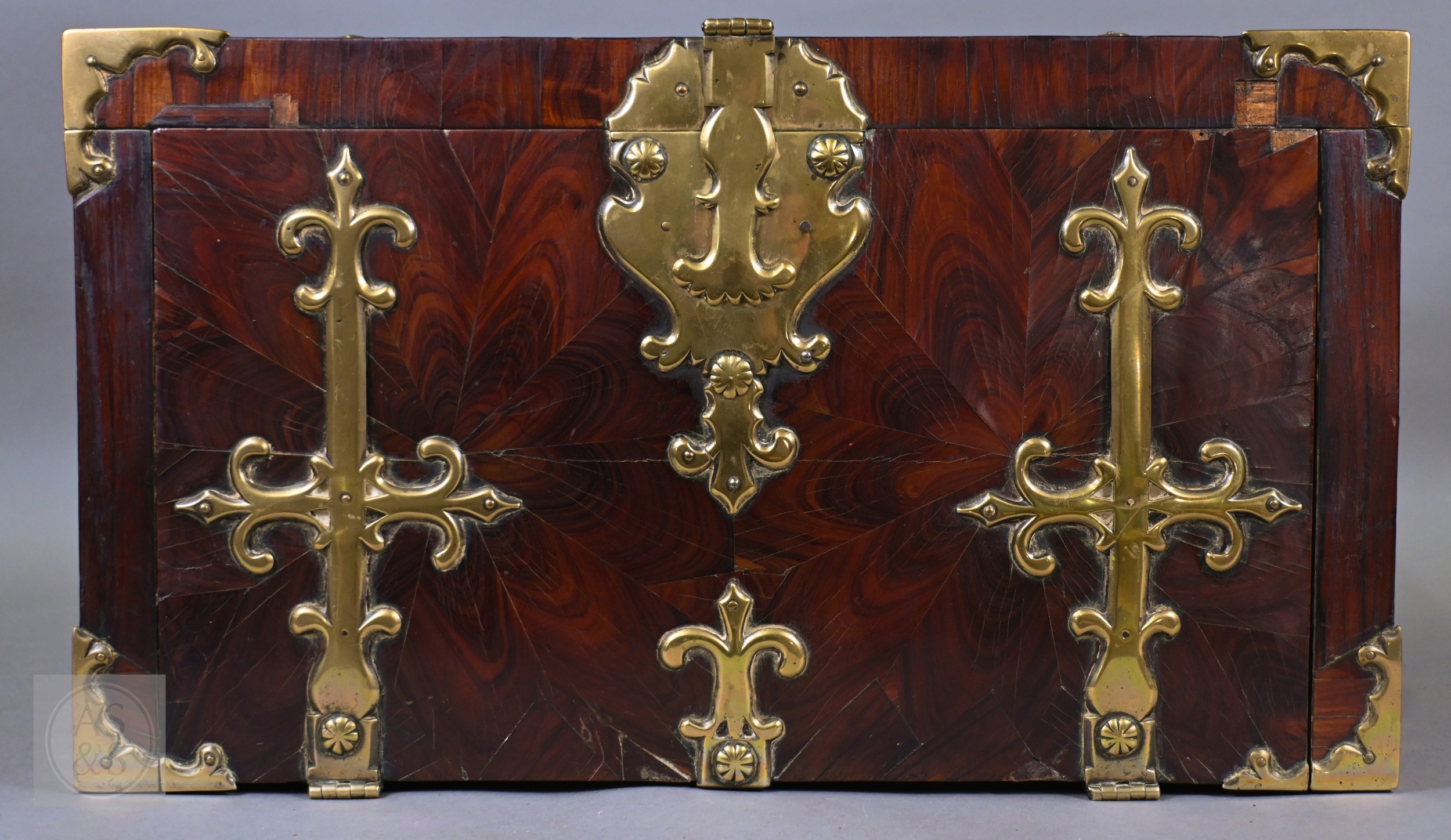 An early 17th century continental brass bound oyster veneered coffer fort, the elaborate brass fittings with radiating veneers, the hinged top with brass lock and staple enclosing a storage well and panel to underside, the fall front revealing two drawers, brass carrying handles to the sides, 54 cm x 31 cm x 30 cm h