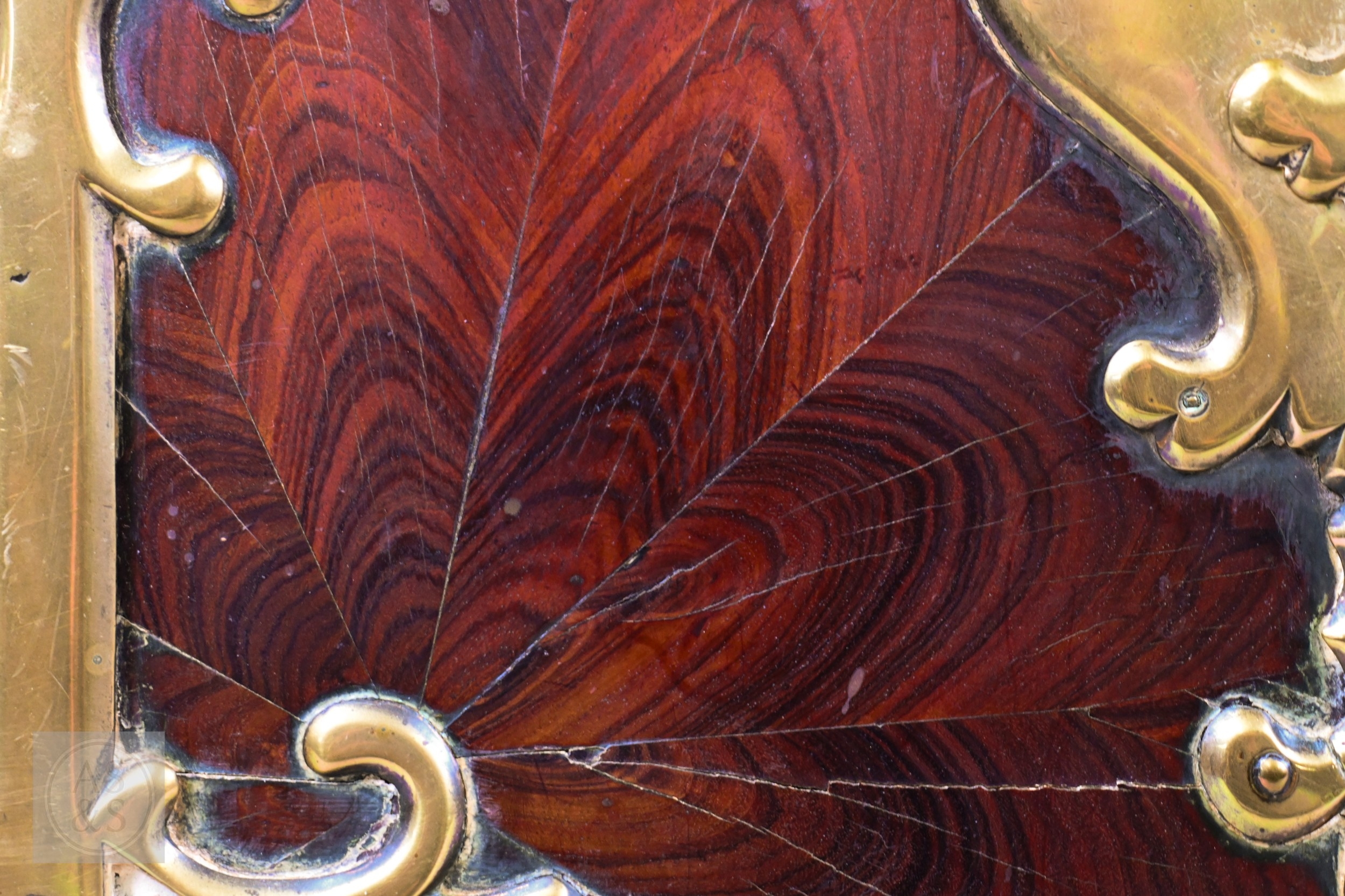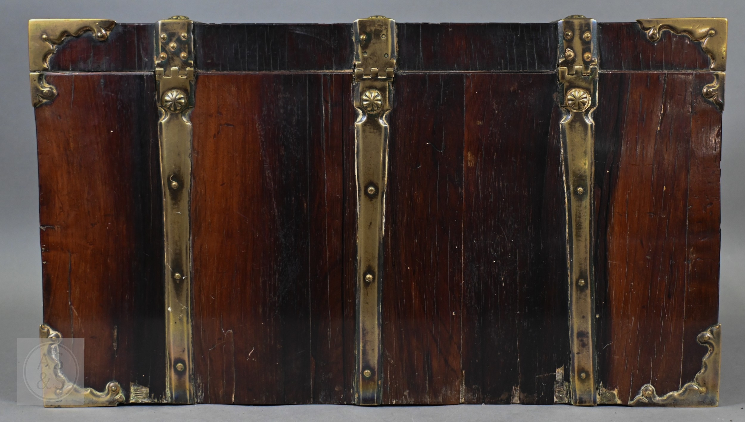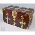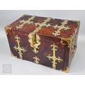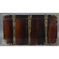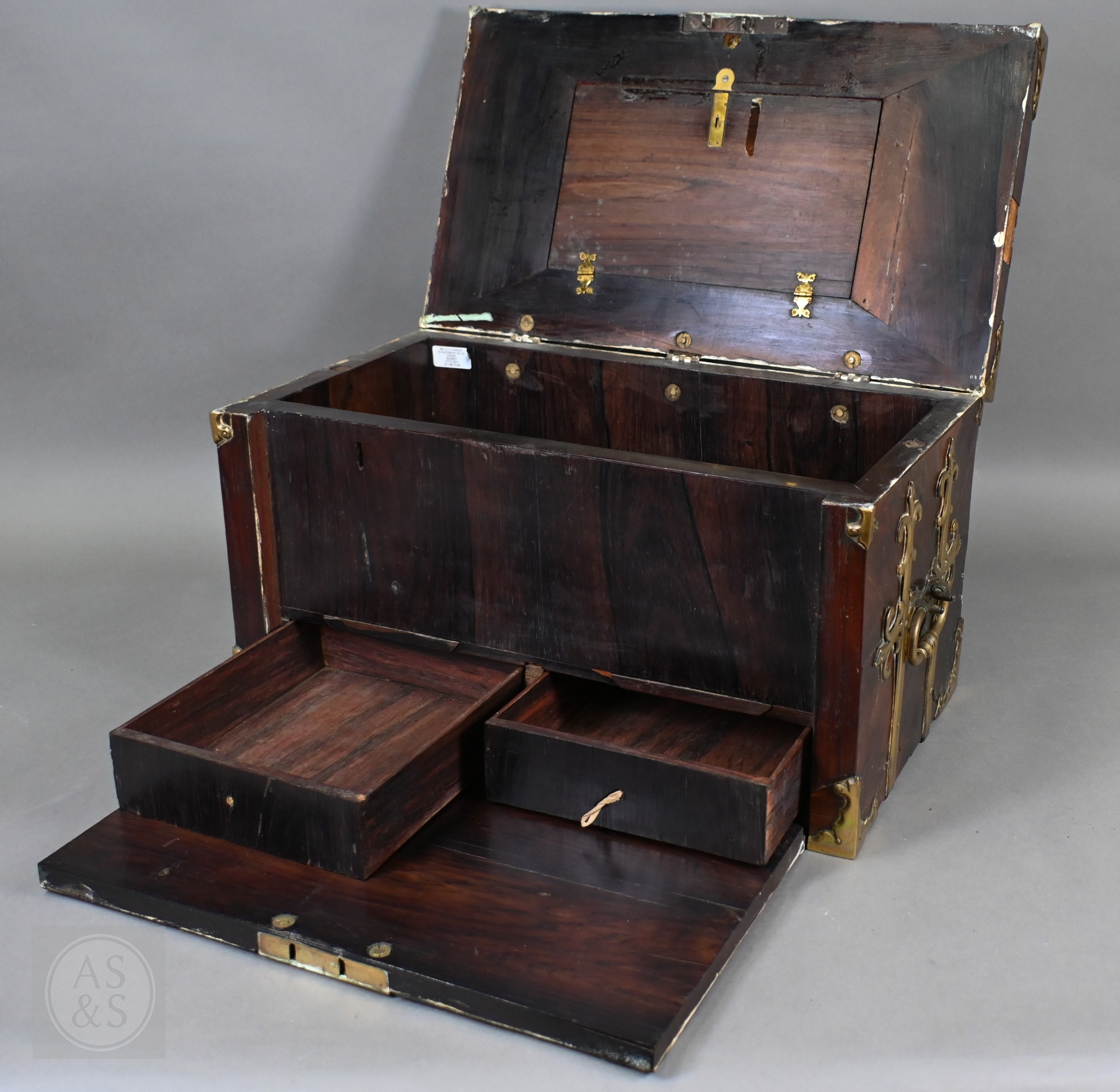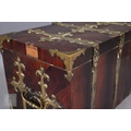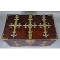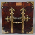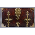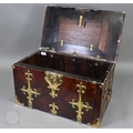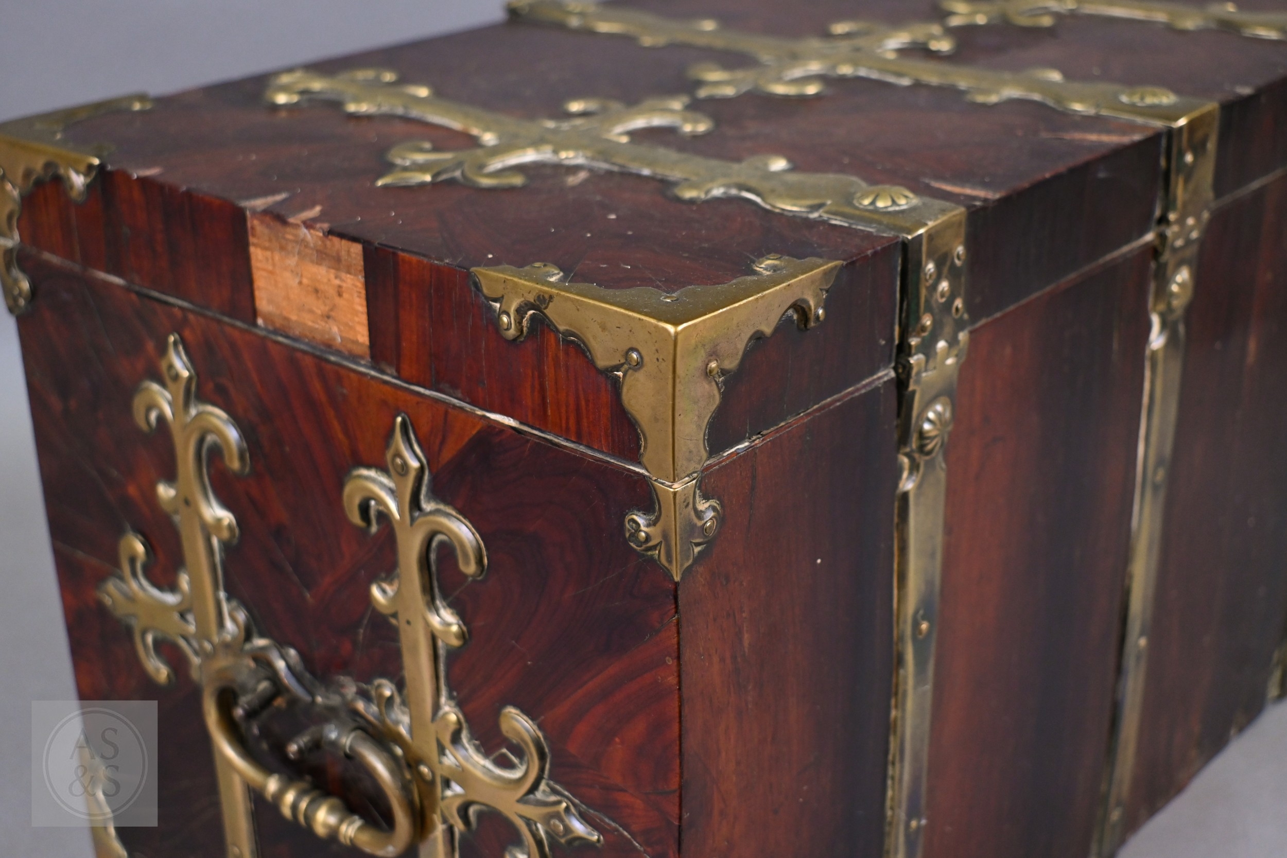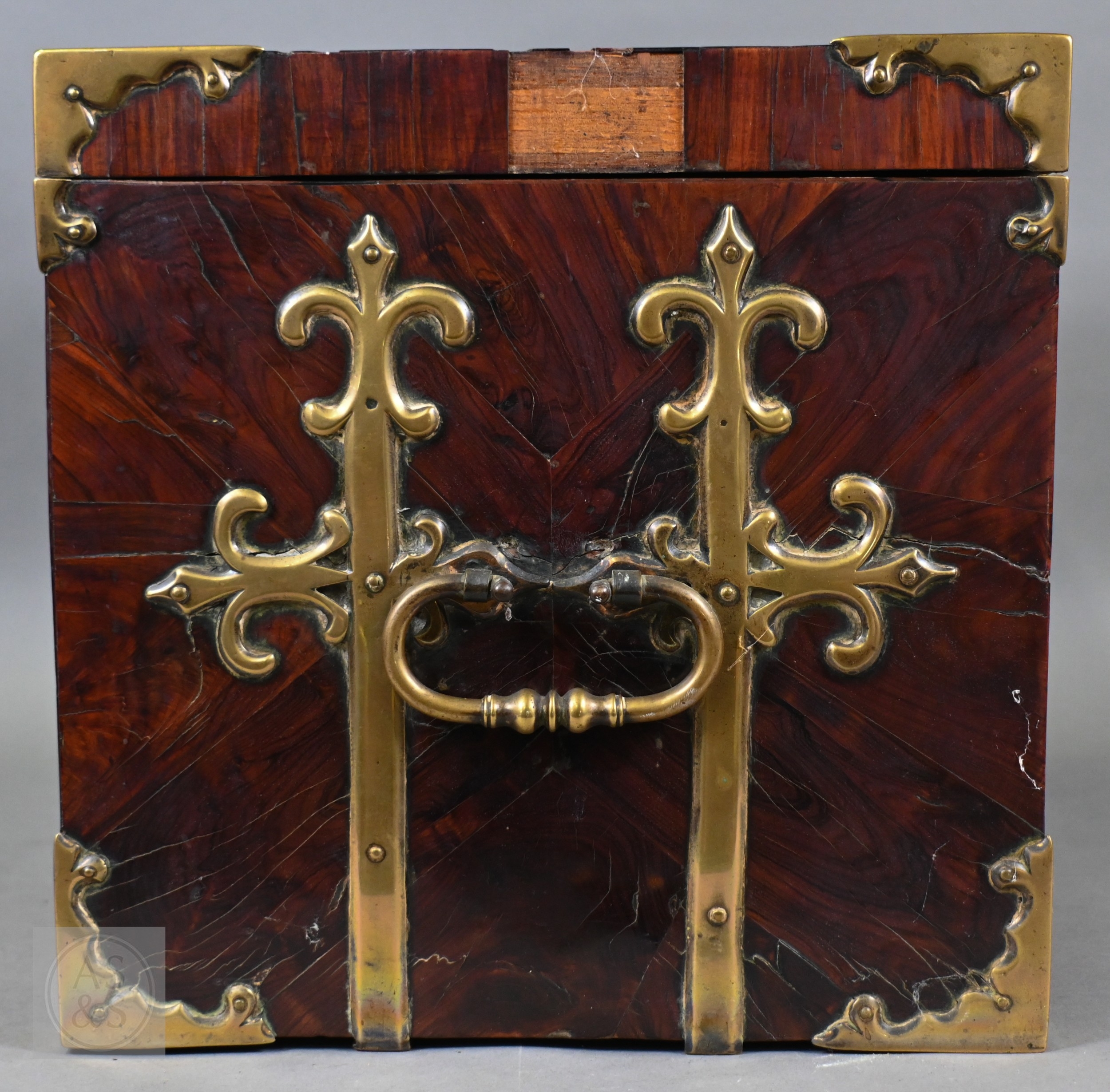 An early 17th century continental brass bound oyster veneered coffer fort, the elaborate brass fittings with radiating veneers, the hinged top with brass lock and staple enclosing a storage well and panel to underside, the fall front revealing two drawers, brass carrying handles to the sides, 54 cm x 31 cm x 30 cm h