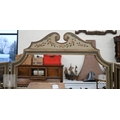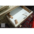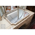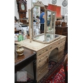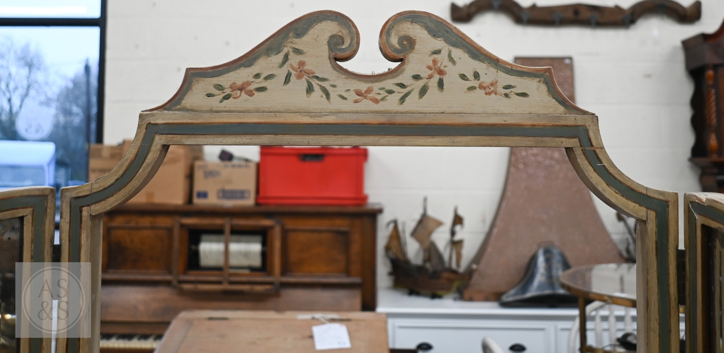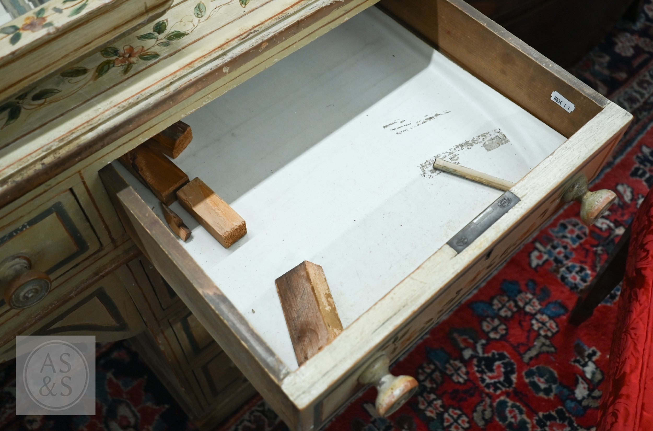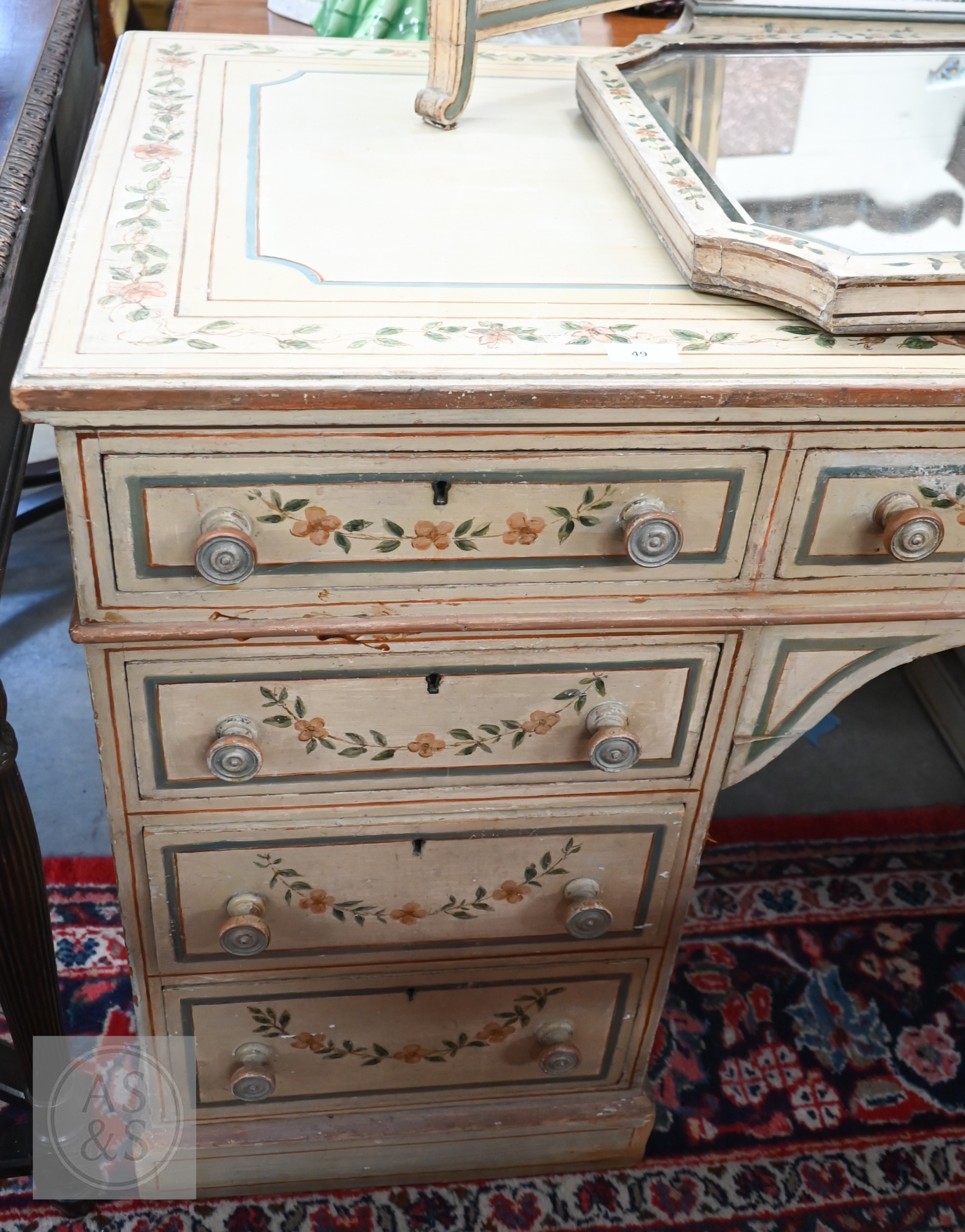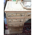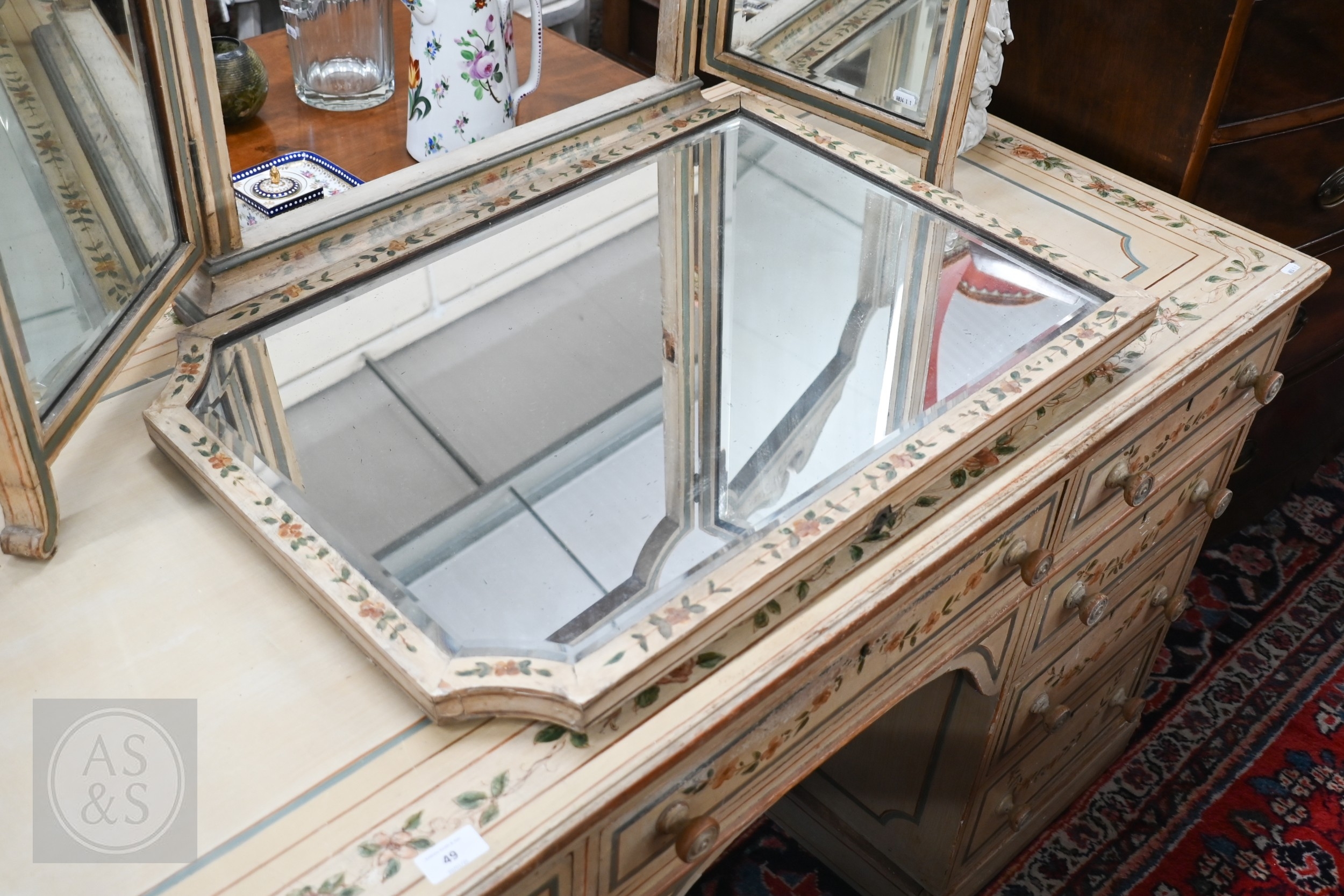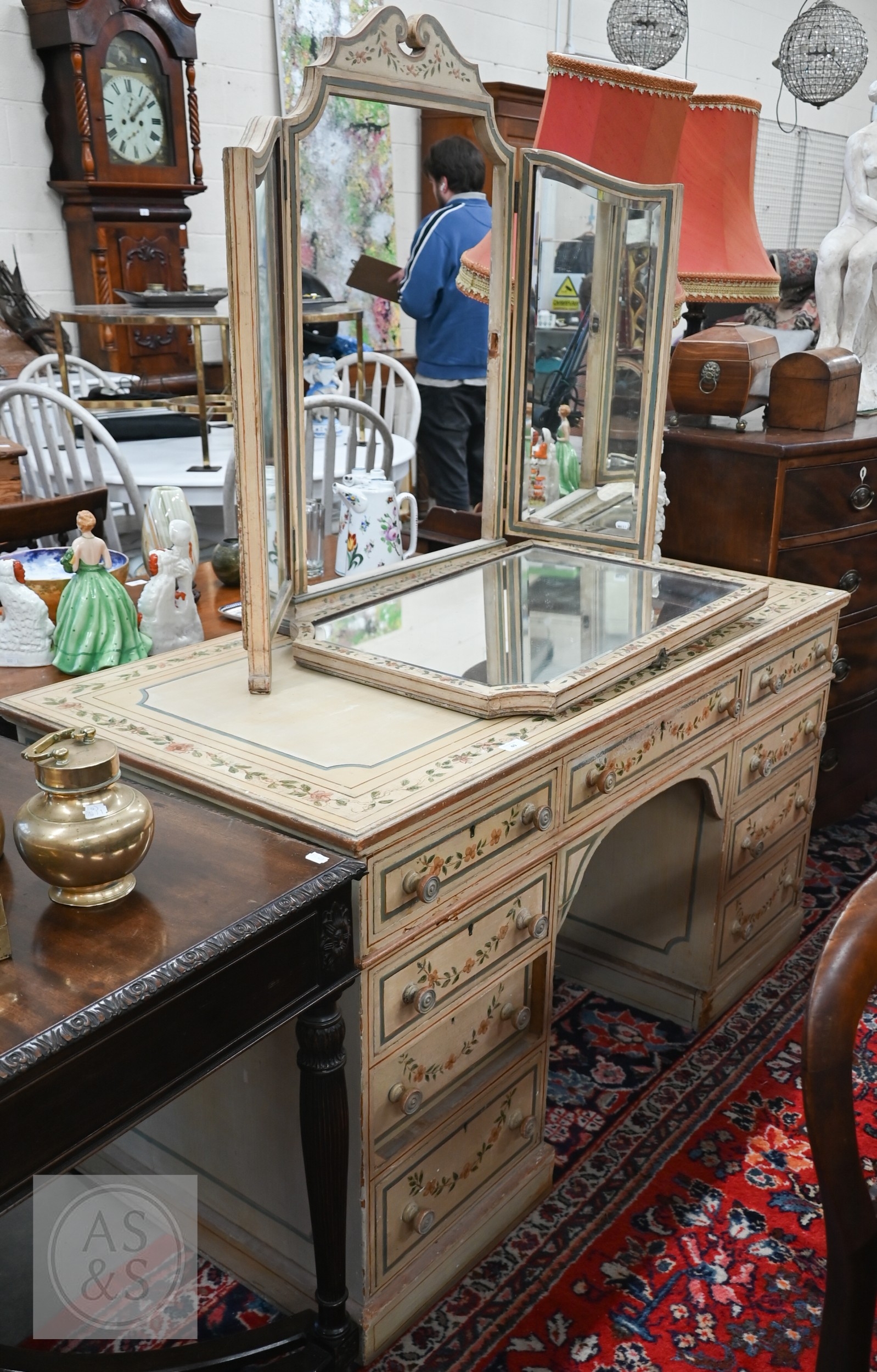 A polychrome floral painted dressing table with nine drawers, c/w similar painted triptych mirror with bevelled plates - mirror a/f