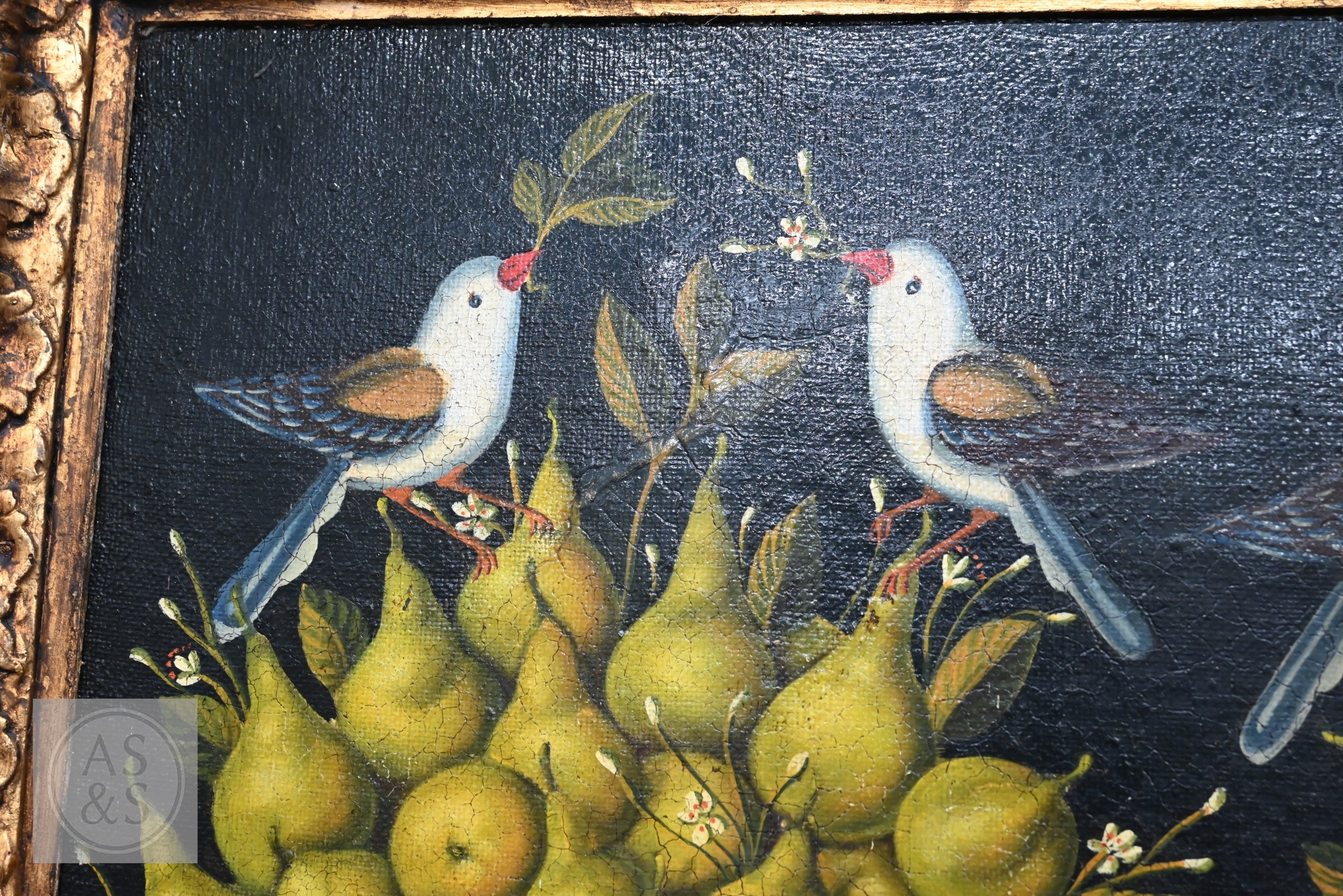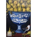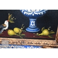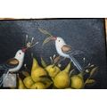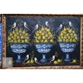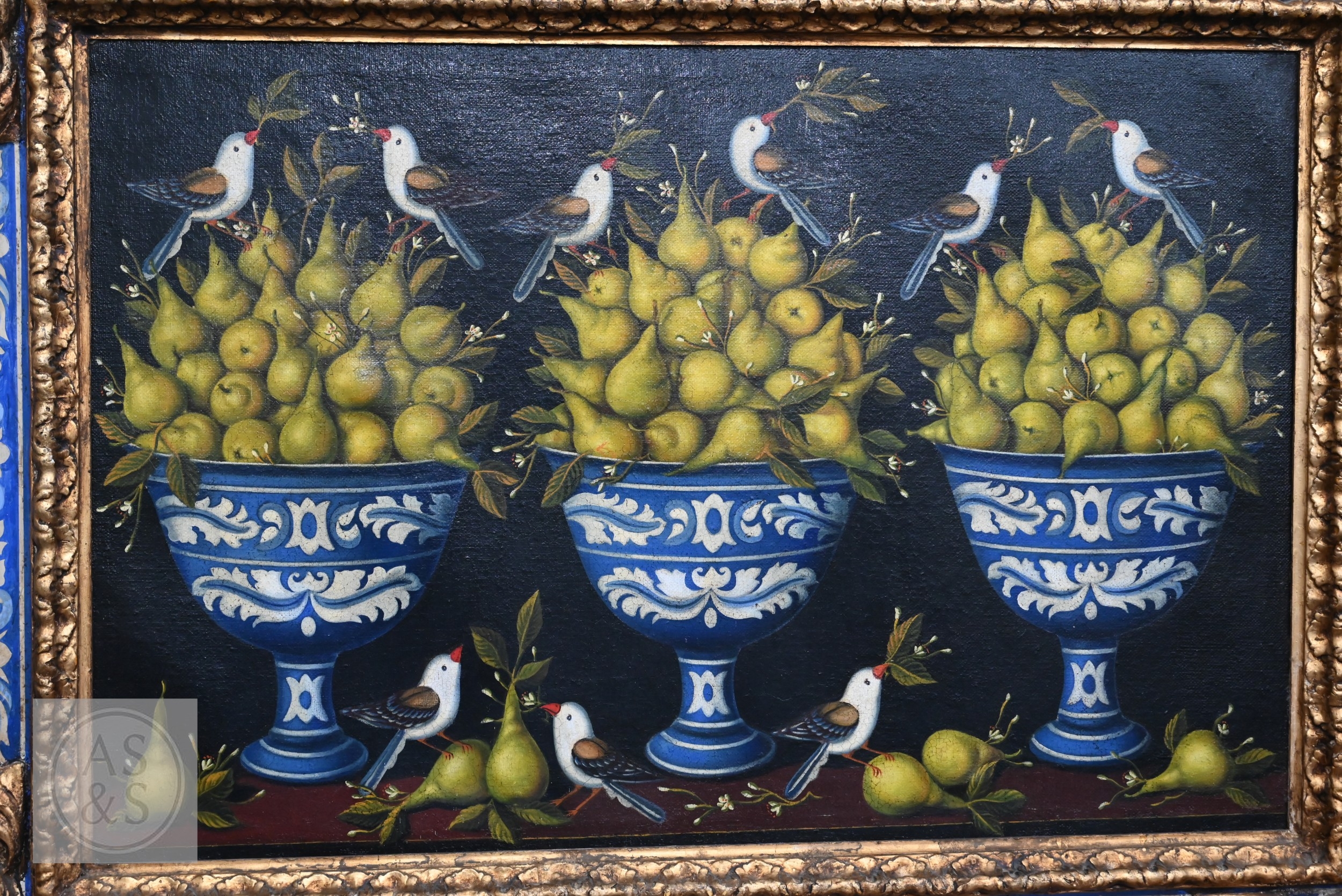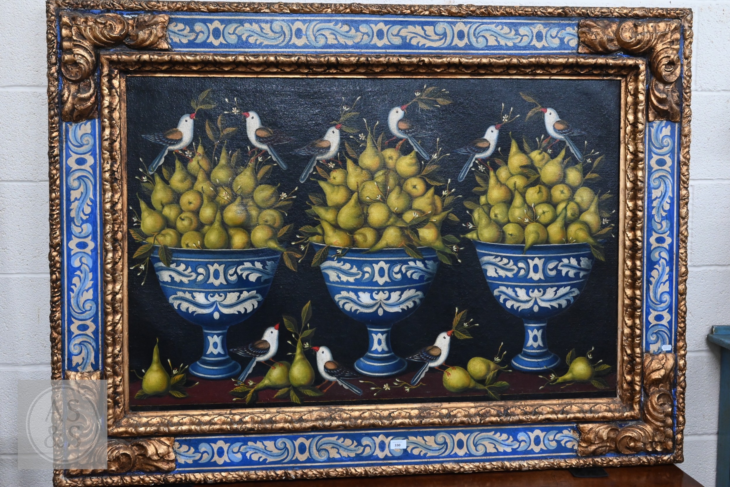 A decorative trompe l'oeil oil on canvas depicting three abundant vases of pearls with birds and foliage, in giltwood and matching painted frame, 110 x 152 cm overall