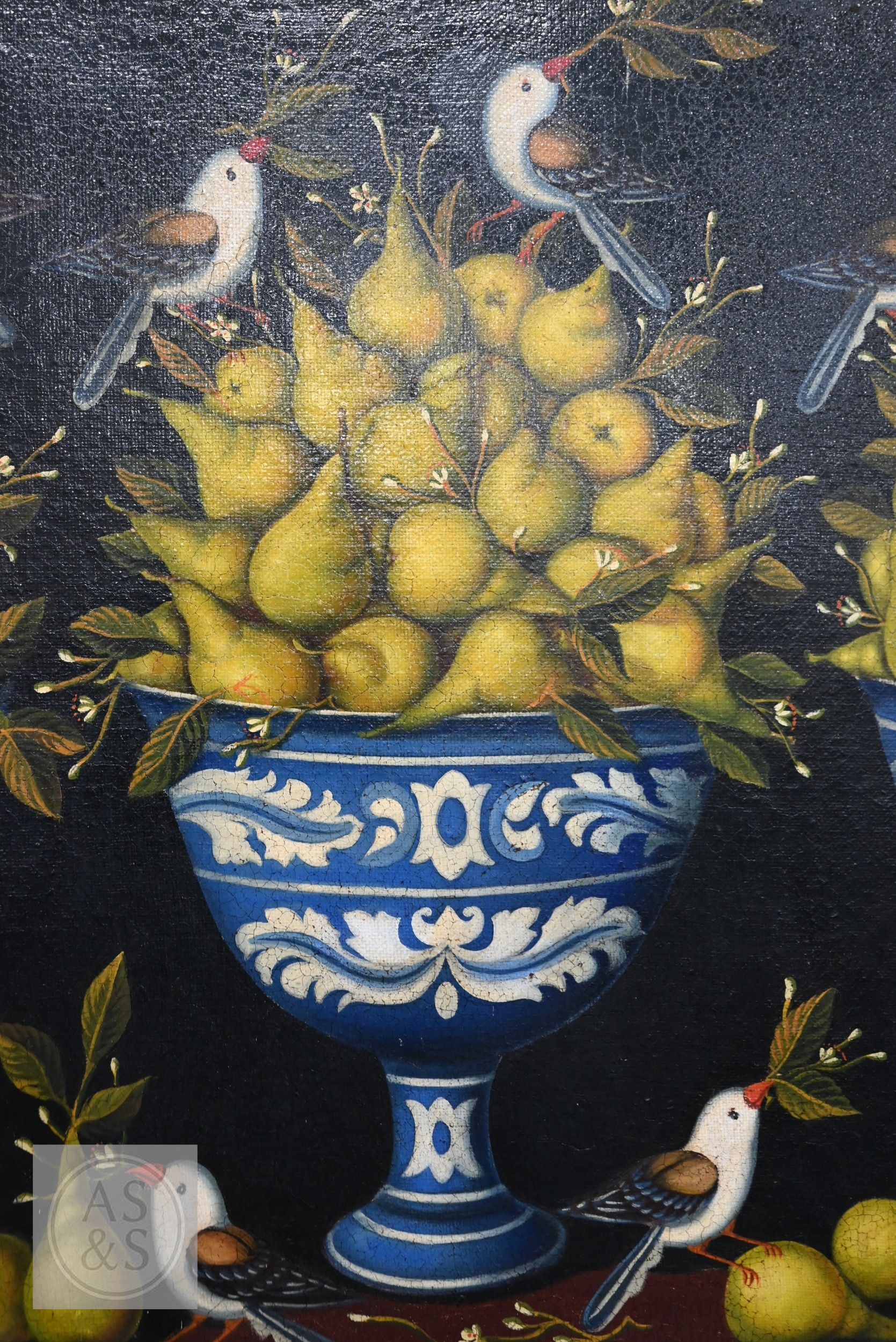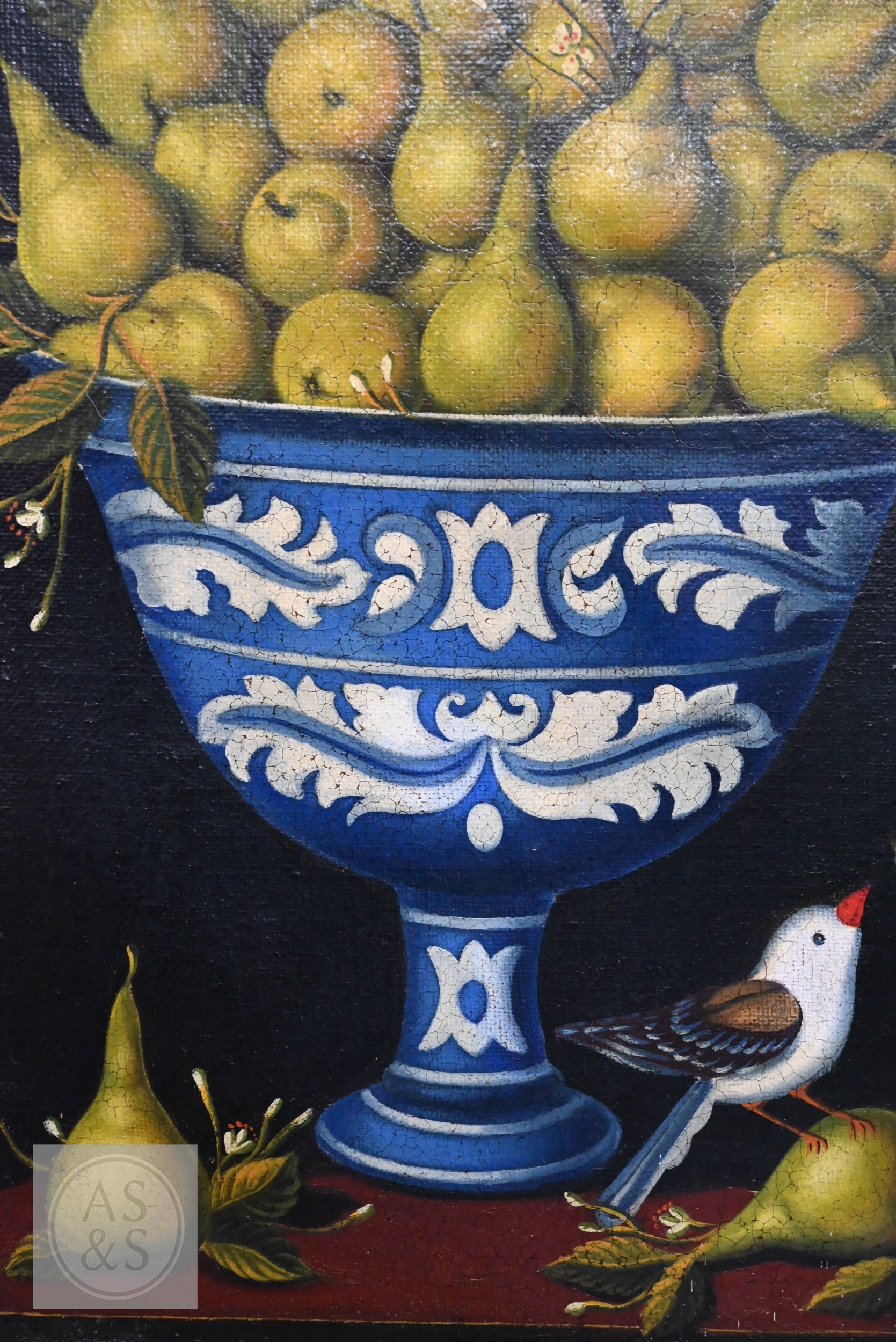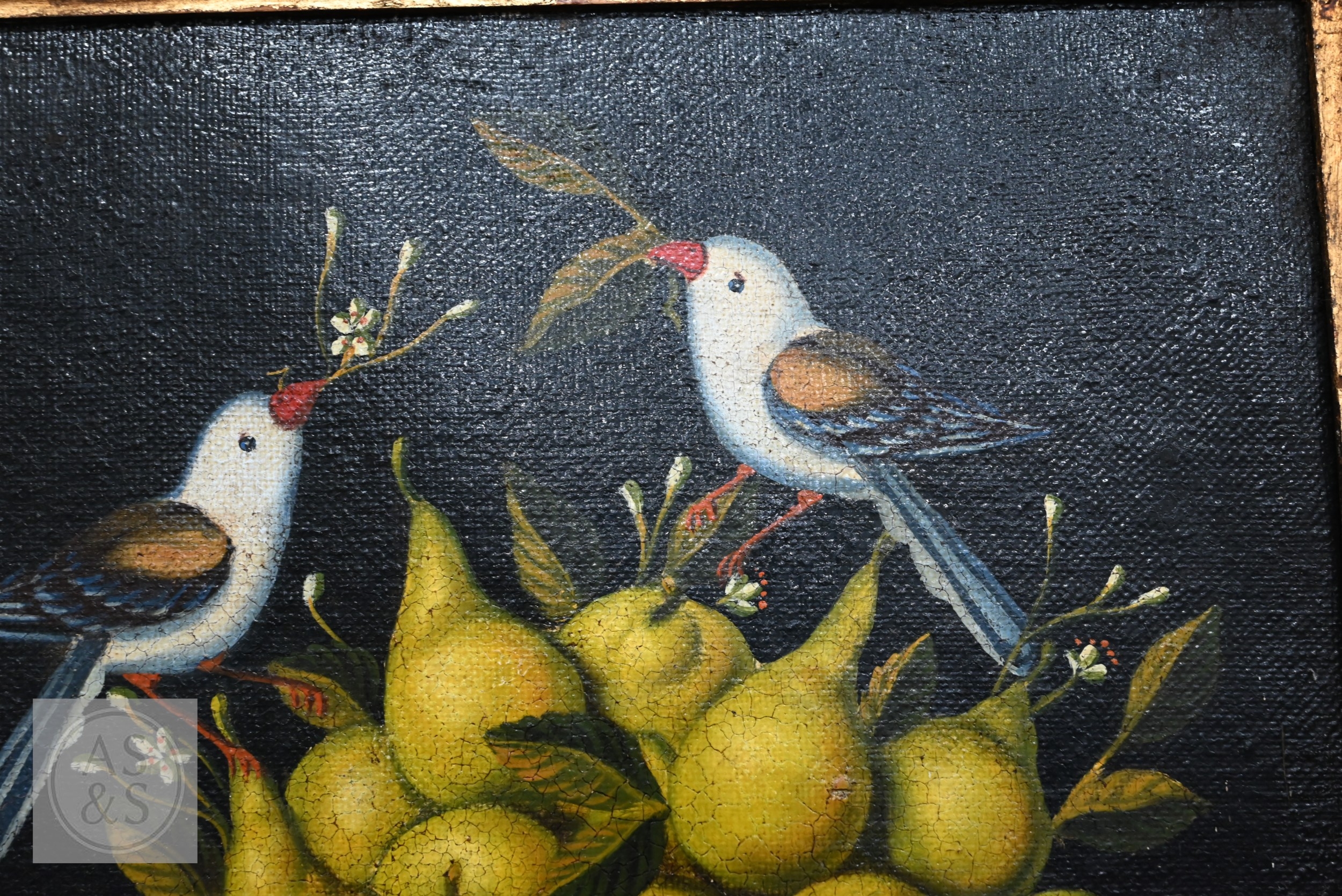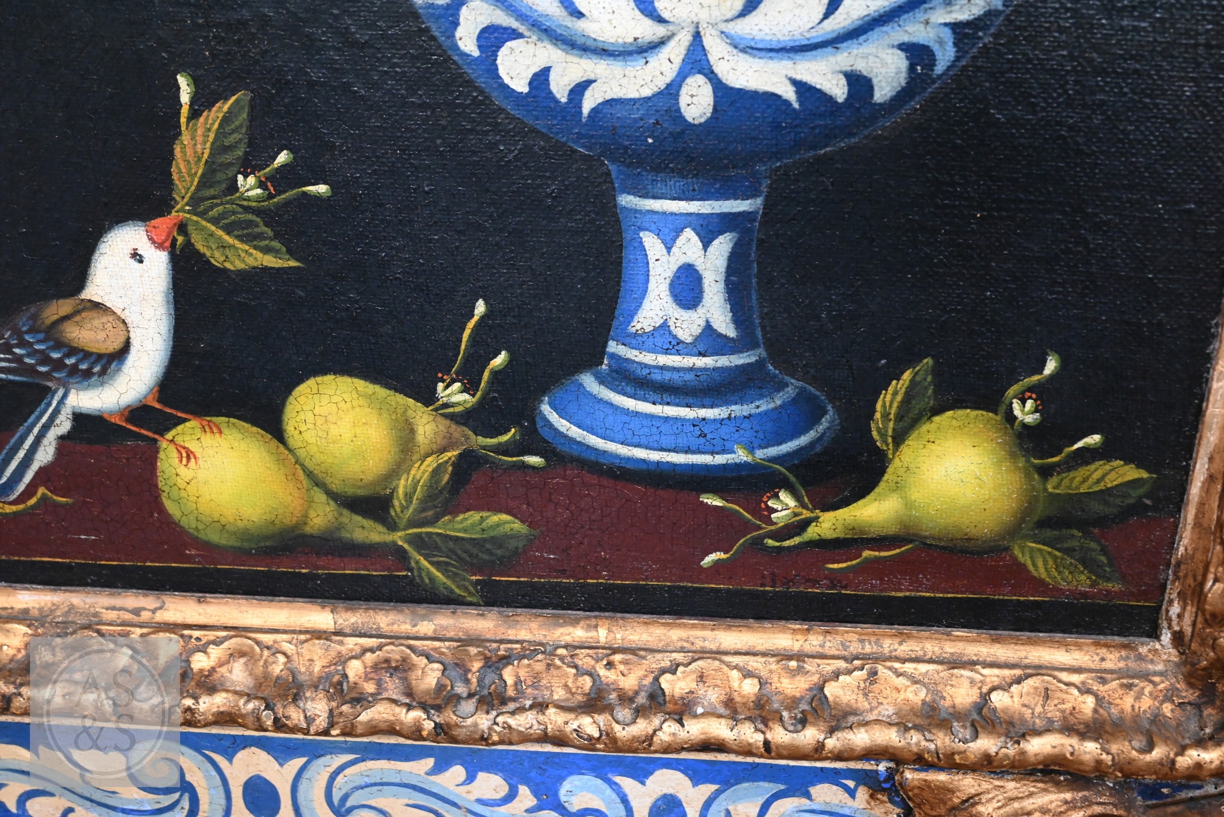 Painting is showing slight cracking on the corners. Frame slightly dirty but aside from a few small chips in overall good order