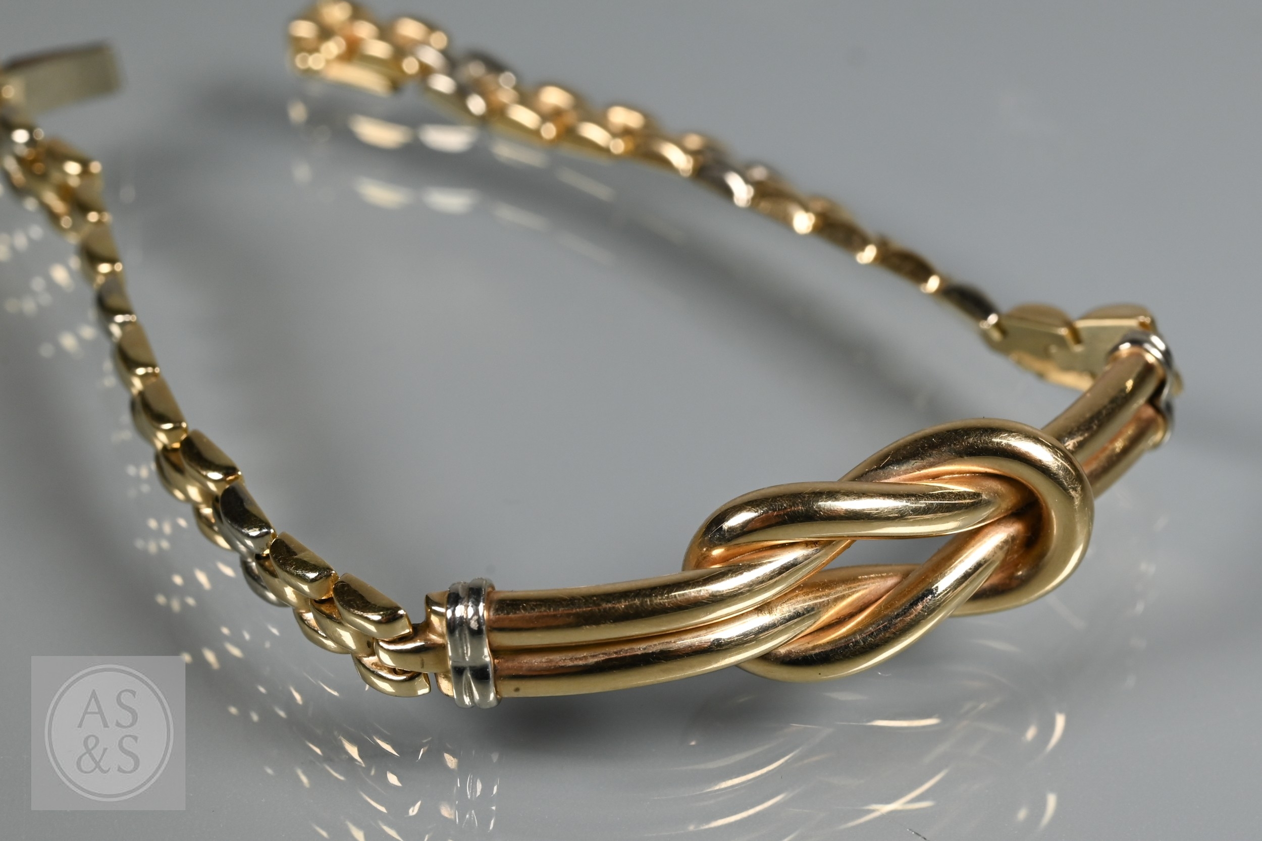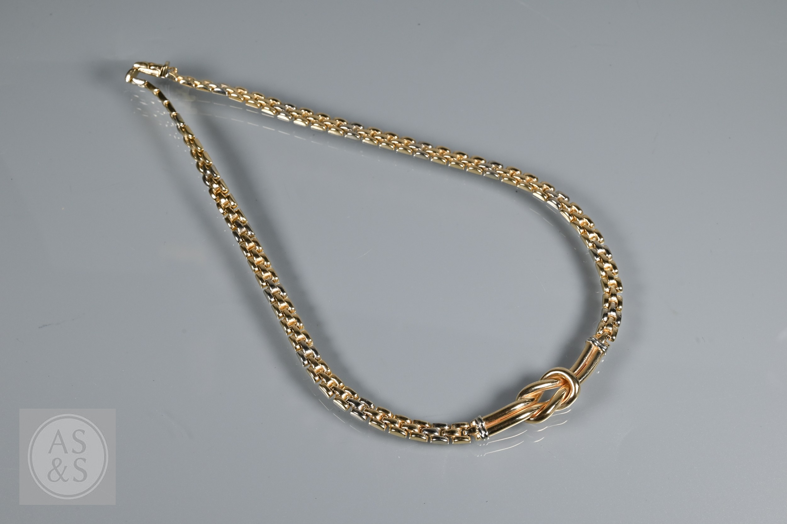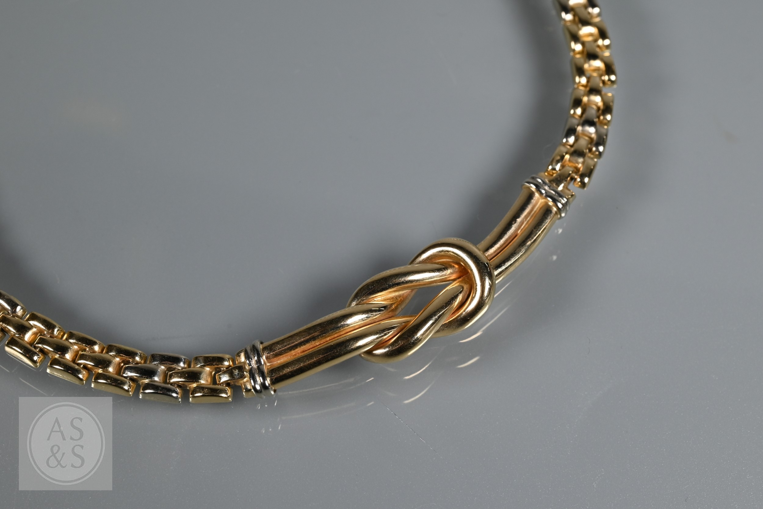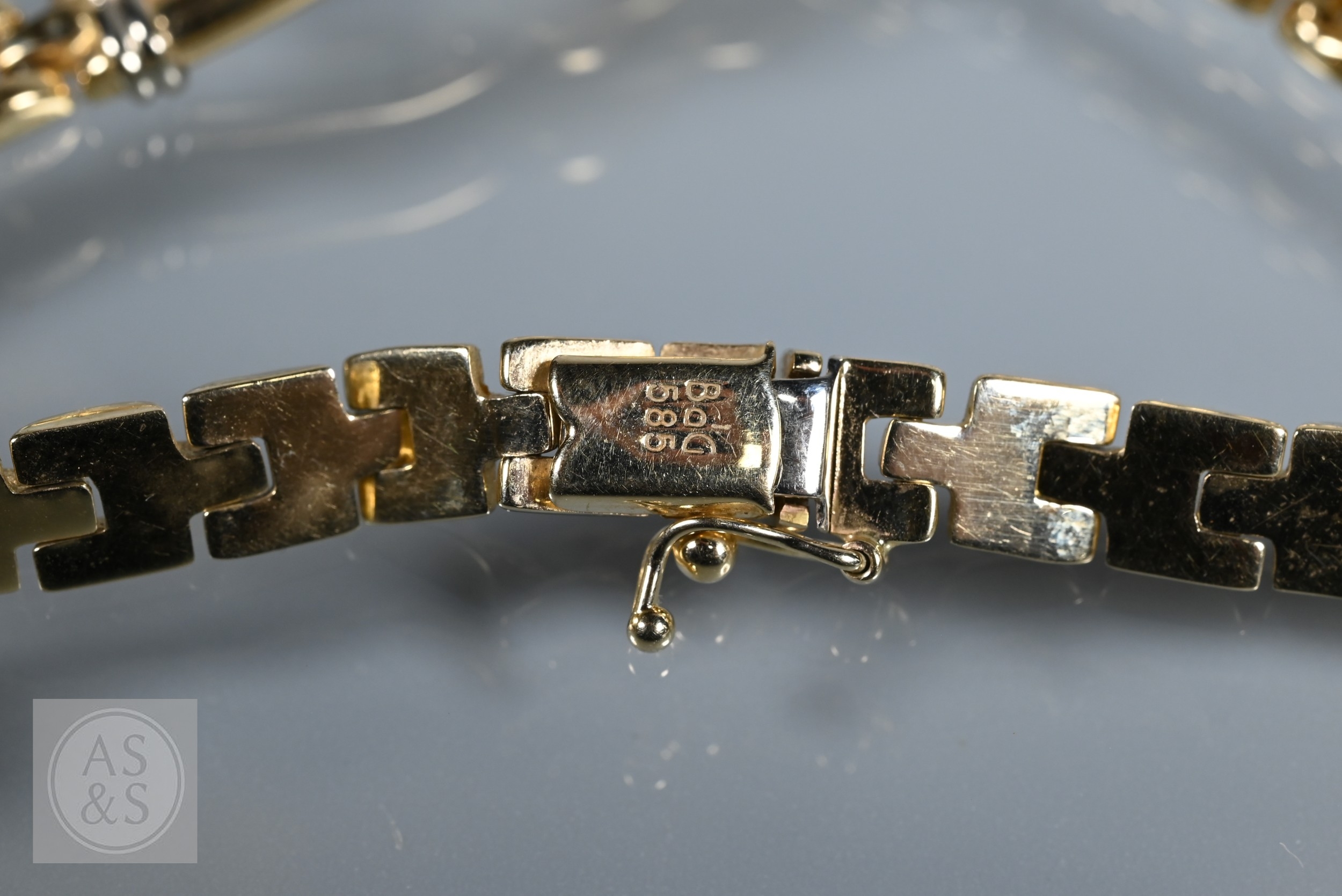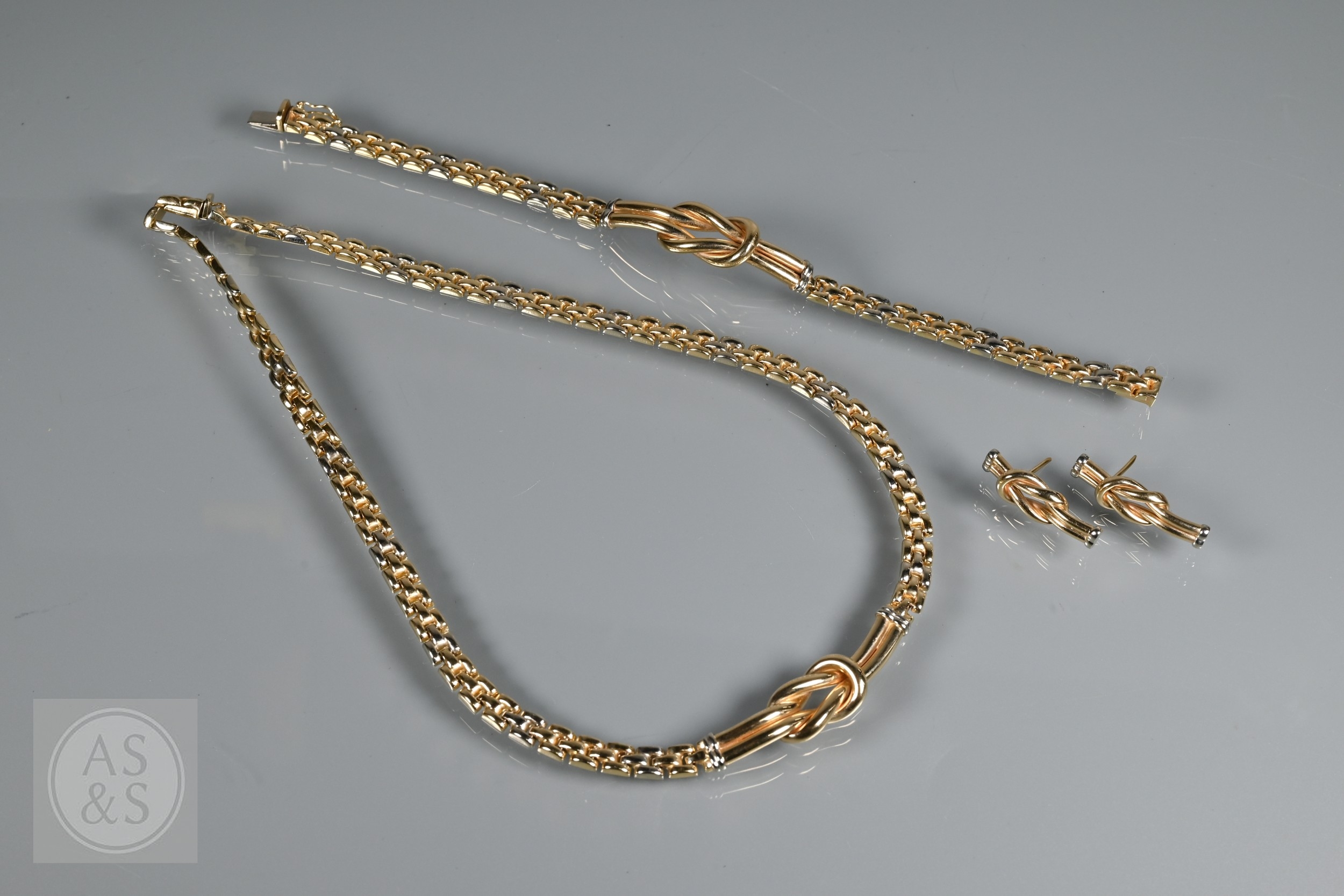 A Continental brick link necklace, bracelet and earring set, with central knot design, yellow and white metal stamped .585 BaG, approx 40g all in