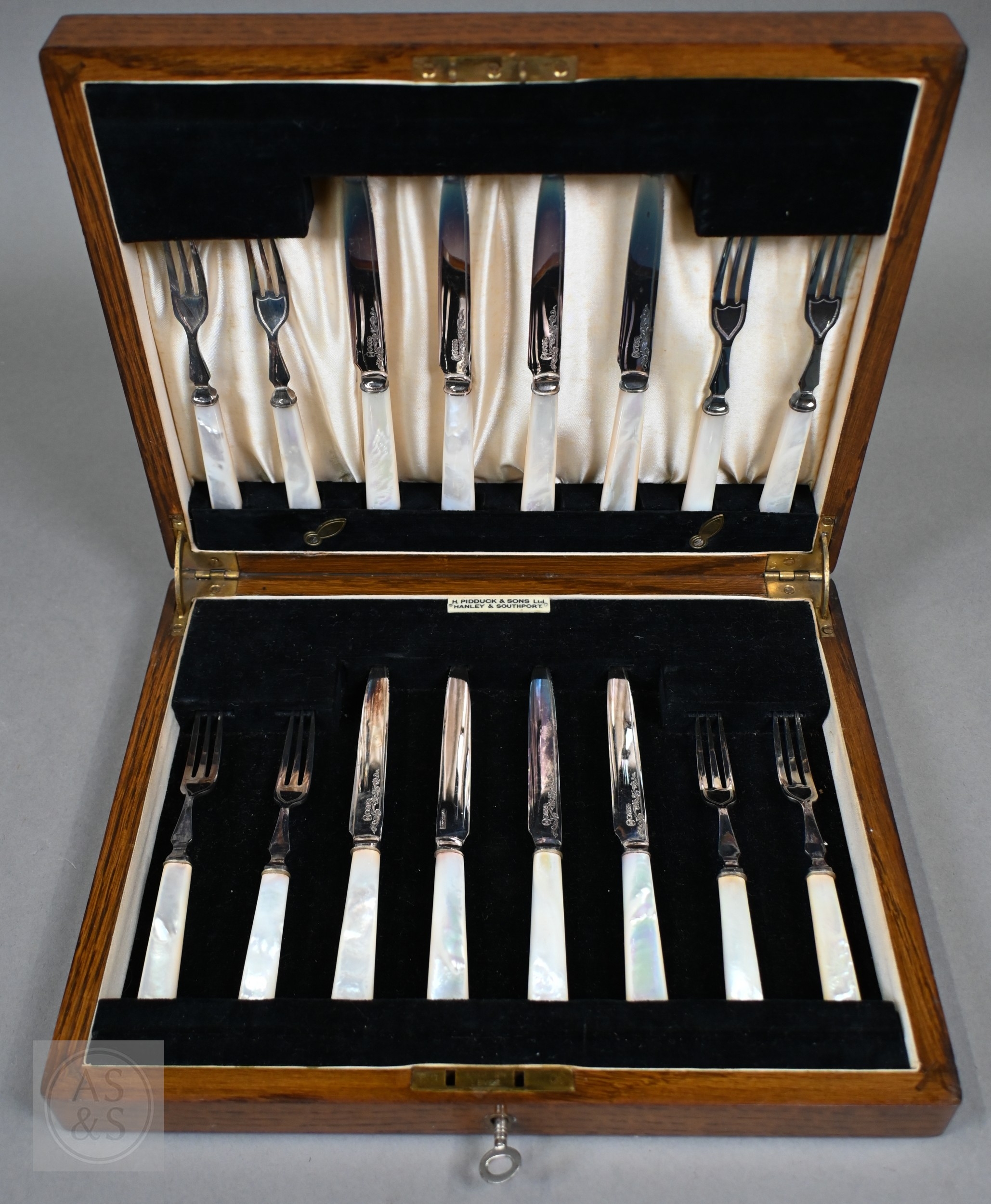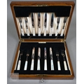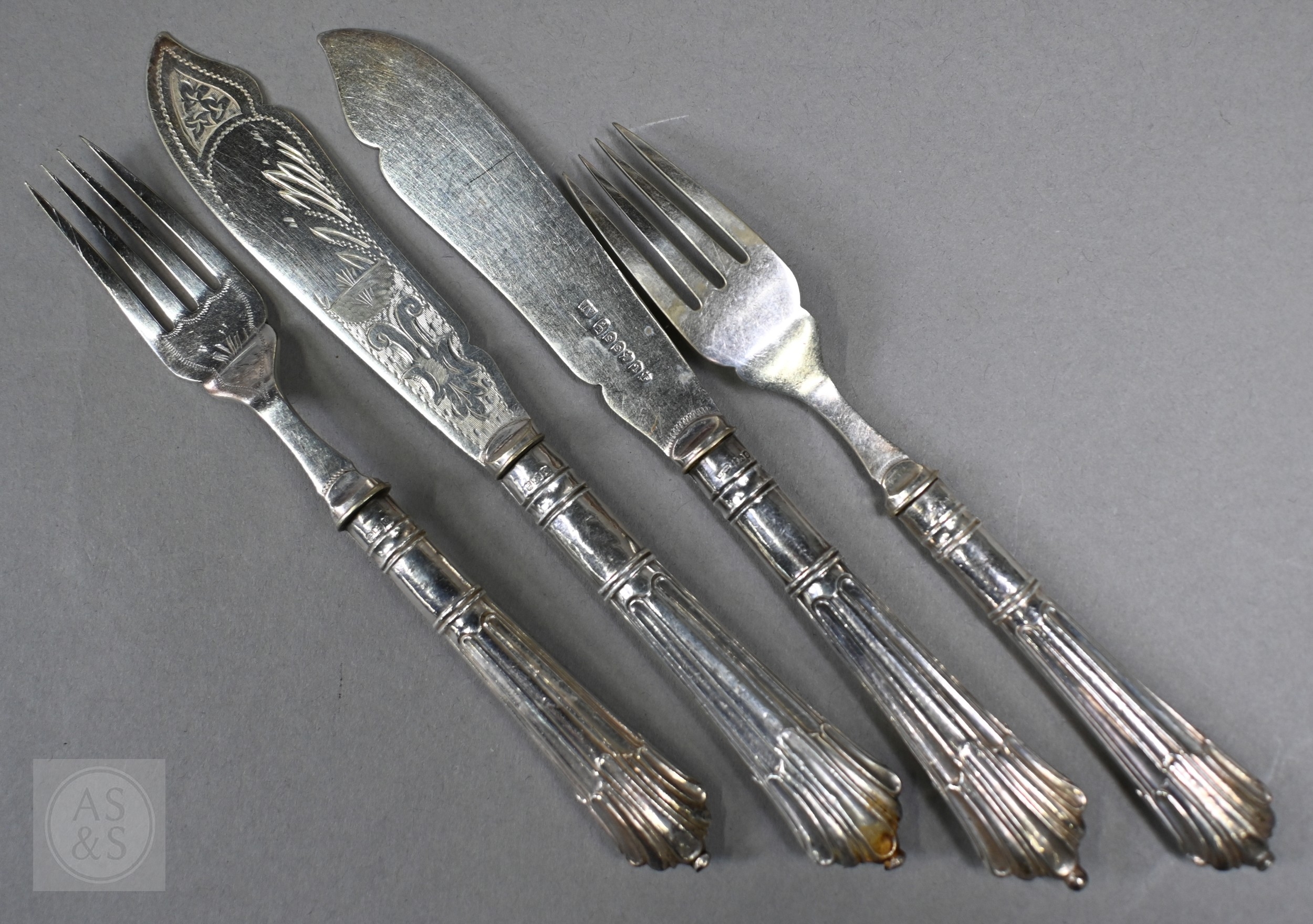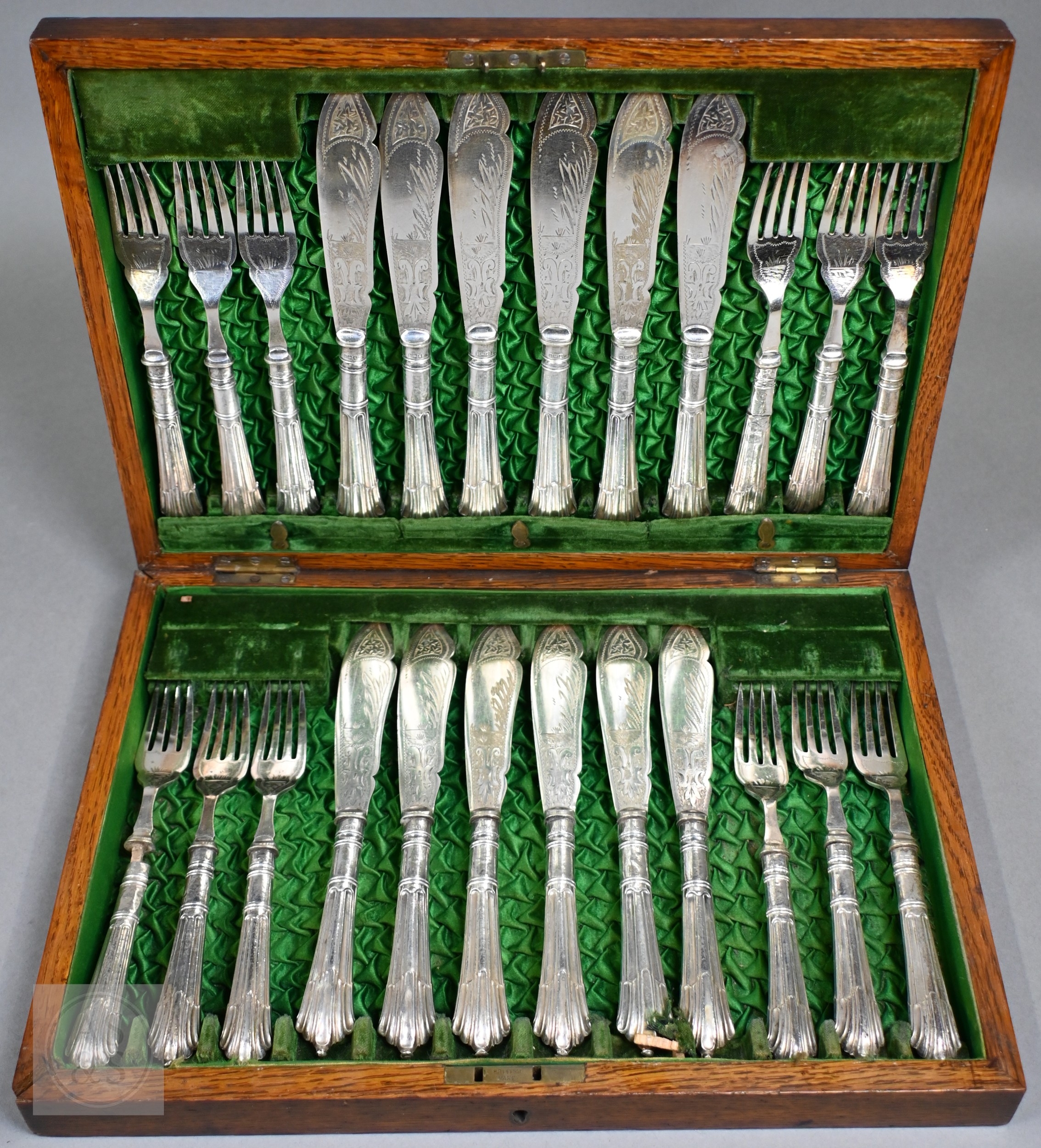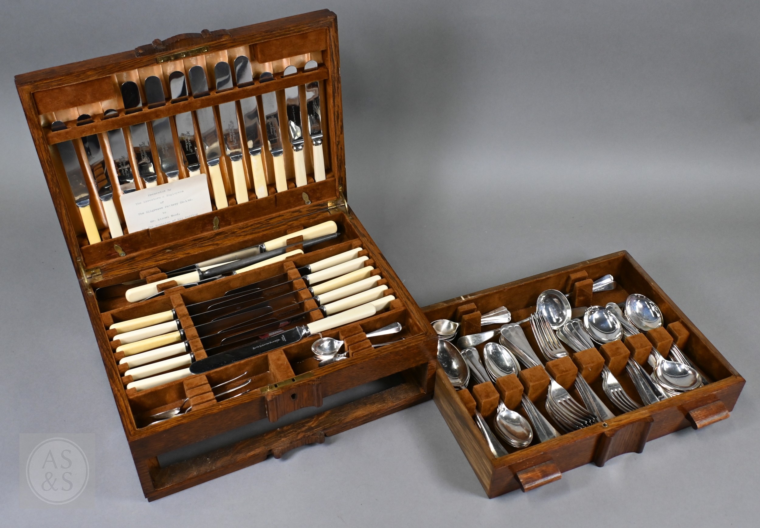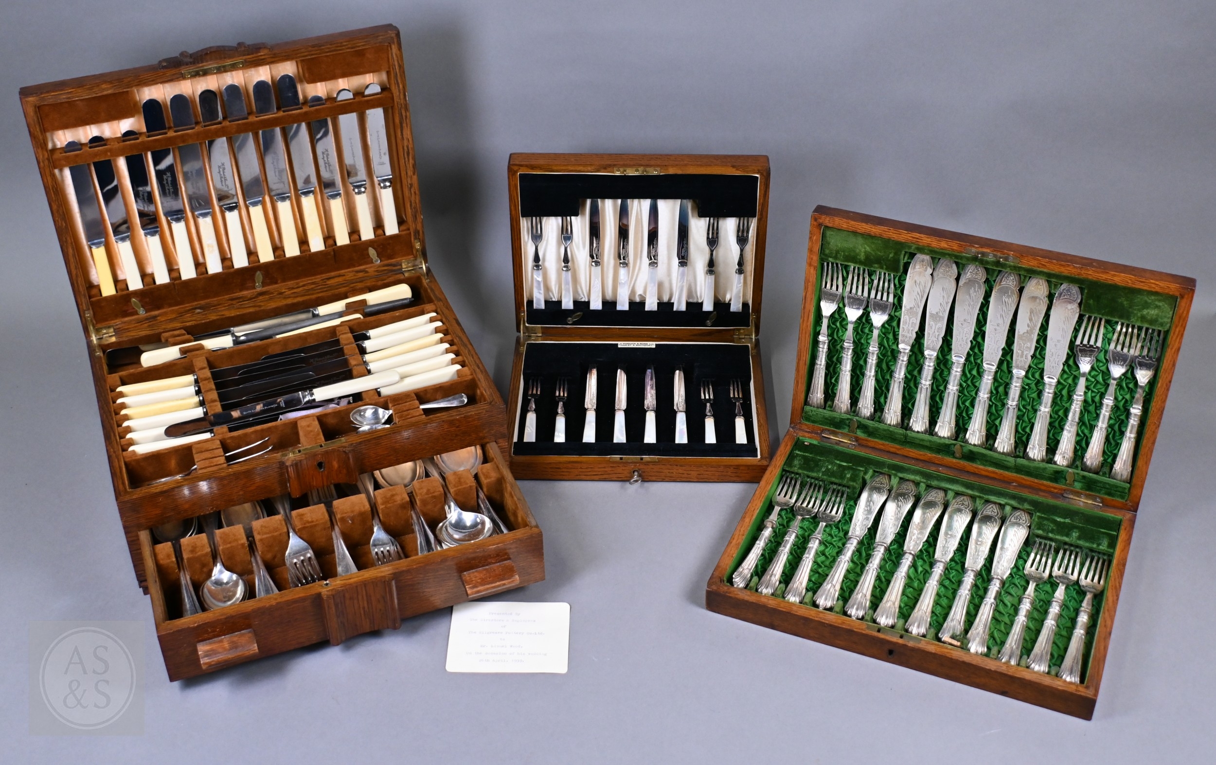 An Edwardian oak-cased set of twelve each Albany pattern fish knives and forks with silver handles and engraved electroplated blades, Sheffield 1906, to/w an oak cased set of eight each ep dessert knives and forks with mother-of-pearl handles (little used) and an extensive set of epns Hanoverian rat-tail flatware in oak canteen with composite-handled cutlery (3)
