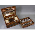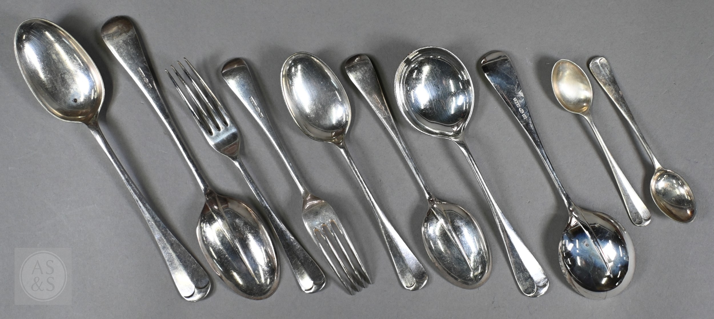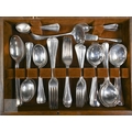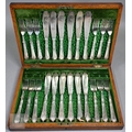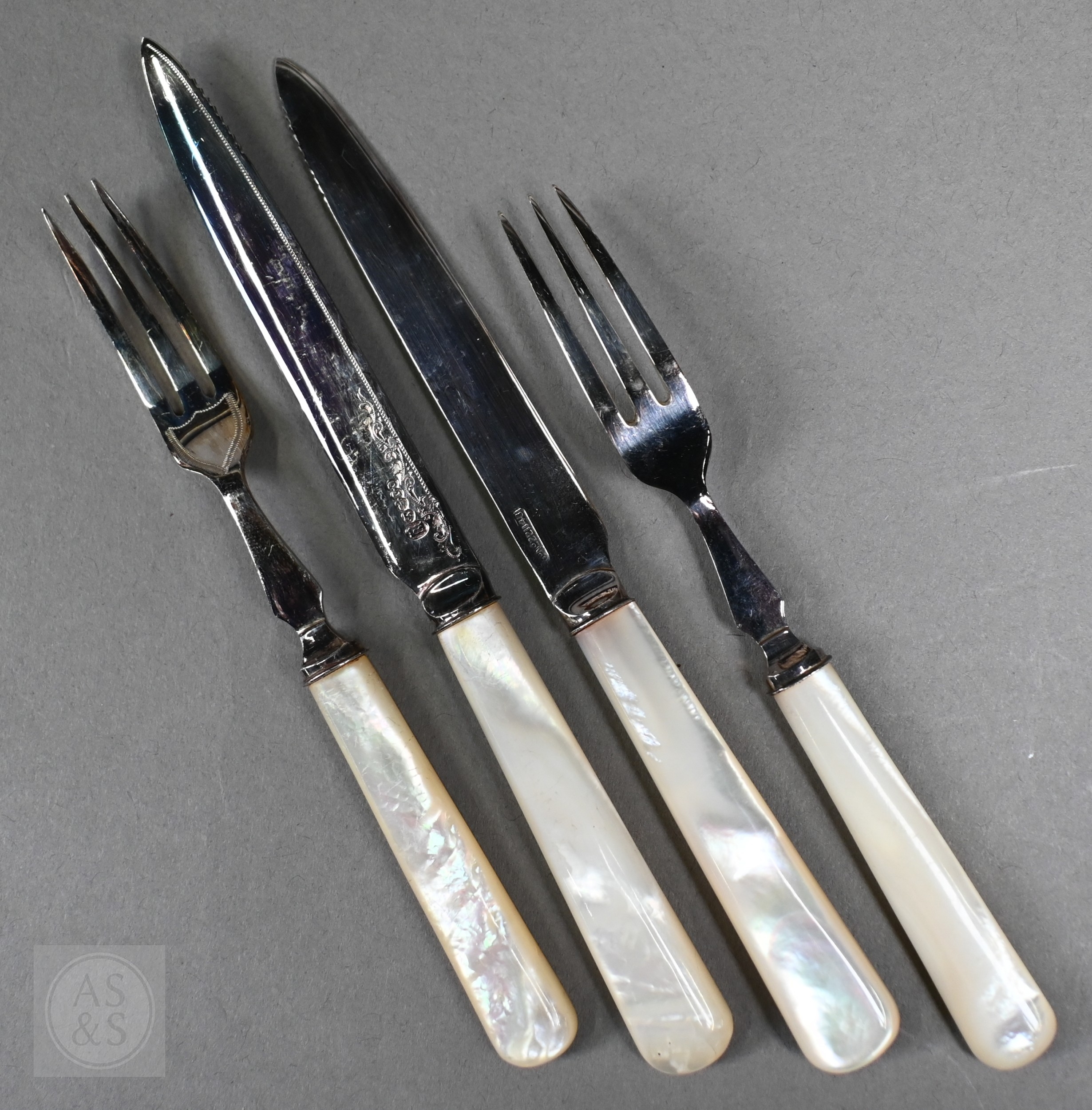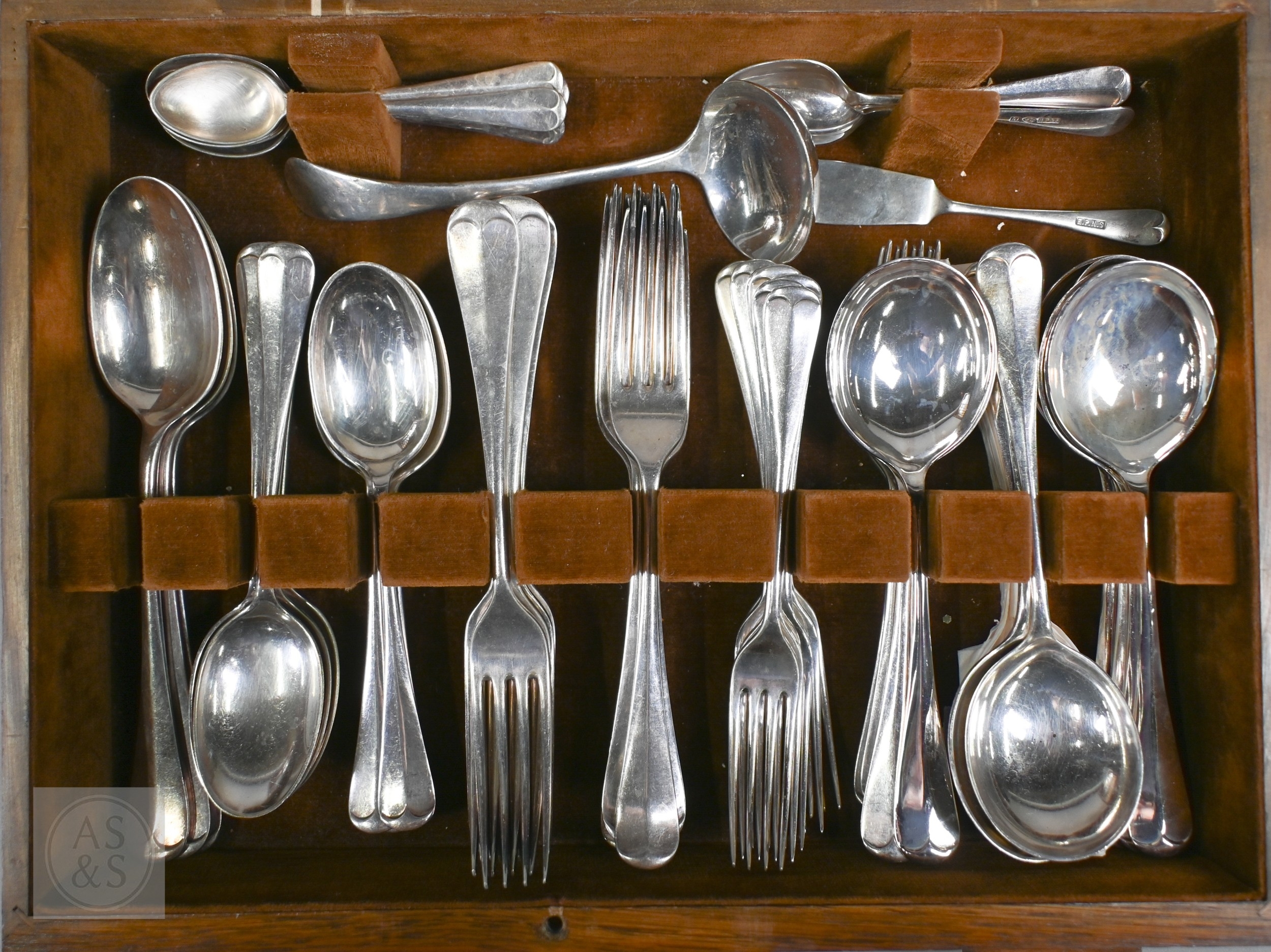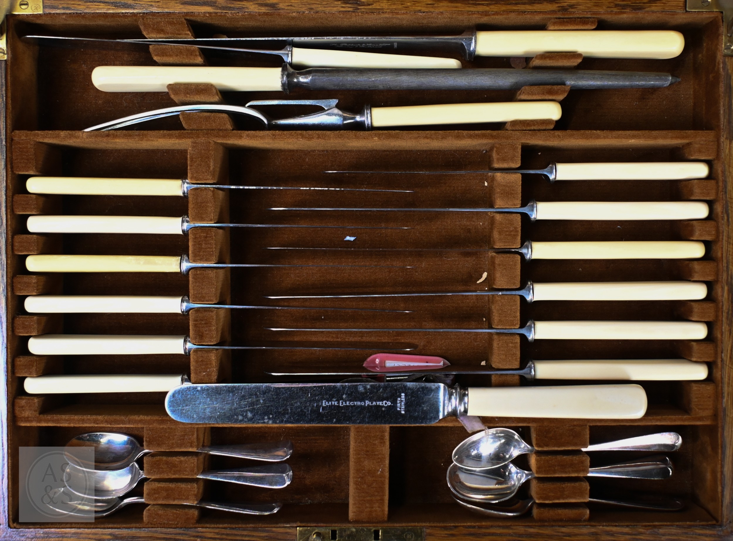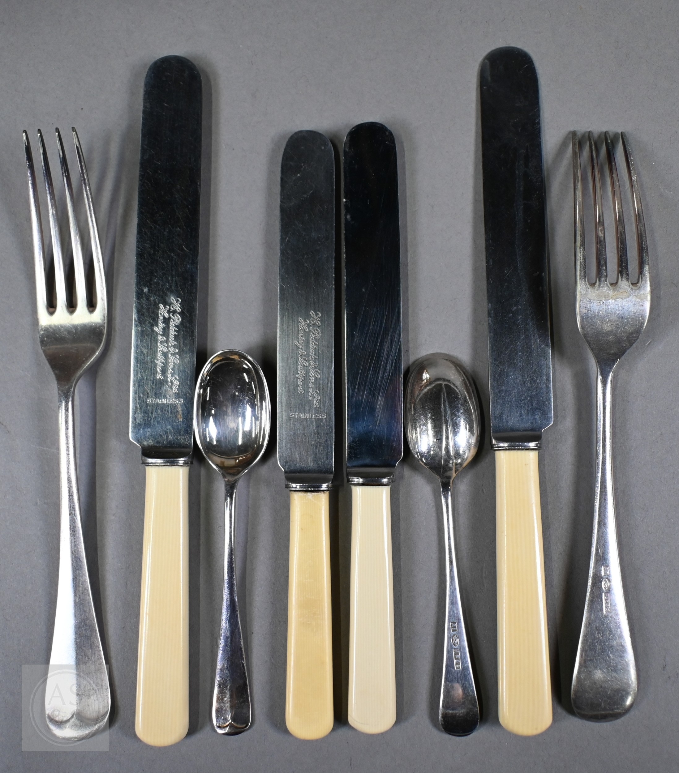An Edwardian oak-cased set of twelve each Albany pattern fish knives and forks with silver handles and engraved electroplated blades, Sheffield 1906, to/w an oak cased set of eight each ep dessert knives and forks with mother-of-pearl handles (little used) and an extensive set of epns Hanoverian rat-tail flatware in oak canteen with composite-handled cutlery (3)